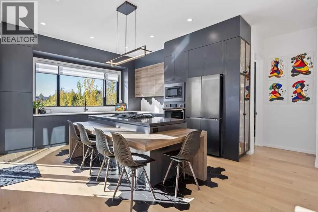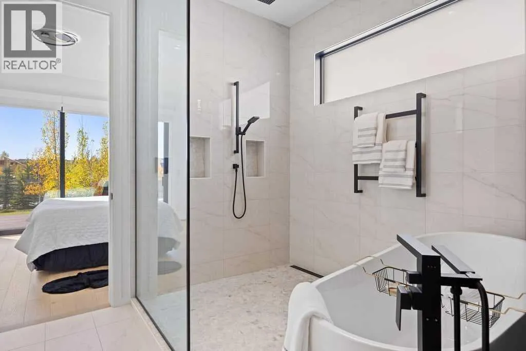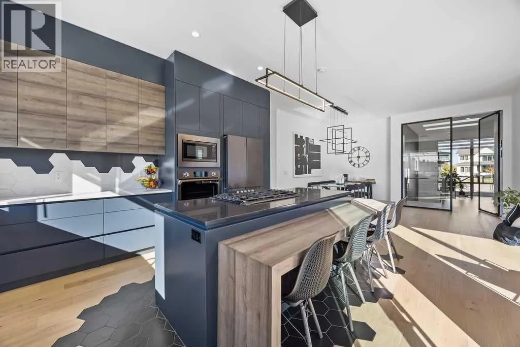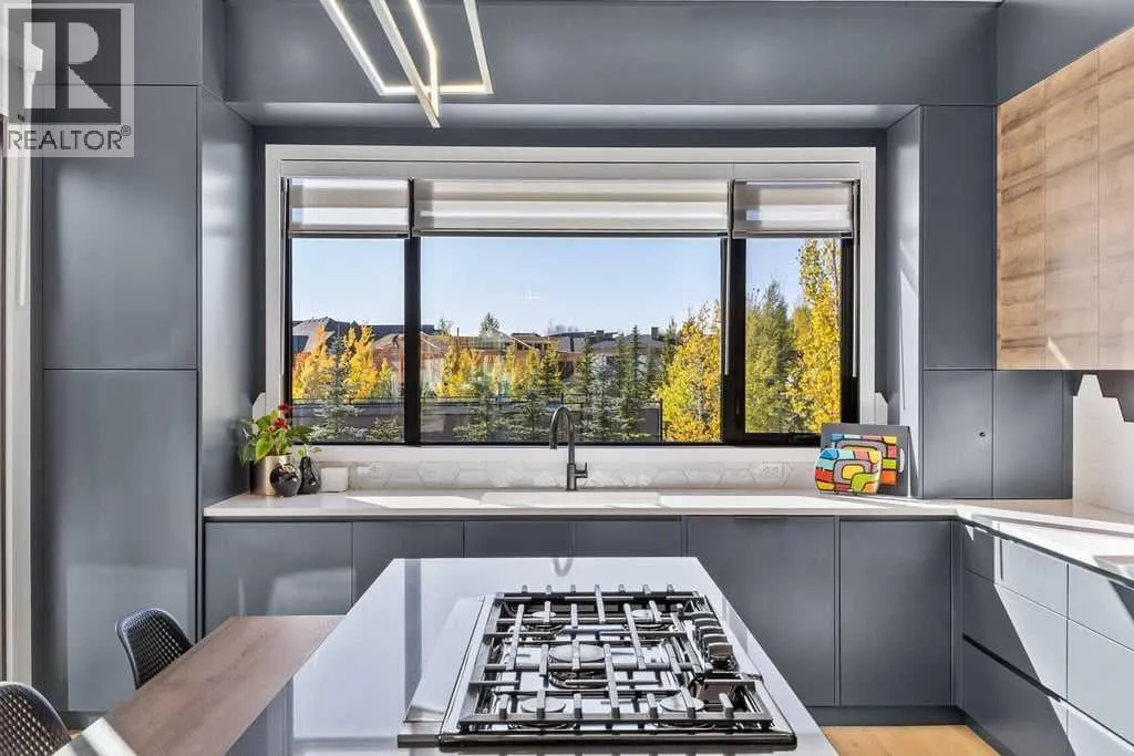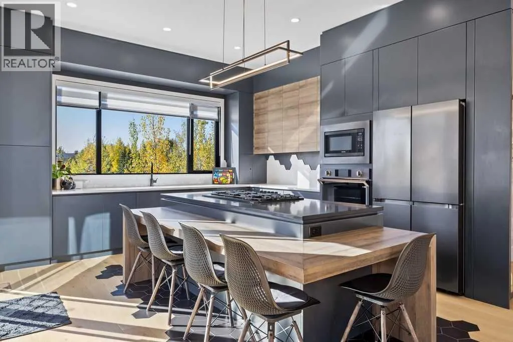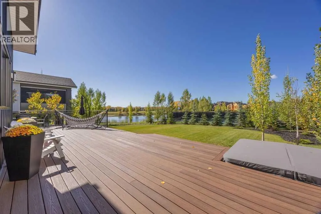 Experience the perfect balance of sophistication and comfort in this stunning modern bungalow, offering over 3,400 sq. ft. of beautifully designed living space. Set in the prestigious community of Elbow Valley West, this residence pairs architectural simplicity with high-end finishes and a seamless open-concept layout.Backed by peaceful pond views and the communityâs impeccably kept pickleball courts, the setting is as serene as it is private. Step outside to an expansive deckâideal for morning coffee, relaxed dinners, or evenings in the private hot tub surrounded by nature. The professionally landscaped yard completes the outdoor sanctuary, with uninterrupted views and space to unwind.Inside, every detail reflects thoughtful craftsmanship. The gourmet kitchen features sleek custom cabinetry, quartz countertops, and premium built-in appliances, all designed to inspire culinary creativity. High ceilings and oversized windows fill the home with natural light, creating an airy, inviting atmosphere.The primary suite is a true retreat, offering calming views, a walk-in closet, and a spa-inspired ensuite that blends luxury and function. Additional bedrooms provide versatilityâwhether for guests, a home office, or hobbiesâeach finished with the same refined touch found throughout the home.Warm engineered hardwood floors, designer lighting, and a striking custom fireplace in the great room add depth and character to every space. The lower level continues to impress with three large bedrooms, two full bathrooms, a second washer and dryer, and plenty of room to relax or entertain.Enjoy access to walking trails, community amenities, and recreational spaces just steps from your door. A triple oversized heated garage, smart home security, electronic key locks, and automated window coverings add convenience and peace of mind.Perfect for anyone seeking refined single-level living, this home delivers the best of modern elegance.This exclusive enclave offers the best o f both worlds: quiet country-style living with convenient city access. Residents enjoy beautifully maintained walking paths, scenic ponds, tennis and basketball courts, and nearby playgrounds â perfect for an active lifestyle or quiet evening strolls.With easy access to Highway 8, Stoney Trail, and the new West Calgary Ring Road, youâre only a short drive from top-rated schools, West Springs and Aspen Landing shopping, Westside Recreation Centre, and the mountains beyond. Whether youâre heading downtown or escaping to the Rockies for the weekend, this location makes it effortless.Elbow Valley West is known for its welcoming community spirit, stunning natural setting, and elegant homes â the perfect place to call home for those seeking space, comfort, and connection. (id:27476)