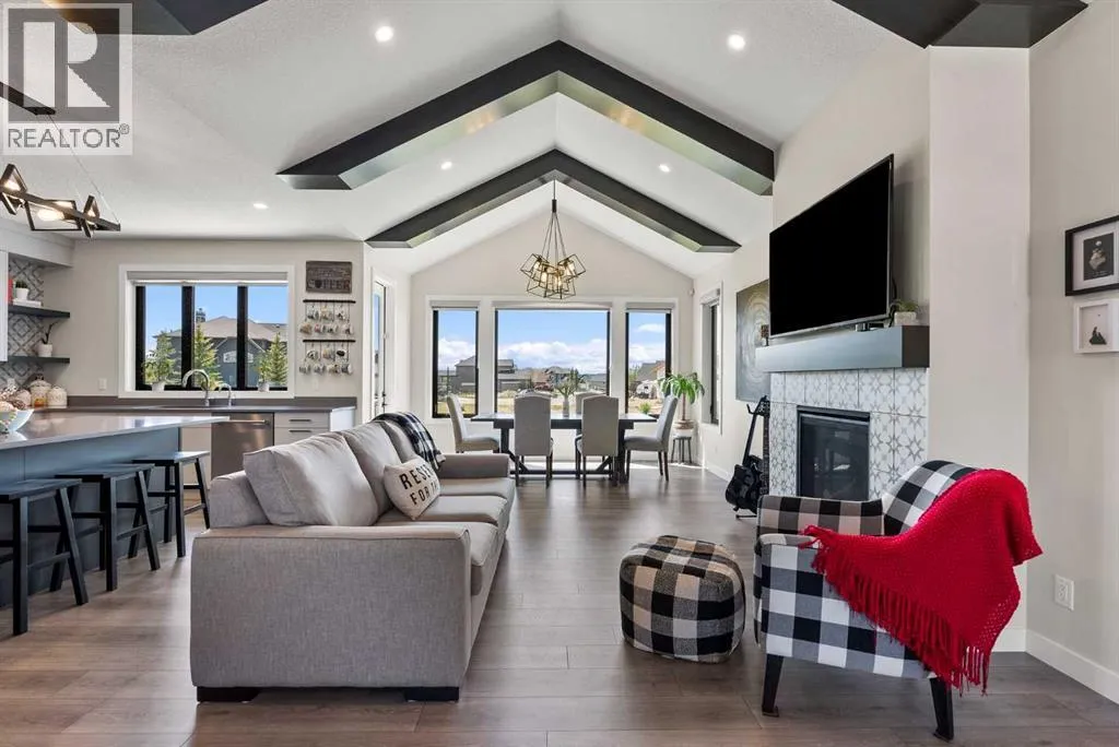 Discover this beautiful home just outside of Cochrane in Monterra. Offering nearly 3,400 sq ft of thoughtfully developed living space on a generous 0.45-acre lot, it delivers the top-tier essentials buyers crave. The main floor impresses with an open, airy design featuring vaulted ceilings that create a bright, inviting atmosphere. The spacious kitchen boasts a large island and soft-close cabinets, flowing seamlessly into the dining and living areasâideal for hosting family and friends.The primary suite is a private sanctuary, with an elegant ensuite that includes a soaker tub, shower, and dual sinks, complemented by a large walk-in closet with built-in organizers. Convenience is key with a well-appointed laundry room located along the corridor to the heated, insulated triple garage. Step outside onto expansive decksâ12x28 feet on both levelsâthat are perfect for outdoor entertaining. The lower deck features a hot tub, offering a relaxing retreat with stunning mountain views.Throughout the home, youâll find custom built-ins, including a dedicated office with custom cabinetry and a built-in pantry for ample storage. The finished basement provides additional living space with two bedrooms, a spacious rec room that opens to a large patio, and a versatile three-season room equipped with retractable screens to enjoy the outdoors in comfort.This property combines luxurious finishes, practical design, and breathtaking natural sceneryâmaking it an exceptional place to live and entertain. (id:27476)