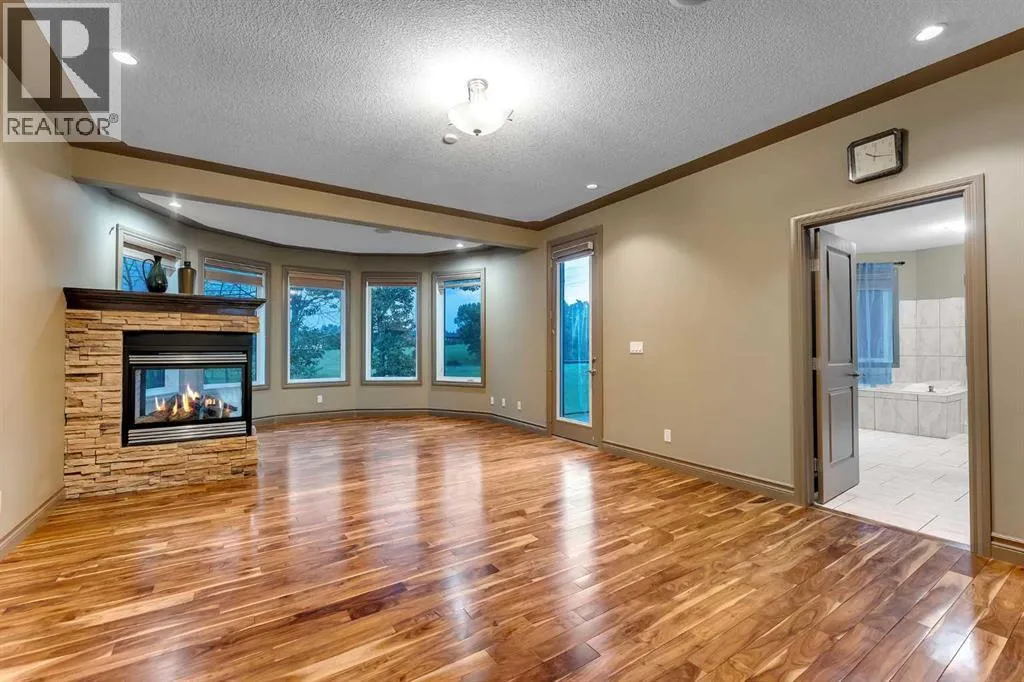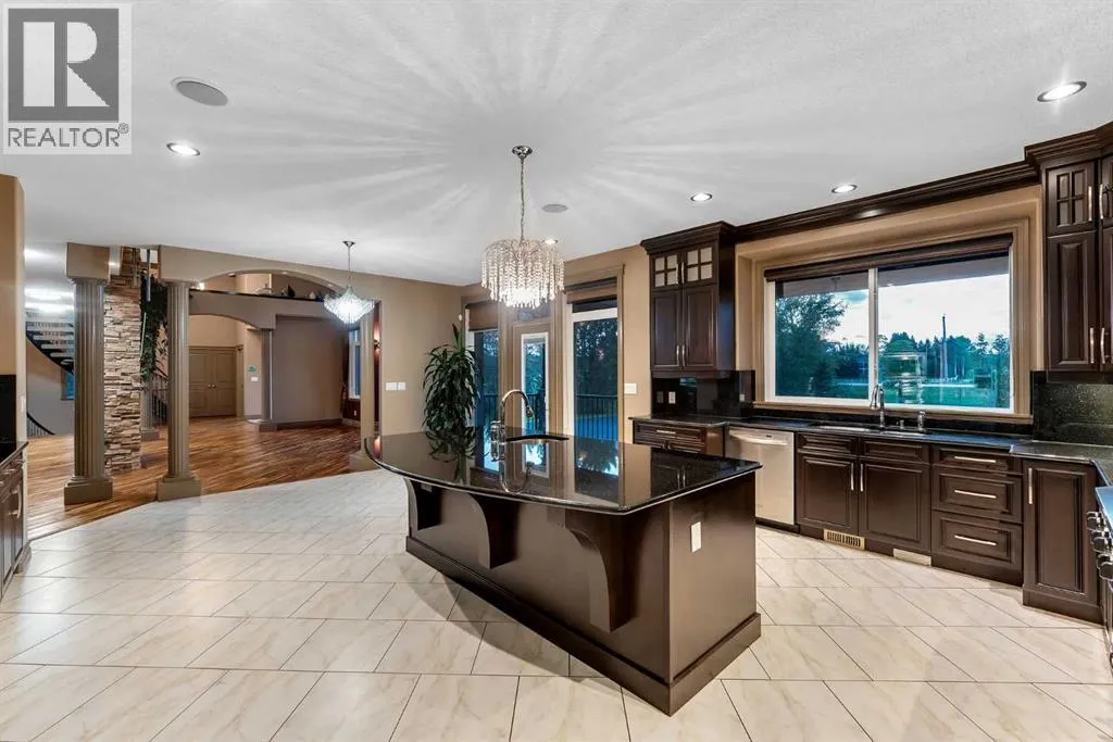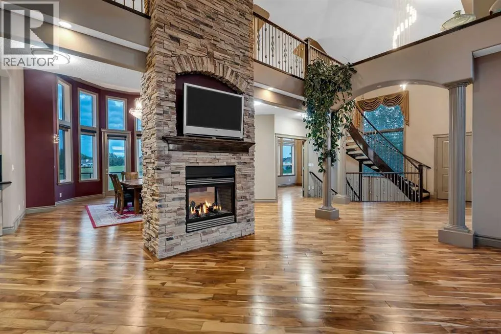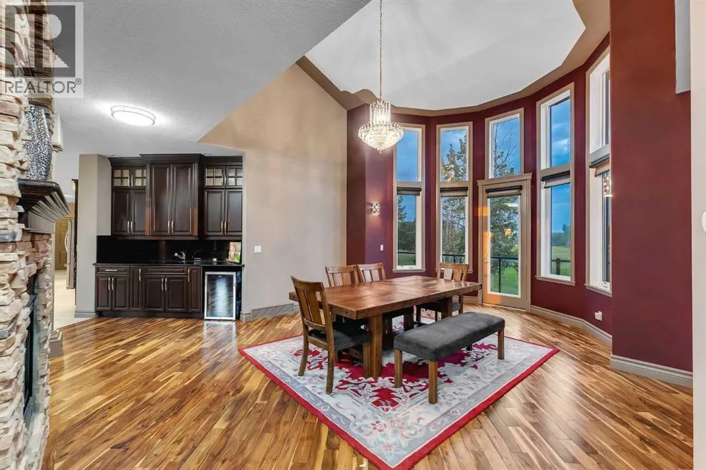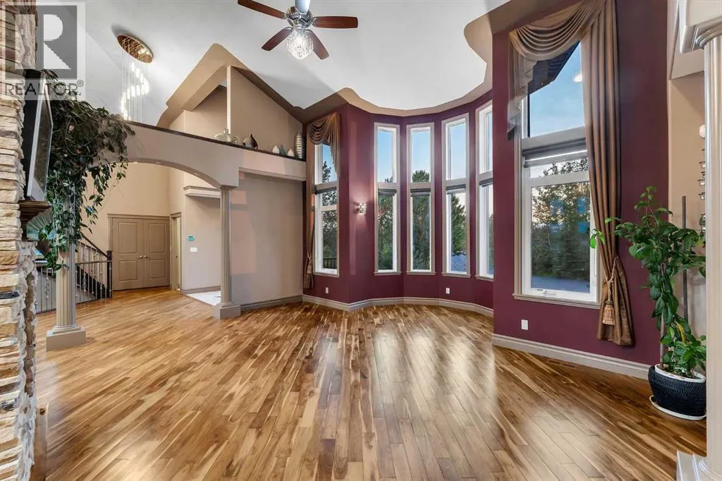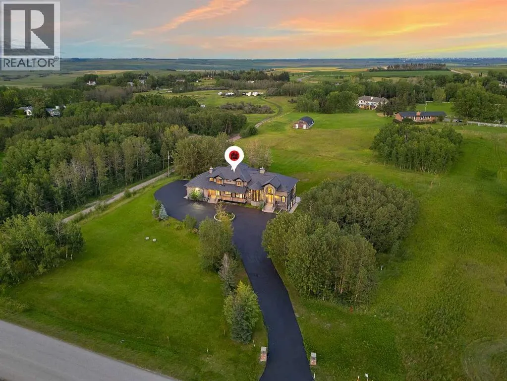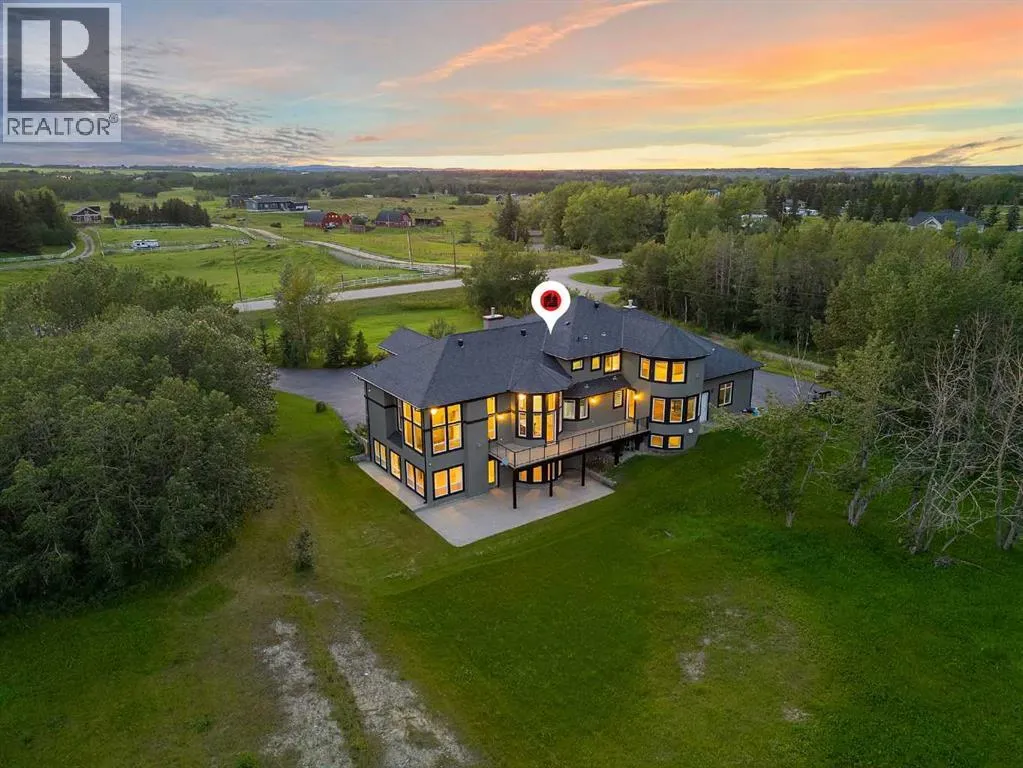 Discover refined acreage living on a fully landscaped 2-acre lot in one of Bearspawâs most coveted locations. This over 6,000 sq ft walkout estate blends timeless elegance with modern versatility, offering spaces designed for both everyday comfort and impressive entertaining. A striking open-riser staircase and upper walkway welcome you into a light-filled main floor. A stone-faced fireplace warms the private den, ideal for a home office or reading nook, while the gourmet kitchen features cherry cabinetry, stainless appliances, a gas range, and a spacious walk-in pantry. The kitchen flows into the vaulted-ceiling living room and dining area, where a double-sided fireplace and expansive windows frame lush greenery and distant mountain views. Thoughtfully designed for both privacy and connection, the home offers a serene main-level primary suite with private deck access, panoramic windows, and a spa-inspired ensuite. Upstairs, a second private suite with its own fireplace and 5-piece ensuite provides flexibility for guests or older children, alongside two additional generously sized bedrooms and a full bathâperfect for younger family members or long-term guests. The fully finished walkout basement is an entertainerâs dream, with a wet bar, wine storage, theatre room, two additional bedrooms (one with ensuite), and space for a gym, studio, or hobbies. This level opens directly to your outdoor oasis, where mature trees, manicured gardens, and multiple seating areas create a year-round retreat for gatherings or quiet relaxation. With exceptional craftsmanship, a versatile layout, and a prime Bearspaw address just minutes from Calgary, this home offers the perfect balance of luxury, space, and lifestyle. Book your private showing today and experience Bearspaw living at its finest. (id:27476)