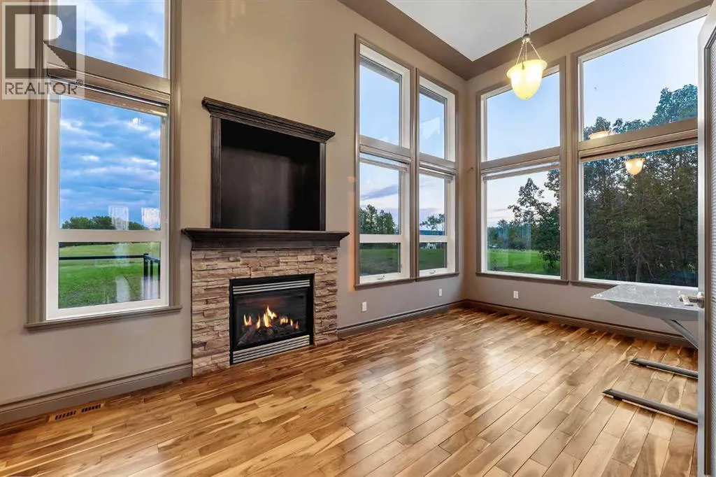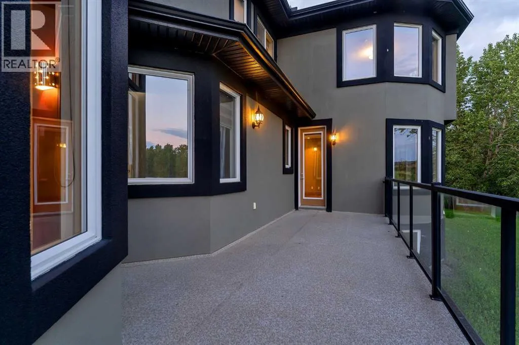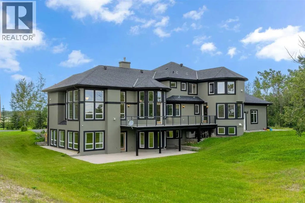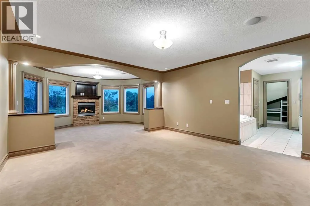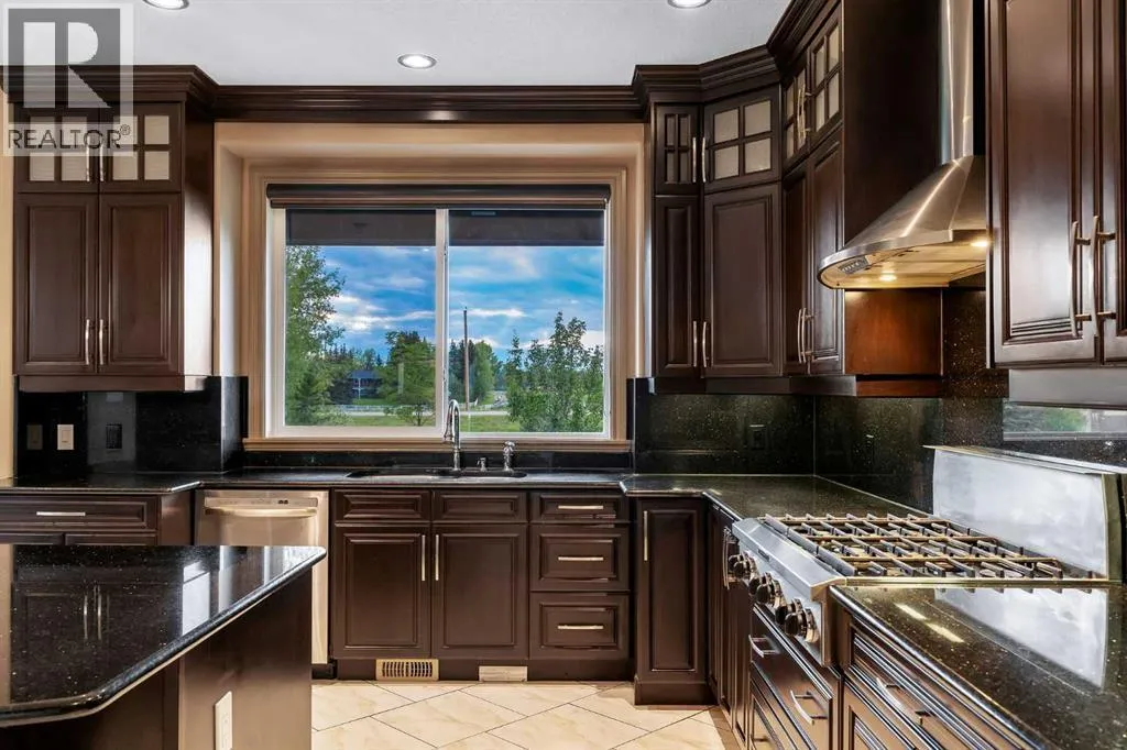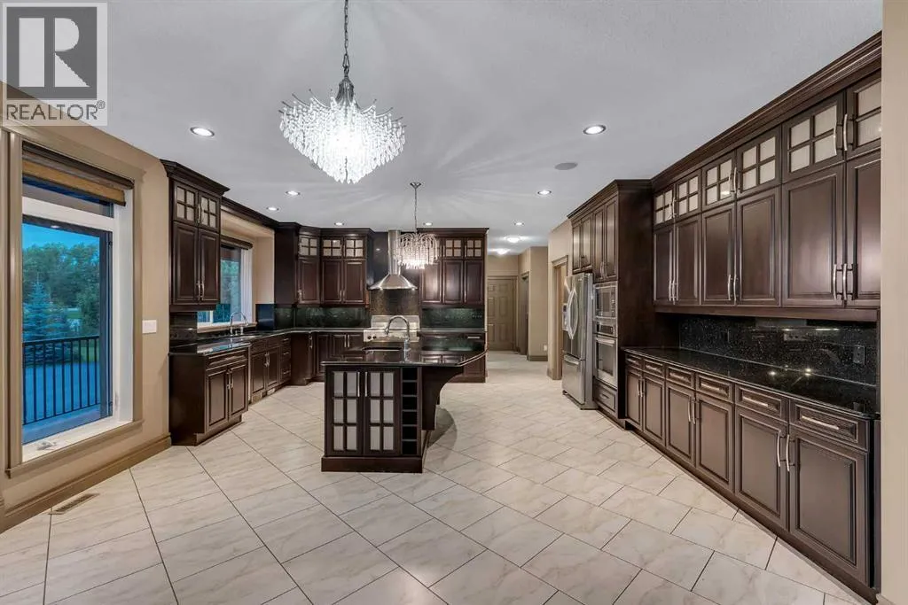 Discover refined acreage living on a fully landscaped 2-acre lot in one of Bearspawâs most coveted locations. This over 6,000 sq ft walkout estate blends timeless elegance with modern versatility, offering spaces designed for both everyday comfort and impressive entertaining. A striking open-riser staircase and upper walkway welcome you into a light-filled main floor. A stone-faced fireplace warms the private den, ideal for a home office or reading nook, while the gourmet kitchen features cherry cabinetry, stainless appliances, a gas range, and a spacious walk-in pantry. The kitchen flows into the vaulted-ceiling living room and dining area, where a double-sided fireplace and expansive windows frame lush greenery and distant mountain views. Thoughtfully designed for both privacy and connection, the home offers a serene main-level primary suite with private deck access, panoramic windows, and a spa-inspired ensuite. Upstairs, a second private suite with its own fireplace and 5-piece ensuite provides flexibility for guests or older children, alongside two additional generously sized bedrooms and a full bathâperfect for younger family members or long-term guests. The fully finished walkout basement is an entertainerâs dream, with a wet bar, wine storage, theatre room, two additional bedrooms (one with ensuite), and space for a gym, studio, or hobbies. This level opens directly to your outdoor oasis, where mature trees, manicured gardens, and multiple seating areas create a year-round retreat for gatherings or quiet relaxation. With exceptional craftsmanship, a versatile layout, and a prime Bearspaw address just minutes from Calgary, this home offers the perfect balance of luxury, space, and lifestyle. Book your private showing today and experience Bearspaw living at its finest. (id:27476)