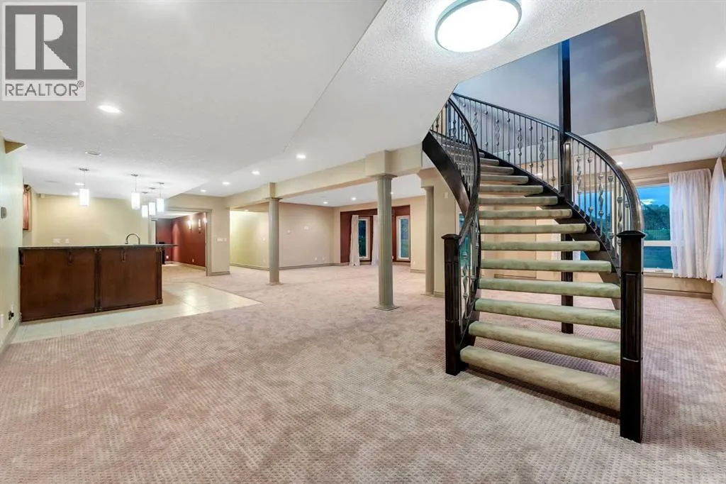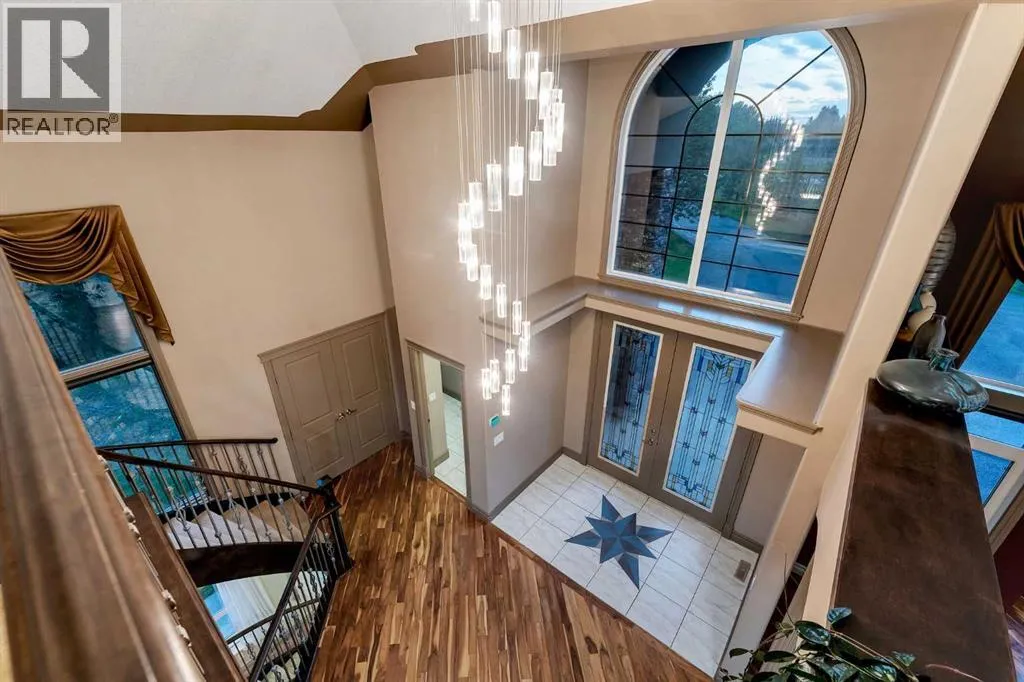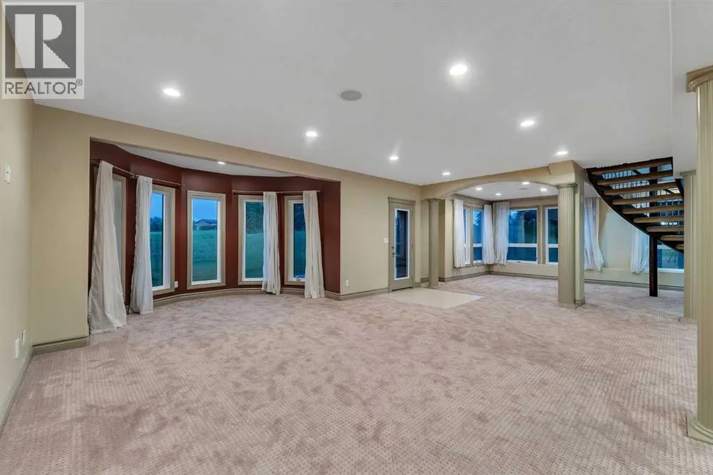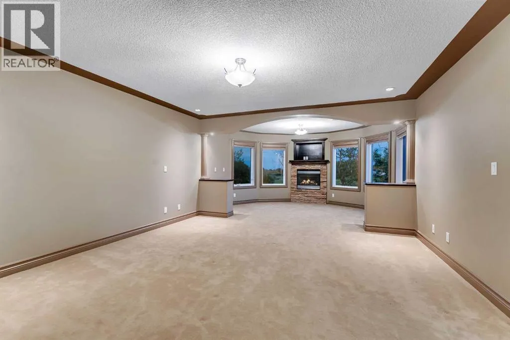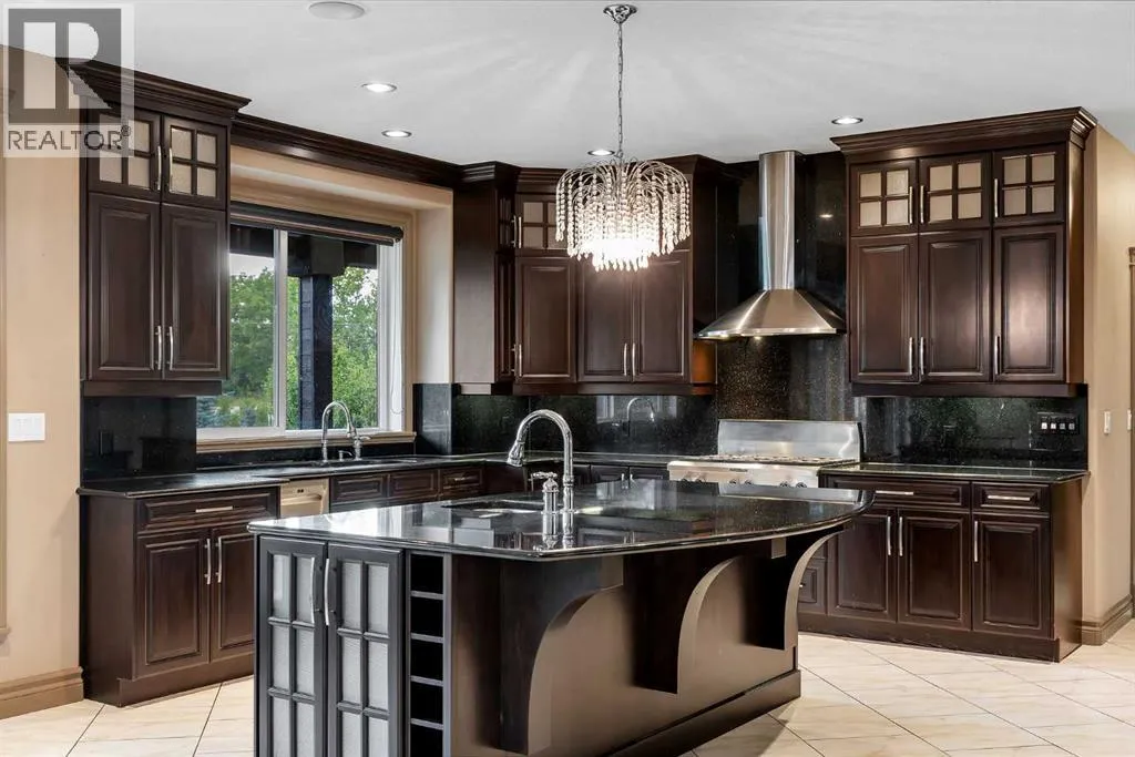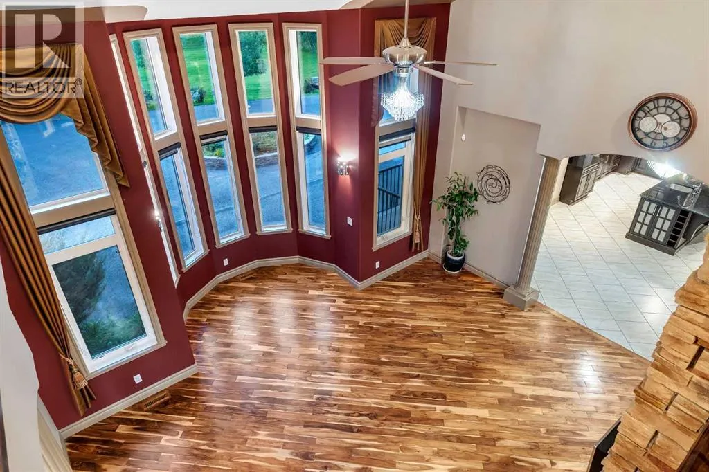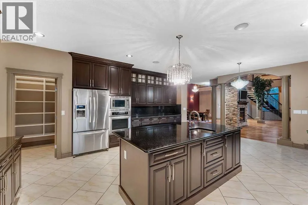 Discover refined acreage living on a fully landscaped 2-acre lot in one of Bearspawâs most coveted locations. This over 6,000 sq ft walkout estate blends timeless elegance with modern versatility, offering spaces designed for both everyday comfort and impressive entertaining. A striking open-riser staircase and upper walkway welcome you into a light-filled main floor. A stone-faced fireplace warms the private den, ideal for a home office or reading nook, while the gourmet kitchen features cherry cabinetry, stainless appliances, a gas range, and a spacious walk-in pantry. The kitchen flows into the vaulted-ceiling living room and dining area, where a double-sided fireplace and expansive windows frame lush greenery and distant mountain views. Thoughtfully designed for both privacy and connection, the home offers a serene main-level primary suite with private deck access, panoramic windows, and a spa-inspired ensuite. Upstairs, a second private suite with its own fireplace and 5-piece ensuite provides flexibility for guests or older children, alongside two additional generously sized bedrooms and a full bathâperfect for younger family members or long-term guests. The fully finished walkout basement is an entertainerâs dream, with a wet bar, wine storage, theatre room, two additional bedrooms (one with ensuite), and space for a gym, studio, or hobbies. This level opens directly to your outdoor oasis, where mature trees, manicured gardens, and multiple seating areas create a year-round retreat for gatherings or quiet relaxation. With exceptional craftsmanship, a versatile layout, and a prime Bearspaw address just minutes from Calgary, this home offers the perfect balance of luxury, space, and lifestyle. Book your private showing today and experience Bearspaw living at its finest. (id:27476)
