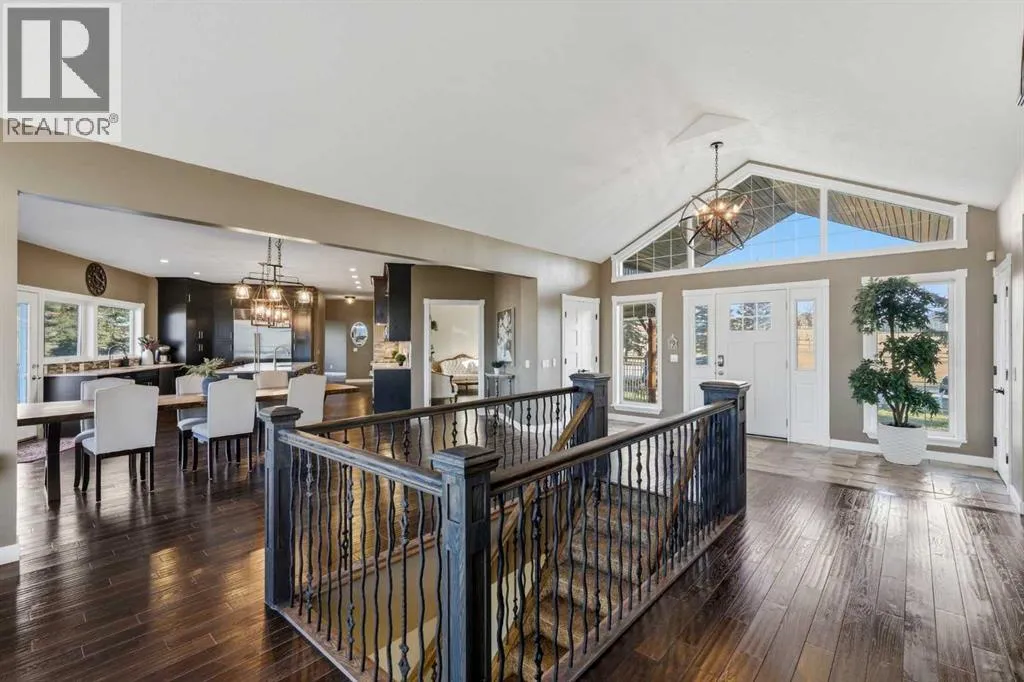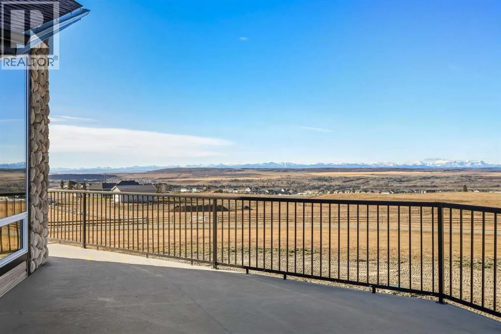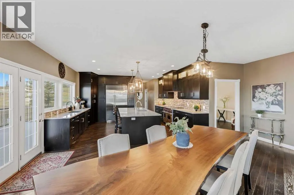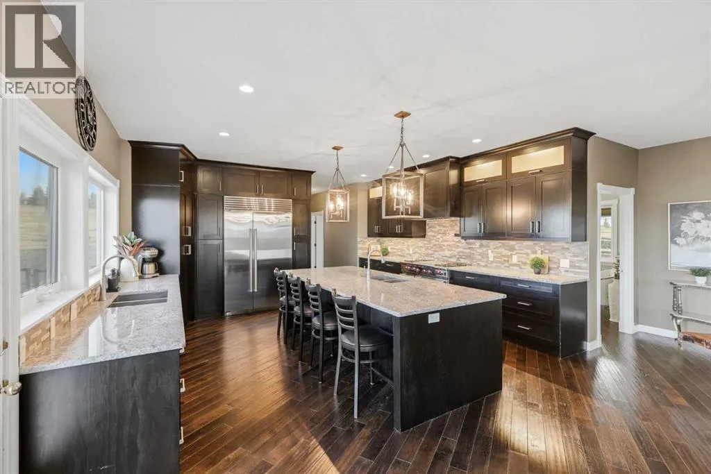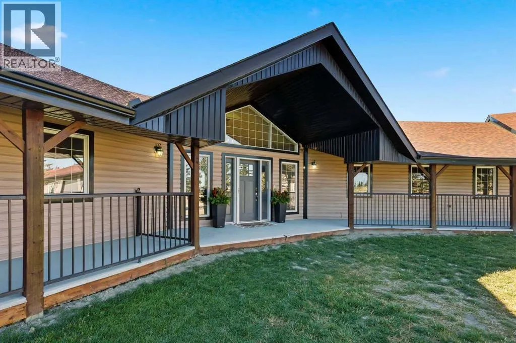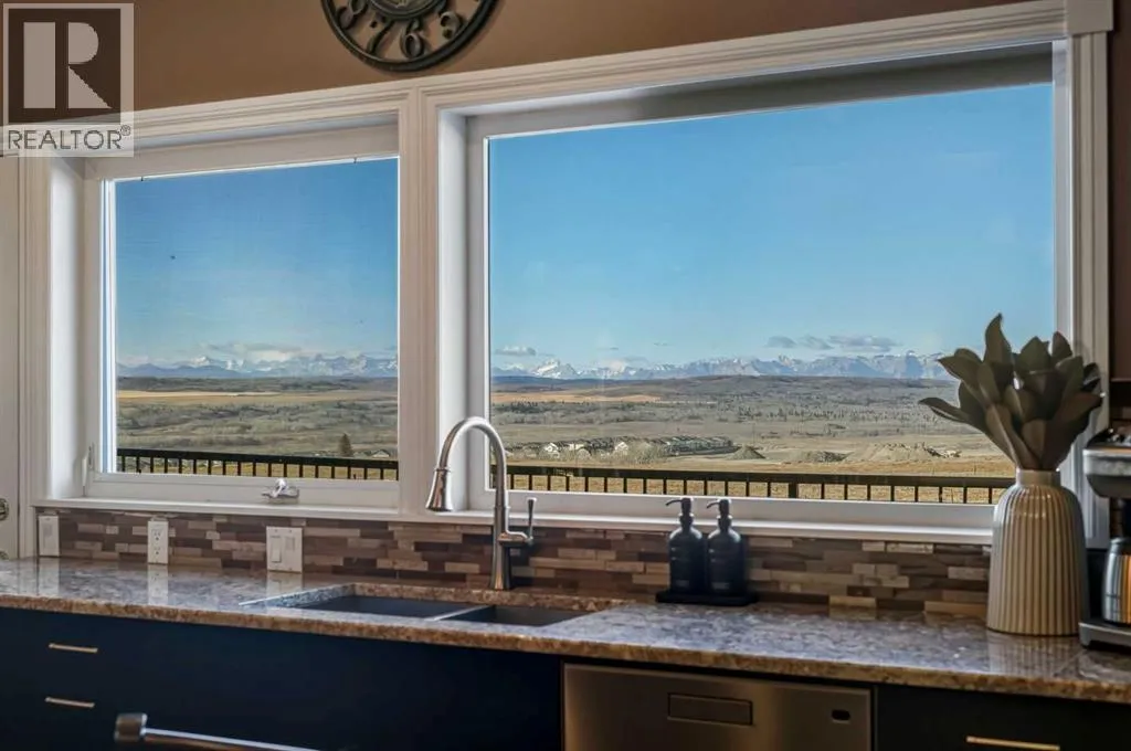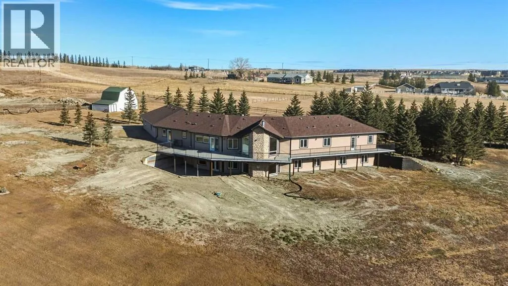 This stunning 4.41-acre property presents an exceptional opportunity to own a picturesque parcel of land with sweeping mountain views and a beautifully designed walkout bungalow. Nestled at the end of a serene, tree-lined drive, the home exudes timeless country charm with its sprawling layout, expansive wrap-around deck, and triple car garage â perfectly combining peaceful rural living with the convenience of being just minutes from Cochrane. Step inside the large front foyer, where vaulted ceilings immediately impress. The living room is a showpiece, centered around a dramatic floor-to-ceiling stone fireplace, with windows perfectly framing the breathtaking Rocky Mountain views. The spacious dining room is ideal for entertaining family and friends, offering ample space for large gatherings while enjoying the open-concept flow and natural light throughout. The chef-inspired kitchen is a standout, featuring a Wolf gas stove, Sub-Zero fridge, dual dishwashers, custom range hood, pot filler, and expansive granite countertops â perfect for both cooking and entertaining. A convenient office just off the kitchen provides a quiet workspace or flexible area. The primary suite is a tranquil retreat with spacious walk-in closets complete with organizers and private access to the west-facing deck. The ensuite bathroom is luxurious and spa-like, with double sinks, granite countertops, a large soaker tub, and a favorite feature of the current owners â an incredible steam shower. Two additional bedrooms and a full bathroom complete this wing of the home. The mudroom is highly functional, offering a half bath, laundry room with sink, and plenty of cabinetry and storage space. The attached triple garage is set up for both workshop and parking needs and is roughed in for in-floor heating and a future sink. Downstairs, the walkout basement continues to impress with a gas fireplace that anchors the space and creates a welcoming atmosphere. The expansive recreation area offers endless options â from a home gym to games or family entertaining space â all finished with durable slate flooring. The family room is perfect for movie nights or cozy evenings in. Two additional bedrooms and a full bathroom complete the lower level. Step outside to the covered patio with beautifully finished exposed aggregate concrete off the lower walkout â a generous outdoor space with room for a hot tub, sauna, or your dream outdoor living setup, all while enjoying awe-inspiring views! This home has seen thoughtful upgrades, including a new roof (2022), full replacement of poly-B plumbing, a water filtration system, a new electrical panel, a new concrete garage floor with rough-in for in-floor heating, a utility sink and a new concrete driveway apron. This exceptional property, complete with a barn, room for animals, and stunning mountain vistas, balances timeless country allure with comfort, functionality, and the perfect setting for family life! (id:27476)
