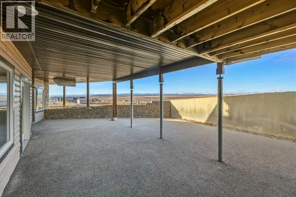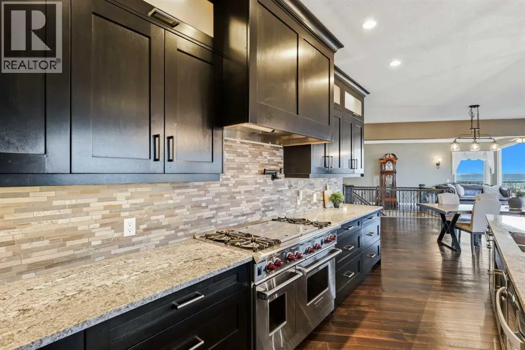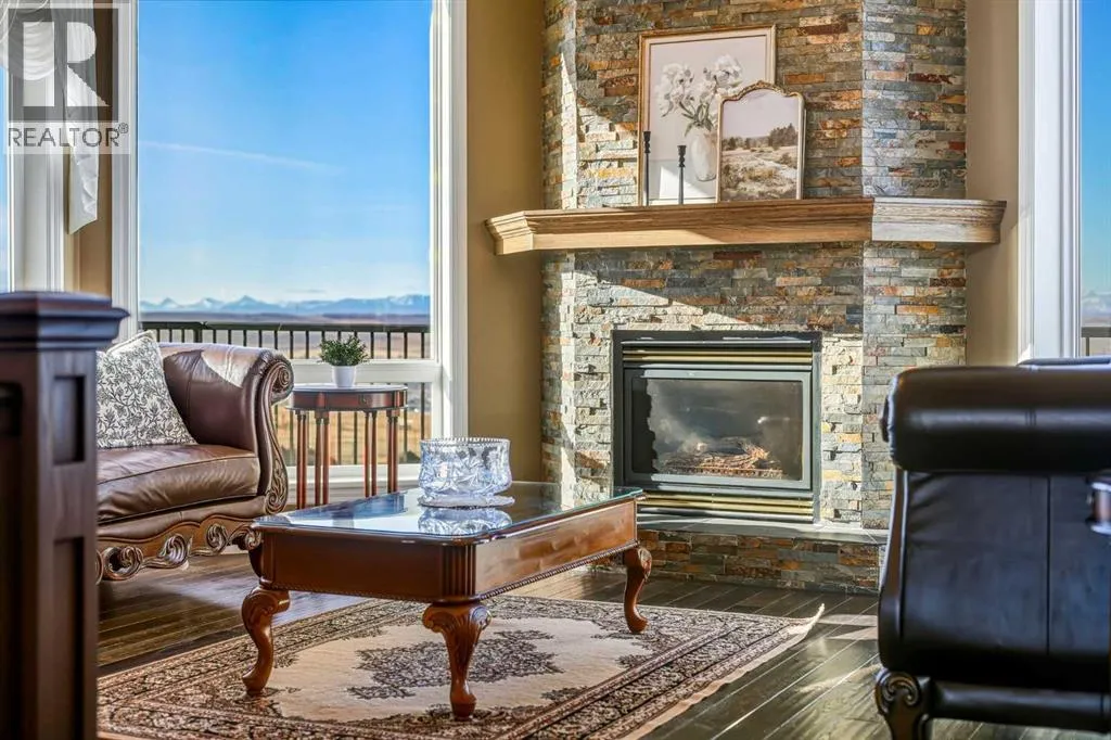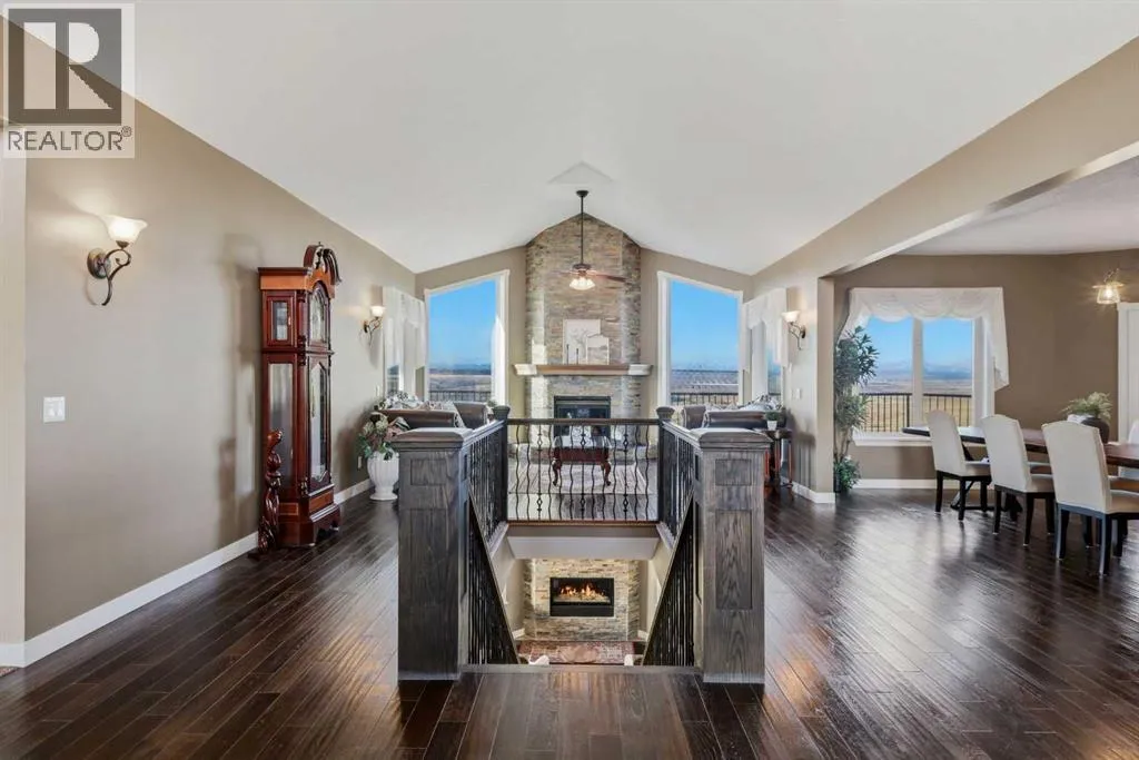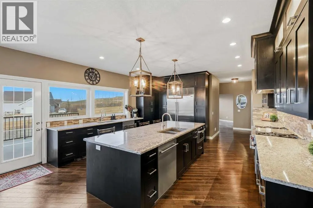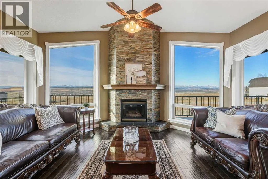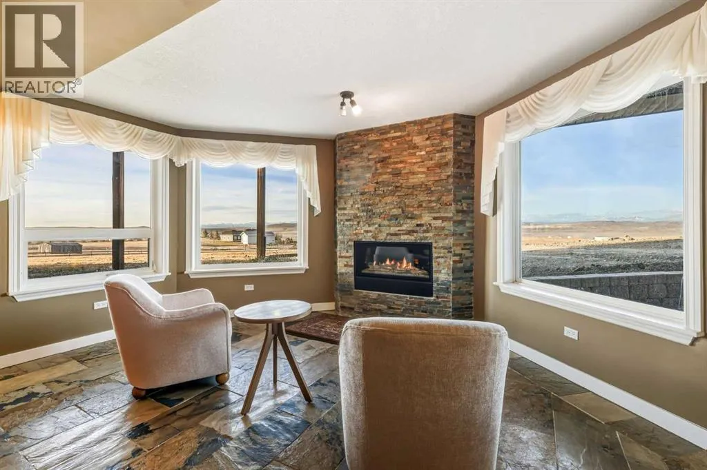 This stunning 4.41-acre property presents an exceptional opportunity to own a picturesque parcel of land with sweeping mountain views and a beautifully designed walkout bungalow. Nestled at the end of a serene, tree-lined drive, the home exudes timeless country charm with its sprawling layout, expansive wrap-around deck, and triple car garage â perfectly combining peaceful rural living with the convenience of being just minutes from Cochrane. Step inside the large front foyer, where vaulted ceilings immediately impress. The living room is a showpiece, centered around a dramatic floor-to-ceiling stone fireplace, with windows perfectly framing the breathtaking Rocky Mountain views. The spacious dining room is ideal for entertaining family and friends, offering ample space for large gatherings while enjoying the open-concept flow and natural light throughout. The chef-inspired kitchen is a standout, featuring a Wolf gas stove, Sub-Zero fridge, dual dishwashers, custom range hood, pot filler, and expansive granite countertops â perfect for both cooking and entertaining. A convenient office just off the kitchen provides a quiet workspace or flexible area. The primary suite is a tranquil retreat with spacious walk-in closets complete with organizers and private access to the west-facing deck. The ensuite bathroom is luxurious and spa-like, with double sinks, granite countertops, a large soaker tub, and a favorite feature of the current owners â an incredible steam shower. Two additional bedrooms and a full bathroom complete this wing of the home. The mudroom is highly functional, offering a half bath, laundry room with sink, and plenty of cabinetry and storage space. The attached triple garage is set up for both workshop and parking needs and is roughed in for in-floor heating and a future sink. Downstairs, the walkout basement continues to impress with a gas fireplace that anchors the space and creates a welcoming atmosphere. The expansive recreation area offers endless options â from a home gym to games or family entertaining space â all finished with durable slate flooring. The family room is perfect for movie nights or cozy evenings in. Two additional bedrooms and a full bathroom complete the lower level. Step outside to the covered patio with beautifully finished exposed aggregate concrete off the lower walkout â a generous outdoor space with room for a hot tub, sauna, or your dream outdoor living setup, all while enjoying awe-inspiring views! This home has seen thoughtful upgrades, including a new roof (2022), full replacement of poly-B plumbing, a water filtration system, a new electrical panel, a new concrete garage floor with rough-in for in-floor heating, a utility sink and a new concrete driveway apron. This exceptional property, complete with a barn, room for animals, and stunning mountain vistas, balances timeless country allure with comfort, functionality, and the perfect setting for family life! (id:27476)