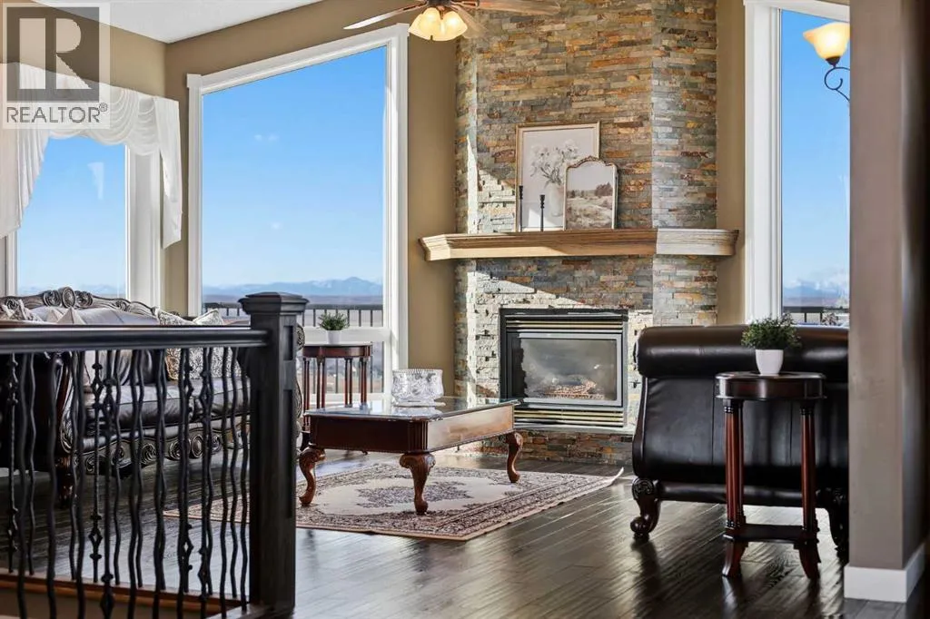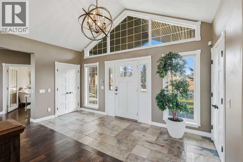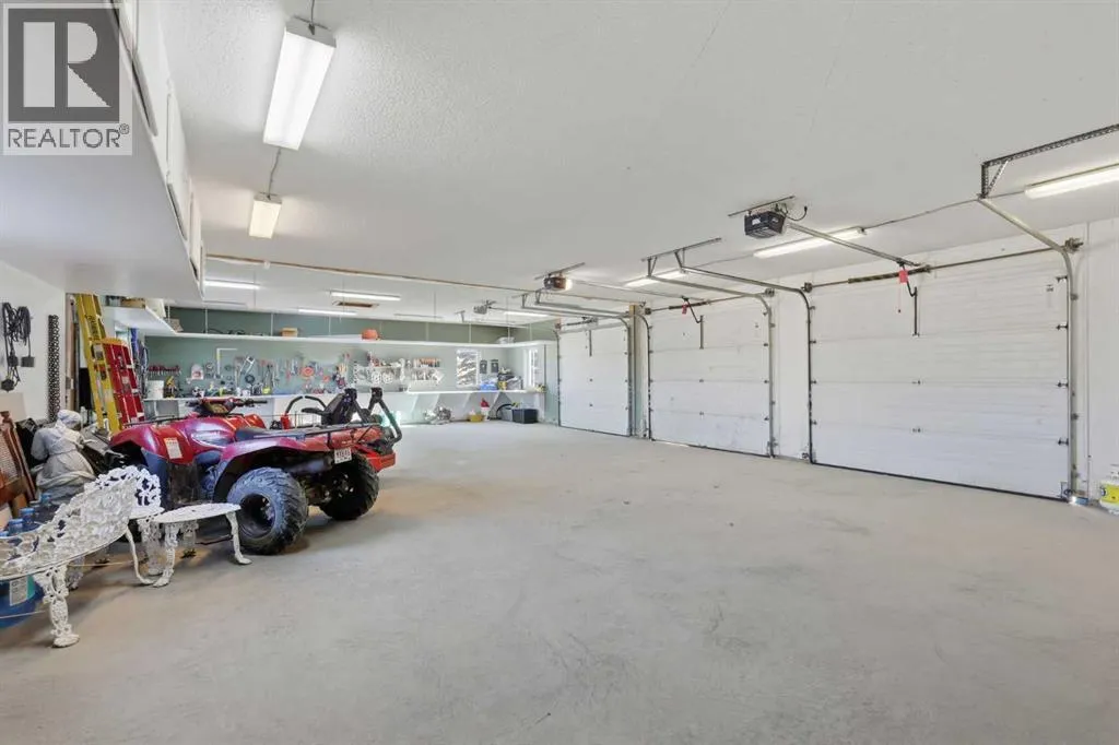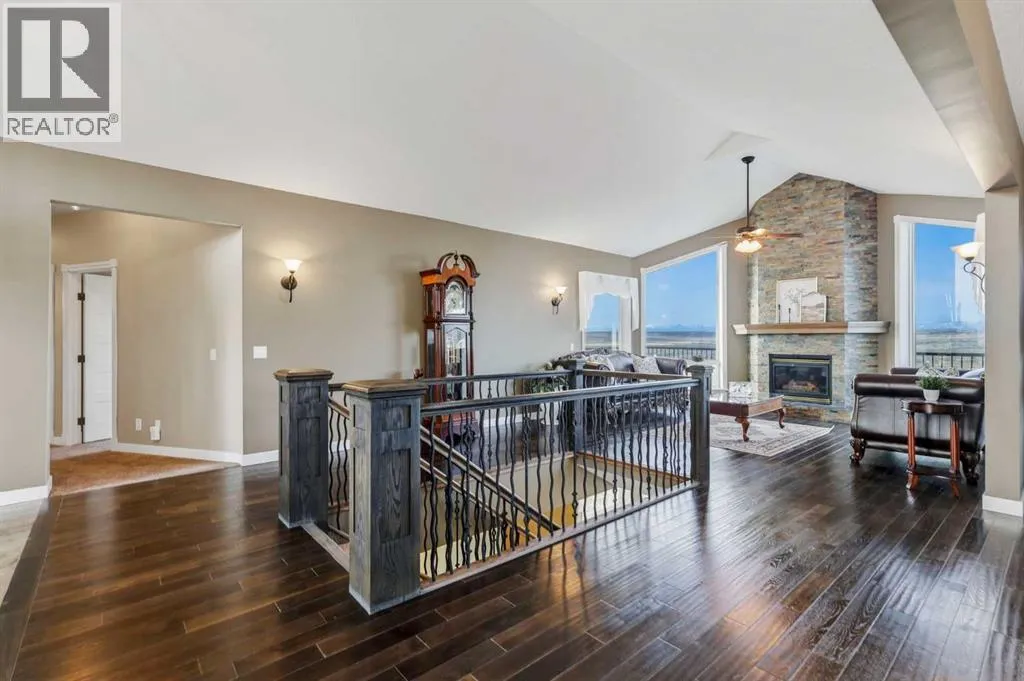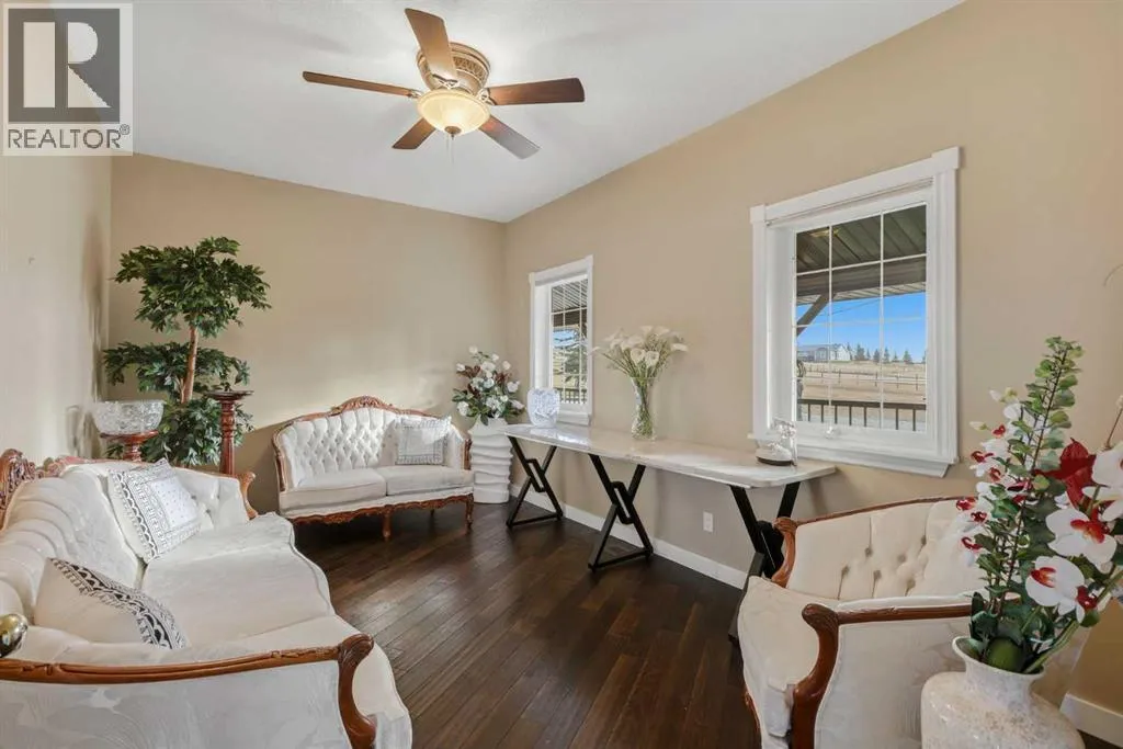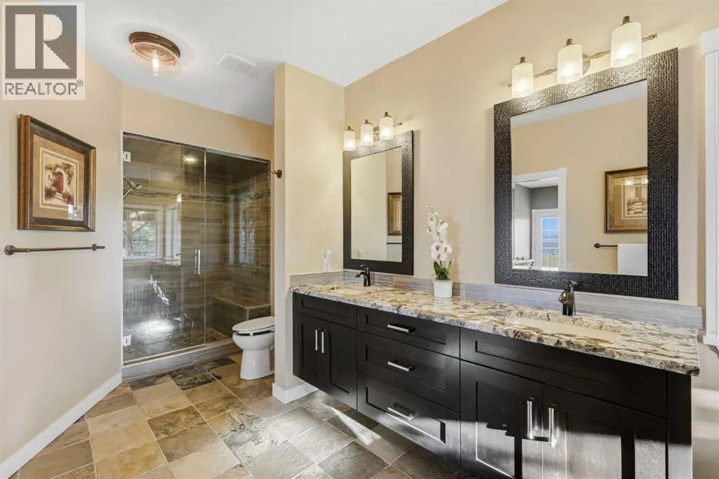 This stunning 4.41-acre property presents an exceptional opportunity to own a picturesque parcel of land with sweeping mountain views and a beautifully designed walkout bungalow. Nestled at the end of a serene, tree-lined drive, the home exudes timeless country charm with its sprawling layout, expansive wrap-around deck, and triple car garage â perfectly combining peaceful rural living with the convenience of being just minutes from Cochrane. Step inside the large front foyer, where vaulted ceilings immediately impress. The living room is a showpiece, centered around a dramatic floor-to-ceiling stone fireplace, with windows perfectly framing the breathtaking Rocky Mountain views. The spacious dining room is ideal for entertaining family and friends, offering ample space for large gatherings while enjoying the open-concept flow and natural light throughout. The chef-inspired kitchen is a standout, featuring a Wolf gas stove, Sub-Zero fridge, dual dishwashers, custom range hood, pot filler, and expansive granite countertops â perfect for both cooking and entertaining. A convenient office just off the kitchen provides a quiet workspace or flexible area. The primary suite is a tranquil retreat with spacious walk-in closets complete with organizers and private access to the west-facing deck. The ensuite bathroom is luxurious and spa-like, with double sinks, granite countertops, a large soaker tub, and a favorite feature of the current owners â an incredible steam shower. Two additional bedrooms and a full bathroom complete this wing of the home. The mudroom is highly functional, offering a half bath, laundry room with sink, and plenty of cabinetry and storage space. The attached triple garage is set up for both workshop and parking needs and is roughed in for in-floor heating and a future sink. Downstairs, the walkout basement continues to impress with a gas fireplace that anchors the space and creates a welcoming atmosphere. The expansive recreation area offers endless options â from a home gym to games or family entertaining space â all finished with durable slate flooring. The family room is perfect for movie nights or cozy evenings in. Two additional bedrooms and a full bathroom complete the lower level. Step outside to the covered patio with beautifully finished exposed aggregate concrete off the lower walkout â a generous outdoor space with room for a hot tub, sauna, or your dream outdoor living setup, all while enjoying awe-inspiring views! This home has seen thoughtful upgrades, including a new roof (2022), full replacement of poly-B plumbing, a water filtration system, a new electrical panel, a new concrete garage floor with rough-in for in-floor heating, a utility sink and a new concrete driveway apron. This exceptional property, complete with a barn, room for animals, and stunning mountain vistas, balances timeless country allure with comfort, functionality, and the perfect setting for family life! (id:27476)