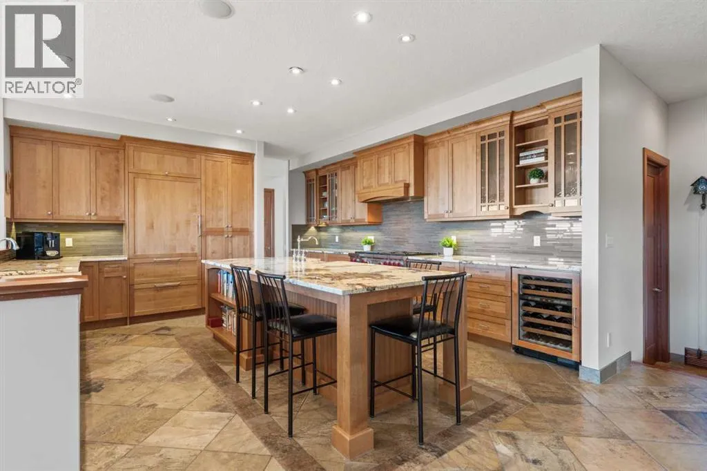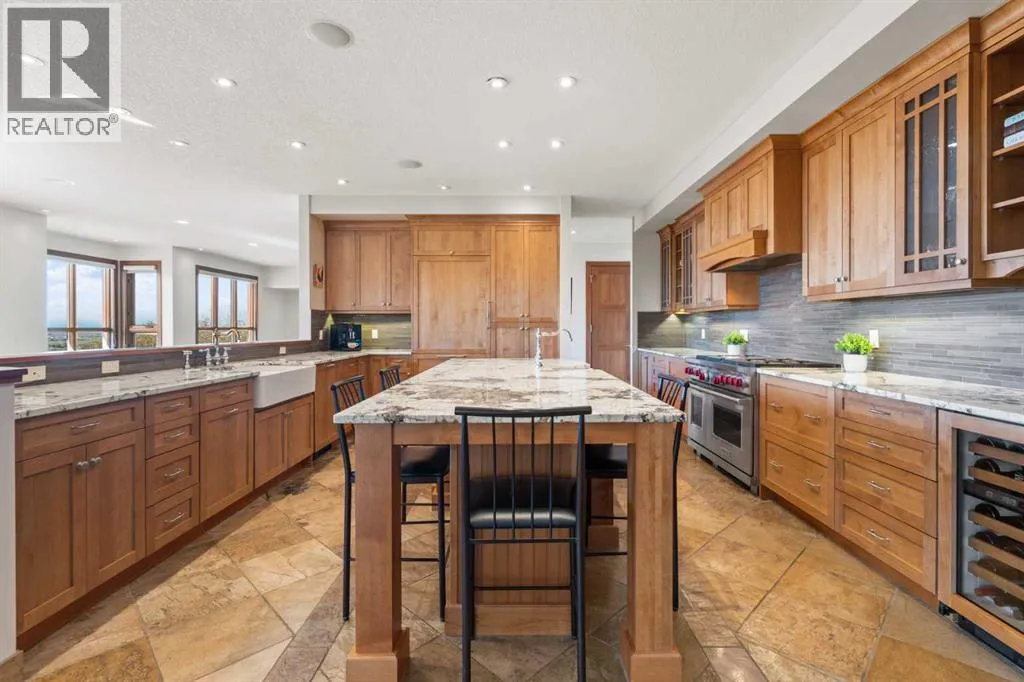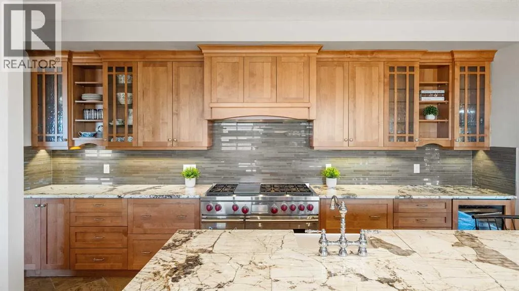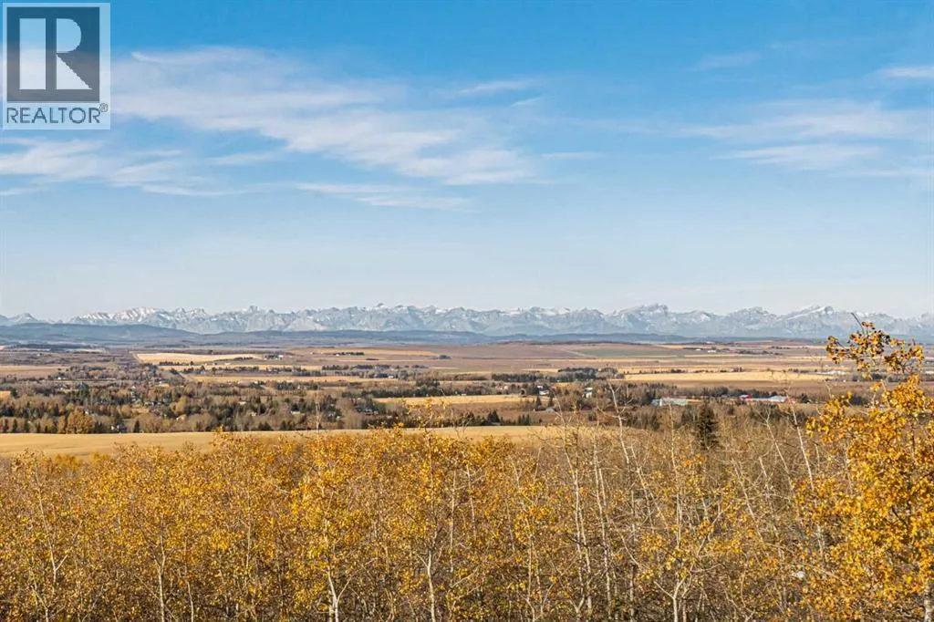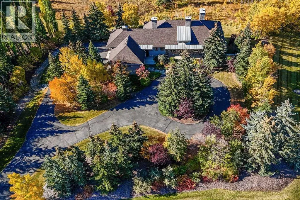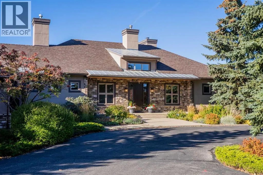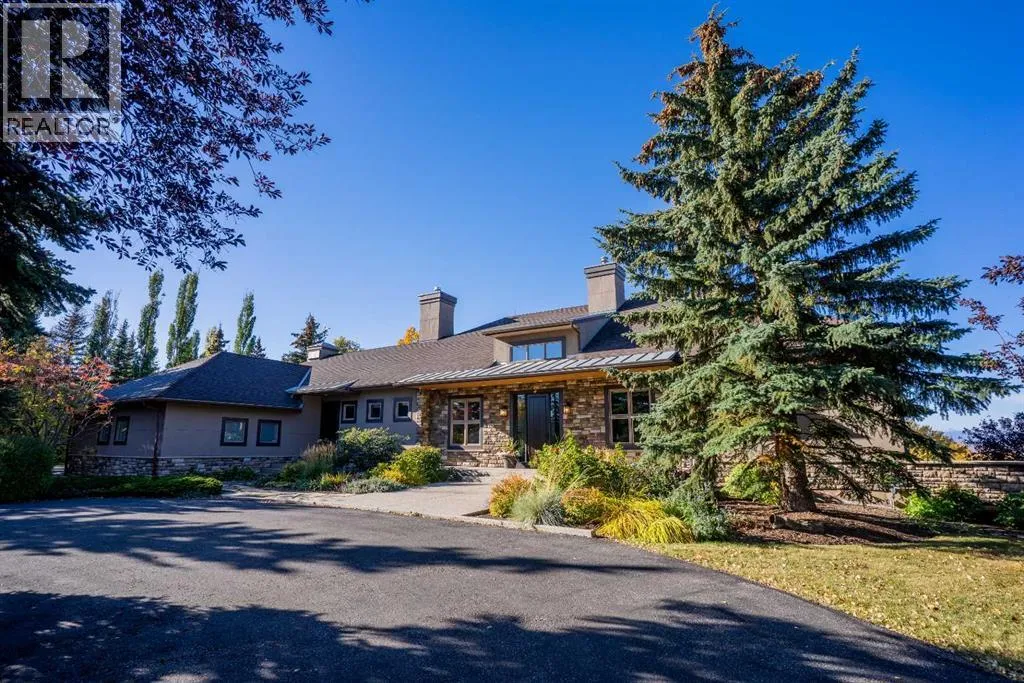 This exceptional, one-of-a-kind property offers the best of Springbank living â privacy, tranquillity, and breathtaking Rocky Mountain views. Set on a picturesque 2.17-acre lot in the heart of Pinnacle Ridge, this walkout bungalow sits high on the ridge, surrounded by beautifully landscaped grounds that provide seclusion from the street and neighbours. Tucked away from main roads, the property features its own private ravine, approximately one acre of mature trees and natural landscape, offering beauty and privacy while minimizing yard maintenance. A circular driveway flanked by mature trees sets the tone from the moment you arrive â this is truly something special. Inside, youâre greeted by stunning mountain vistas and an open layout. The beautifully renovated kitchen features a large island, granite countertops, and high-end appliances, including a Sub-Zero refrigerator, wine fridge, microwave, and 48â Wolf gas range. It opens to a bright dining space and sitting area with access to the large main deck (23' x 22'). The spacious living room, complete with a fireplace, perfectly frames the magnificent mountain backdrop. The main-floor primary suite offers a luxurious six-piece ensuite and a generous walk-in closet. The main level also includes a home office, two powder rooms, a walk-in pantry, and a mudroom that connects to an oversized four-car garage. The 54' x 26' garage (1,279 sq. ft.) is insulated, drywalled, painted, and finished with epoxy flooring, with half the space offering a 12â3â ceiling that is ideal for large trucks or lifts. The walkout lower level features a large recreation room, a wet bar that seats up to ten, a dedicated theatre room, three additional bedrooms, and two full baths. Cherry hardwood and tile flooring flow throughout the home, with wool carpet in the lower-level bedrooms for added comfort. The exterior showcases stucco and stone, complemented by a newer asphalt shingle roof (2020, 50-year warranty). An enclosed under-deck storage roo m is ideal for garden tools or a ride-on mower. This immaculate property has been meticulously maintained by its current owners, with recent mechanical upgrades including two new furnaces with humidifiers (2019) and two new air-conditioning units (2024). A truly remarkable estate combining privacy, panoramic views, and refined living in one of Springbankâs most sought-after locations. (id:27476)