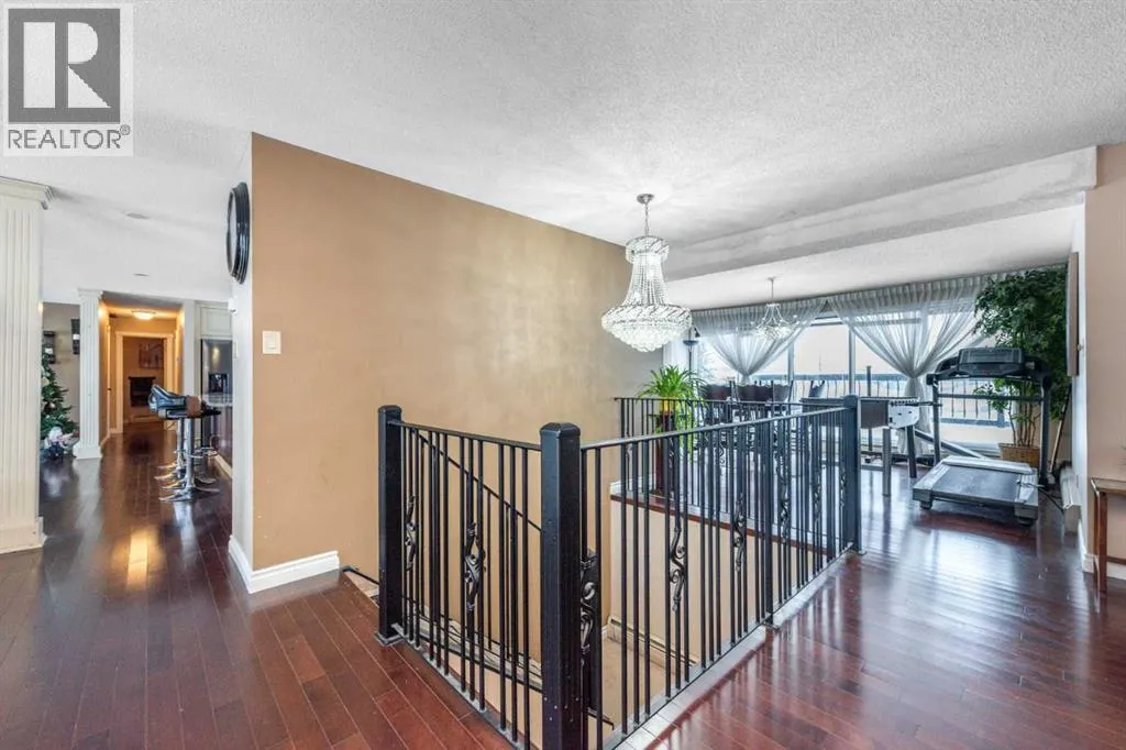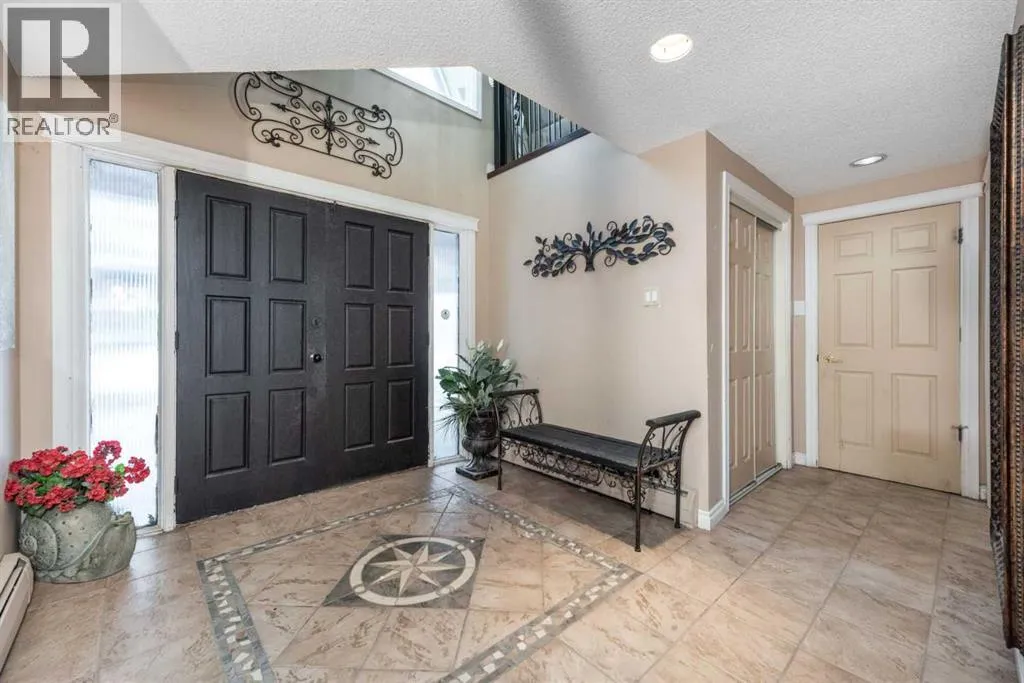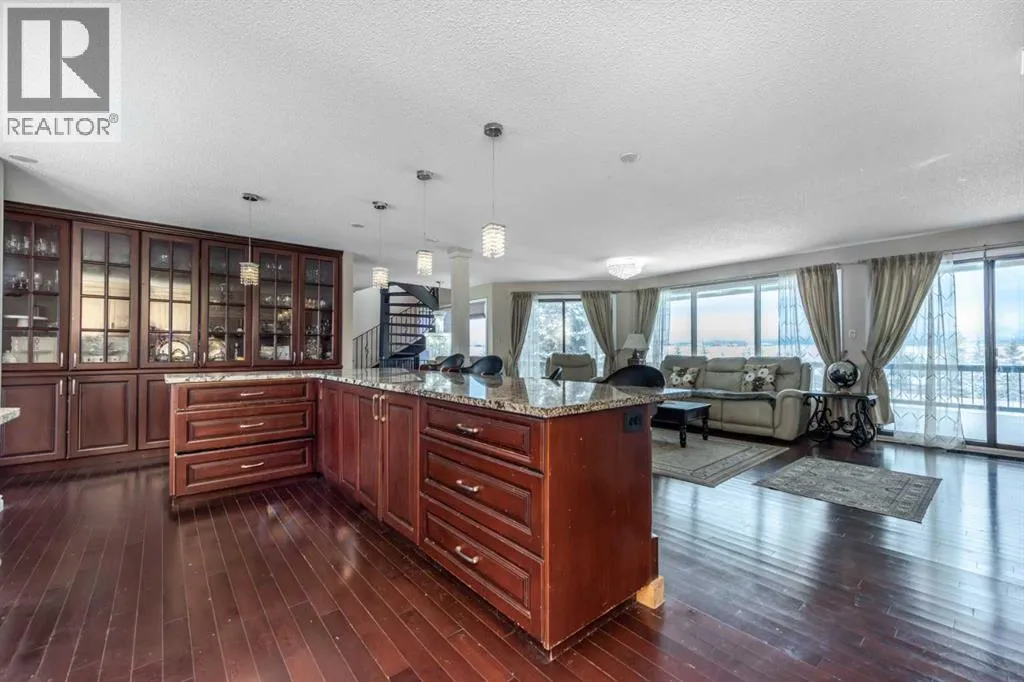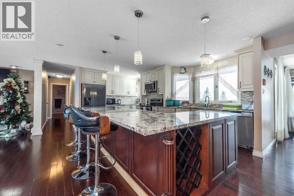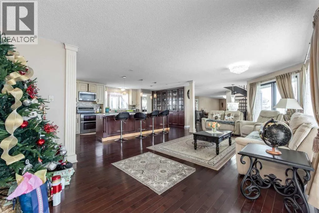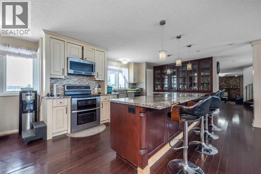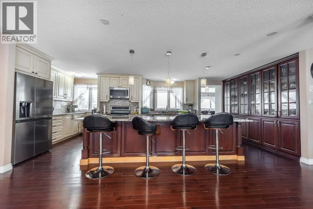 Rare opportunity in sought-after North Springbank! Nearly 4 acres perched on a picturesque knoll with 360° mountain, valley, and city views. This peaceful, private acreage offers gently rolling, fenced landâideal for families, hobbyists, anyone seeking space, or the perfect lot to build your dream homeâall just minutes from the upcoming Bingham Crossing Mall, new Costco, top schools, Springbank Airport, and Springbank Links Golf Course. This reversed walkout, lofted hillside bungalow features a bright open layout, a sunken living room with brick fireplace, formal dining room, spacious kitchen with island, large family room with second fireplace, and 3 bedrooms on the main level. A unique upper office loft accessed by a circular staircase adds extra versatility. Enjoy the massive partially covered west-facing deck plus an additional east deck and balcony. A 3-car heated attached garage with covered carports provides ample parking, along with room for RVs and equipment. The 40âx47â metal Quonset, offers excellent workshop, storage, or hobby use. This is a prime Springbank location offering quiet country living with outstanding convenience and exceptional long-term potential. (id:27476)