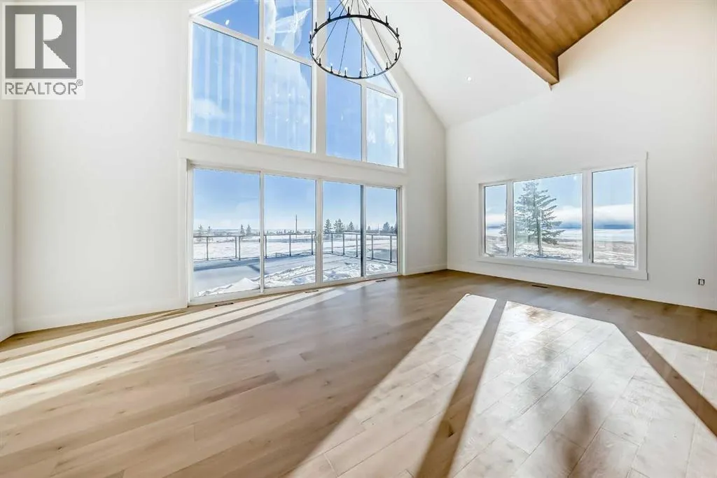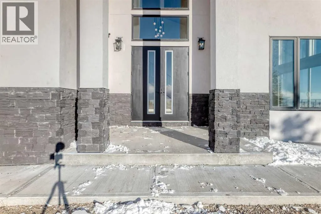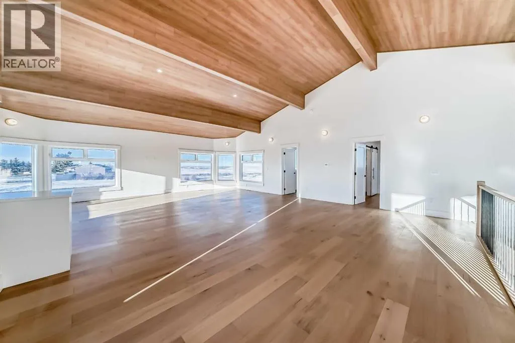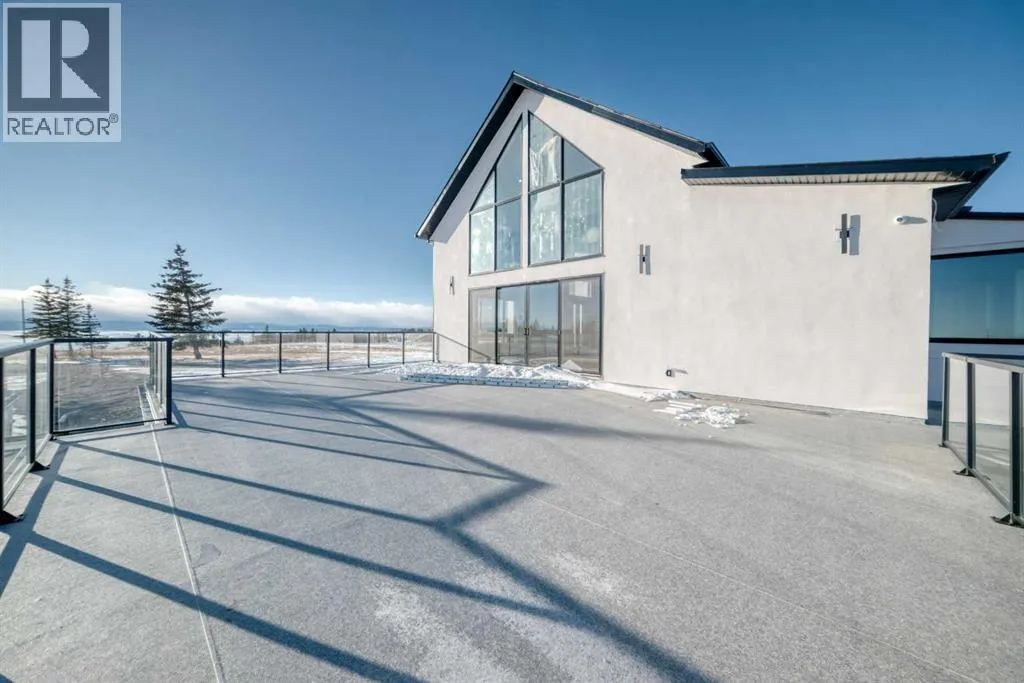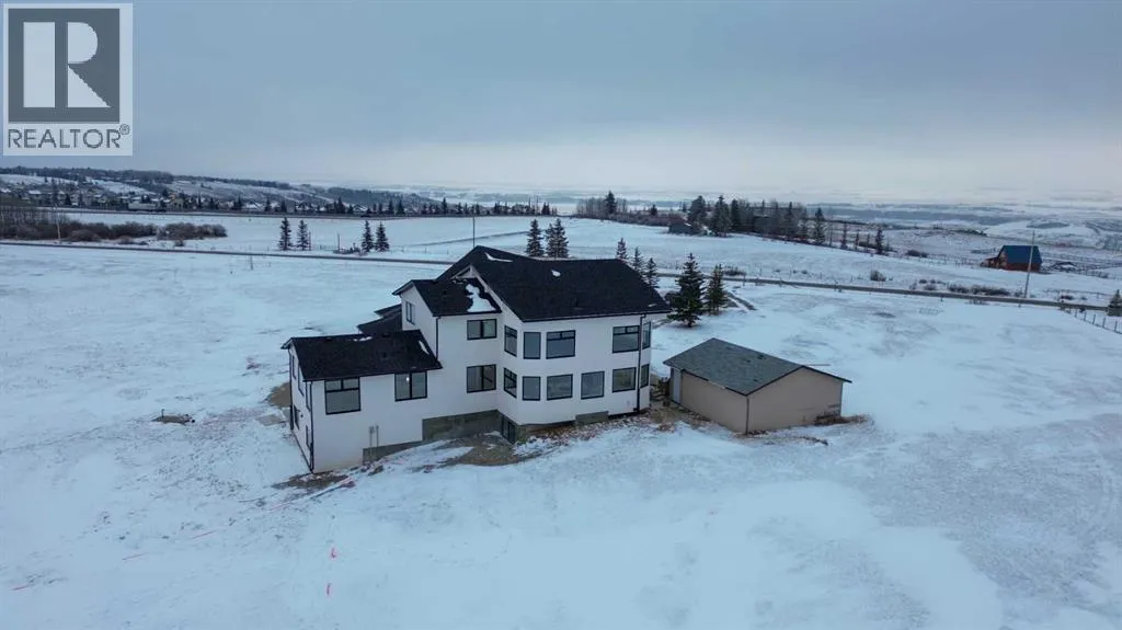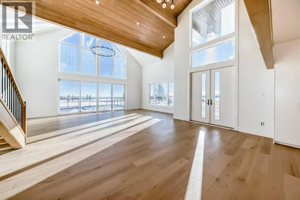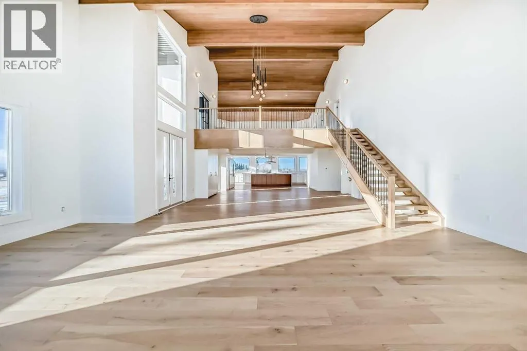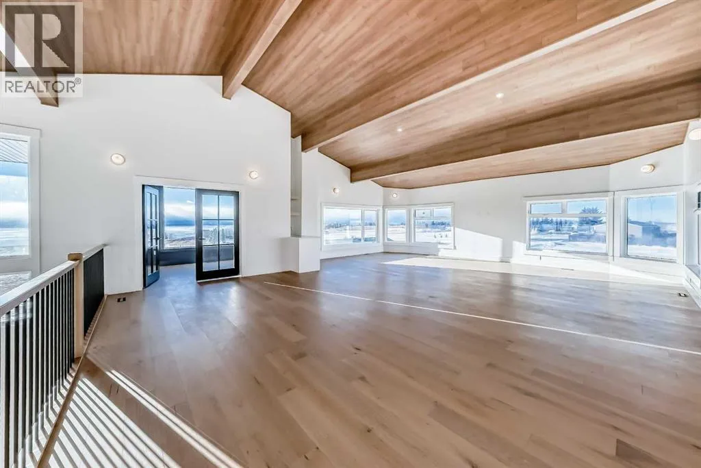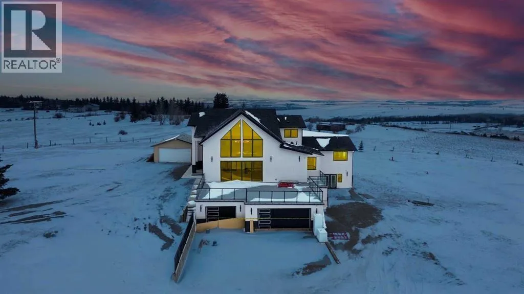 WELCOME TO THIS EXCEPTIONAL, FULLY RENOVATED ACREAGE set on over 4 acres just minutes from Cochrane, offering unobstructed 360° panoramic views of the Rocky Mountains and the Cochrane valley. Located in a quiet, cul-de-sac-style acreage community, this remarkable property provides privacy, peace, and minimal trafficâideal for those seeking a refined country lifestyle with city convenience nearby.This striking 1.5-storey residence offers over 6,600 sq. ft. of total living space including a fully developed walk-out basement, delivering exceptional functionality for families, entertaining, and flexible living arrangements.The main level impresses with vaulted ceilings, exposed wood beams, and expansive windows that flood the home with natural light while perfectly framing the breathtaking views. The west-facing kitchen features high-end appliances, ample cabinet space and premium finishesâideal for both everyday living and entertaining while enjoying spectacular sunsets and mountain views. The open-concept living and dining areas create a warm, inviting atmosphere.The main-floor primary retreat is complete with large windows showcasing the scenery and a luxurious 5-piece ensuite featuring a soaker tub, walk-in shower, dual vanities, and elegant finishes. A spacious second bedroom, a stylish 4-piece bathroom, convenient main-floor laundry, and a flexible den or office space complete this level.The upper floor offers an expansive bonus room with ample space for lounging, games, or a pool table. A bright sunroom, a 3-piece bathroom, and a dedicated flex space ideal for a home office, reading area, or hobby room round out this level, providing additional areas for relaxation, work, or creativity.The fully finished walk-out basement includes a large recreation room, a bedroom with a walk-in closet and 4-piece ensuite, a 2-piece bathroom, a laundry area, and a mudroom with exterior accessâmaking this level ideal for guests, extended family, or added convenience.Outside , enjoy wide open views, ample parking, and excellent storage with a triple attached garage plus a double detached garage. The acreage offers great flexibility and future potential and may be suitable for short-term or vacation rentals, small event hosting, or agricultural and hobby use.A rare opportunity to own a fully renovated acreage with over 4 acres of land, a finished walk-out basement, and incredible viewsâall just minutes from Cochrane. Book your private showing today. (id:27476)
