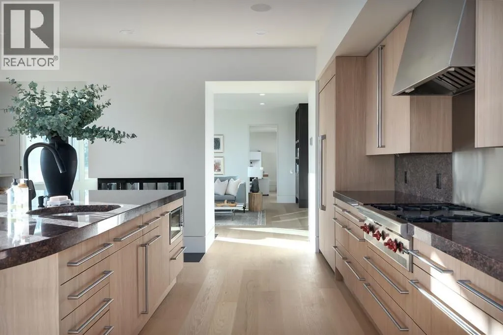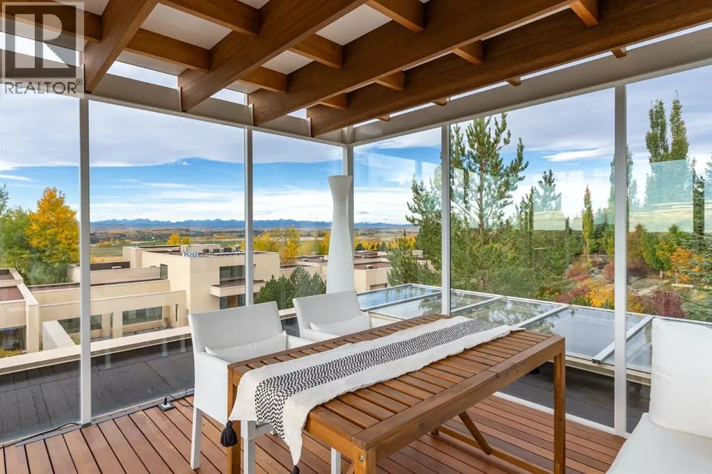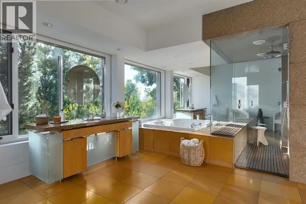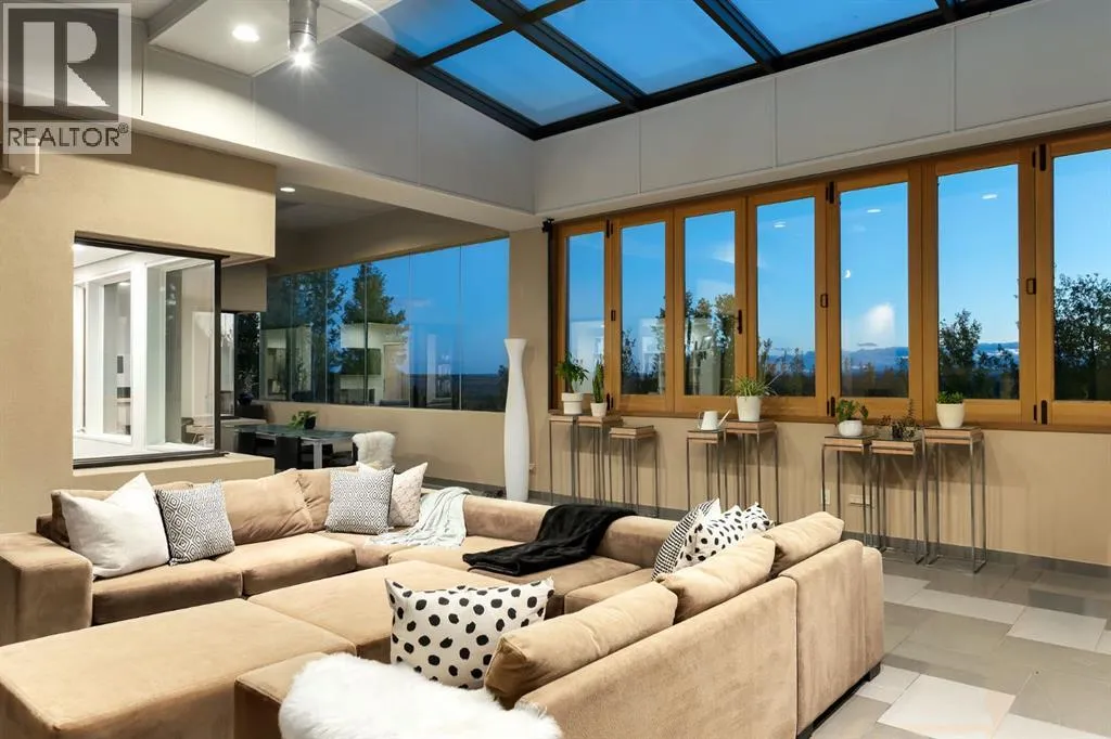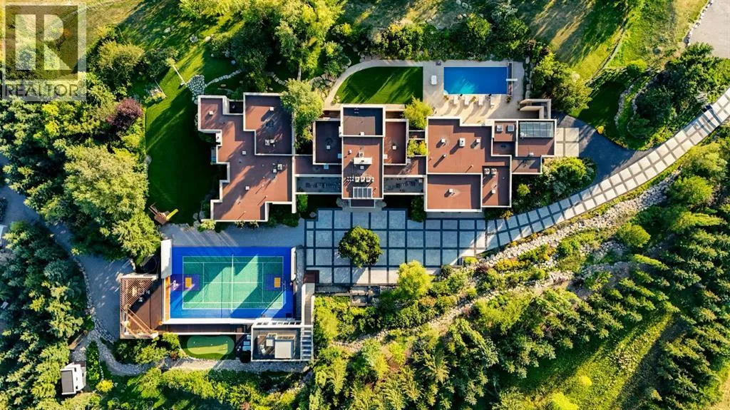 Seize a rare opportunity to own an iconic landmark in the prestigious southwest Springbank area, one of Calgaryâs most coveted locations. Set on an expansive 18.62-acre escarpment, this exceptional property offers stunning mountain views and unparalleled privacy. Designed with new-age minimalism, this 20,000+ sq ft estate is a serene retreat for the discerning buyer. Located just minutes from Stoney Trail West, on the edge of Calgary, this secluded paradise offers the ultimate in luxury living. With 6 bedrooms + 10 bathrooms + 2 large offices, the home features stunning architectural design, including soaring flat & vaulted ceilings, a grand two-story great room illuminated by expansive windows. The contemporary living spaces are complemented by a soothing wood fireplace & ZEN garden inspired hallway views. The spacious dining room, perfect for memorable gatherings, overlooks beautifully landscaped grounds and majestic mountain vistas. Ample vehicle storage includes an oversized 3 car garage, a 2 car garage, and an additional oversized auxiliary 3 car garage (all heated). The gourmet kitchen is a chefâs dream, featuring a Wolf gas range with dual ovens, a built-in refrigerator, a walk-in pantry, an oversized granite island and custom white oak cabinetry. The adjacent family room includes a cozy fireplace, while the sunroom with another fireplace is perfect for family game or movie nights. The bedroom wing, secured by fire doors, houses the luxurious primary suite, a tranquil haven with views of mature trees and a lounge area with a fireplace. The ensuite boasts a deep soaker tub, granite dual-sink vanity, dual toilets, a bidet, and 2 oversized showers, along with a spacious walk-in closet. Four additional bedrooms, each with its own ensuite, are located in the bedroom wing, along with a laundry room and extra storage. Heated floors throughout both the main and lower levels provide year-round comfort. The lower level offers an additional bedroom with a full bathroom, a dedicated hot tub room, a spacious exercise room, an office and a large recreation room. A nearby bar and media room add to the entertainment space, while a walk-up entrance leads to the beautifully landscaped backyard, where a large in-ground pool awaits. Outdoor spaces include southwest-facing decks and a patio, a vast yard, and a middle courtyard with a sports court. An auxiliary building offers potential as a future guest house. The property has undergone millions of dollars in recent landscaping, with paved and natural pathways, waterfall features, and hidden sitting areas. Two security gates, fencing, and surveillance cameras ensure your privacy and security. This magnificent estate offers a private oasis with rolling hills, lush gardens, and elaborate landscaping that rivals anything in Aspen Hillsâyet is only five minutes away from top-tier private schools. Experience the pinnacle of luxury living in Canada. Schedule your private tour today and discover all that your next home has to offer. (id:27476)