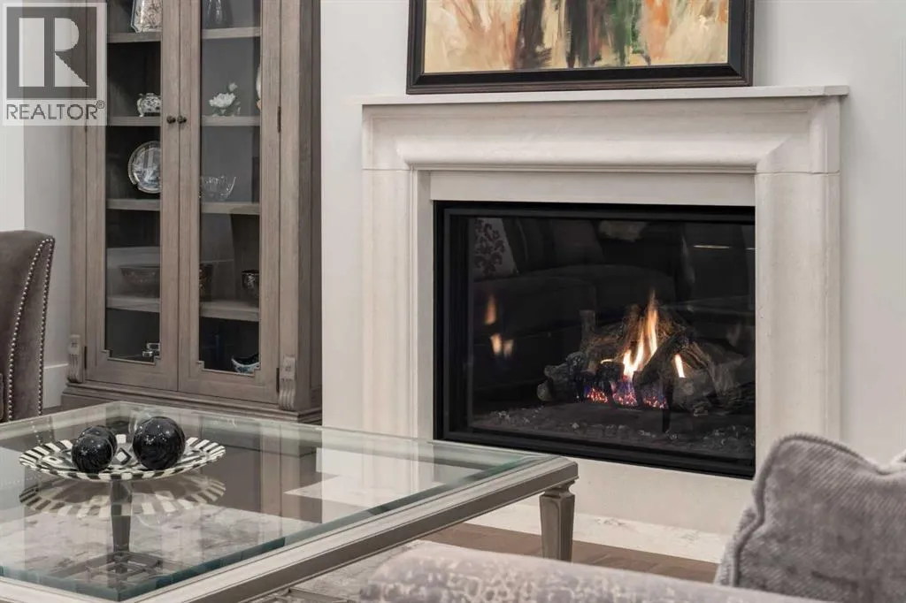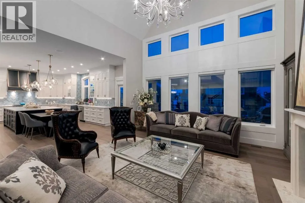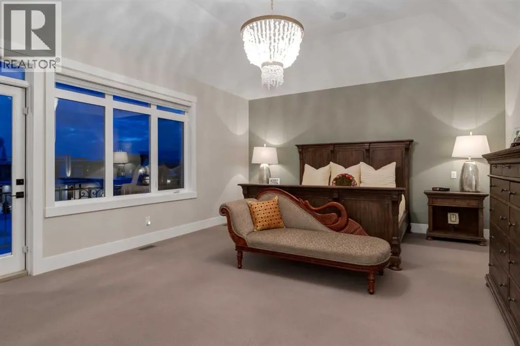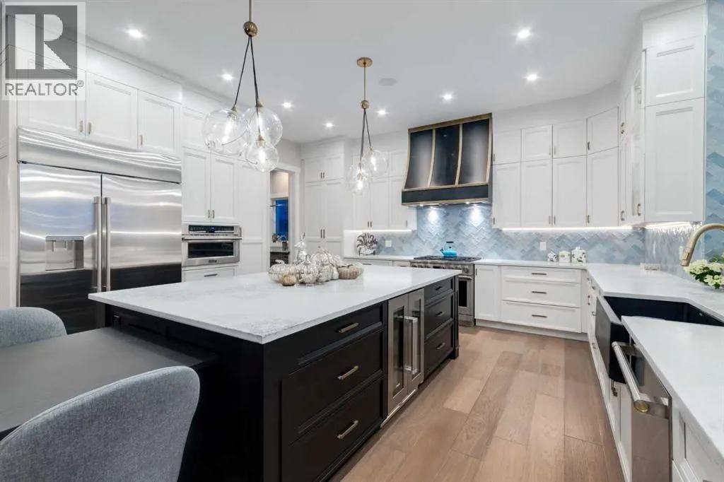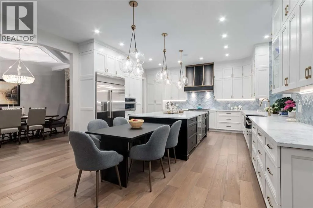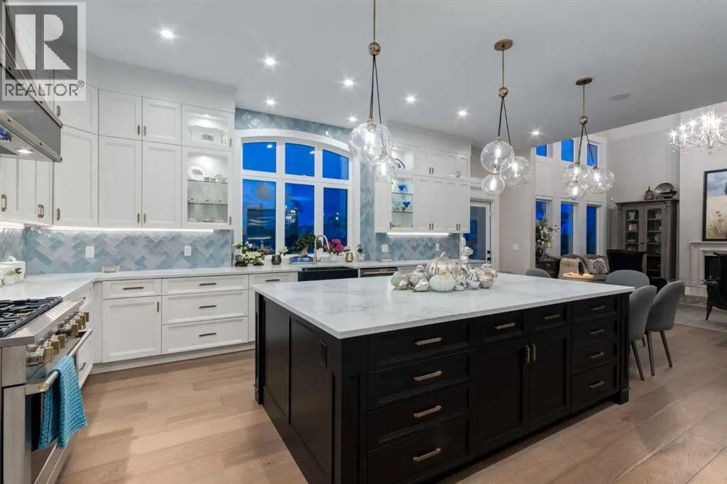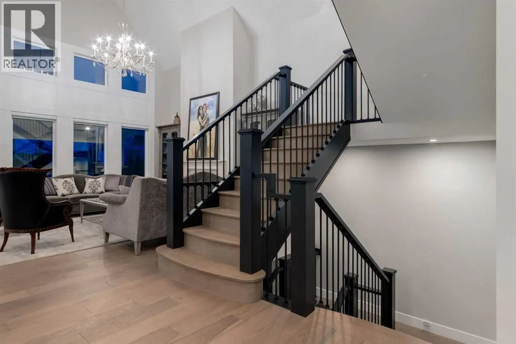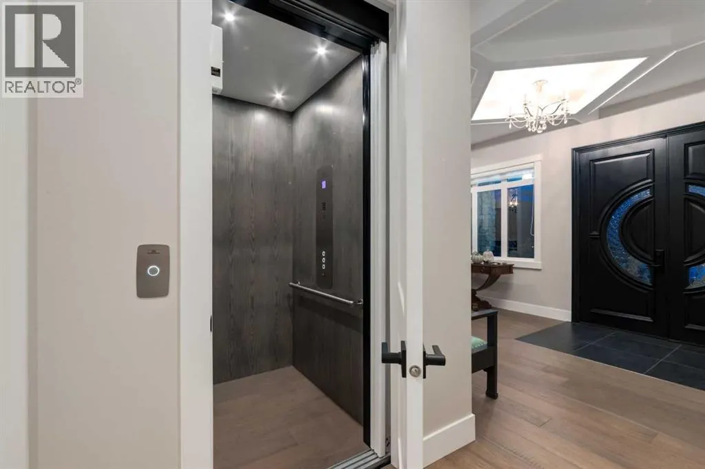 Masterfully executed in a transitional design style, this exquisite Family Home showcases nearly 5,500 sf of impeccable luxury defined by unparalleled craftsmanship and the highest quality of finishes throughout, including an ELEVATOR for easy accessibility to all three floors. The exterior architecture exudes a timeless appeal from the peaked rooflines to the "eyebrow" detailing to the rich stone accents, incredible window designs, a front veranda & upper balcony, and a striking "piece de resistance" front door. The beautifully landscaped front and back gardens impress with perfectly manicured flower beds, and a textural mélange of shrubs and trees. The home's layout is outstanding, while the interior design elements leave a lasting impression on the most discerning "eye for design". The main floor boasts soaring ceiling heights with coffered detailing, impressive, large windows flooding the interior with streams of natural light, custom millwork designs, beautiful, wide-plank hardwood floors, timeless floor and backsplash tile designs, and last but not least, exquisite "Schonbek" chandeliers. The grand, light-filled great room features a magnificent fireplace. It is open to the decadent kitchen and an elegant dining room perfectly suited to hosting dinner parties for family and friends. The front study offers complete privacy and leads to a unique "plant sunroom". The custom-designed kitchen is a chef's dream featuring high-end appliances, ample storage with pullout units, a gigantic center island, timeless quartz countertops, a coveted "Hammersmith" range hood, and last but not least, an impressive chevron pattern backsplash design executed with the utmost precision. Beautifully custom-designed stairs ascend to the upper level complete with three bedrooms and a bonus room, perfectly suited for the children's play area, a TV/games room, or a study room. The master suite is a luxurious retreat complete with wool carpeting, a showpiece chandelier, its own West-facin g balcony and a lavish spa-like ensuite and "dressing room" - a fashionista's dream. Each of the children's bedrooms offers its own chic ensuite bath. The lower level is a true "entertaining haven" featuring a family/TV room that opens onto a private patio area, a wet bar complete with custom furniture-piece units, a wine room, three additional bedrooms, one of which being designated as an exercise room, a full bathroom and a large storage/cold room area. The double and single garage spaces are heated. The single garage is complete with 220 V wiring to allow for an EV charging station. The monthly HOA fees include front yard maintenance, including weekly mowing/trimming; weekly curbside garbage/recycling pickup; snow removal on the streets, sidewalks, pathways & the central plaza; maintenance of the central plaza, cascading ponds, outdoor kitchen, and playgrounds. Please refer to the community website for a wealth of information. MUST BE SEEN! (id:27476)