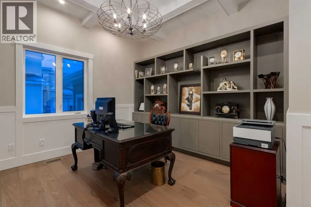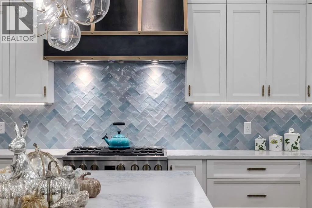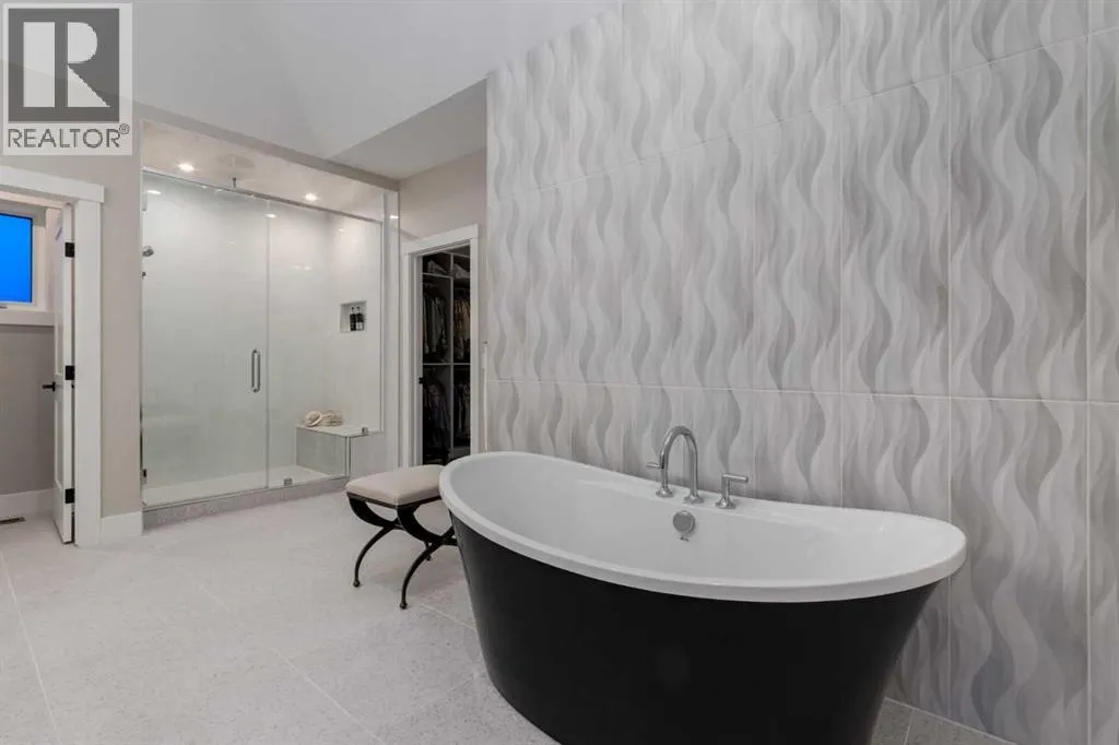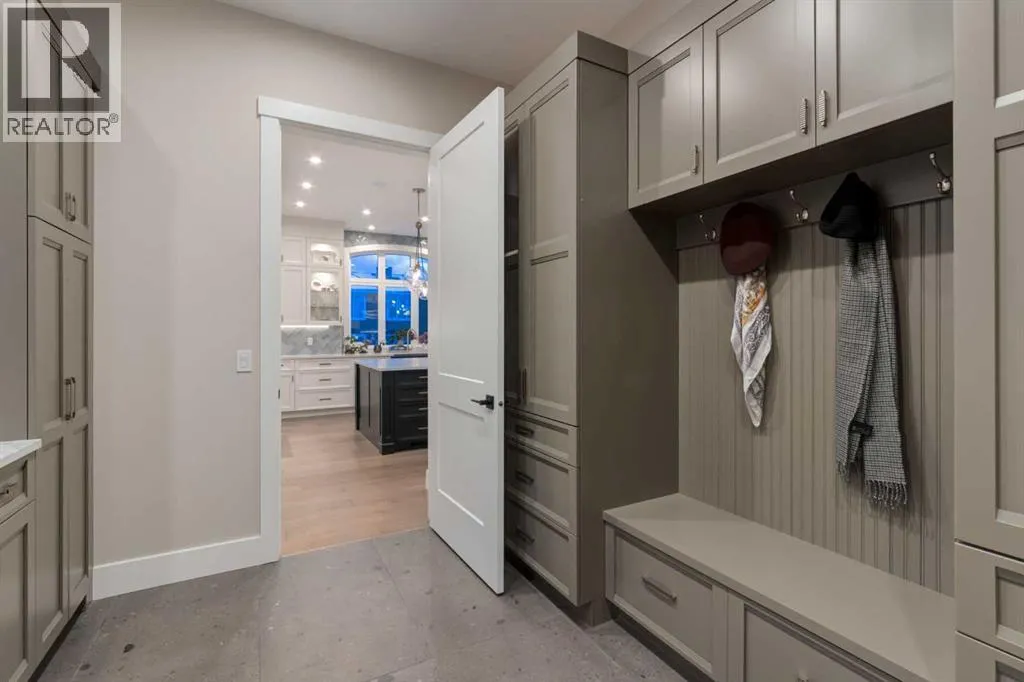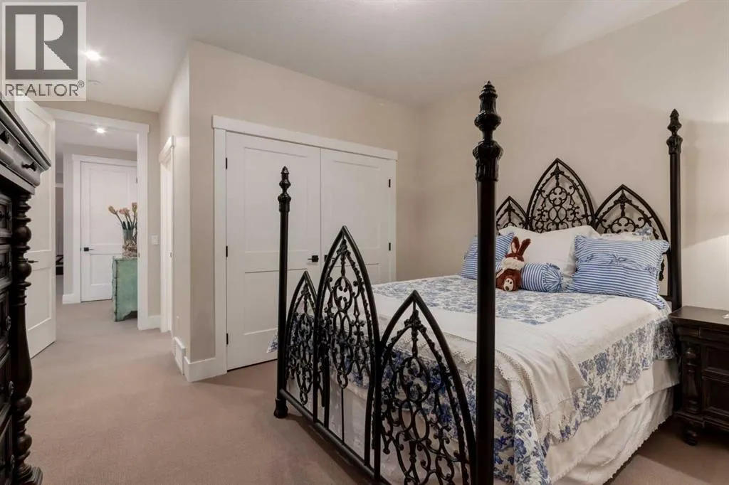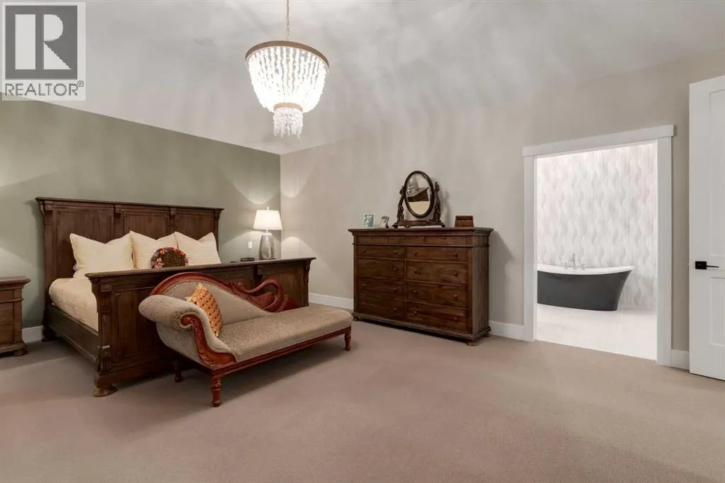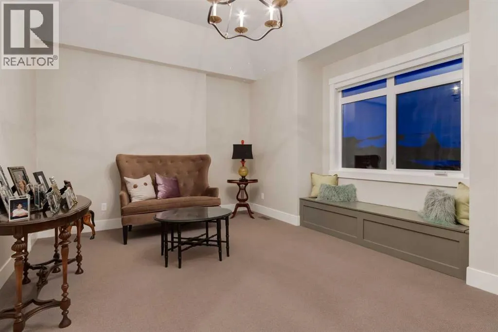 Masterfully executed in a transitional design style, this exquisite Family Home showcases nearly 5,500 sf of impeccable luxury defined by unparalleled craftsmanship and the highest quality of finishes throughout, including an ELEVATOR for easy accessibility to all three floors. The exterior architecture exudes a timeless appeal from the peaked rooflines to the "eyebrow" detailing to the rich stone accents, incredible window designs, a front veranda & upper balcony, and a striking "piece de resistance" front door. The beautifully landscaped front and back gardens impress with perfectly manicured flower beds, and a textural mélange of shrubs and trees. The home's layout is outstanding, while the interior design elements leave a lasting impression on the most discerning "eye for design". The main floor boasts soaring ceiling heights with coffered detailing, impressive, large windows flooding the interior with streams of natural light, custom millwork designs, beautiful, wide-plank hardwood floors, timeless floor and backsplash tile designs, and last but not least, exquisite "Schonbek" chandeliers. The grand, light-filled great room features a magnificent fireplace. It is open to the decadent kitchen and an elegant dining room perfectly suited to hosting dinner parties for family and friends. The front study offers complete privacy and leads to a unique "plant sunroom". The custom-designed kitchen is a chef's dream featuring high-end appliances, ample storage with pullout units, a gigantic center island, timeless quartz countertops, a coveted "Hammersmith" range hood, and last but not least, an impressive chevron pattern backsplash design executed with the utmost precision. Beautifully custom-designed stairs ascend to the upper level complete with three bedrooms and a bonus room, perfectly suited for the children's play area, a TV/games room, or a study room. The master suite is a luxurious retreat complete with wool carpeting, a showpiece chandelier, its own West-facin g balcony and a lavish spa-like ensuite and "dressing room" - a fashionista's dream. Each of the children's bedrooms offers its own chic ensuite bath. The lower level is a true "entertaining haven" featuring a family/TV room that opens onto a private patio area, a wet bar complete with custom furniture-piece units, a wine room, three additional bedrooms, one of which being designated as an exercise room, a full bathroom and a large storage/cold room area. The double and single garage spaces are heated. The single garage is complete with 220 V wiring to allow for an EV charging station. The monthly HOA fees include front yard maintenance, including weekly mowing/trimming; weekly curbside garbage/recycling pickup; snow removal on the streets, sidewalks, pathways & the central plaza; maintenance of the central plaza, cascading ponds, outdoor kitchen, and playgrounds. Please refer to the community website for a wealth of information. MUST BE SEEN! (id:27476)