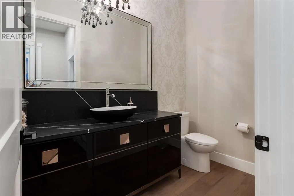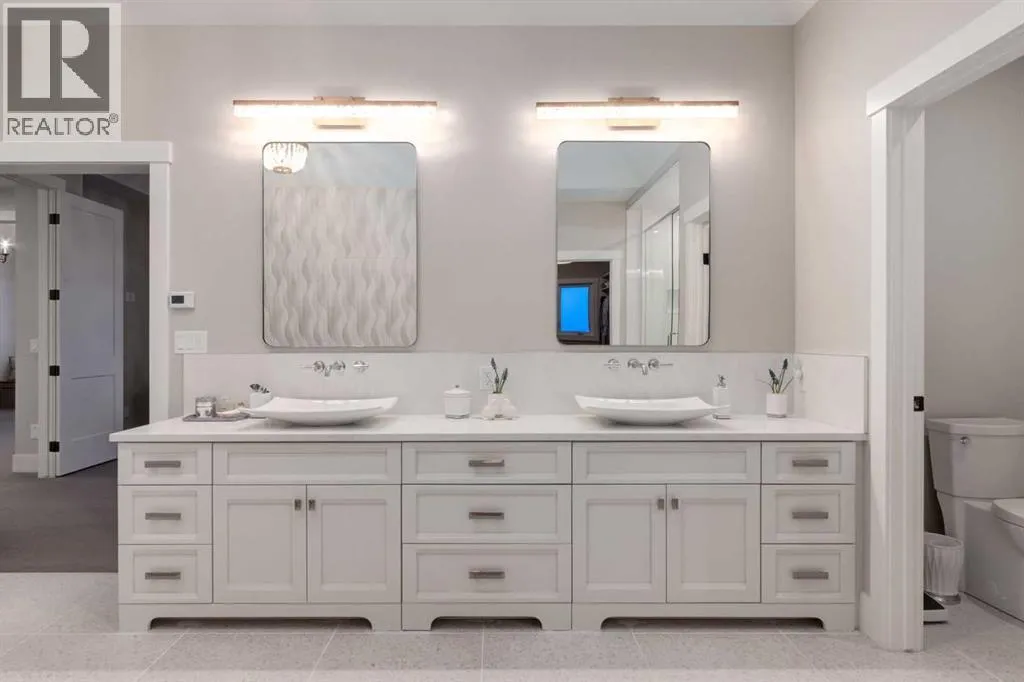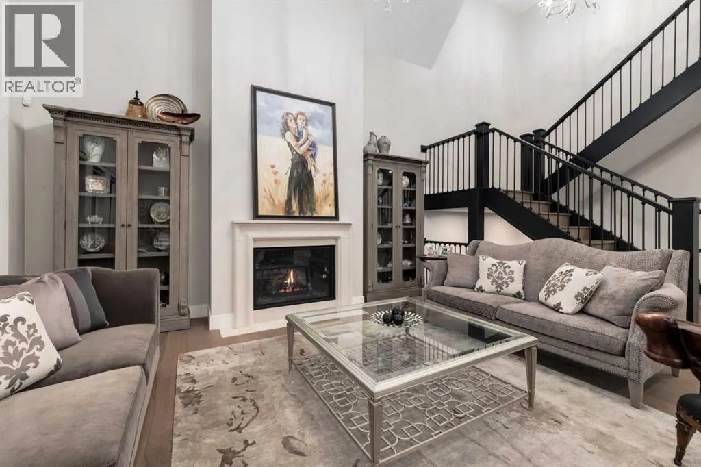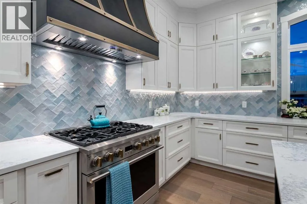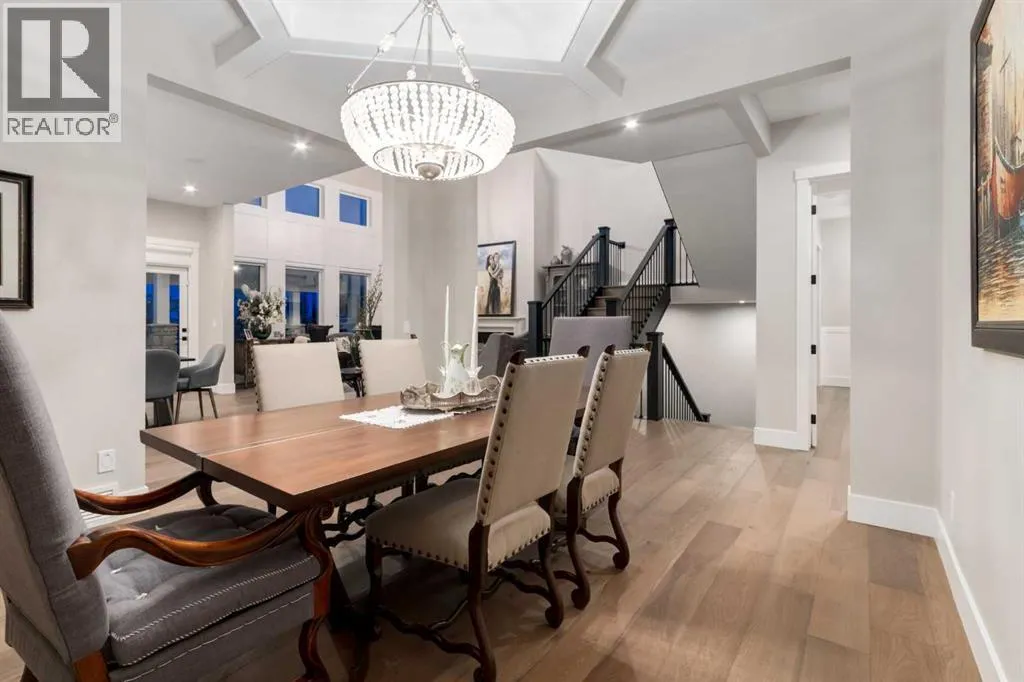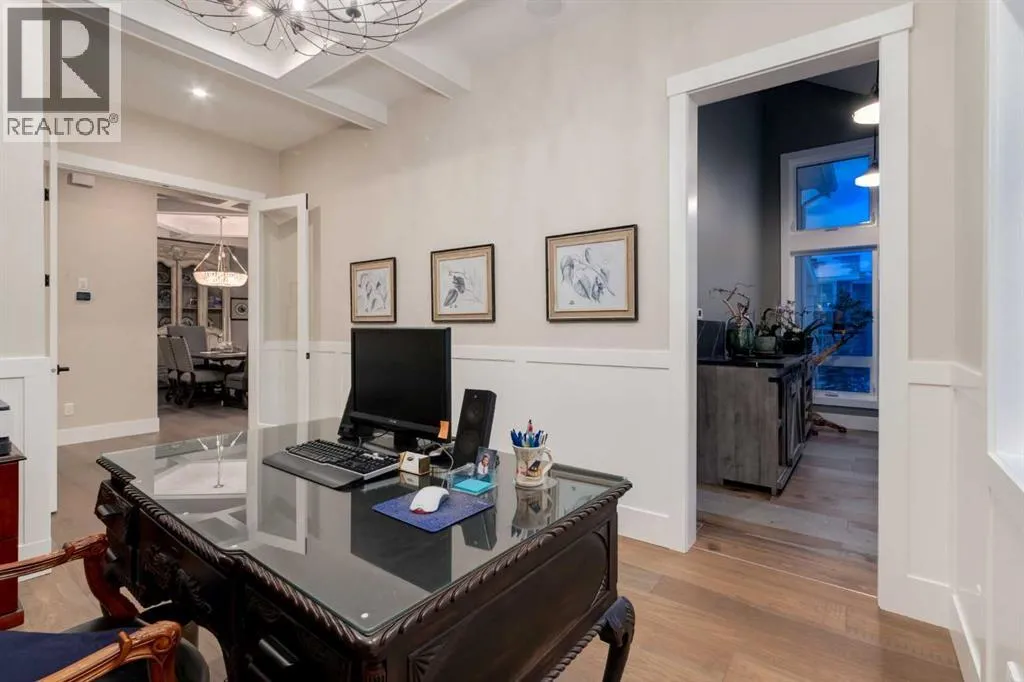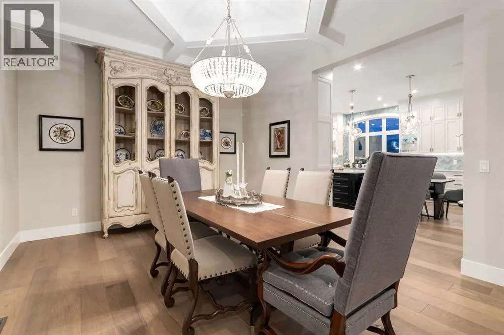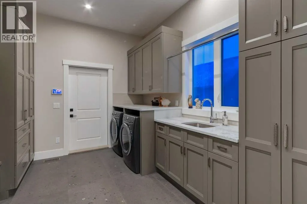 Masterfully executed in a transitional design style, this exquisite Family Home showcases nearly 5,500 sf of impeccable luxury defined by unparalleled craftsmanship and the highest quality of finishes throughout, including an ELEVATOR for easy accessibility to all three floors. The exterior architecture exudes a timeless appeal from the peaked rooflines to the "eyebrow" detailing to the rich stone accents, incredible window designs, a front veranda & upper balcony, and a striking "piece de resistance" front door. The beautifully landscaped front and back gardens impress with perfectly manicured flower beds, and a textural mélange of shrubs and trees. The home's layout is outstanding, while the interior design elements leave a lasting impression on the most discerning "eye for design". The main floor boasts soaring ceiling heights with coffered detailing, impressive, large windows flooding the interior with streams of natural light, custom millwork designs, beautiful, wide-plank hardwood floors, timeless floor and backsplash tile designs, and last but not least, exquisite "Schonbek" chandeliers. The grand, light-filled great room features a magnificent fireplace. It is open to the decadent kitchen and an elegant dining room perfectly suited to hosting dinner parties for family and friends. The front study offers complete privacy and leads to a unique "plant sunroom". The custom-designed kitchen is a chef's dream featuring high-end appliances, ample storage with pullout units, a gigantic center island, timeless quartz countertops, a coveted "Hammersmith" range hood, and last but not least, an impressive chevron pattern backsplash design executed with the utmost precision. Beautifully custom-designed stairs ascend to the upper level complete with three bedrooms and a bonus room, perfectly suited for the children's play area, a TV/games room, or a study room. The master suite is a luxurious retreat complete with wool carpeting, a showpiece chandelier, its own West-facin g balcony and a lavish spa-like ensuite and "dressing room" - a fashionista's dream. Each of the children's bedrooms offers its own chic ensuite bath. The lower level is a true "entertaining haven" featuring a family/TV room that opens onto a private patio area, a wet bar complete with custom furniture-piece units, a wine room, three additional bedrooms, one of which being designated as an exercise room, a full bathroom and a large storage/cold room area. The double and single garage spaces are heated. The single garage is complete with 220 V wiring to allow for an EV charging station. The monthly HOA fees include front yard maintenance, including weekly mowing/trimming; weekly curbside garbage/recycling pickup; snow removal on the streets, sidewalks, pathways & the central plaza; maintenance of the central plaza, cascading ponds, outdoor kitchen, and playgrounds. Please refer to the community website for a wealth of information. MUST BE SEEN! (id:27476)