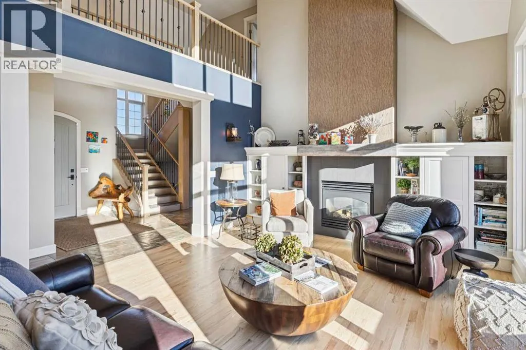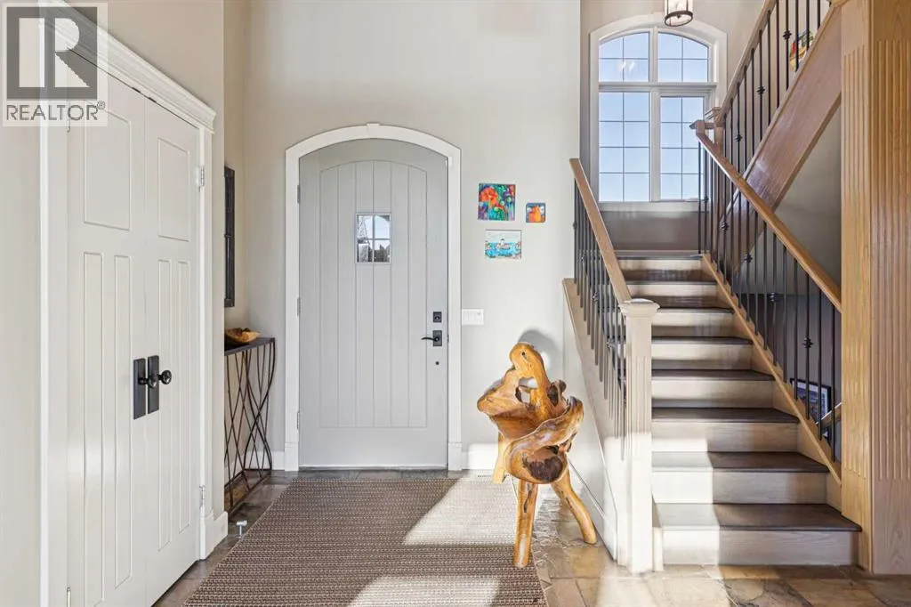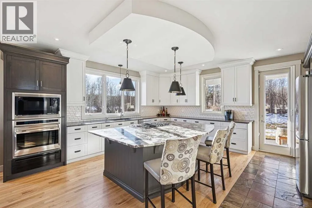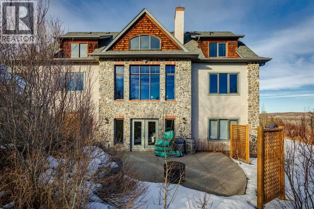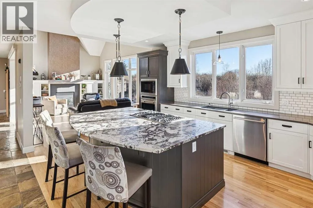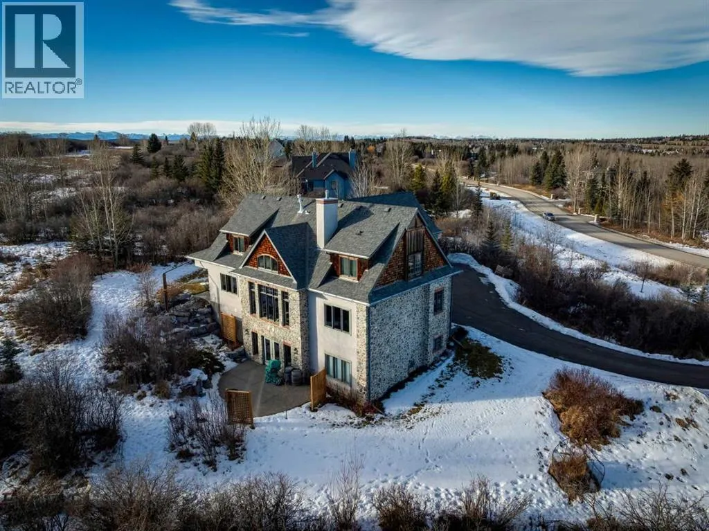 The French countryside awaits you in this spectacular 2,900 square foot one and one-half storey bungalow on a two-acre lot in the three-time award-winning âCanada Community of the Yearâ, Elbow Valley. Nestled in the Elbow River Valley, just west of Calgary, this prestigious community offers genuine estate living alongside unrivalled amenities. This beautifully upgraded and renovated home offers a dramatic open staircase, two storey foyer and great room ceilings, refinished quality hardwood floors throughout the main floor, staircases, and upper level. The professionally renovated kitchen was expanded and features shaker-style cabinets with soft- close doors, quality Wolf and JennAir stainless steel appliances, a feature center island with a special one-piece curved leather-finished granite cooktop. The formal dining room, warm and inviting with its coffered ceilings and hardwood floors, is perfect for entertaining. The main floor primary bedroom features a walk-through closet with custom built-ins and a luxurious ensuite bathroom that has heated porcelain tile floors, 10-mil glass shower, quartz vanity countertops, and double sinks. Overlooking the great room below, the upstairs boasts two large bedrooms, each with a full ensuite bath, walk-in closets, and incredible views. Professional walkout basement development is perfect for the mature family with a billiards/games room, a family room with a built-in entertainment center, a custom bar, a second fireplace, a full bath, two more bedrooms with new flooring, and multiple storage spaces to utilize by design. No-maintenance landscaping designed to blend into the natural surroundings features an exposed aggregate patio, a dry creek bed, a continuous curb, a natural Rundlestone exterior, and total privacy. Oversized triple attached heated garage with a developed 300 sq. ft. bonus room, perfect for a man cave, home office, or storage. Walk-up staircase to the garage, slab heating in the basement, upgraded mechanical, a nd 200-amp service. A blend of smooth-finished and knocked down stipple ceilings, renovated baths, upgraded lighting, solid core doors, nine-foot ceilings, laundry on the main and upper levels, clad windows in good condition, with three new triple pane windows added. From its sweeping views and prime location to its thoughtful design and upgrades, this beautiful Elbow Valley home is an absolute must-see! (id:27476)