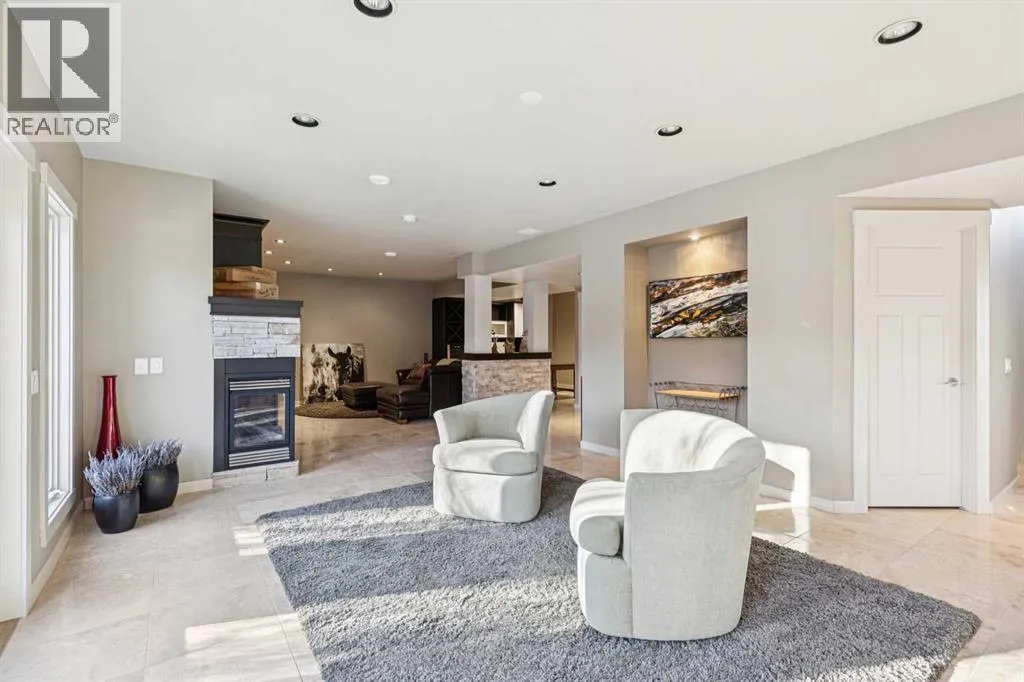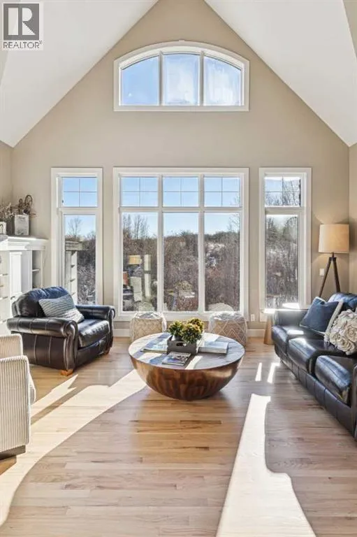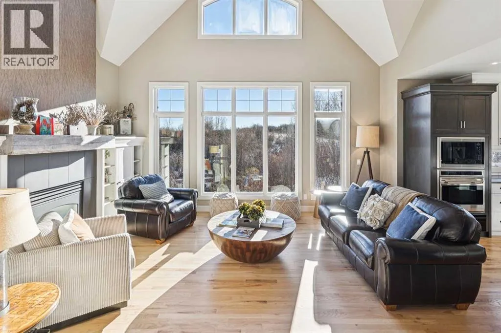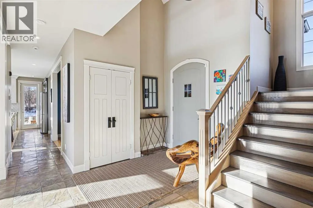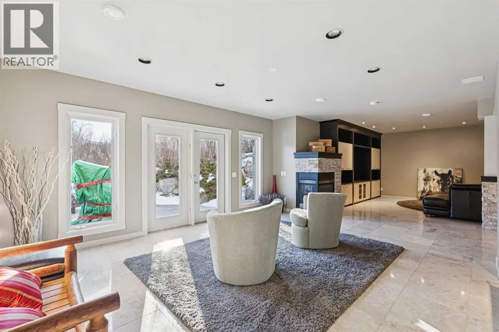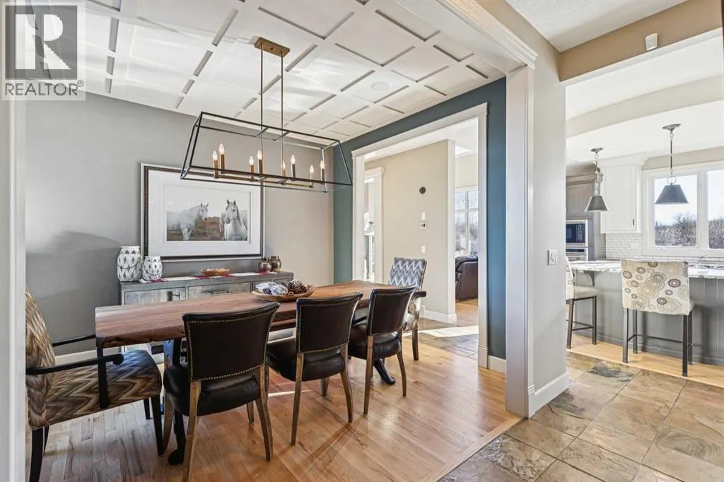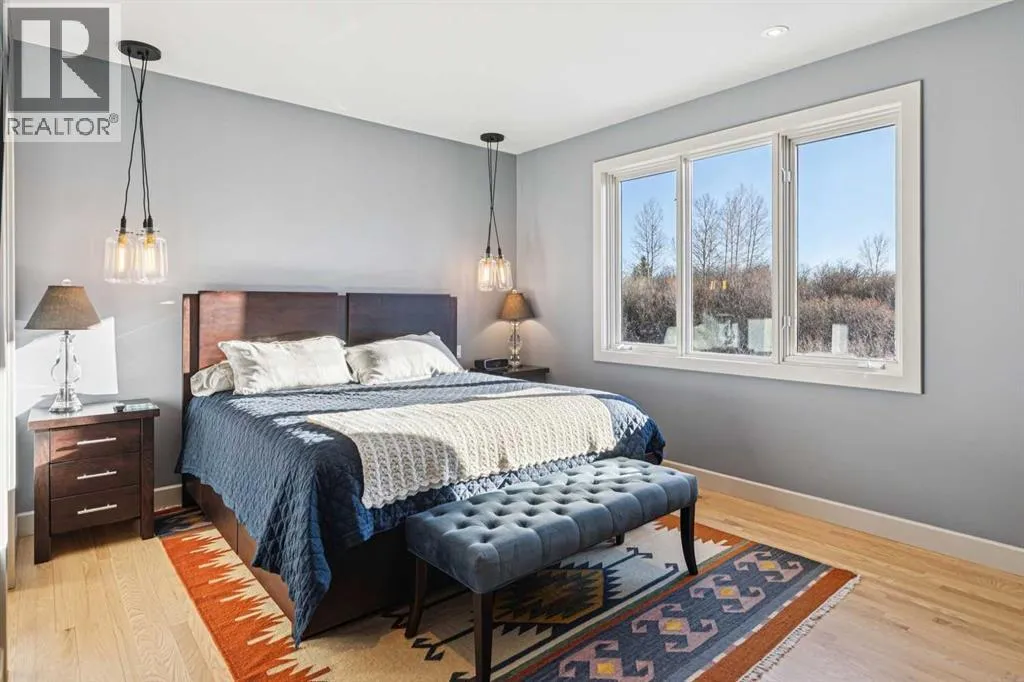 The French countryside awaits you in this spectacular 2,900 square foot one and one-half storey bungalow on a two-acre lot in the three-time award-winning âCanada Community of the Yearâ, Elbow Valley. Nestled in the Elbow River Valley, just west of Calgary, this prestigious community offers genuine estate living alongside unrivalled amenities. This beautifully upgraded and renovated home offers a dramatic open staircase, two storey foyer and great room ceilings, refinished quality hardwood floors throughout the main floor, staircases, and upper level. The professionally renovated kitchen was expanded and features shaker-style cabinets with soft- close doors, quality Wolf and JennAir stainless steel appliances, a feature center island with a special one-piece curved leather-finished granite cooktop. The formal dining room, warm and inviting with its coffered ceilings and hardwood floors, is perfect for entertaining. The main floor primary bedroom features a walk-through closet with custom built-ins and a luxurious ensuite bathroom that has heated porcelain tile floors, 10-mil glass shower, quartz vanity countertops, and double sinks. Overlooking the great room below, the upstairs boasts two large bedrooms, each with a full ensuite bath, walk-in closets, and incredible views. Professional walkout basement development is perfect for the mature family with a billiards/games room, a family room with a built-in entertainment center, a custom bar, a second fireplace, a full bath, two more bedrooms with new flooring, and multiple storage spaces to utilize by design. No-maintenance landscaping designed to blend into the natural surroundings features an exposed aggregate patio, a dry creek bed, a continuous curb, a natural Rundlestone exterior, and total privacy. Oversized triple attached heated garage with a developed 300 sq. ft. bonus room, perfect for a man cave, home office, or storage. Walk-up staircase to the garage, slab heating in the basement, upgraded mechanical, a nd 200-amp service. A blend of smooth-finished and knocked down stipple ceilings, renovated baths, upgraded lighting, solid core doors, nine-foot ceilings, laundry on the main and upper levels, clad windows in good condition, with three new triple pane windows added. From its sweeping views and prime location to its thoughtful design and upgrades, this beautiful Elbow Valley home is an absolute must-see! (id:27476)