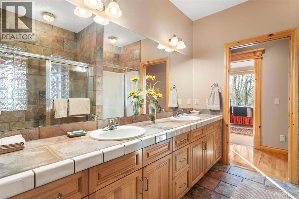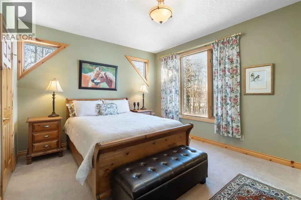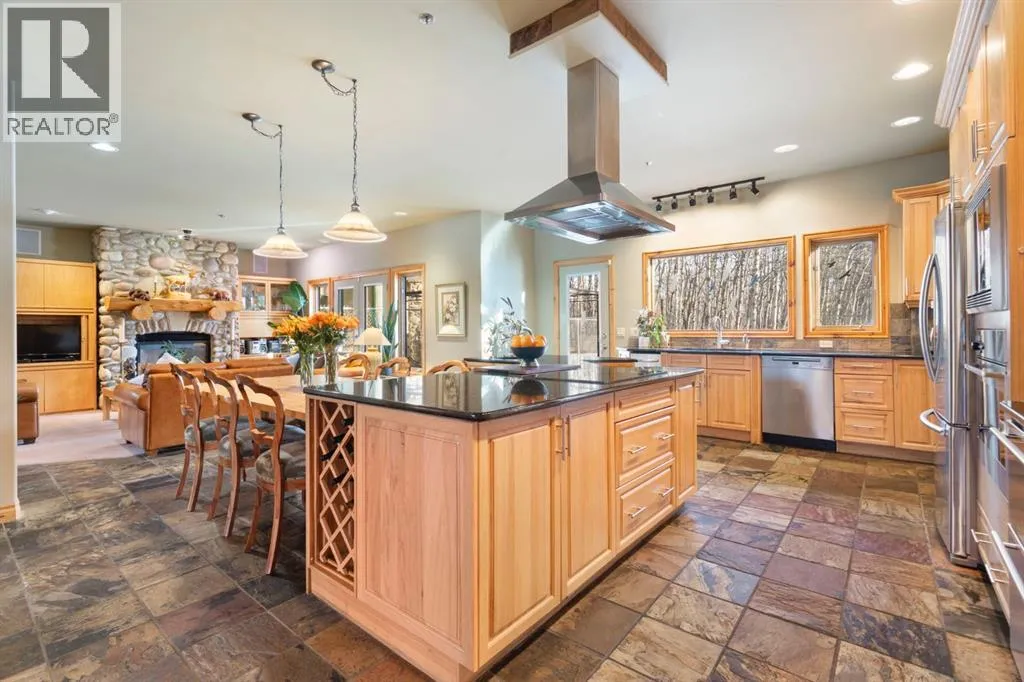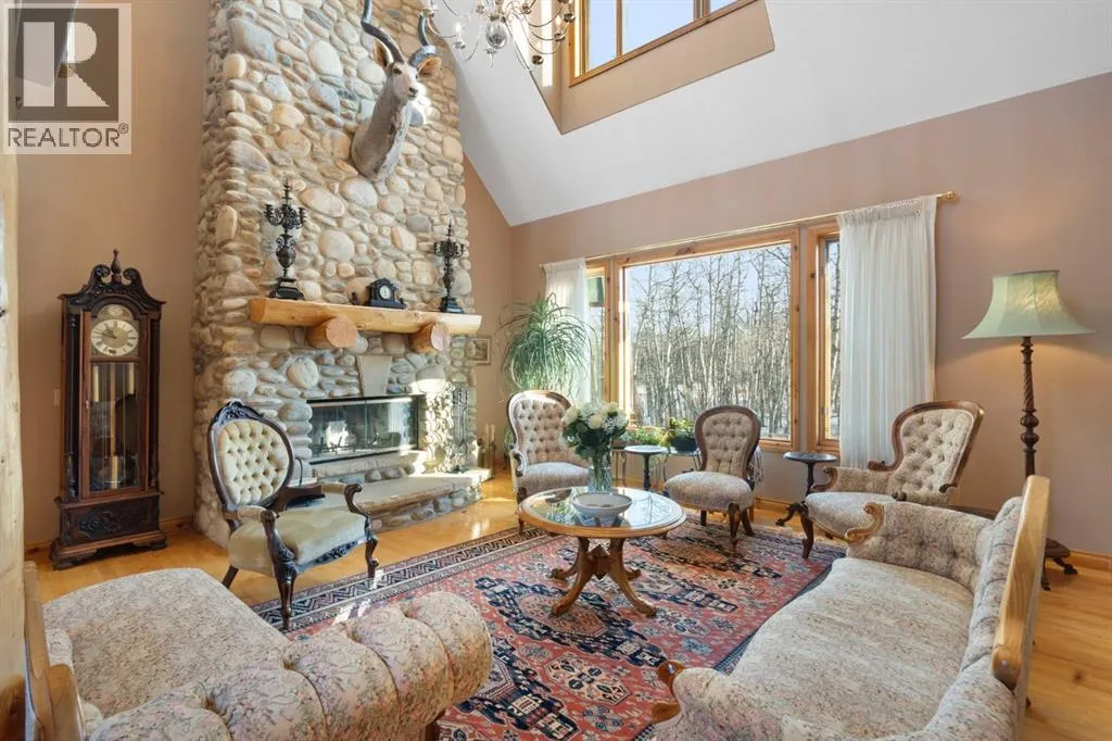 ** Watch the full CINEMATIC property tour*** Masterfully crafted by McKinley Masters, this stunning alpine residence is a celebration of rustic elegance and unparalleled craftsmanship. Nestled among towering pines on a sprawling lawn, the home exudes timeless lodge-inspired charm while offering every modern comfort. 10 min drive to all amenities in NW Calgary, and easy access to Hwy 1. The foyer adorned with hand-selected knotty pine sets the tone for the alpine detailing that flows seamlessly throughout the entire home. The living room, covered in natural light, features heated floors and a striking grand stone fireplaceâa perfect gathering place for family and friends. The custom kitchen is a masterpiece of design, with a central island, hickory cabinetry, stainless steel appliances, and sweeping views of the backyard. Adjacent, for seamless entertaining and high functionality for family meals is the formal dining room, framed by exposed pine beams. This floor also has 1 oversized bedroom with 4-piece ensuite bathroom with a private entrance for ultimate flexibility. Designed for multi-generational living, the second floor offers a fully independent illegal suite with its own kitchen with eating area, laundry room 5- piece bathroom ensuite and private backyard access. All 3 additional bedrooms on this level feature vaulted ceilings, rich alpine accents, 1 with a 4-piece ensuite bathroom and another 6-piece bathroom that services the other 2 bedrooms creating a serene retreat atmosphere for all. The great room impresses with soaring ceilings, a 2nd wood burning masonry fireplace, and sun-drenched south-facing windowsâan ideal space to entertain or unwind.The third-floor primary wing is a sanctuary of alpine luxury: vaulted ceilings, oversized windows, personal seating area, spacious kitchenette, private balcony overlooking lush greenery, dual walk -in closets and your own spa; five-piece bath with jetted tub, cedar lined sauna, with water access, dual vanities , separate glass door shower with frosted windows. Every detailâfrom hickory cabinetry and built-in shelving to expansive outdoor spaces and cedar garden plotsâreflects thoughtful design and artisanal quality. The exterior elevation boasts 40 foot pine timber columns, a paved patio space, fenced in dog run, knotted pine railings, firepit, shed and landscaped cedar gardens. This estate is more than a homeâitâs a celebration of alpine architecture, craftsmanship, and multi-generational living, offering a private, luxurious retreat in one of Woodlands Estatesâ most coveted settings. (id:27476)