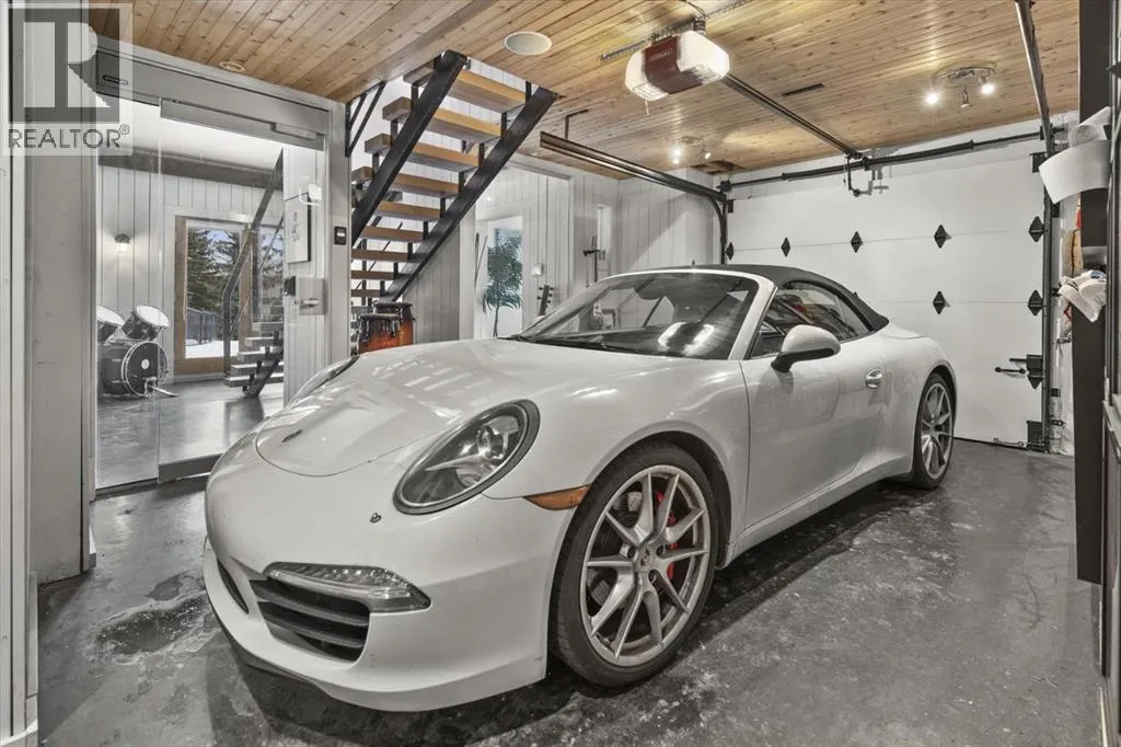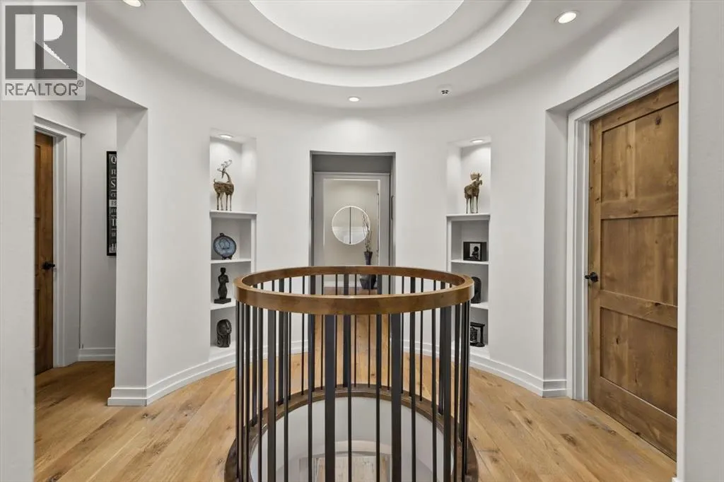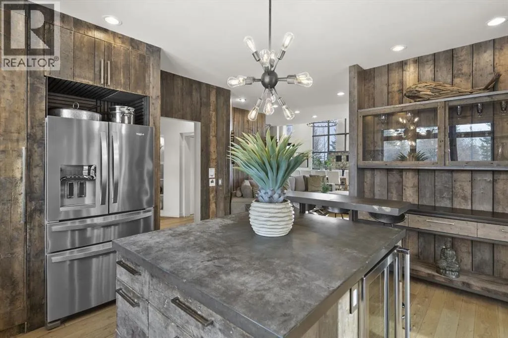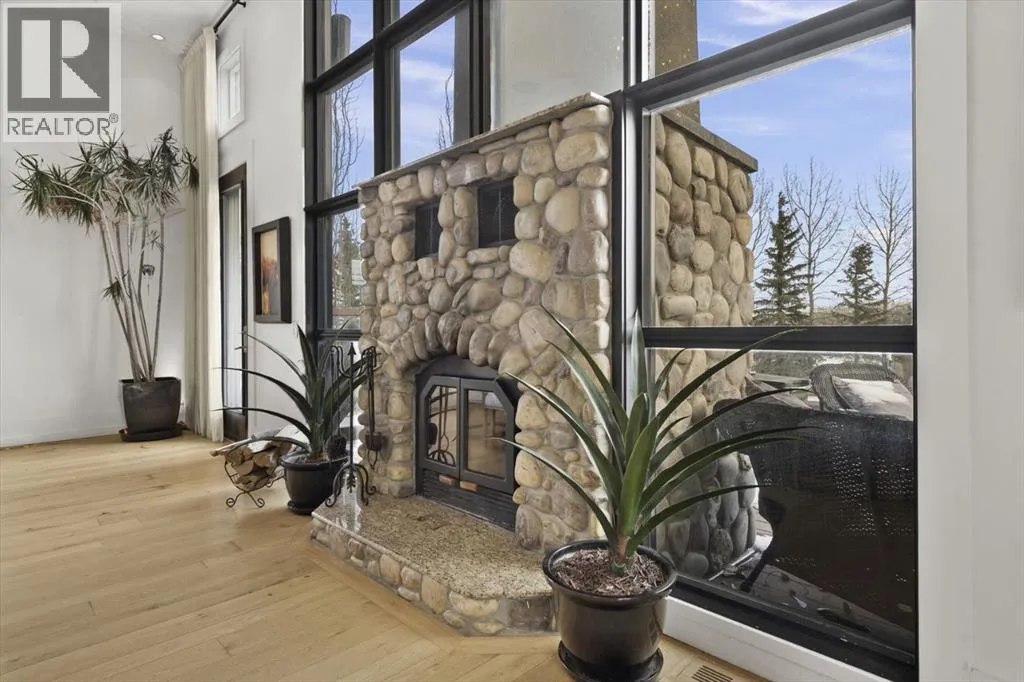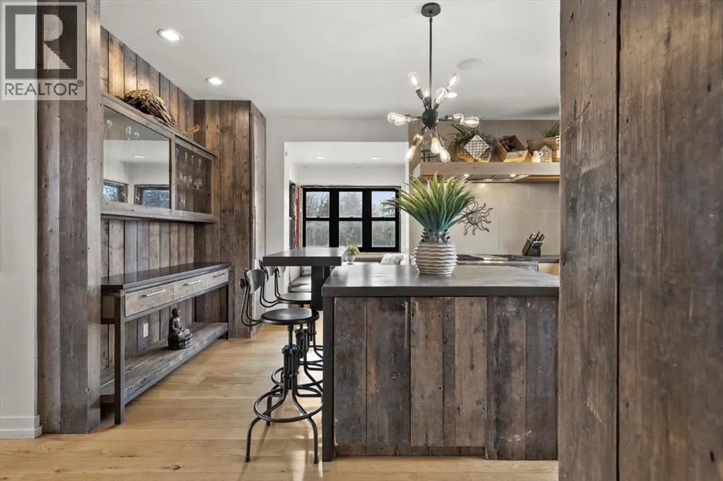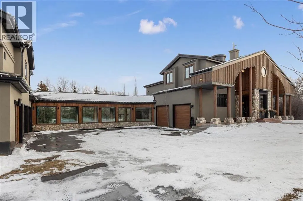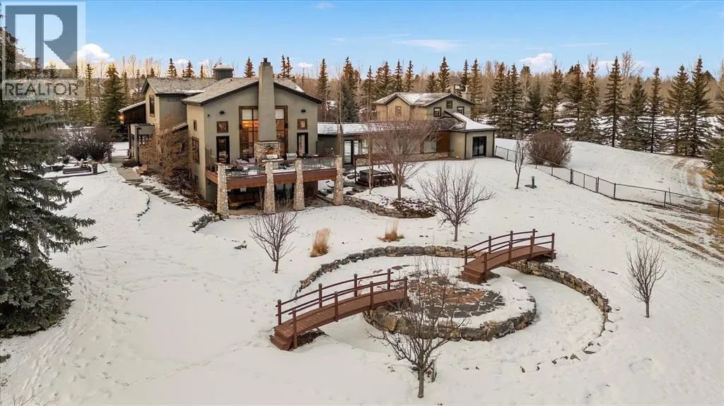 Some homes are designed for function, others for style - this one was designed for something more. Set on just over two acres in Bearspaw, this residence reveals its character the moment you arrive: sweeping curves in the architecture, river rock columns, and a presence that promises there's a story around every corner.Step inside and a circular skylight draws your eye upward, casting light through a graceful rotunda that anchors the home. Those architectural curves continue throughout - in hallways, railings, and built-in niches designed for art and treasured pieces.The main level presents two interconnected living spaces with remarkable flexibility. The larger room, currently configured as an expansive dining area easily seating 14, features soaring ceilings, a river rock fireplace, and walls of windows. The adjacent sitting area offers a more intimate scale. These spaces can easily trade purposes - a generous living room with traditional dining to the side, or kept as designed for those who entertain on a grand scale.Throughout the home, reclaimed barn-board sourced from England creates warmth against contemporary elements - concrete countertops, sleek fixtures, clean architectural lines. It's a considered contrast that feels both grounded and refined. The kitchen embodies this aesthetic, aged wood cabinetry meeting industrial concrete surfaces, a breakfast nook tucked into the window.The primary suite offers a spa-inspired ensuite with pebble stone walls, open shower, and deep soaker tub. Two additional bedrooms, family bathroom and laundry facilities share the upper level, accessed from curved hallways with a striking circular opening overlooking the rotunda.The walkout level opens to casual gathering space, a fourth bedroom, bathroom, exercise area and a very unique dual wine cellar and cigar humidor. A glass breezeway connects the main house to a secondary garage with self-contained guest suite above - Murphy beds and lounge space equally suited a s creative studio or home office. For the collector: a separate garage bay accessed by fingerprint recognition, purpose-built for a prized vehicle.Outside, the property unfolds with equal intention. In-ground pool, hot tub, and firepit create spaces for every season. Circling a stone platform at the heart of the grounds, a moat crossed by two wooden bridges - a meditative feature that speaks to the thoughtfulness woven throughout.For the right person, this won't simply be a beautiful property. It will feel like home. (id:27476)