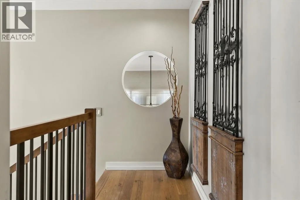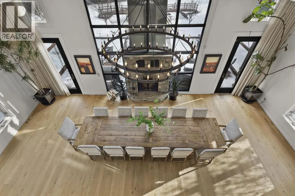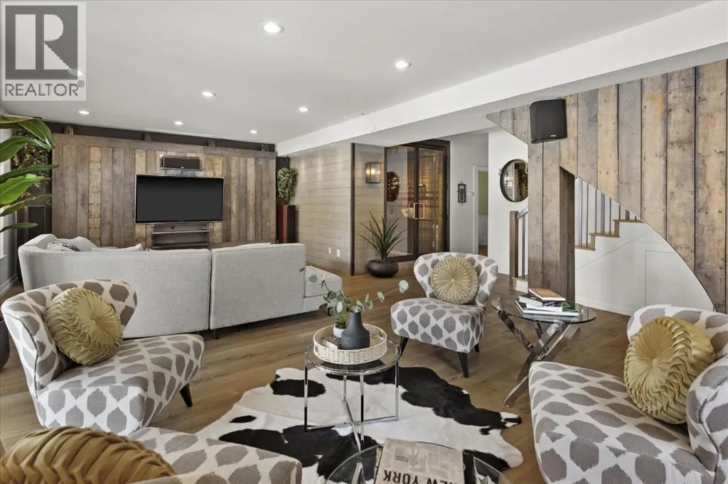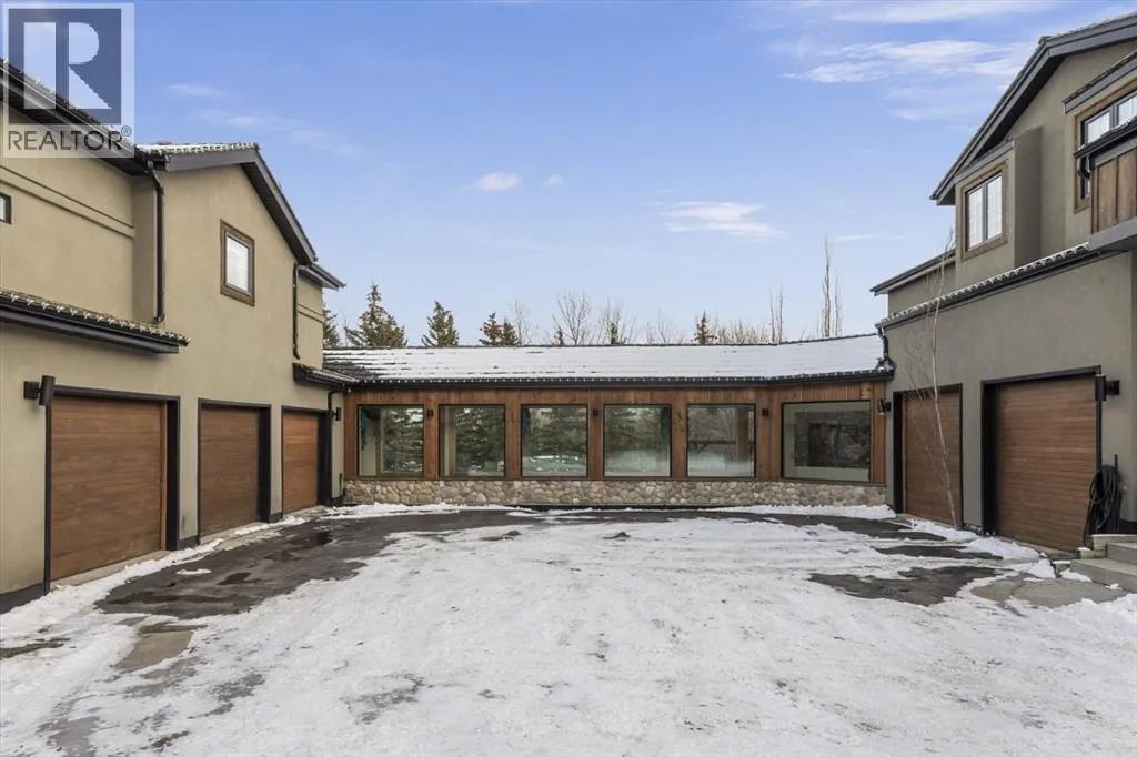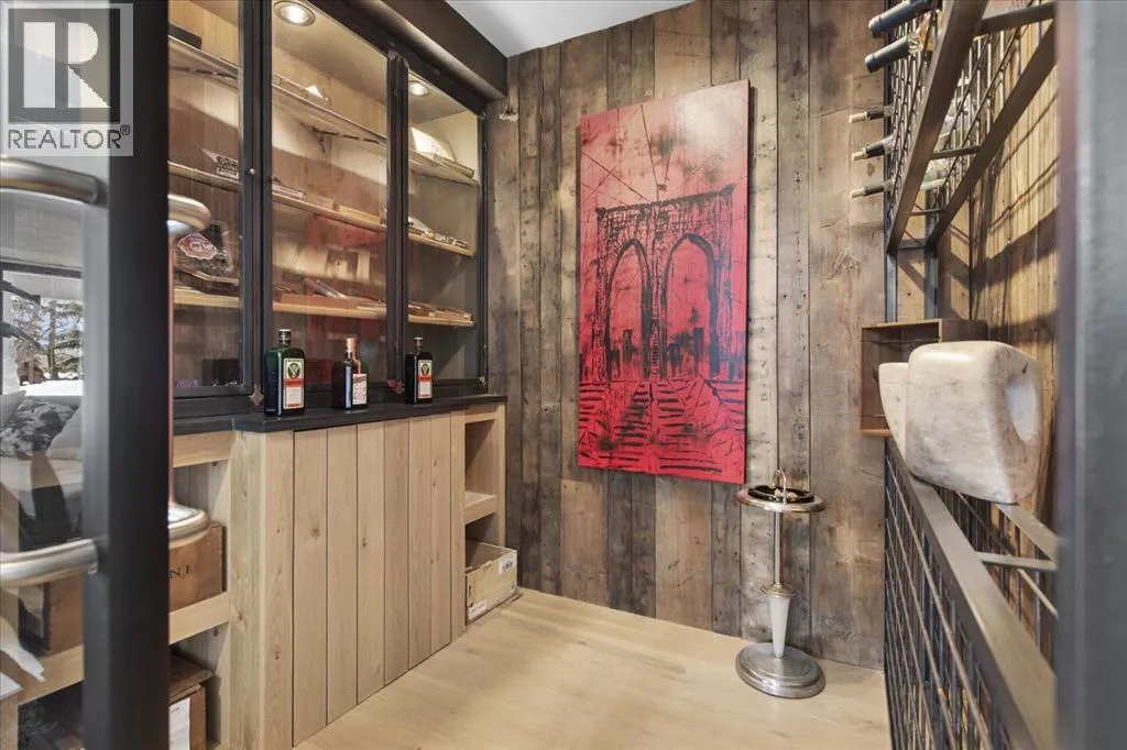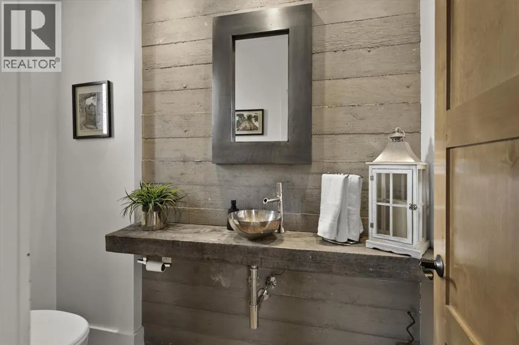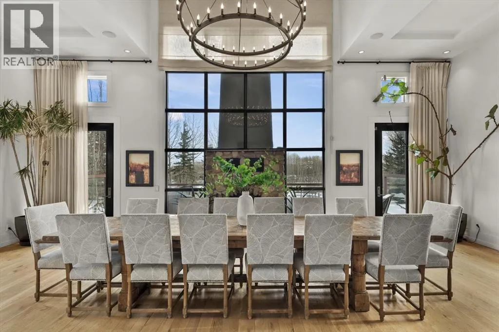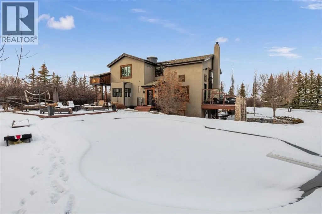 Some homes are designed for function, others for style - this one was designed for something more. Set on just over two acres in Bearspaw, this residence reveals its character the moment you arrive: sweeping curves in the architecture, river rock columns, and a presence that promises there's a story around every corner.Step inside and a circular skylight draws your eye upward, casting light through a graceful rotunda that anchors the home. Those architectural curves continue throughout - in hallways, railings, and built-in niches designed for art and treasured pieces.The main level presents two interconnected living spaces with remarkable flexibility. The larger room, currently configured as an expansive dining area easily seating 14, features soaring ceilings, a river rock fireplace, and walls of windows. The adjacent sitting area offers a more intimate scale. These spaces can easily trade purposes - a generous living room with traditional dining to the side, or kept as designed for those who entertain on a grand scale.Throughout the home, reclaimed barn-board sourced from England creates warmth against contemporary elements - concrete countertops, sleek fixtures, clean architectural lines. It's a considered contrast that feels both grounded and refined. The kitchen embodies this aesthetic, aged wood cabinetry meeting industrial concrete surfaces, a breakfast nook tucked into the window.The primary suite offers a spa-inspired ensuite with pebble stone walls, open shower, and deep soaker tub. Two additional bedrooms, family bathroom and laundry facilities share the upper level, accessed from curved hallways with a striking circular opening overlooking the rotunda.The walkout level opens to casual gathering space, a fourth bedroom, bathroom, exercise area and a very unique dual wine cellar and cigar humidor. A glass breezeway connects the main house to a secondary garage with self-contained guest suite above - Murphy beds and lounge space equally suited a s creative studio or home office. For the collector: a separate garage bay accessed by fingerprint recognition, purpose-built for a prized vehicle.Outside, the property unfolds with equal intention. In-ground pool, hot tub, and firepit create spaces for every season. Circling a stone platform at the heart of the grounds, a moat crossed by two wooden bridges - a meditative feature that speaks to the thoughtfulness woven throughout.For the right person, this won't simply be a beautiful property. It will feel like home. (id:27476)