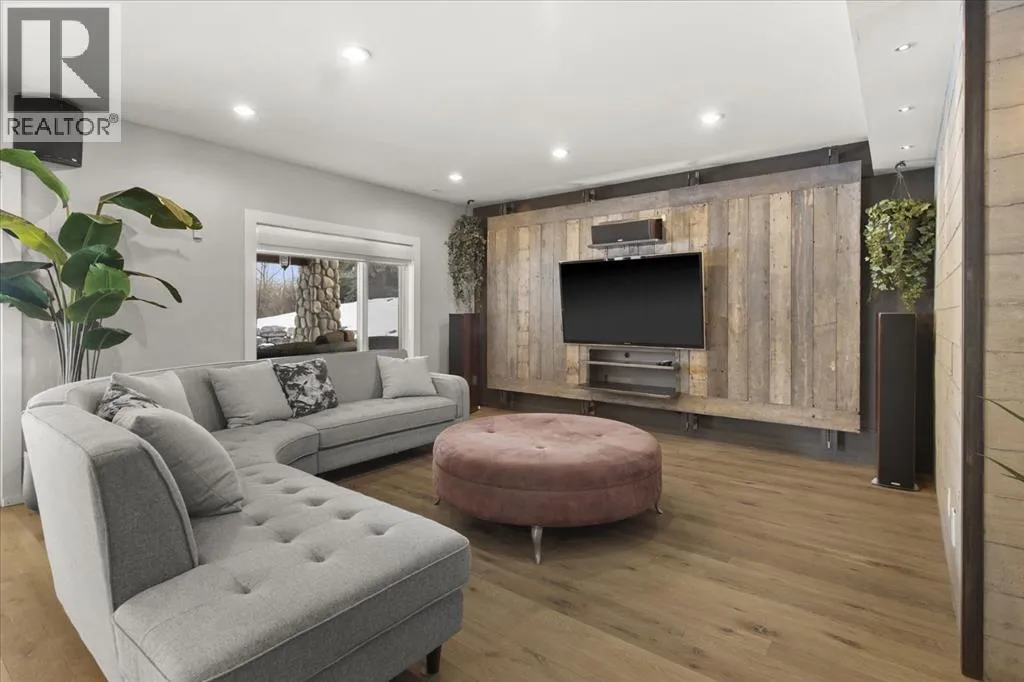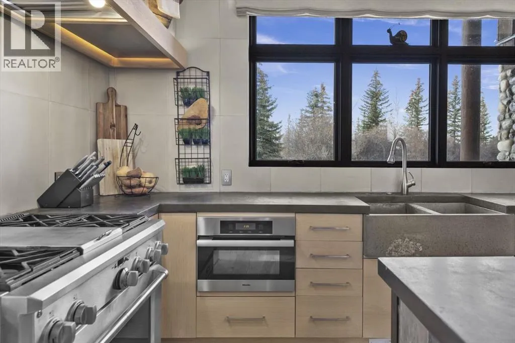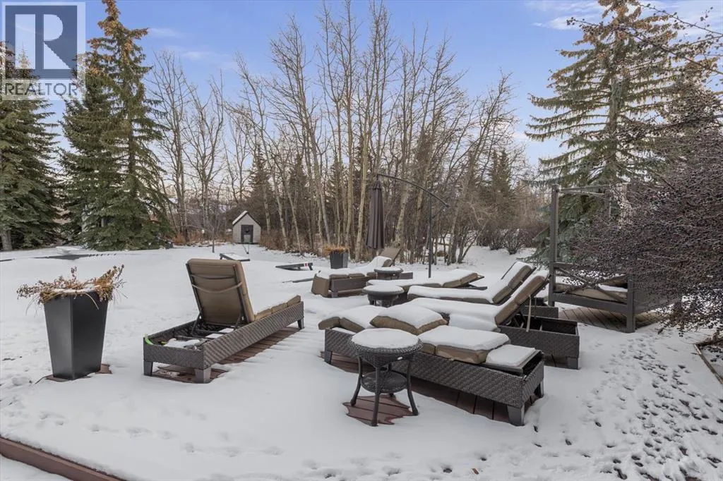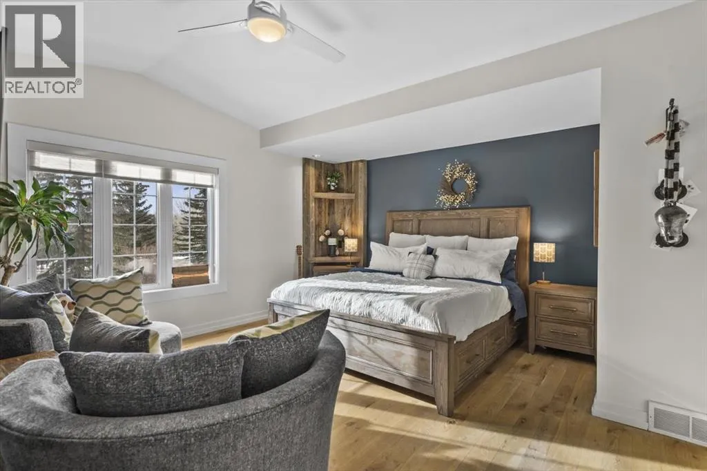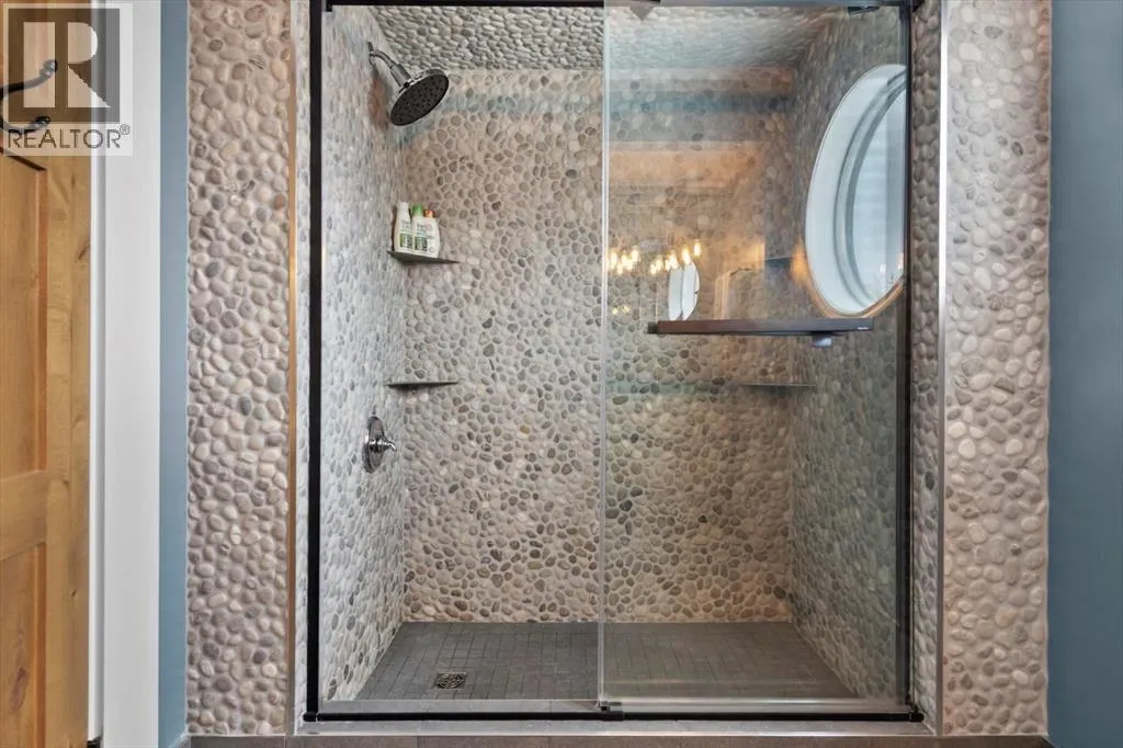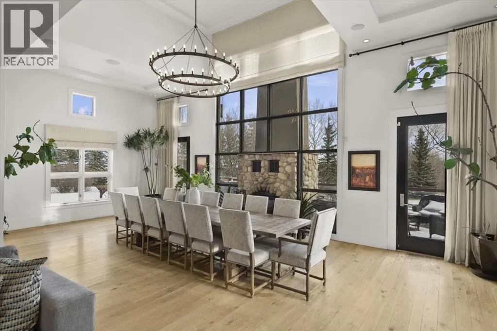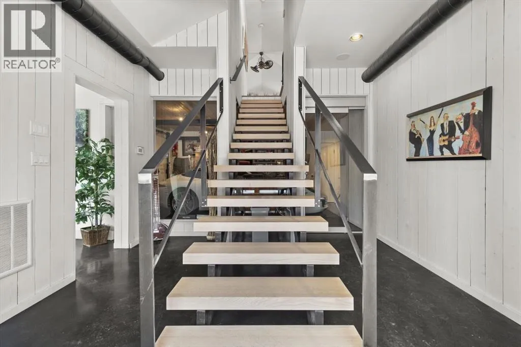 Some homes are designed for function, others for style - this one was designed for something more. Set on just over two acres in Bearspaw, this residence reveals its character the moment you arrive: sweeping curves in the architecture, river rock columns, and a presence that promises there's a story around every corner.Step inside and a circular skylight draws your eye upward, casting light through a graceful rotunda that anchors the home. Those architectural curves continue throughout - in hallways, railings, and built-in niches designed for art and treasured pieces.The main level presents two interconnected living spaces with remarkable flexibility. The larger room, currently configured as an expansive dining area easily seating 14, features soaring ceilings, a river rock fireplace, and walls of windows. The adjacent sitting area offers a more intimate scale. These spaces can easily trade purposes - a generous living room with traditional dining to the side, or kept as designed for those who entertain on a grand scale.Throughout the home, reclaimed barn-board sourced from England creates warmth against contemporary elements - concrete countertops, sleek fixtures, clean architectural lines. It's a considered contrast that feels both grounded and refined. The kitchen embodies this aesthetic, aged wood cabinetry meeting industrial concrete surfaces, a breakfast nook tucked into the window.The primary suite offers a spa-inspired ensuite with pebble stone walls, open shower, and deep soaker tub. Two additional bedrooms, family bathroom and laundry facilities share the upper level, accessed from curved hallways with a striking circular opening overlooking the rotunda.The walkout level opens to casual gathering space, a fourth bedroom, bathroom, exercise area and a very unique dual wine cellar and cigar humidor. A glass breezeway connects the main house to a secondary garage with self-contained guest suite above - Murphy beds and lounge space equally suited a s creative studio or home office. For the collector: a separate garage bay accessed by fingerprint recognition, purpose-built for a prized vehicle.Outside, the property unfolds with equal intention. In-ground pool, hot tub, and firepit create spaces for every season. Circling a stone platform at the heart of the grounds, a moat crossed by two wooden bridges - a meditative feature that speaks to the thoughtfulness woven throughout.For the right person, this won't simply be a beautiful property. It will feel like home. (id:27476)