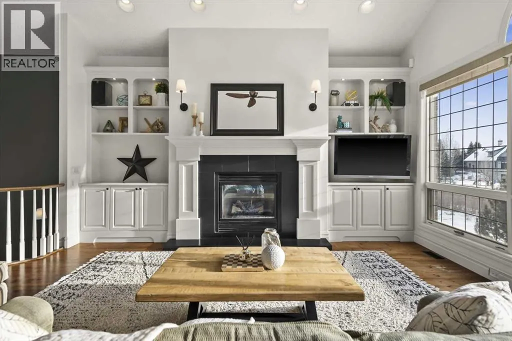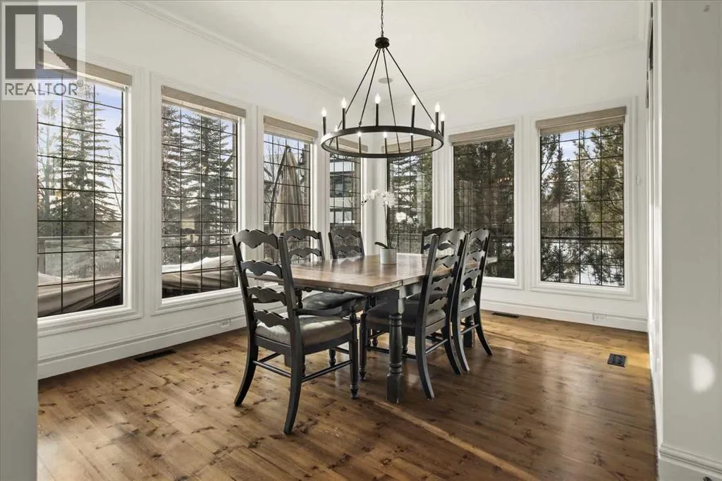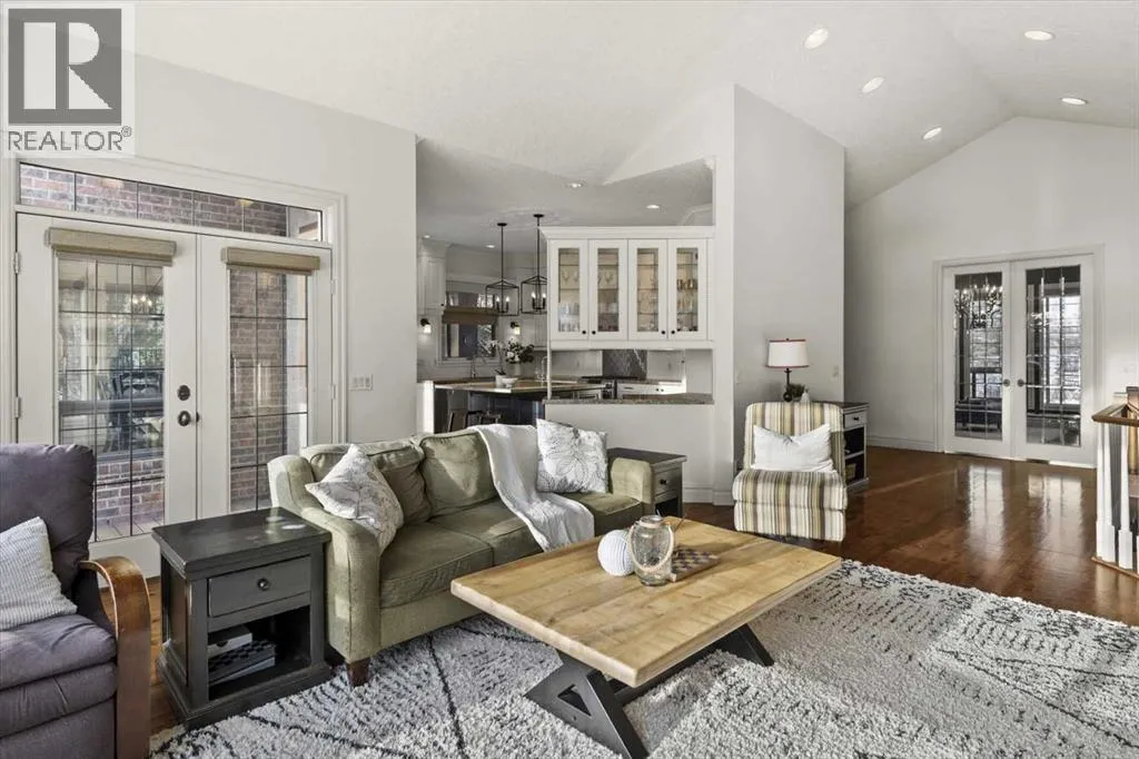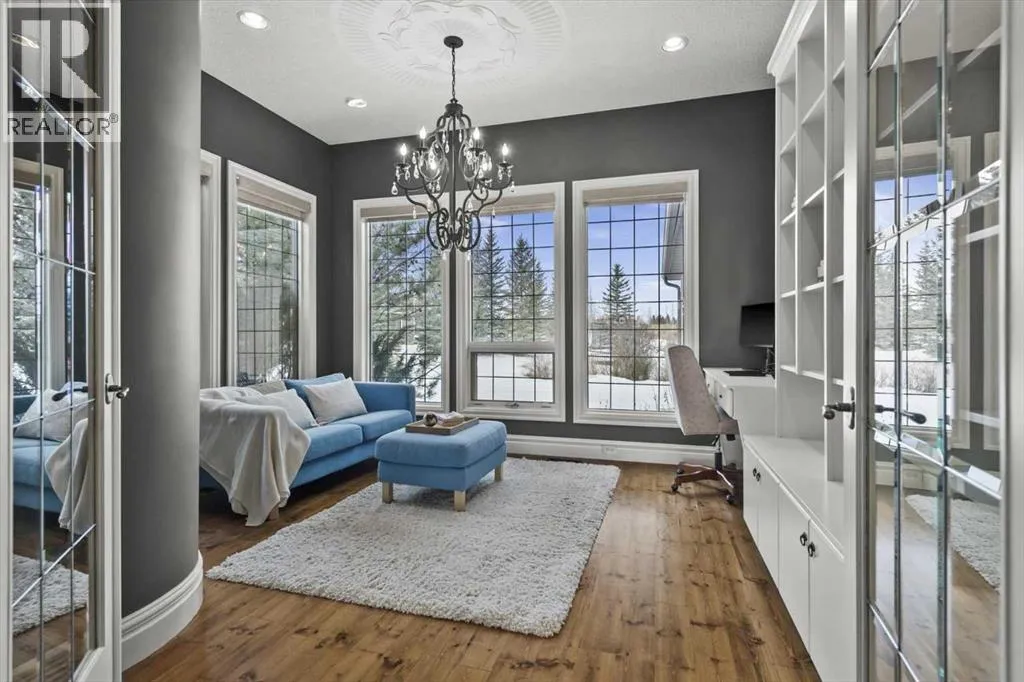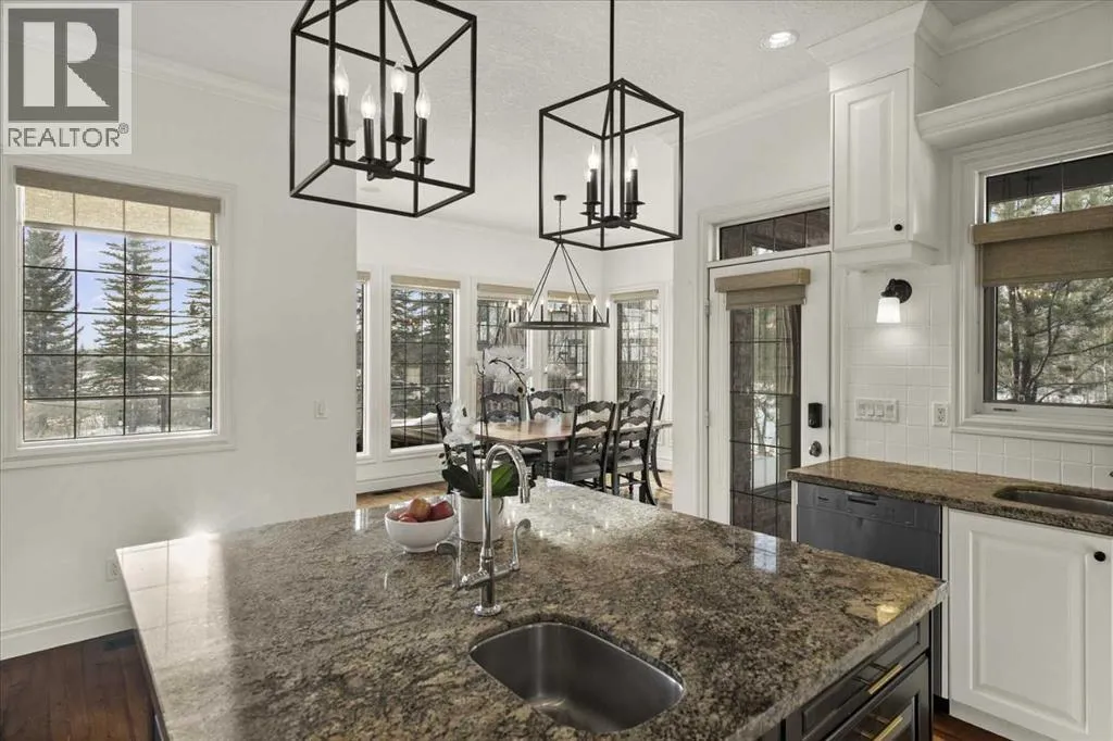 * OPEN HOUSE SATURDAY FEB 7, 1-3 PM* Stunning walk-out bungalow perfectly positioned on a rare, private one-acre lot backing onto a tranquil pond in prestigious Elbow Valley. This warm and open home is flooded with natural light, with expansive windows that seamlessly bring the outdoors in. The interior has been refreshed with new paint throughout most of the home, updated light fixtures, and renovated lower-level bathrooms. The gourmet kitchen features ceiling-height cabinetry, stainless steel appliances, a central island, and walk-in pantry, flowing into a spacious dining area with access to the west-facing wraparound deck with sleek glass railing, ideal for enjoying the serene views. The great room impresses with vaulted ceilings, a focal gas fireplace custom built-ins and gorgeous views. An expansive office with wall of built-ins is perfect for days when you are working from home. The primary retreat offers a 5-piece ensuite, walk-in closet, and private balcony. Premium main floor finishes include 10-foot ceilings, 8â solid core doors, and hardwood flooring. The fully developed walk-out level features 9-foot ceilings, radiant in-floor heating, three bedrooms, two full bathrooms, bar, fireplace and expansive recreation space. Oversized triple garage provides ample space for vehicles, storage, or toys. Elbow Valley is a master planned bareland condo community with resident access to lakes, peddle boats, beach, clubhouse, tennis/pickleball courts, basketball courts, and walking paths. A truly special property in an outstanding community! (id:27476)