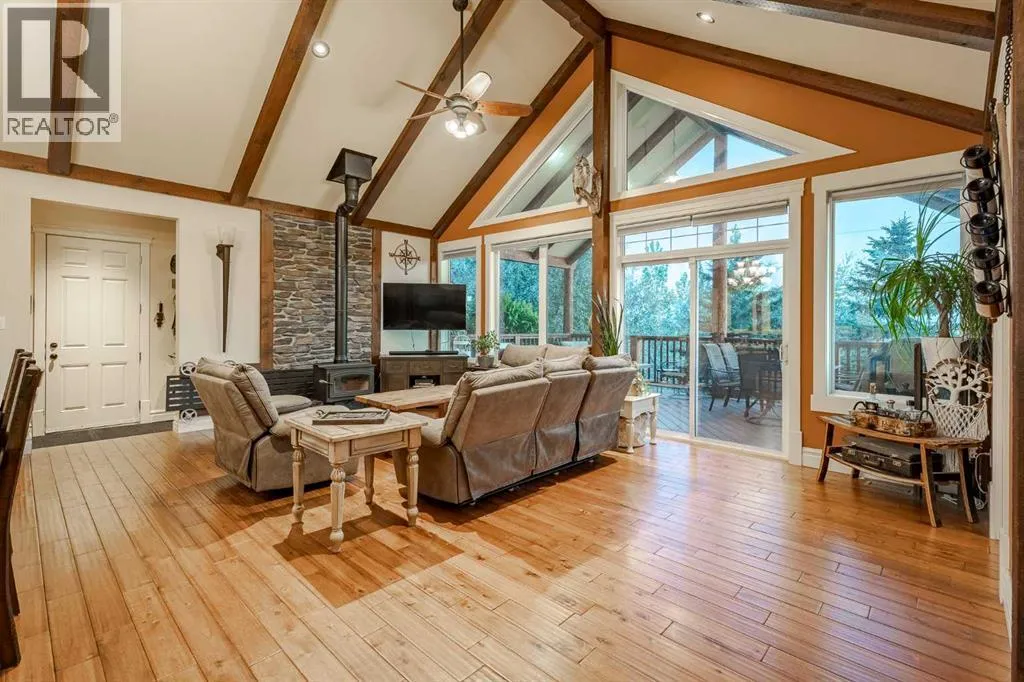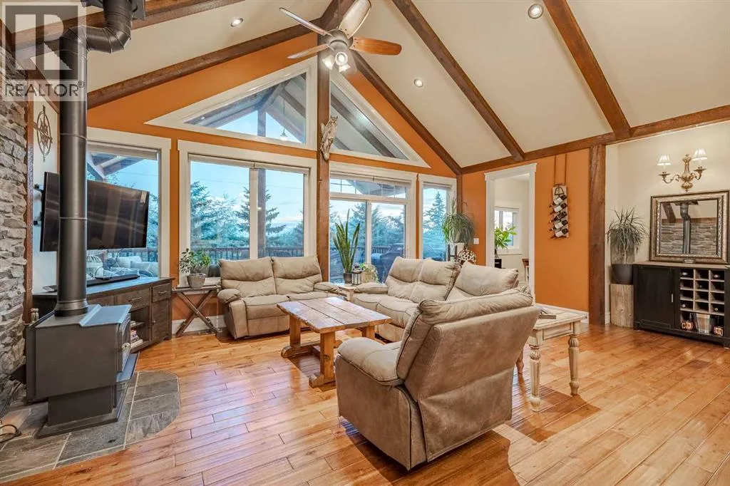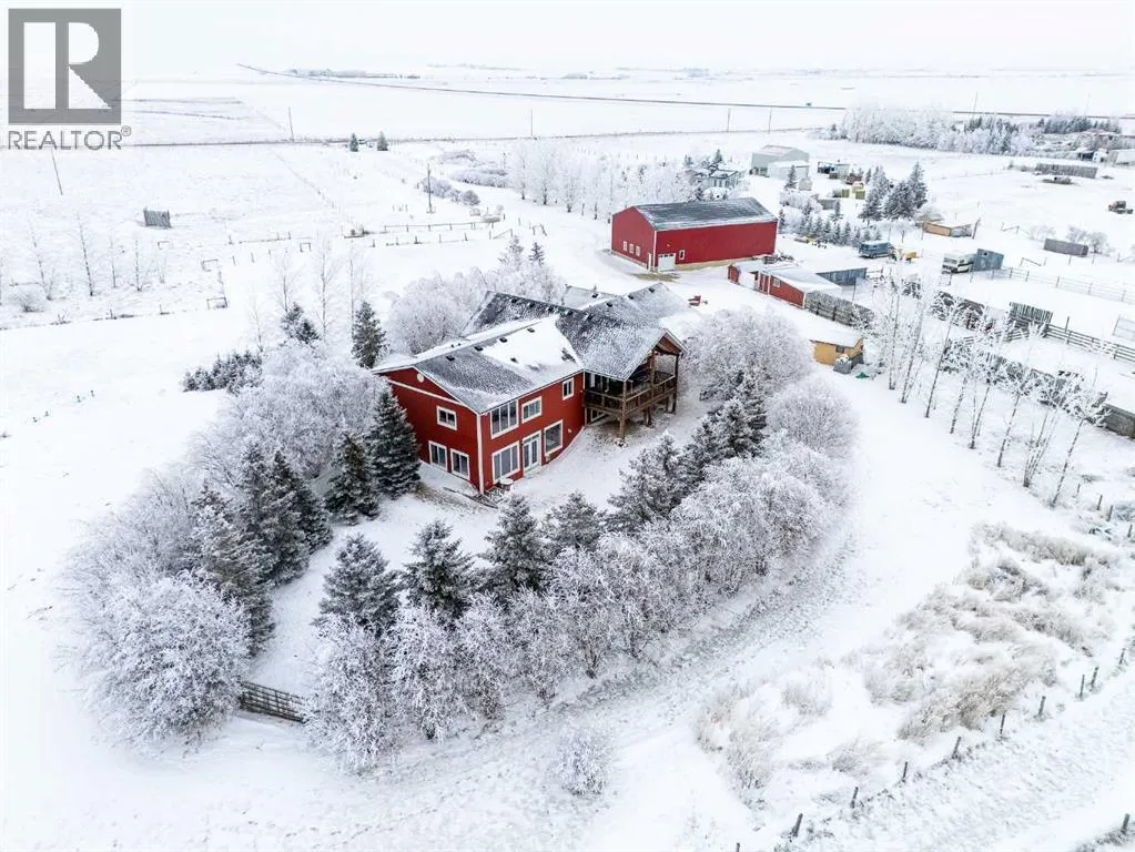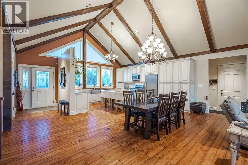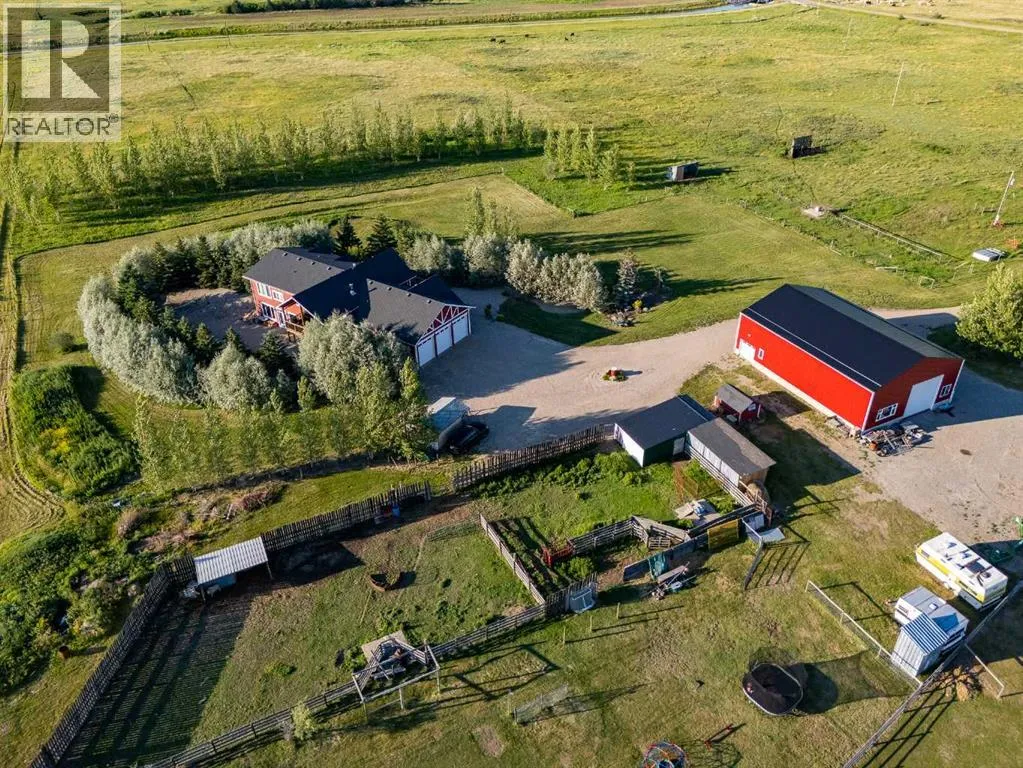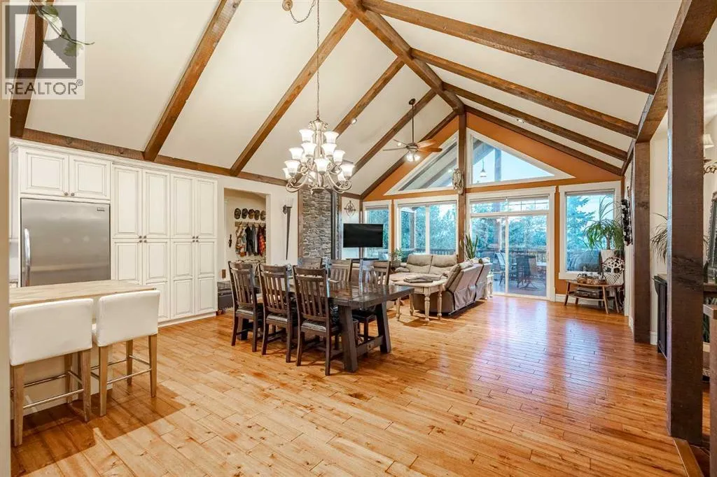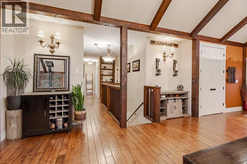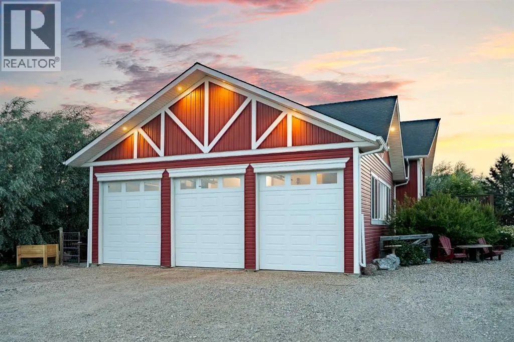 Welcome to this extraordinary walkout bungalow offering over 4,000 sq ft of thoughtfully designed living space with 6 bedrooms, 5 bathrooms, a heated oversized quad garage, a massive 40â x 60â insulated shop, and nearly 20 acres of endless possibility just minutes from Calgary. From the moment you arrive, the striking A-frame architecture stretches from the front elevation all the way to the covered back porch, perfectly framing panoramic mountain views. Step into the grand main level, where soaring vaulted ceilings with exposed beams and expansive west-facing windows fill the space with natural light and unforgettable views. The gourmet kitchen features upgraded cabinetry, a large center island, granite countertops, and premium stainless appliances designed for effortless entertaining. The spacious dining area easily accommodates large gatherings, while the open-concept living room is anchored by a cozy gas fireplace.Just down the hall, the generous primary retreat offers an open 4-piece ensuite and a spacious walk-in closet. Two additional bedrooms provide comfortable spaces for family or guests and share access to a well-appointed main bathroom. A versatile office or den is tucked away near the front entry. Downstairs, the walkout basement extends the living space with a massive recreation room, wet bar, three additional bedrooms, and two full bathrooms, including one ensuite â perfect for multi-generational living or hosting guests.Outside, the property continues to impress with an attached heated oversized quad garage and a 40â x 60â powered shop ready for your next project, hobby, or home-based business. The multiple livestock areas are thoughtfully arranged and include 3 automatic waterers to support a wide range of agricultural uses. Whether you're envisioning a private rural retreat, a hobby farm, or a future development opportunity, this nearly 20-acre parcel offers it all â and with potential for subdivision pending municipal approval, the possibiliti es are truly endless.All this just 10 minutes to Stoney Trail and 15 minutes to shopping, dining, and amenities in Seton and Mahogany. This is more than a home â itâs your gateway to rural luxury, convenience, and future opportunity. Donât miss your chance to experience it. (id:27476)