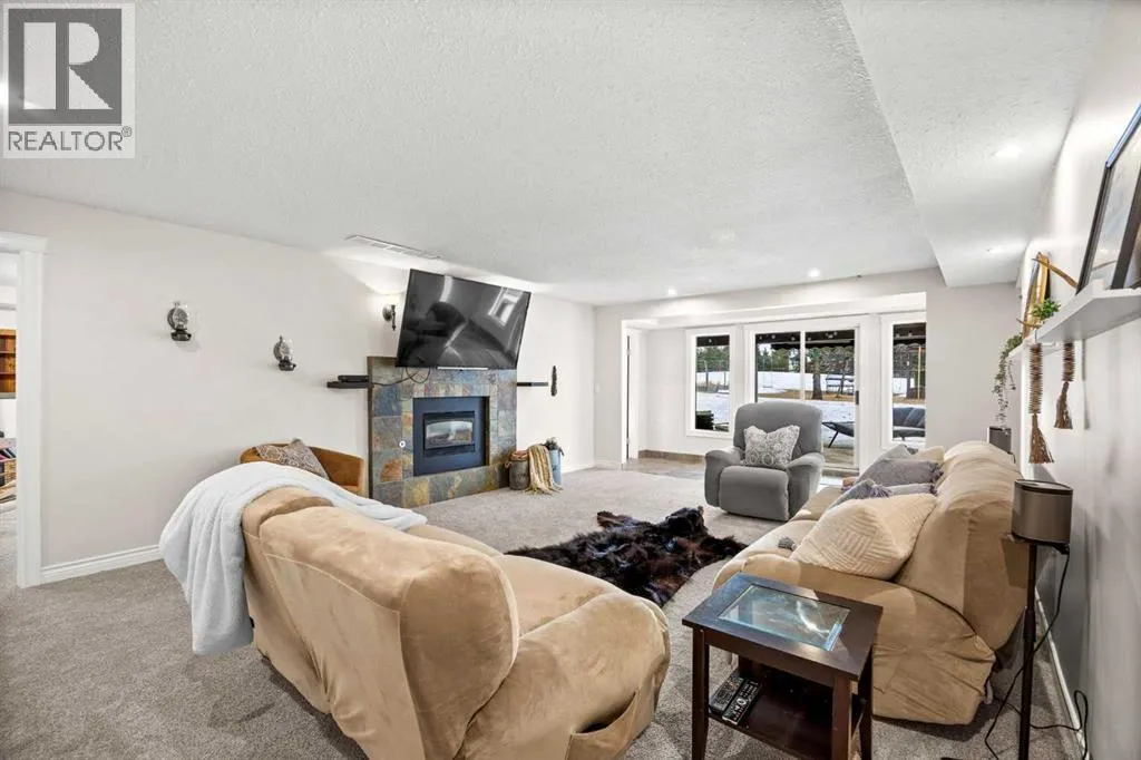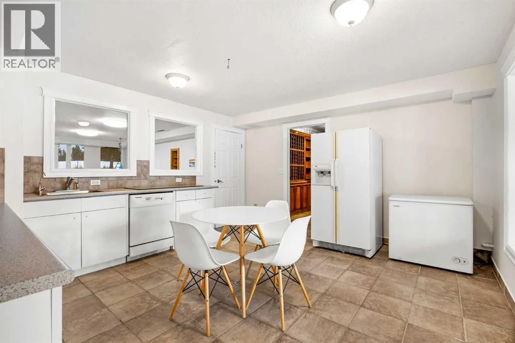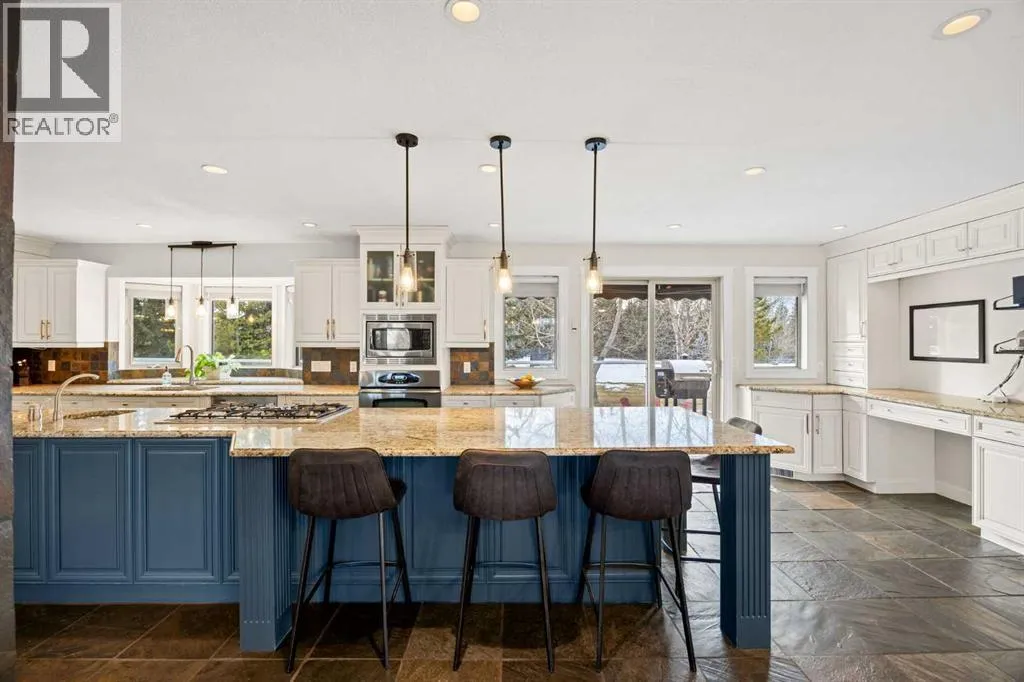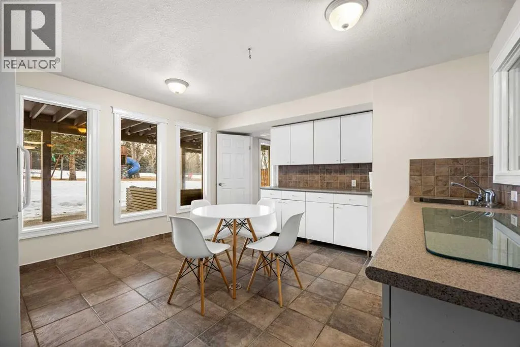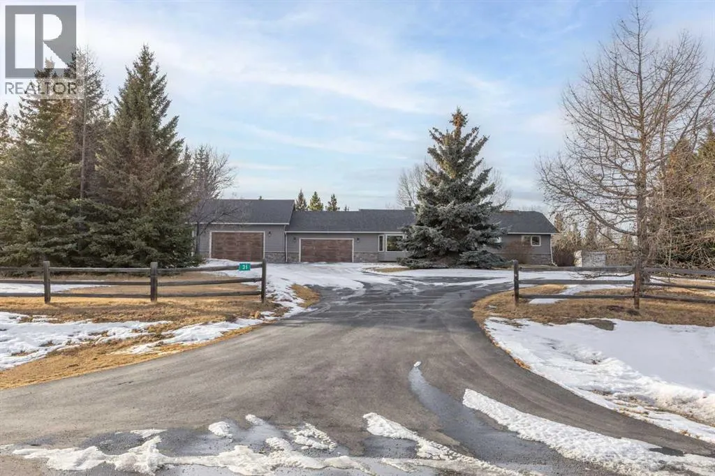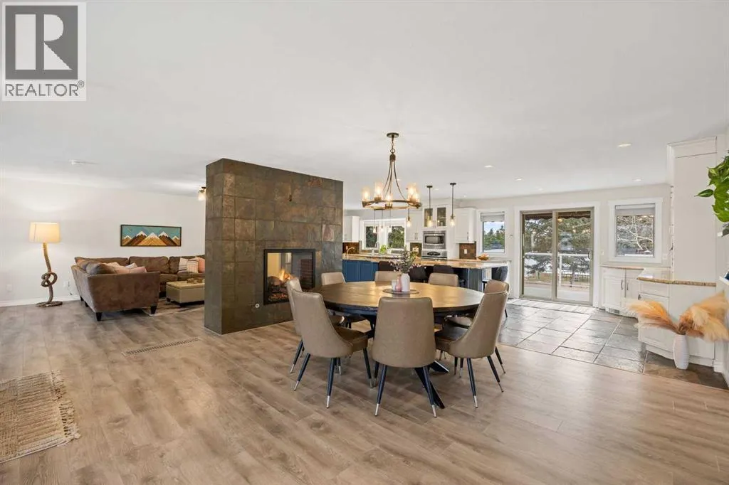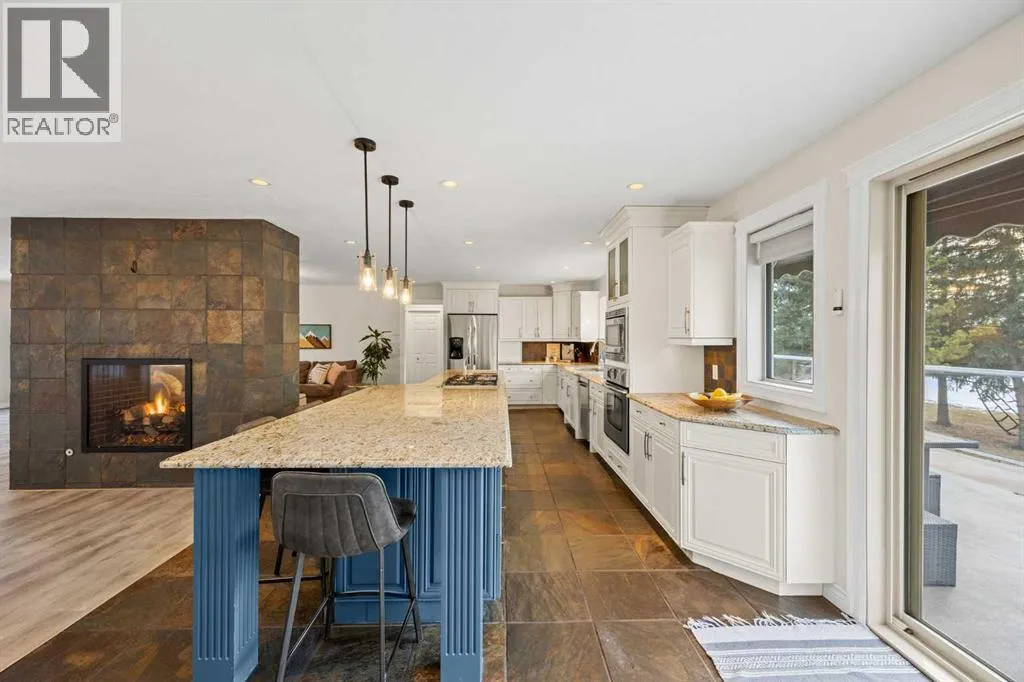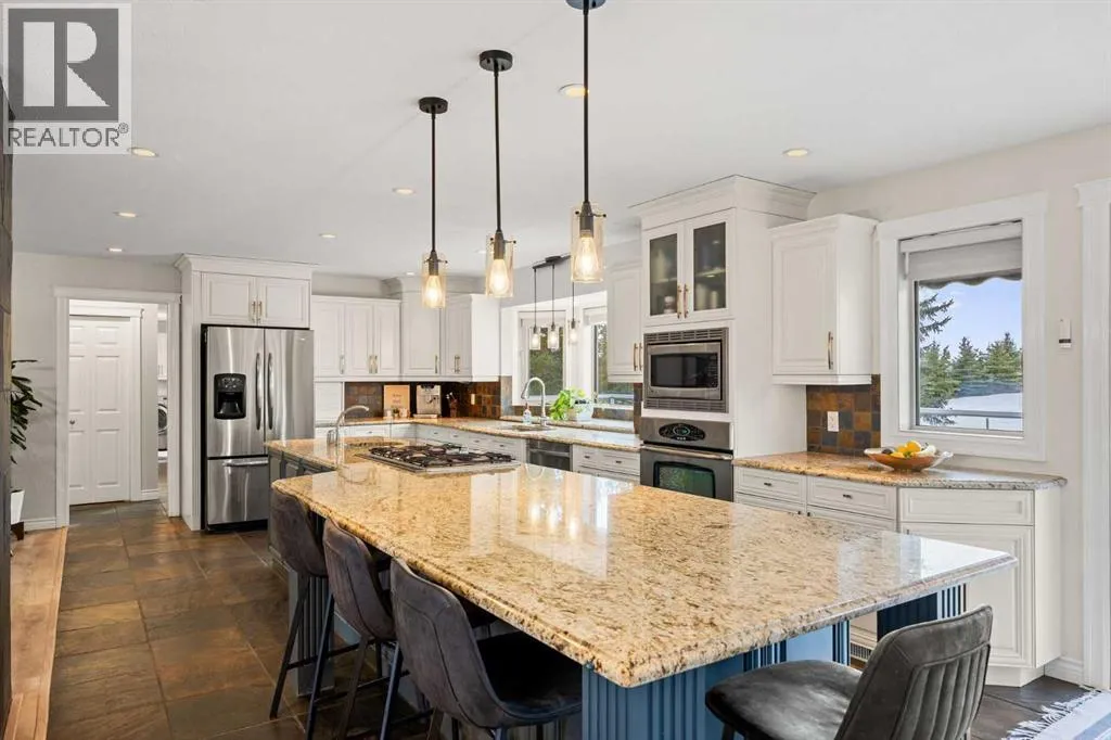 This renovated walkout bungalow is ideally situated on 2 acres of pristine land in the sought-after Elbow River Estates, offering mountain views, exceptional privacy, and a rare combination of space and lifestyle.The home backs directly onto the Glencoe Golf and Country Club drivewayâquite literally placing world-class golf just steps from your backyard. In addition, Elbow Springs Golf Club, Pinebrook Golf & Country Club, and River Spirit Golf Club are all moments away, making this an exceptional location for golf enthusiasts.Inside, the home is bright, open, and thoughtfully updated, featuring new flooring throughout (2024), including heated slate tile, and a striking double-sided fireplace anchoring the main living and dining spaces. The expansive kitchen is designed for entertaining, offering custom cabinetry, granite countertops, heated slate floors, and a massive centre island that truly serves as the heart of the home.Enjoy sunrises from the front porch and spectacular sunsets from the west-facing back deck, where mountain views create a stunning natural backdrop. The west-facing primary retreat features his-and-hers closets and a renovated 5-piece ensuite finished with heated travertine tile. Two additional large bedrooms and a full bathroom complete the main level.The fully developed walkout basement adds outstanding versatility with a fourth bedroom, full bathroom, wine room, family room, media space, gym, and more. A wet sauna, accessible from the exterior, enhances the homeâs wellness appeal. Outside, a concrete slab at the rear of the home is perfectly suited for a future hot tub or pool, creating an exceptional outdoor entertaining area.Major mechanical upgrades include new high-efficiency furnaces, hot water tank, and water softener (2021). Garage space is equally impressive, featuring an oversized attached 2-car garage plus a 4-car oversized attached garage/shop, fully insulated and heatedâideal for vehicles, hobbies, or serious workspace. Residents of Elbow River Estates enjoy a true community lifestyle with access to a playground, tennis courts, basketball courts, a winter outdoor rink, and a community horse arena, all while being just minutes from Calgary. (id:27476)