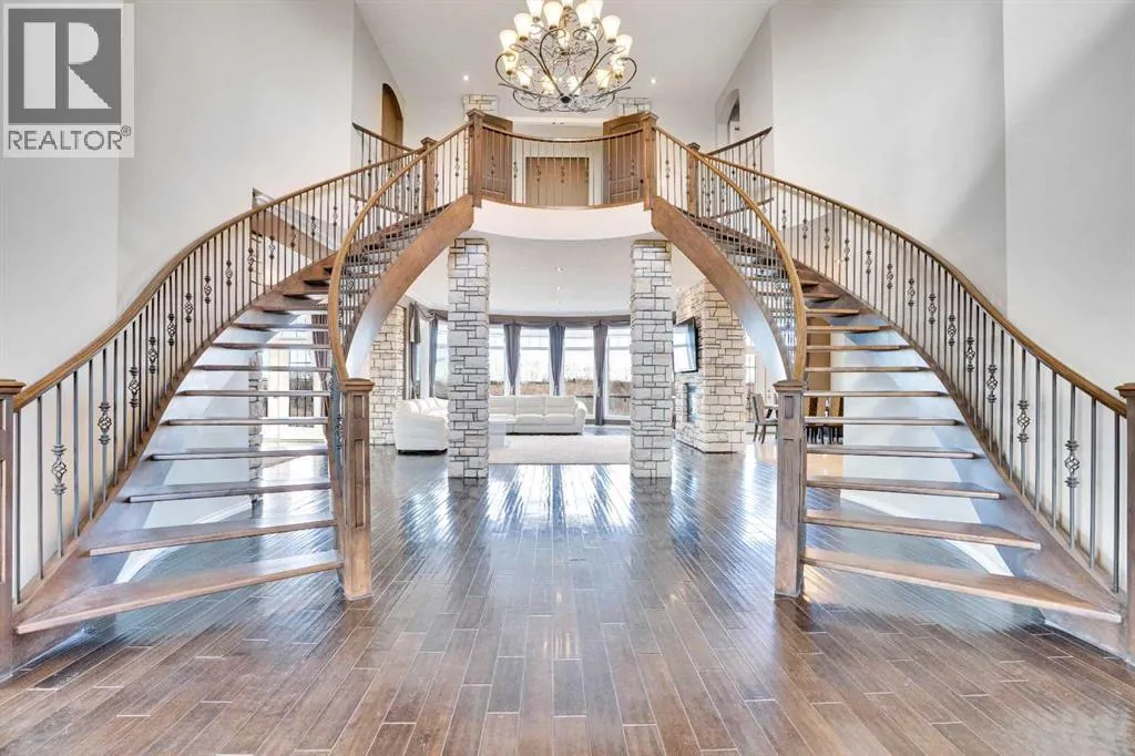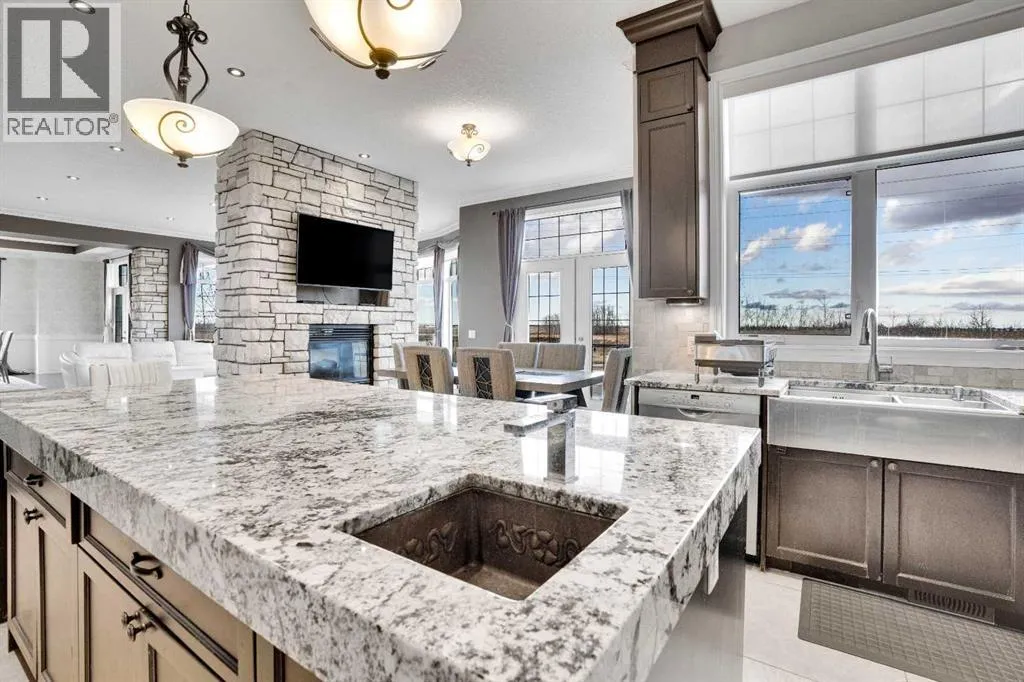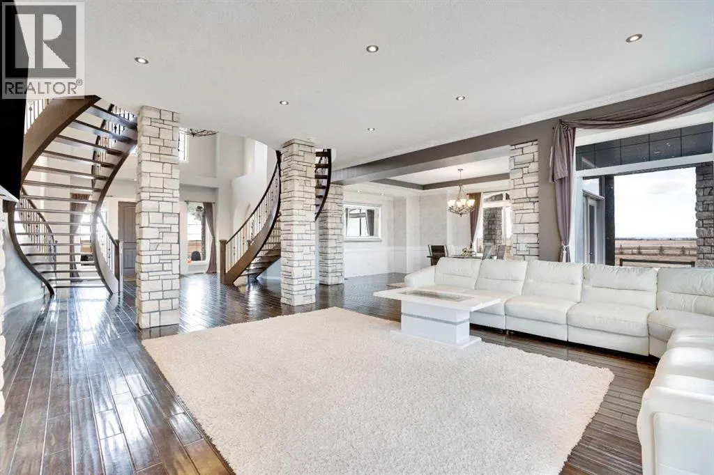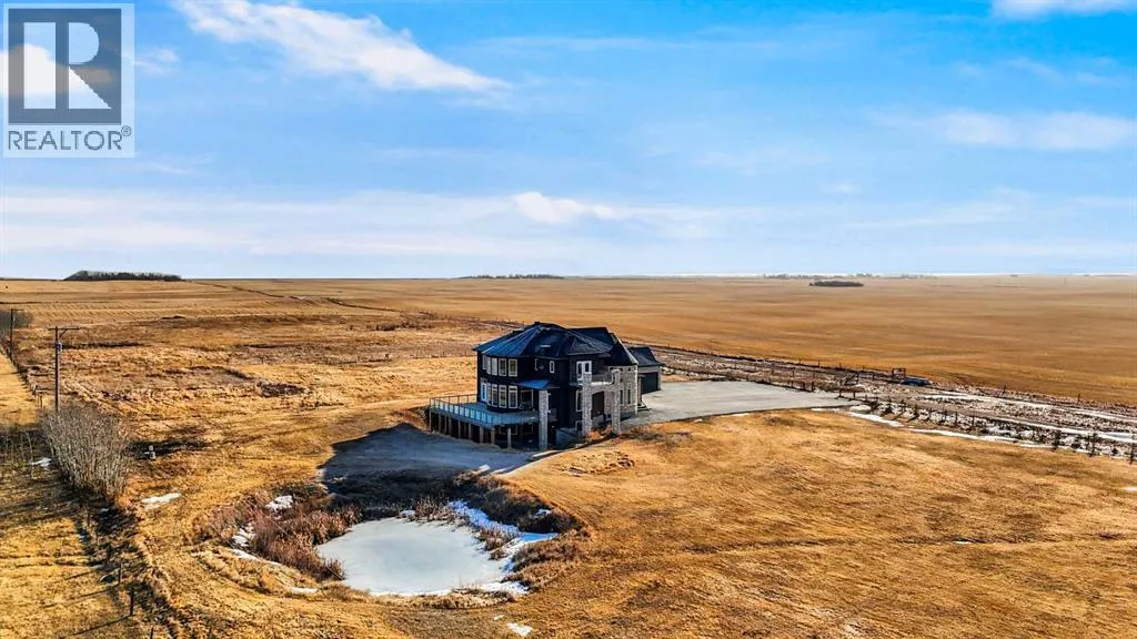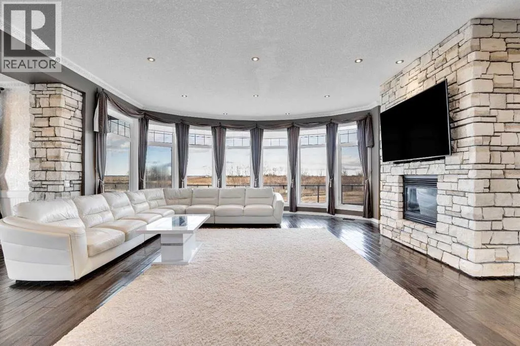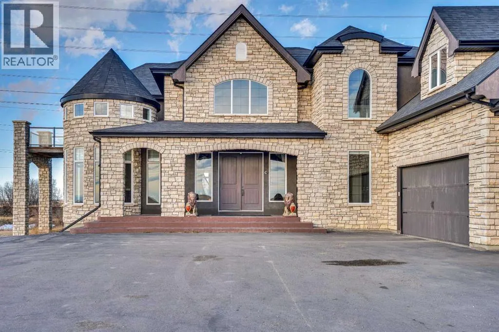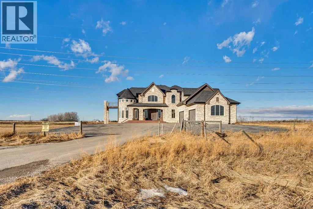 ?Welcome to this extraordinary custom-built estate offering over 7,000 sq ft of developed living space across three levels, including 4,682 sq ft above grade, all set on a beautifully positioned 4-acre parcel with a private gated driveway and a 4-car garage. Combining luxury, scale, and serenity, this remarkable property delivers peaceful country living just minutes from Calgary and Boulder Creek Golf Course. A grand double staircase and soaring open-to-below ceilings create a stunning first impression in the expansive foyer. The open-concept main floor showcases rich hardwood flooring, oversized windows framing panoramic views, and seamless flow designed for both entertaining and everyday living.? The chef-inspired kitchen features full-height cabinetry, stainless steel appliances, granite countertops, a hidden built-in range hood, wine cooler, built-in wine rack, and a large centre island with bar seating and bar sink. A walkthrough pantry connects directly to the mudroom and main-floor laundry for exceptional functionality. The bright dining nook and formal dining room both open through French doors to the massive north-facing deck, creating effortless indoor-outdoor living. The inviting living room is anchored by a double-sided gas fireplace shared with the kitchen, adding warmth and ambiance. A main-level office/den provides the perfect work-from-home space.? Upstairs, youâll find three spacious bedrooms and a large family room with lofted ceilings that enhance the homeâs grandeur. The primary suite is a private retreat featuring a west-facing balcony with mountain views. The luxurious 5-piece ensuite offers a deep soaking tub set against a wall of windows, a tiled steam shower with bench seating, dual vanities, a private water closet, and a custom walk-in closet with built-in organization. Bedrooms two and three share a well-designed 5-piece bathroom with dual sinks and a separate shower/tub and toilet areaâideal for family living.? The bright walkout basement offers an additional 2,347 sq ft of space, is PAINT READY and fully developed featuring a recreation area, home theatre, gym, or additional bedrooms, 2 full bathrooms.? This one-of-a-kind estate blends breathtaking views, expansive living spaces, and refined finishes in a highly desirable location just minutes from the city. A rare opportunity to own a truly remarkable home that must be experienced to be fully appreciated. (id:27476)