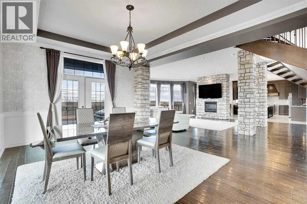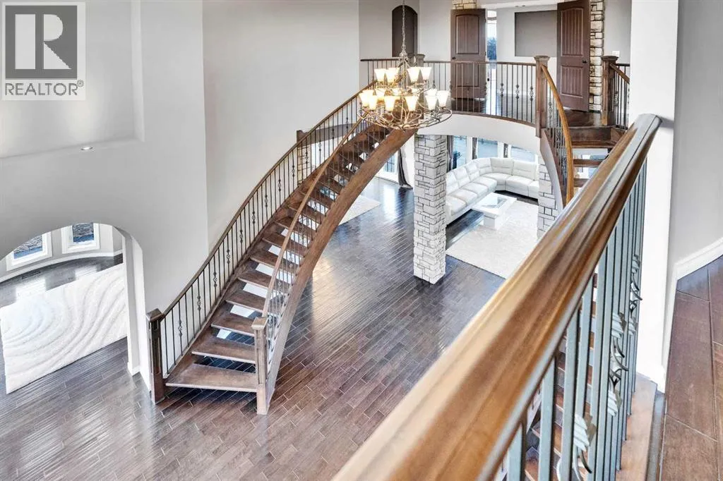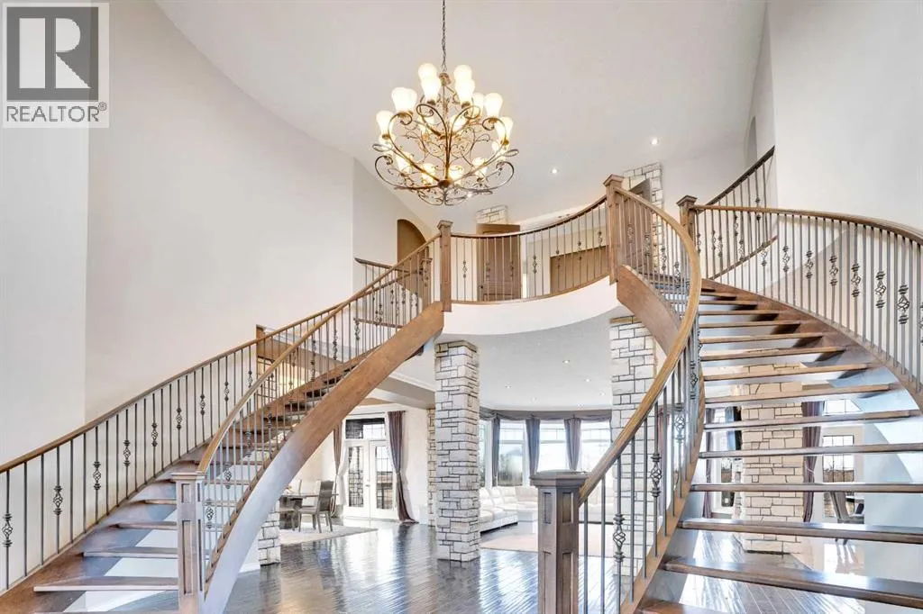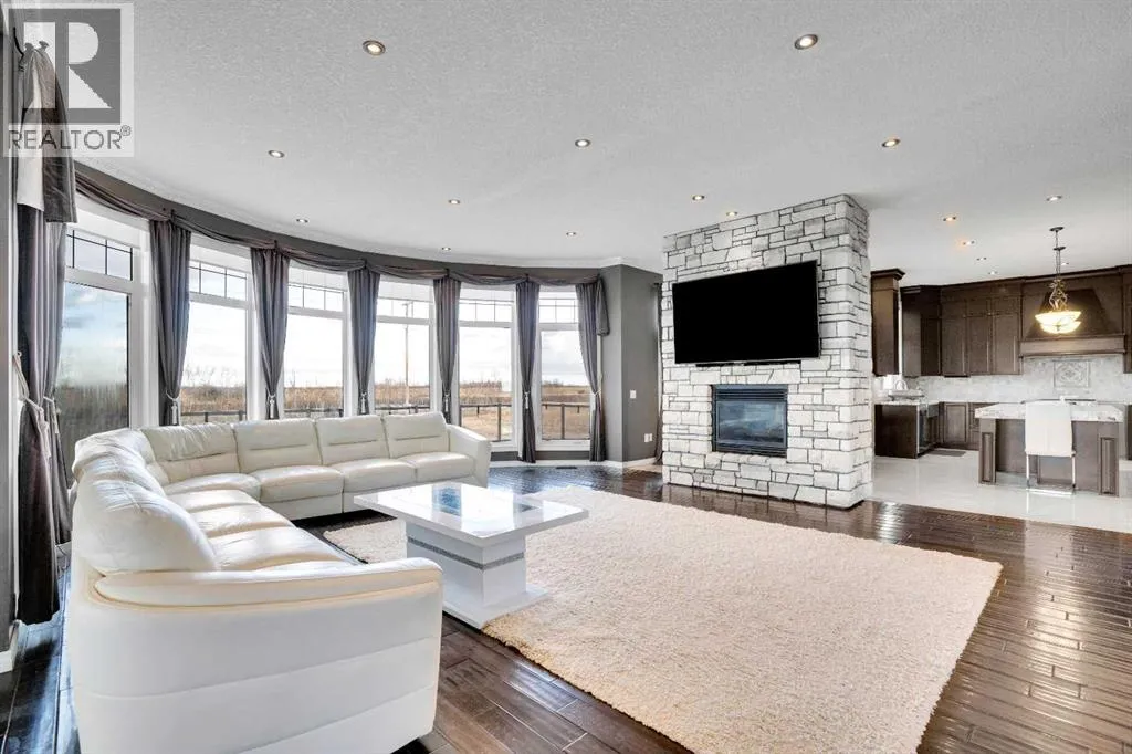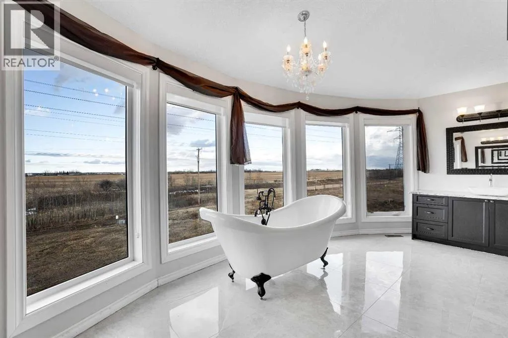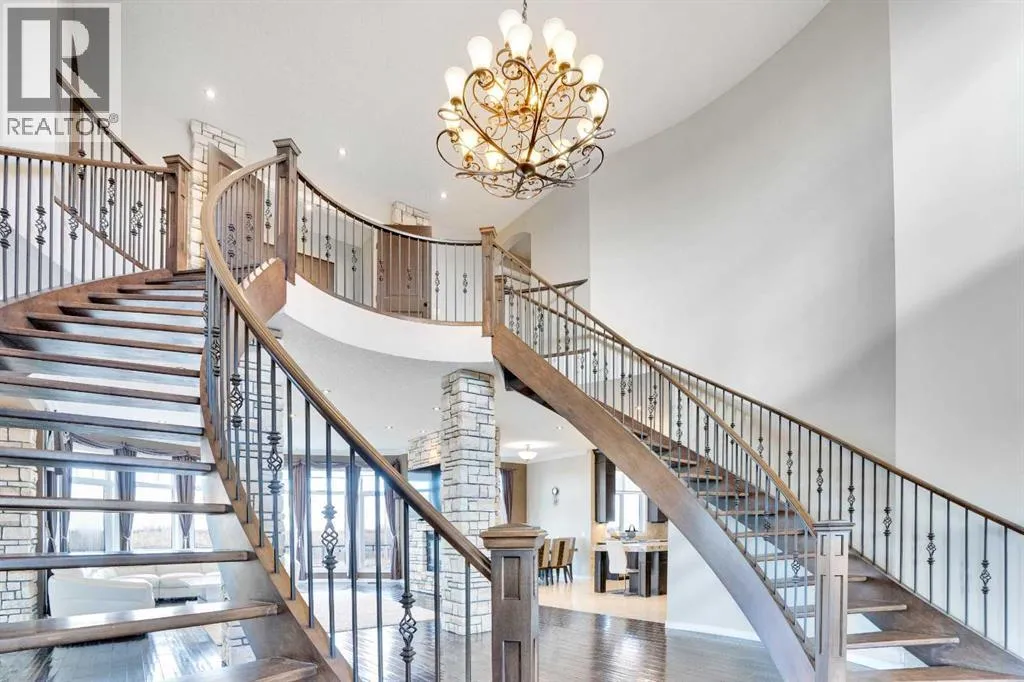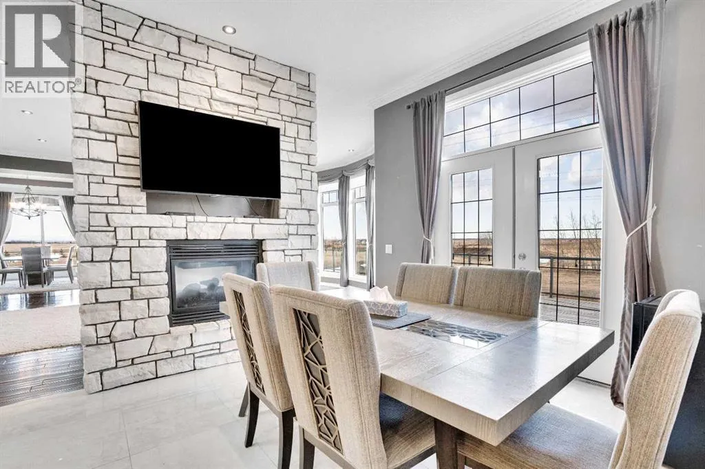 ?Welcome to this extraordinary custom-built estate offering over 7,000 sq ft of developed living space across three levels, including 4,682 sq ft above grade, all set on a beautifully positioned 4-acre parcel with a private gated driveway and a 4-car garage. Combining luxury, scale, and serenity, this remarkable property delivers peaceful country living just minutes from Calgary and Boulder Creek Golf Course. A grand double staircase and soaring open-to-below ceilings create a stunning first impression in the expansive foyer. The open-concept main floor showcases rich hardwood flooring, oversized windows framing panoramic views, and seamless flow designed for both entertaining and everyday living.? The chef-inspired kitchen features full-height cabinetry, stainless steel appliances, granite countertops, a hidden built-in range hood, wine cooler, built-in wine rack, and a large centre island with bar seating and bar sink. A walkthrough pantry connects directly to the mudroom and main-floor laundry for exceptional functionality. The bright dining nook and formal dining room both open through French doors to the massive north-facing deck, creating effortless indoor-outdoor living. The inviting living room is anchored by a double-sided gas fireplace shared with the kitchen, adding warmth and ambiance. A main-level office/den provides the perfect work-from-home space.? Upstairs, youâll find three spacious bedrooms and a large family room with lofted ceilings that enhance the homeâs grandeur. The primary suite is a private retreat featuring a west-facing balcony with mountain views. The luxurious 5-piece ensuite offers a deep soaking tub set against a wall of windows, a tiled steam shower with bench seating, dual vanities, a private water closet, and a custom walk-in closet with built-in organization. Bedrooms two and three share a well-designed 5-piece bathroom with dual sinks and a separate shower/tub and toilet areaâideal for family living.? The bright walkout basement offers an additional 2,347 sq ft of space, is PAINT READY and fully developed featuring a recreation area, home theatre, gym, or additional bedrooms, 2 full bathrooms.? This one-of-a-kind estate blends breathtaking views, expansive living spaces, and refined finishes in a highly desirable location just minutes from the city. A rare opportunity to own a truly remarkable home that must be experienced to be fully appreciated. (id:27476)