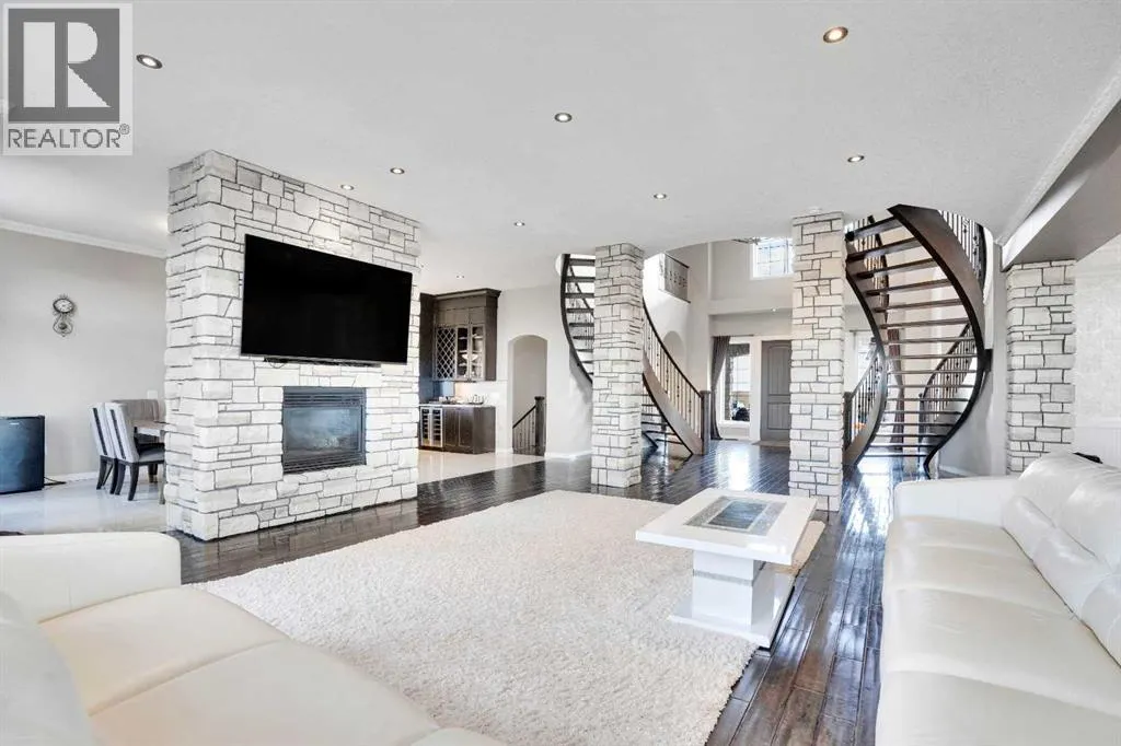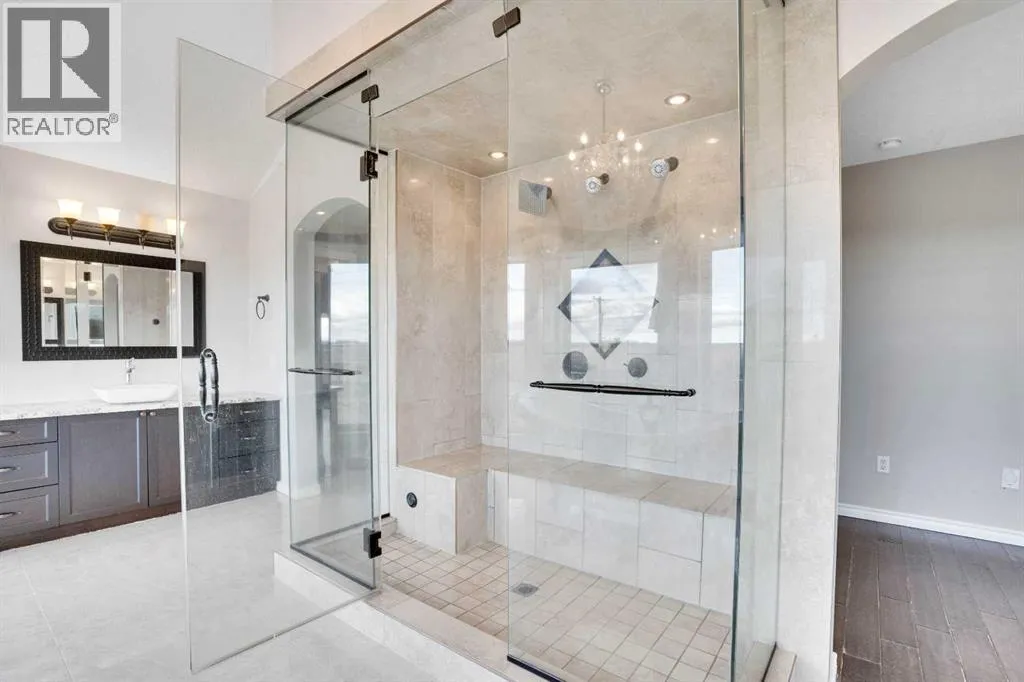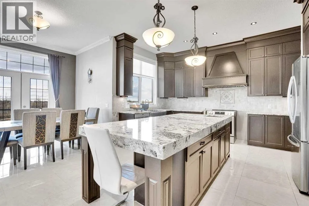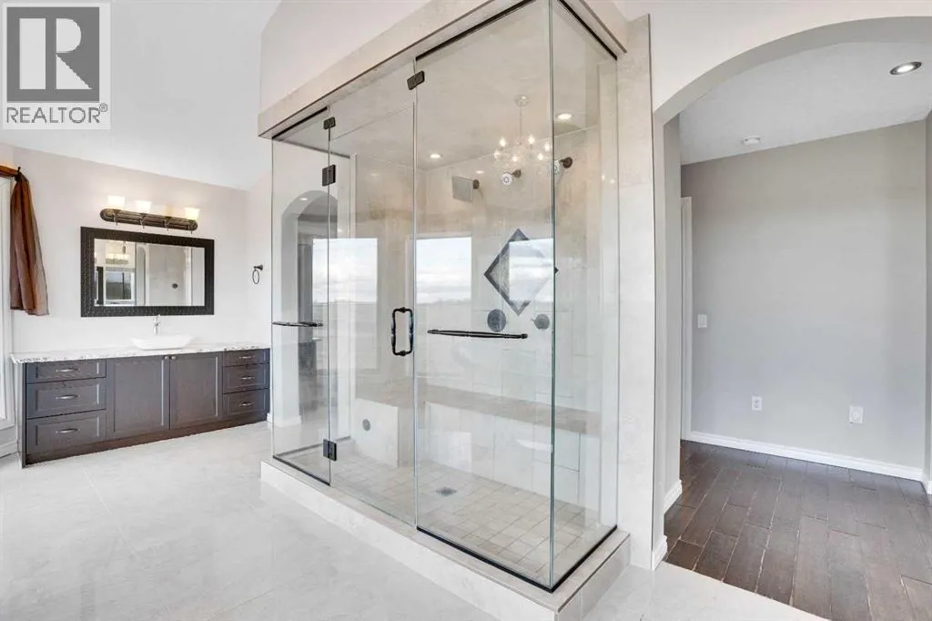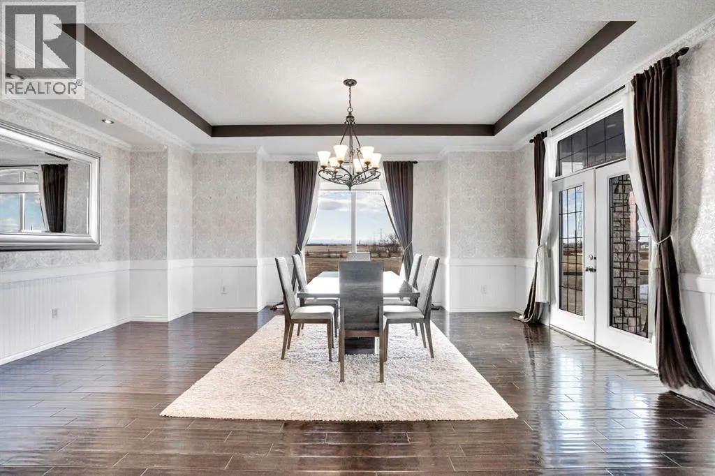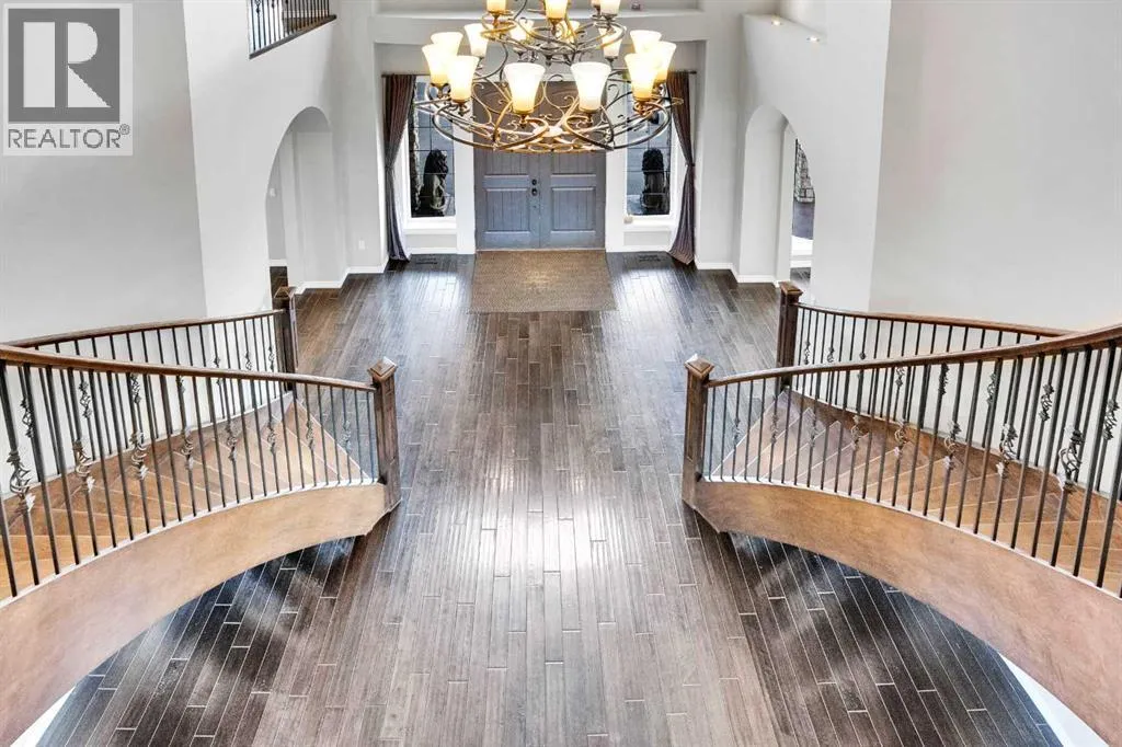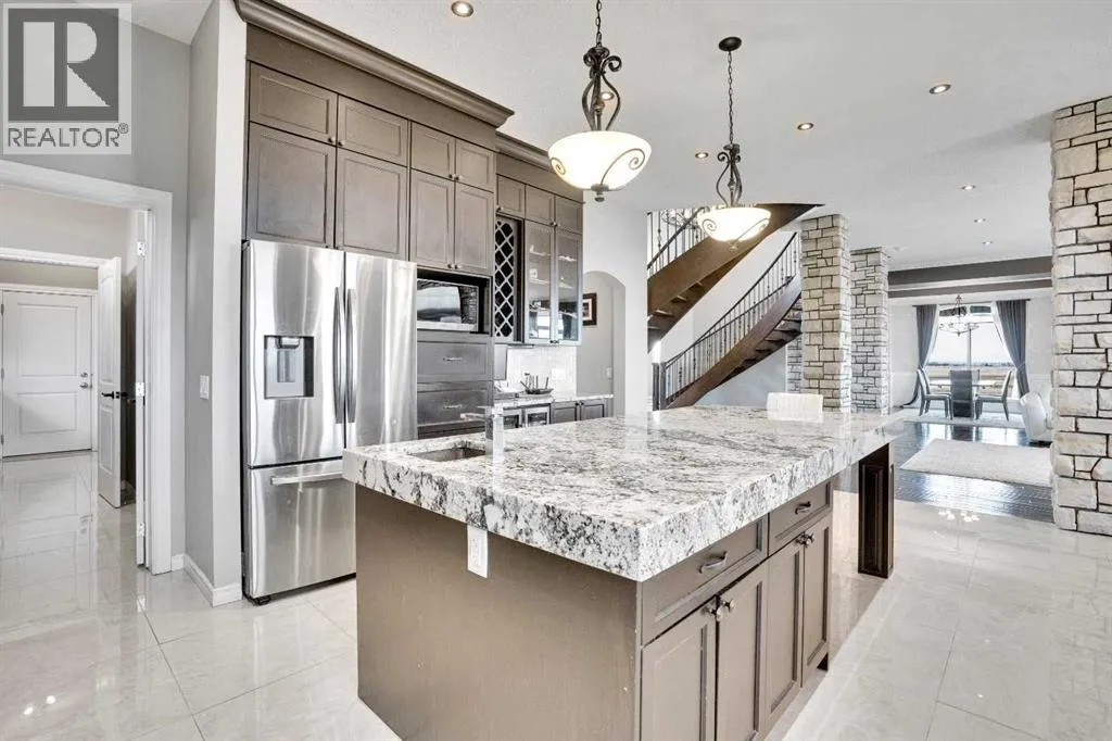 ?Welcome to this extraordinary custom-built estate offering over 7,000 sq ft of developed living space across three levels, including 4,682 sq ft above grade, all set on a beautifully positioned 4-acre parcel with a private gated driveway and a 4-car garage. Combining luxury, scale, and serenity, this remarkable property delivers peaceful country living just minutes from Calgary and Boulder Creek Golf Course. A grand double staircase and soaring open-to-below ceilings create a stunning first impression in the expansive foyer. The open-concept main floor showcases rich hardwood flooring, oversized windows framing panoramic views, and seamless flow designed for both entertaining and everyday living.? The chef-inspired kitchen features full-height cabinetry, stainless steel appliances, granite countertops, a hidden built-in range hood, wine cooler, built-in wine rack, and a large centre island with bar seating and bar sink. A walkthrough pantry connects directly to the mudroom and main-floor laundry for exceptional functionality. The bright dining nook and formal dining room both open through French doors to the massive north-facing deck, creating effortless indoor-outdoor living. The inviting living room is anchored by a double-sided gas fireplace shared with the kitchen, adding warmth and ambiance. A main-level office/den provides the perfect work-from-home space.? Upstairs, youâll find three spacious bedrooms and a large family room with lofted ceilings that enhance the homeâs grandeur. The primary suite is a private retreat featuring a west-facing balcony with mountain views. The luxurious 5-piece ensuite offers a deep soaking tub set against a wall of windows, a tiled steam shower with bench seating, dual vanities, a private water closet, and a custom walk-in closet with built-in organization. Bedrooms two and three share a well-designed 5-piece bathroom with dual sinks and a separate shower/tub and toilet areaâideal for family living.? The bright walkout basement offers an additional 2,347 sq ft of space, is PAINT READY and fully developed featuring a recreation area, home theatre, gym, or additional bedrooms, 2 full bathrooms.? This one-of-a-kind estate blends breathtaking views, expansive living spaces, and refined finishes in a highly desirable location just minutes from the city. A rare opportunity to own a truly remarkable home that must be experienced to be fully appreciated. (id:27476)