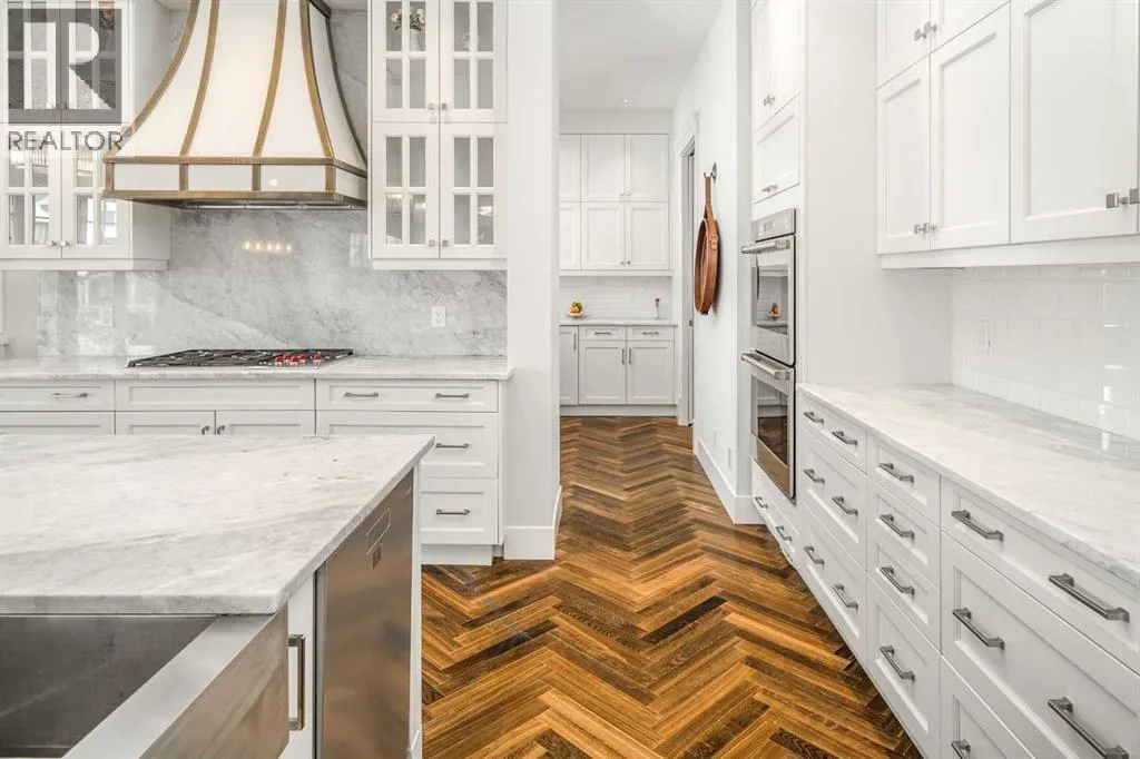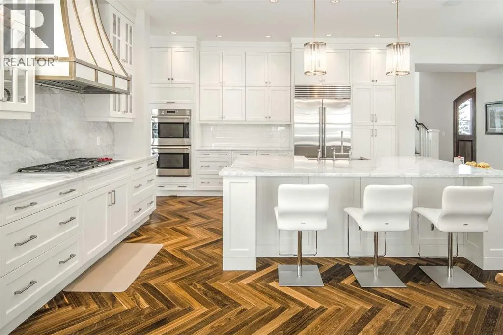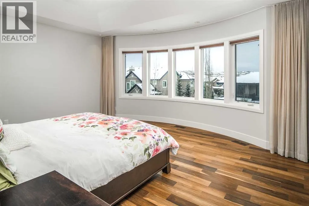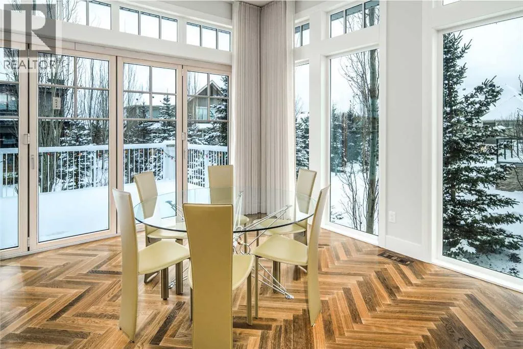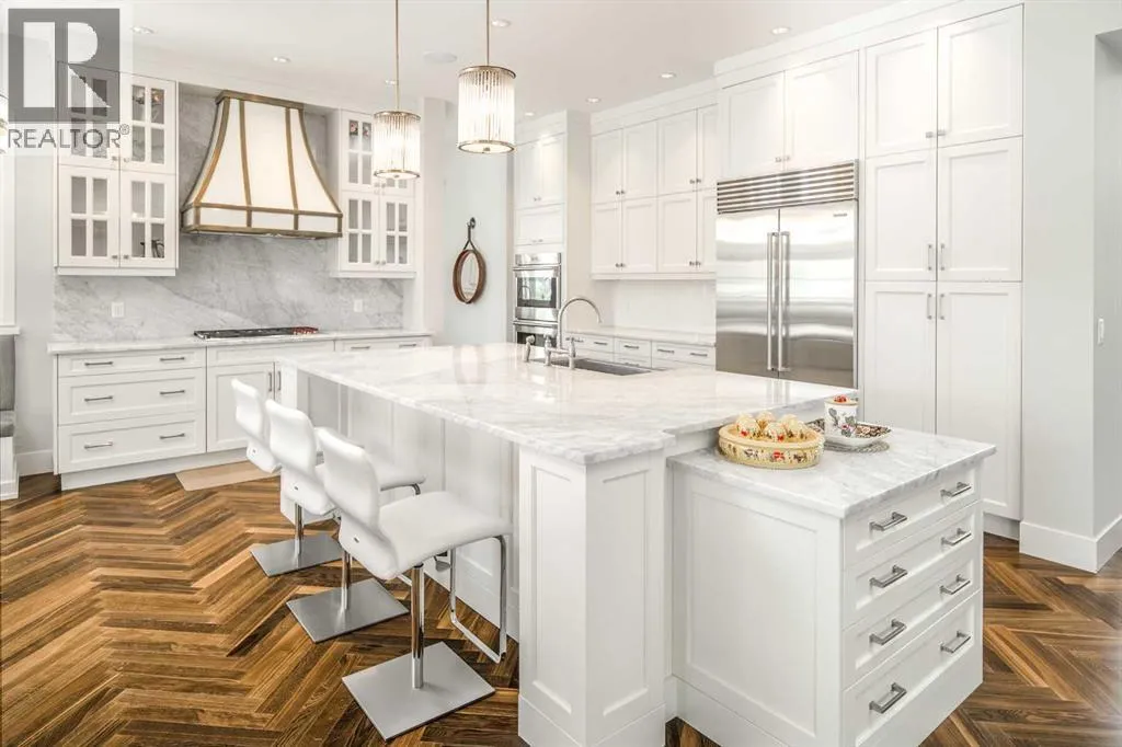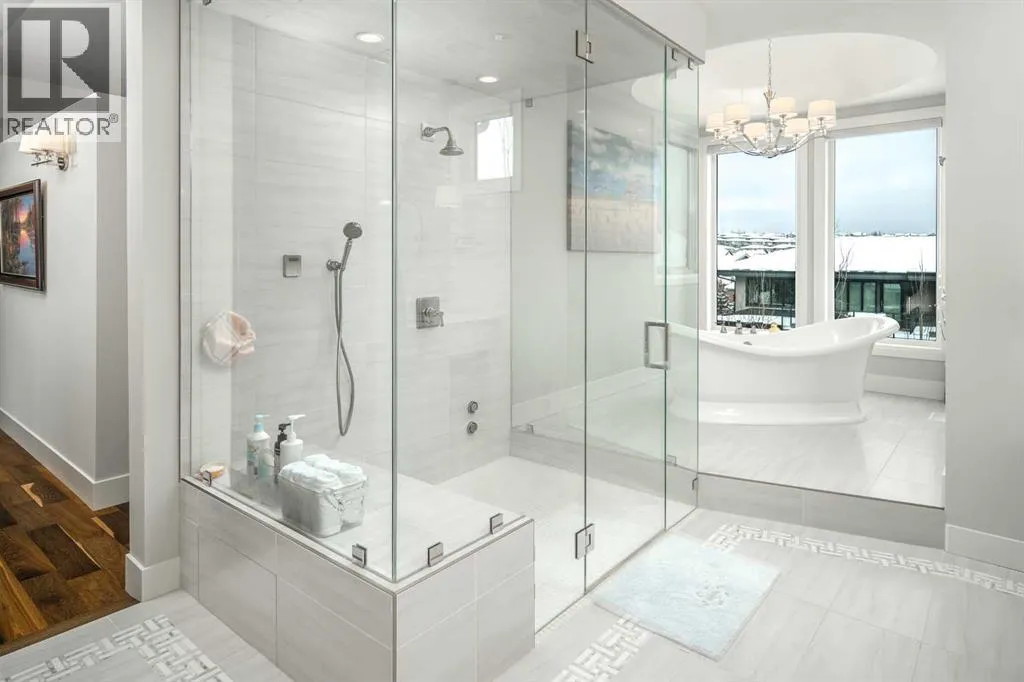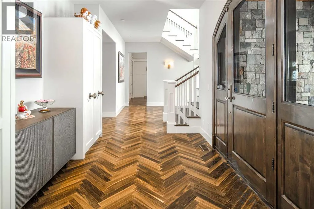 Welcome to this exquisite custom estate home by Wolf Custom Homes, nestled in the prestigious community of Watermark. Boasting over 5,400 sq. ft. of unparalleled craftsmanship and elegance, this former SHOWHOME offers tons of upgrades exemplifies luxury living. The house is in immaculate condition, having been used only occasionally by the owners. From the moment you step inside, you are welcomed by stunning luxury hardwood flooring that flows throughout the main level. The heart of the home is the gourmet chefâs kitchen, featuring beautifully crafted cabinetry, an oversized island with marble countertops, and top-of-the-line appliances, including a Sub-Zero fridge, Wolf gas stove and built-in oven, and an Asko dishwasher. Adjacent to the kitchen, the bright and inviting dining area and living room are adorned with expansive windows, allowing natural light to fill the space. A striking fireplace adds warmth and sophistication to this open-concept layout. For those who love to entertain, a formal dining room and a stunning 4-season sunroom extend onto an expansive, covered balconyâperfect for year-round enjoyment. A spacious main-floor office, complete with custom-built desk and shelving, offers the ideal work-from-home setup. A thoughtfully designed mudroom with a built-in bench and ample storage ensures effortless organization. Upstairs, retreat to the lavish primary suite, where a spectacular walk-in closet with custom spa-like 5-piece ensuite. Indulge in the free-standing soaker tub, oversized glass-enclosed shower, and dual vanities. Two additional generously sized bedrooms, each with its own walk-in closet and private 4-piece ensuite, provide ultimate comfort. A large bonus room and a convenient upper-floor laundry room complete this level. The fully developed walk-out basement, enhanced with in-floor heating, extends the homeâs luxurious appeal. It boasts a spacious entertainment area with a fully equipped wet bar, a modern fitness room, an additional bedroom, and a beautifully appointed four-piece bathroom. Step outside to your private backyard oasis, where breathtaking views, lush landscaping, and elegant decorative LED system (10K value) and garden lighting (6K) create the perfect setting for entertaining or quiet evenings under the stars. Located in the exclusive estate community of Watermark, this home provides the tranquility of country living with the convenience of city amenities just minutes away. Enjoy scenic pathways, parks, playgrounds, and the renowned Central Plaza with a pavilion, picnic areas, firepit, sports courts, and lush green spaces. Experience the pinnacle of luxuryâbook your private showing today! (id:27476)