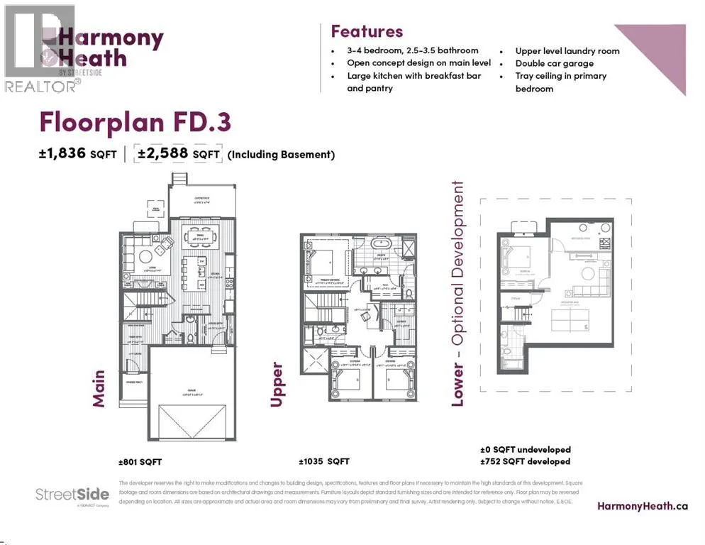 Experience the height of sophisticated living in this highly coveted luxury townhome, where a generous floor plan meets modern comfort and refined finishes. Proudly presented by StreetSide â this thoughtfully designed unit features 3 bedrooms, 2.5 bathrooms, and a front attached double car garage. The heart of the home is a spacious kitchen with a large central island, polished white quartz countertops, upgraded stainless steel appliances, and elegant sliding French patio doors that open to your covered deck areaâideal for both everyday living and entertaining. Light floods into the living room with ease through the large window, while luxury vinyl plank flooring flows throughout the main floor living areas, and carpeted stairs leading to the upper level and bedrooms provide extra warmth. The primary ensuite is a private sanctuary, complete with tile flooring, double sinks, a freestanding soaker tub, and an oversized tile-and-glass shower delivering spa-inspired comfort at home. The unfinished basement with roughed-in plumbing provides future potential for additional living space tailored to your needs. Professional landscaping and fencing complete your new home. Ideally located in the award-winning community of Harmony, residents enjoy Mickelson National Golf Course, private lake amenities, scenic walking and biking trails, and a wellness-focused lifestyleâjust a shorty drive from Calgary city minutes and 45 minutes from the Rocky Mountains, where nature and convenience come together effortlessly (id:27476)