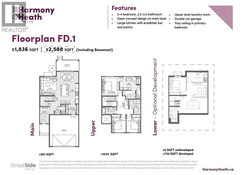 Experience the height of sophisticated living in this highly coveted luxury townhome, where a generous floor plan meets modern comfort and refined finishes. Proudly presented by StreetSide – this thoughtfully designed unit features 3 bedrooms, 2.5 bathrooms, and a front attached double car garage. The heart of the home is a spacious kitchen with a large central island, polished white quartz countertops, upgraded stainless steel appliances, and elegant sliding French patio doors that open to your covered deck area—ideal for both everyday living and entertaining. Light floods into the living room with ease through the large window, while luxury vinyl plank flooring flows throughout the main floor living areas, and carpeted stairs leading to the upper level and bedrooms provide extra warmth. The primary ensuite is a private sanctuary, complete with tile flooring, double sinks, a freestanding soaker tub, and an oversized tile-and-glass shower delivering spa-inspired comfort at home. The unfinished basement with roughed-in plumbing provides future potential for additional living space tailored to your needs. Professional landscaping and fencing complete your new home. Ideally located in the award-winning community of Harmony, residents enjoy Mickelson National Golf Course, private lake amenities, scenic walking and biking trails, and a wellness-focused lifestyle—just a shorty drive from Calgary city minutes and 45 minutes from the Rocky Mountains, where nature and convenience come together effortlessly (id:27476)