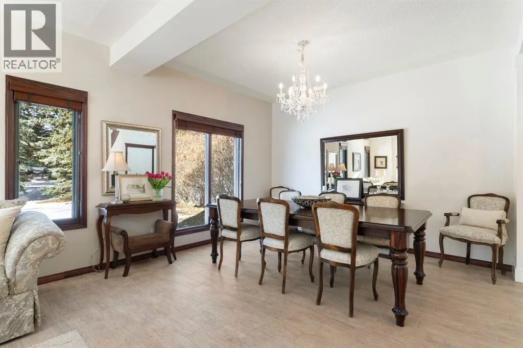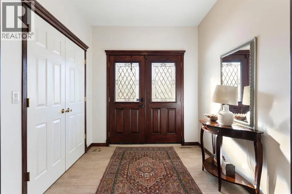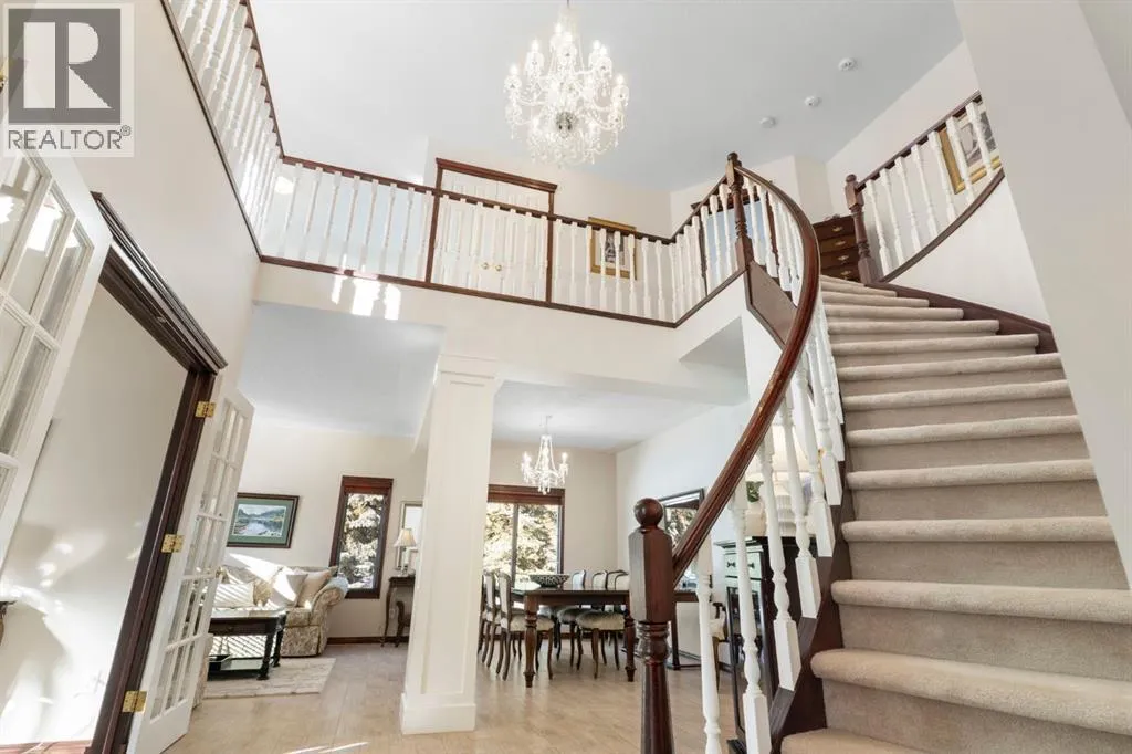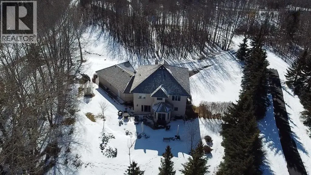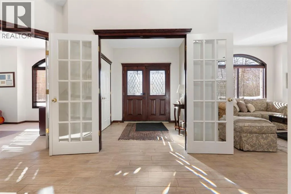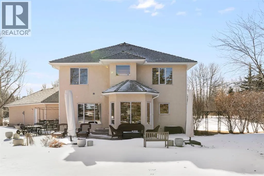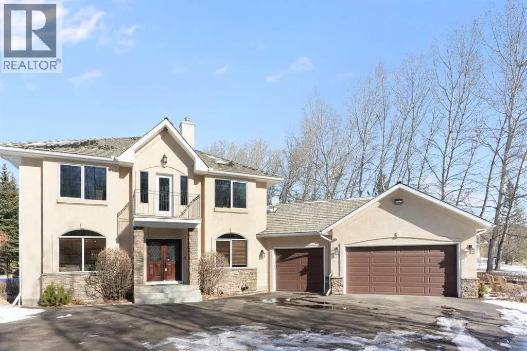 ** Watch the full CINEMATIC property tour** Welcome to this custom two-storey 4213 sqft home by Maillot Homes, perfectly positioned on a private, treed 2-acre parcel in the HEART OF BEARSPAW. Offered by the original owners, this elegant country home blends timeless design with thoughtful updates. It is METICULOUSLY maintained and a truly peaceful setting just 5 minutes from the city limits and amenities. Step through the enclosed entry into a dramatic vaulted foyer where a graceful curved staircase and sparkling chandelier create a memorable first impression. Large picture windows fill the home with natural light, highlighting the spacious principal rooms designed for both everyday living and entertaining. The kitchen features refinished oak cabinetry, GRANITE COUNTERTOPS, stainless steel appliances, a corner pantry, island, and tiled backsplash. The sunny-bayed breakfast nook opens to a large exposed aggregate patio overlooking the beautifully landscaped yard, while the adjoining family room offers a cozy FIREPLACE with custom built-ins and stone surround. A main floor office with south-facing windows, convenient laundry with garage access, and elegant living and dining rooms complete the main level. Upstairs, the home offers three generous bedrooms plus a bright bonus room with deck access to a Juliet balcony. The primary retreat includes a large walk-in closet and a luxurious 5-piece ensuite with jetted tub and double vanity. The fully developed basement provides a spacious recreation area with endless potential, a fourth bedroom, and abundant storage. RECENT UPDATES: Include: $40K in groundworks, NEW hot water tanks, sump pumps, septic tank pump and plumbing, Moen Flo device on main water line, NEW dishwasher, Induction range, and upright freezer. Additional HIGHLIGHTS include central air conditioning, newer furnace, triple attached oversized insulated garage, dry riverbed landscaping, greenhouse, and a private yard surrounded by mature trees. A rare opportunity to enjoy the tranquility, space, and lifestyle that make Bearspaw one of the regionâs most sought-after acreage communities. (id:27476)