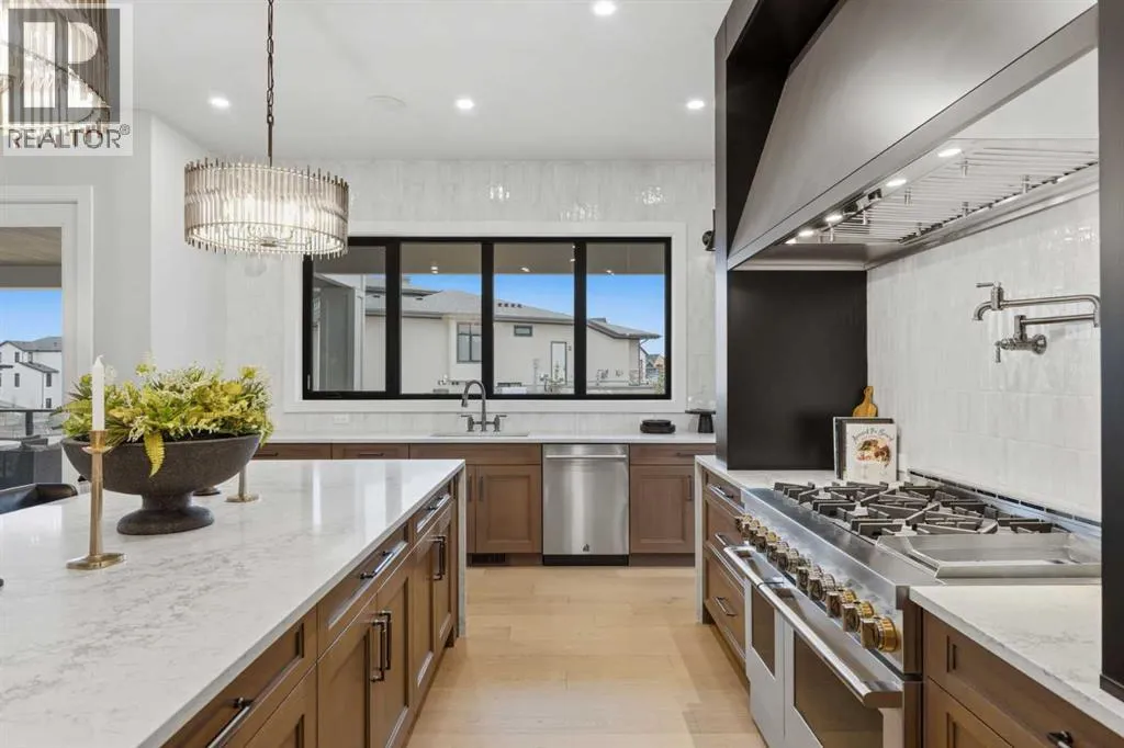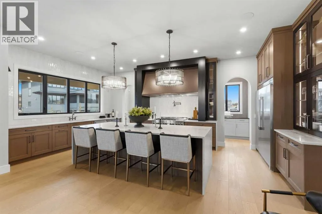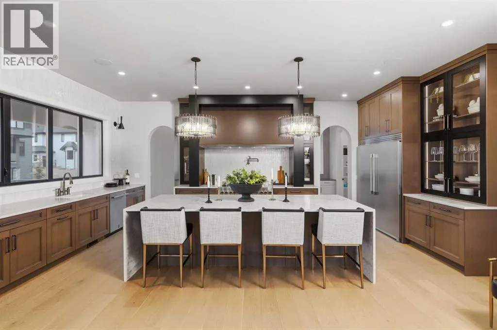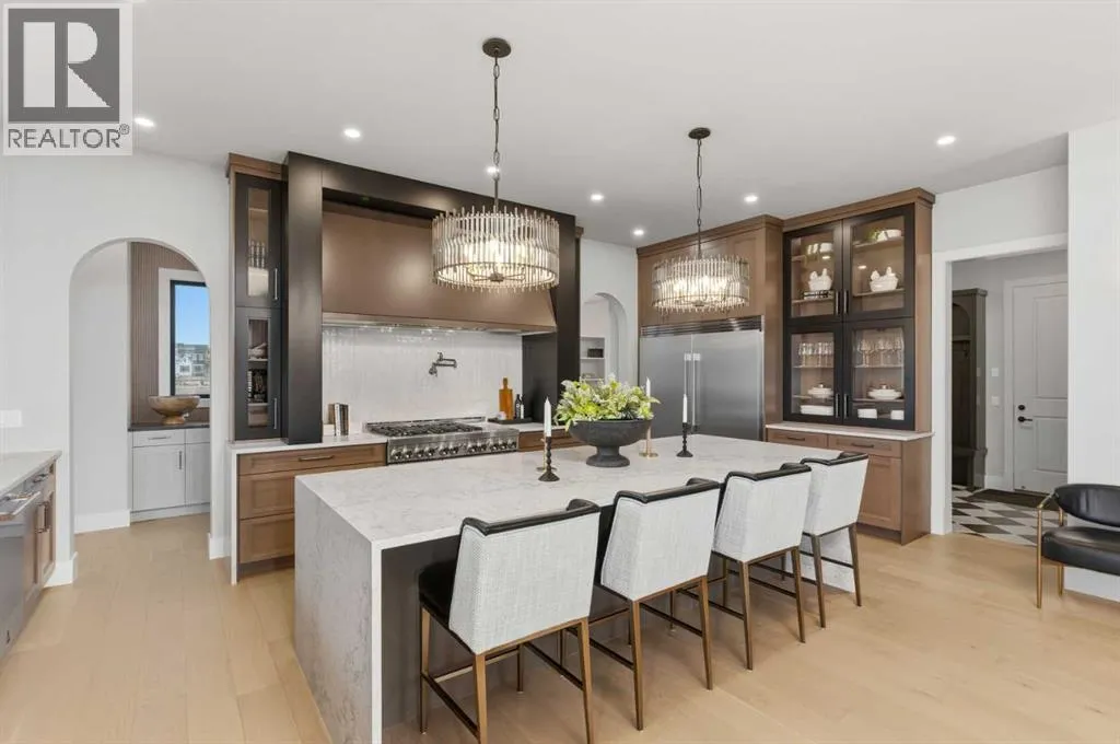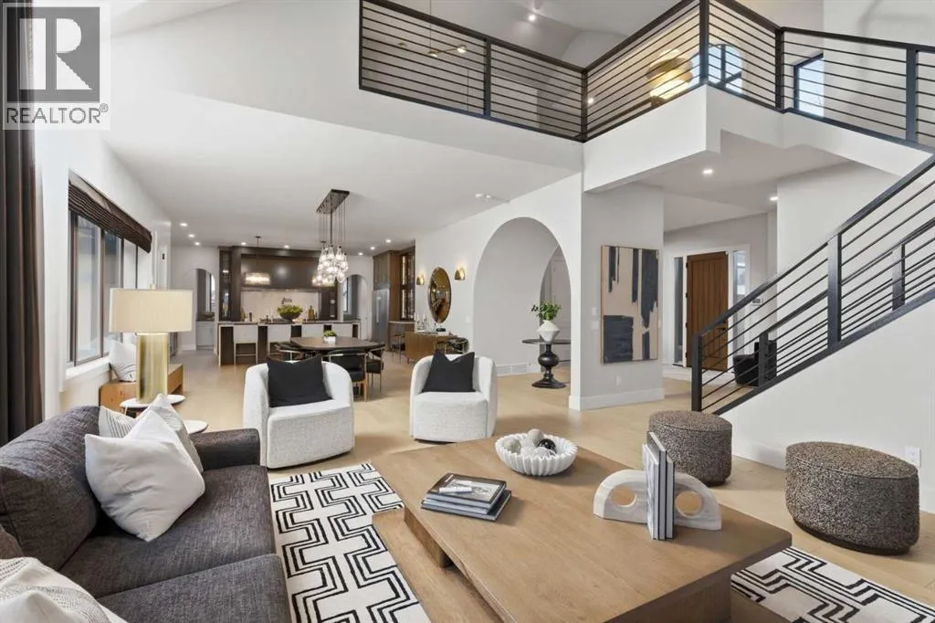 A rare opportunity to own a former Crystal Creek LOTTERY HOME in Watermark, offered FULLY FURNISHED and completely turn key, where every detail has been professionally curated and included. Set on a large lot with a sunny south facing backyard, this 5,652 sq ft fully developed luxury home with triple car garage makes an immediate impression. Soaring open to above ceilings, full height windows, and a statement fireplace define the main living space. The main level flows effortlessly through a designer kitchen with oversized island, premium appliances, butlerâs pantry, and an elegant dining area framed by architectural arches and custom lighting, while a private office, functional mudroom, and thoughtful storage round out the floor. Upstairs, the primary retreat feels like a boutique hotel, complete with a spa inspired ensuite with in-floor heating, freestanding tub, oversized shower, fully built out walk in closet, and a private balcony overlooking the south facing yard, a quiet spot for morning coffee or winding down at the end of the day. Additional bedrooms offer their own character and access to ensuites, while the upper lounge overlooks the great room below, creating a bright and open second living space. The fully developed basement is designed for entertaining with a large rec room, bar, gym or flex space, and guest bedroom. Built for comfort and efficiency, this home features dual furnaces, dual A/C units, tankless hot water, HRV system, water softener, audio system, Wi-Fi extenders and full new home warranty coverage for complete peace of mind. Outside, the property features Gemstone lights, is fully landscaped with irrigation system and ready to enjoy from day one. Located just outside Calgary, the prestigious community of Watermark offers estate living with quick access to the city, mountain views, pathways, and a level of privacy that is increasingly hard to find. Homes of this caliber, fully finished and furnished, rarely become available. Book your priv ate showing and experience it in person. (id:27476)