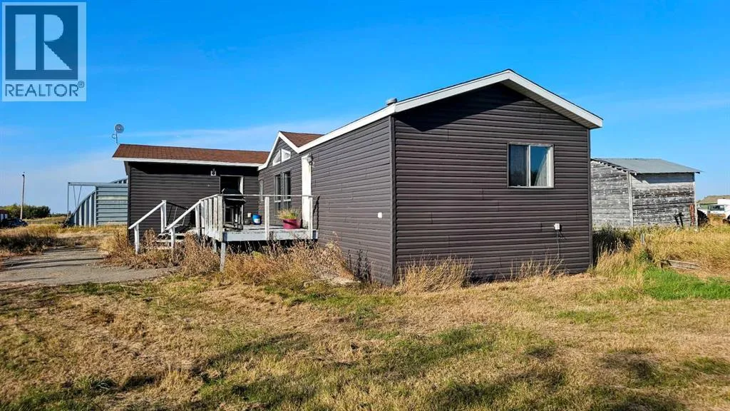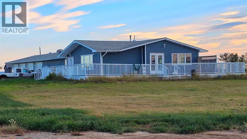 Two homes on one quarter section (160 acres). Ten acres hosting two homes and outbuildings with 150 acres to simply enjoy, farm or rent. Four-car-garage attached to fully developed home plus a second residence: an updated mobile home! 40' X 100' Quonset for storage plus a heated 40' X 42' workshop for projects. Various outbuildings. Crops of canola, hay, alfalfa in recent years. Large ranch style main house with attached four car in-floor heated garage fronted with 30' X 80' concrete parking pad, connected by spacious mud room. Wrap around deck with maintenance free railings on west, north, east sides of house. Dugout draws water to the home and in the garage is a cistern if you prefer to haul in water. Recently fully renovated basement effectively makes the approximately 2,600 square foot home feel new again. Enter the mud room and step left to that long garage or hang a right into the home, via steps or ramp. Main floor is modern and just requires a few touch ups. An addition adds a second large dining space to the main floor, or option to modify the large layout for a variety of uses. Two bedrooms plus a utility room which could be third bedroom. Downstairs, two bedrooms, office, small den and three piece bath. Also, huge games and media spaces. Mobile home has been renovated with a large addition and just needs some minor work. This is an estate sale so please accept the property, inside and out, as is where is. Buyer to check if GST applies. (id:27476)