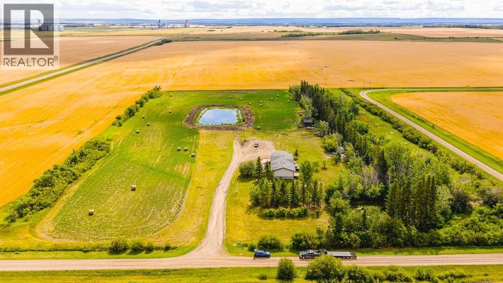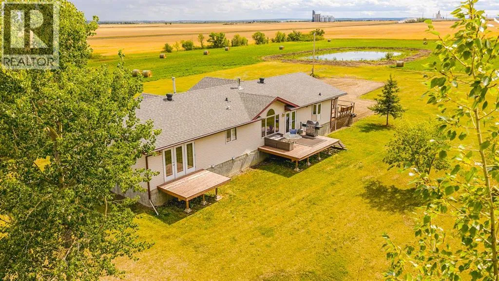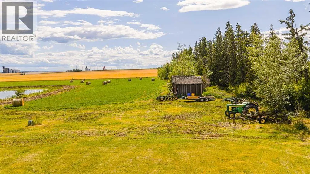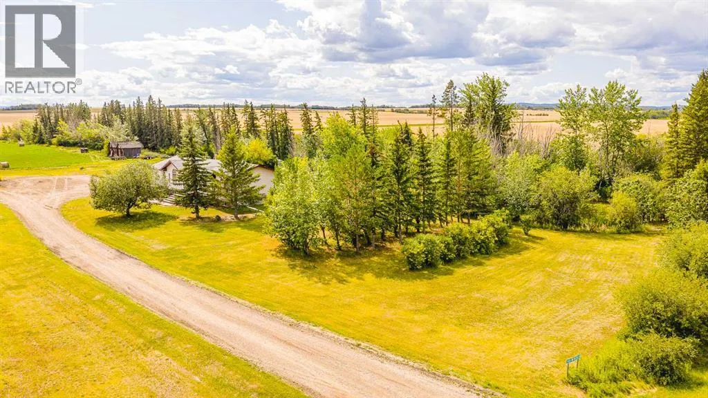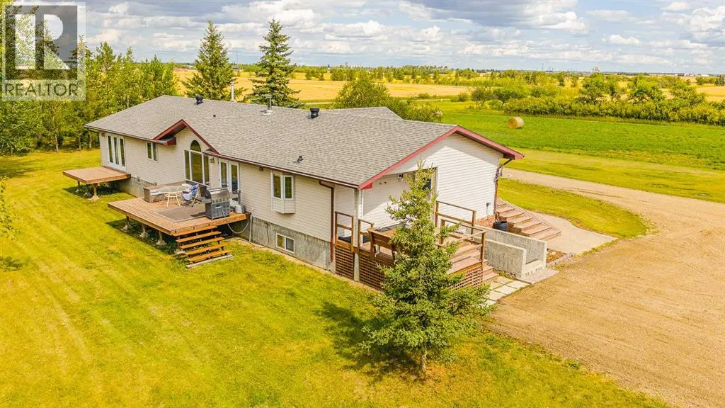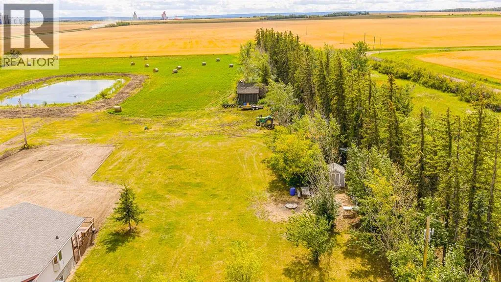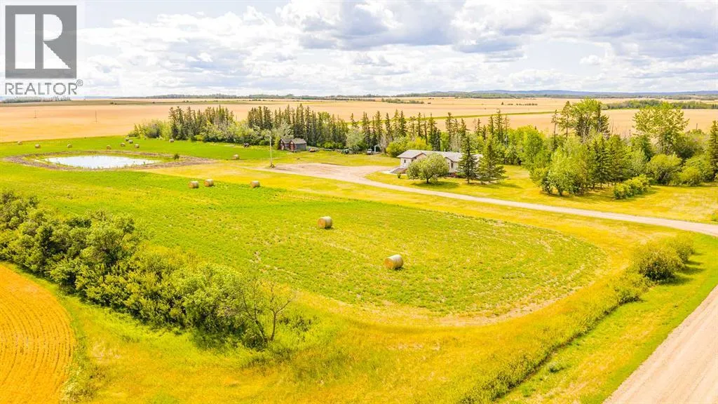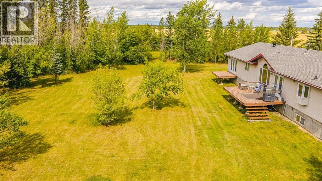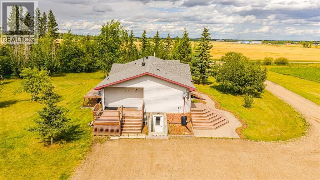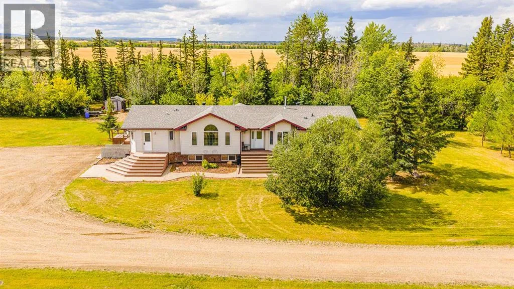 Nestled on 24 serene acres just a stoneâs throw or a few minutes from Rycroftâthis striking 5-bedroom, 3-bathroom bungalow with a finished basement blends graceful countryside living with thoughtful modern touches. Vaulted ceilings, bay windows and an open-concept design define the heart of the home, where a chefâs kitchen, outfitted with rich cherry oak cabinetry, black and stainless steel appliances, and a cozy eat-up bar, flows seamlessly into a dining area spacious enough for memorable family gatherings (fitted for wood stove also). French doors open onto a deck with a natural gas BBQ hookupâperfect for summer celebrations against a backdrop of tall trees, a fire pit, and lush hay fields. The tranquil primary suite offers private morning escapes with its own deck, walk-in closet, and a spa-like ensuite featuring a corner jetted tub and separate shower and ceramic tile flooring. At the other end of the home, a large boot room and conveniently located main-floor laundry serve the household well, and a three-piece washroom off the back entrance keeps mudroom traffic flowing. Downstairs, discover a versatile space with its own entranceâideal for conversion into a rental suite or in-law accommodation. It includes an entertainment room, two additional bedrooms, a spacious foyer, and plenty of unfinished storage space thatâs prepped and plumbed for another bathroomâoffering endless potential. Practical updates include a brand-new high-efficiency furnace (2025), Culligan water treatment system, in-floor heating in basement, and shingles replaced in 2021. The property is currently on gravel roads, with paving slated for the near future. Located roughly 45 minutes from Grande Prairie, this home sits amidst agricultural landscapes and minutes from essential and enriching amenities in nearby Spirit River and Rycroft. Book your private showing today! (id:27476)