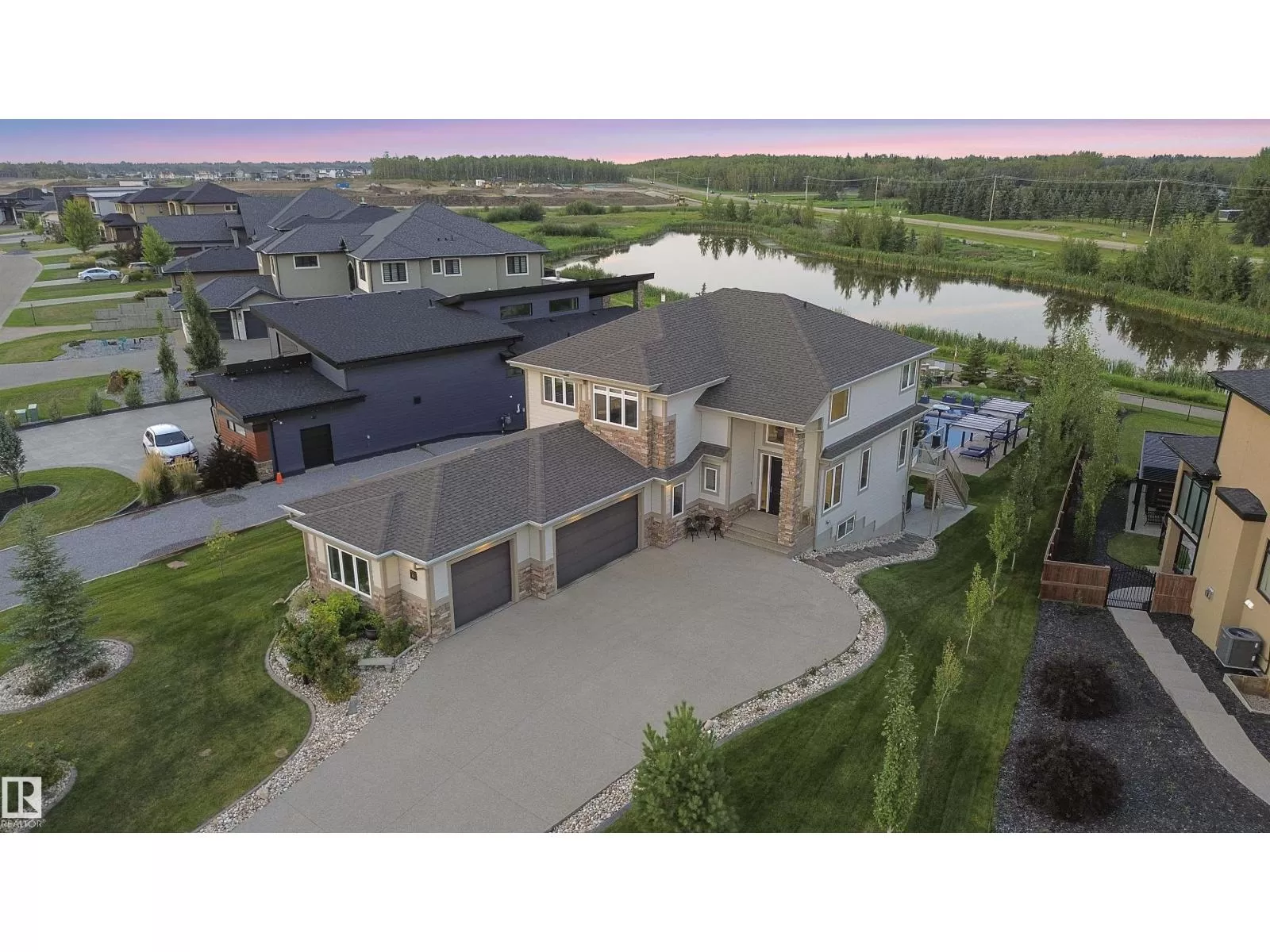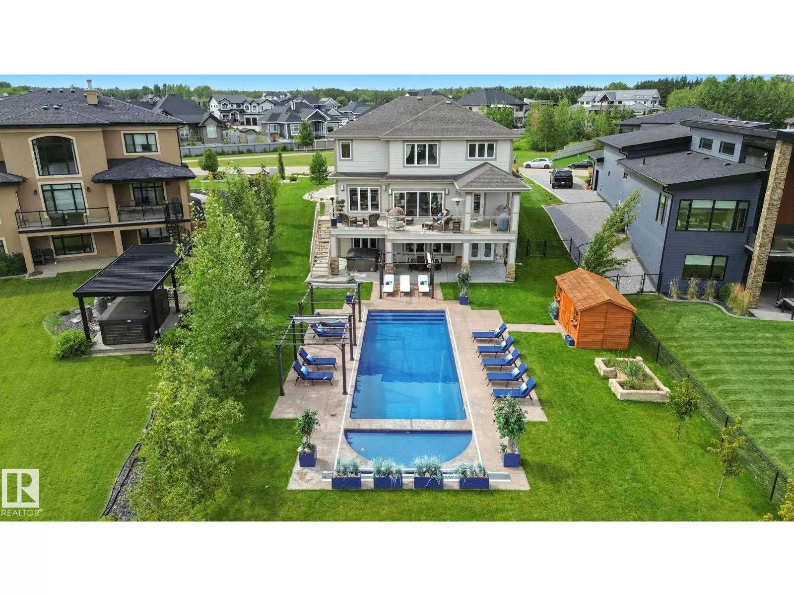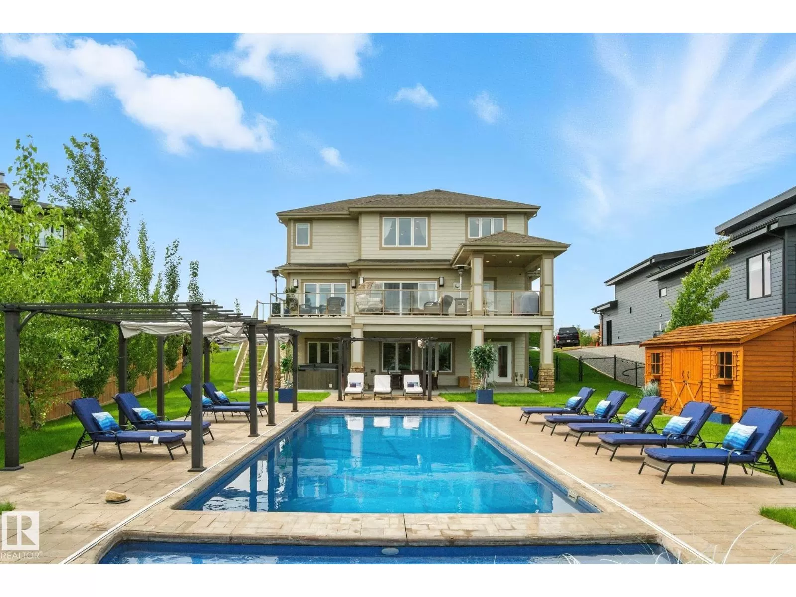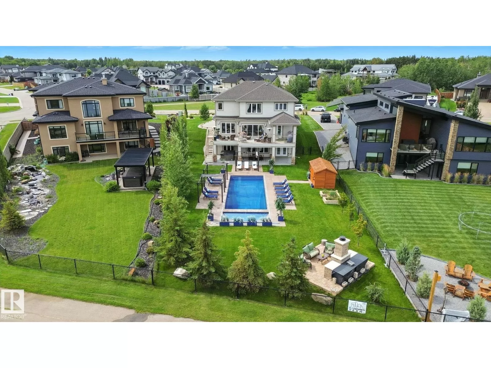 Live the Good Life in Meadowhawk! This executive property offers an absolutely spectacular backyard oasis with a glorious heated salt-water pool â your very own private resort!. Step inside the breathtaking grand entrance with bespoke features such as a stunning chandelier, open concept design with custom stonework, crown mouldings, hardwood floors. The opulent kitchen will be the envy of any chef! Boasting granite counters, elite appliances and an oversized walk-in pantry. The comfort continues as you discover the grand space of the upper levelâs flex room, convenient laundry room, Jack and Jill bedrooms, and the lavish primary retreat with a spa-like ensuite. The fully developed walk-out basement is flooded with an abundance of natural light, featuring 2 additional bedrooms, gym, dance studio, bar, & wine room. Enjoy lush greenery, and no rear neighboursâjust a tranquil pond. Don't miss out on this resort-style luxury living! Visit REALTOR® website for additional information. (id:27476)