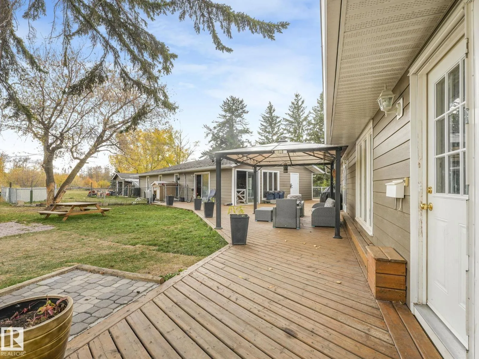 Less than 5 mins from Henday and Whitemud, Very well kept 5 Bedroom bungalow. Kitchen renovated with HICKORY WOOD, GRANITE COUNTERTOPS, LARGE ISLAND and tons of functional storage & counter space. Almost 5 ACRES! WALKING DISTANCE TO SHPK. Home has been upgraded inside and out. Large living room with separate sitting area looking out to the beautiful backyard area. DINING ROOM HAS ROOM FOR a LARGE TABLE and looks into the family room & living room. Off the dining room is a full length 2nd story deck looking to the gorgeous front yard. HARDWOOD AND CARPET FLOORS throughout the MAIN FLOOR ARE INCREDIBLE. Master is good size with an ensuite and a walkout patio door to the large deck. WALKOUT BASEMENT has 2 more bedrooms, large rumpus room, large hobby room, laundry room and a full bath. DOUBLE ATTACHED GARAGE PLUS AN EXTRA SINGLE CAR GARAGE in the back. Large 25â x 50â BUILDING connected by a tunnel to the house. Could be used as a large workshop, studio or storage. Truly a one of kind. (id:27476)