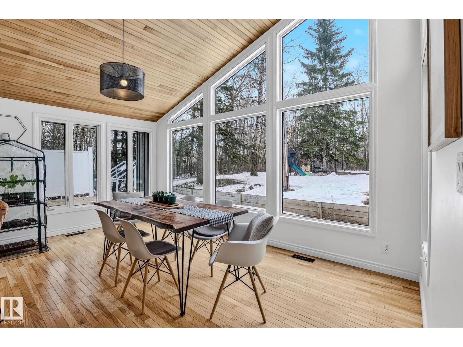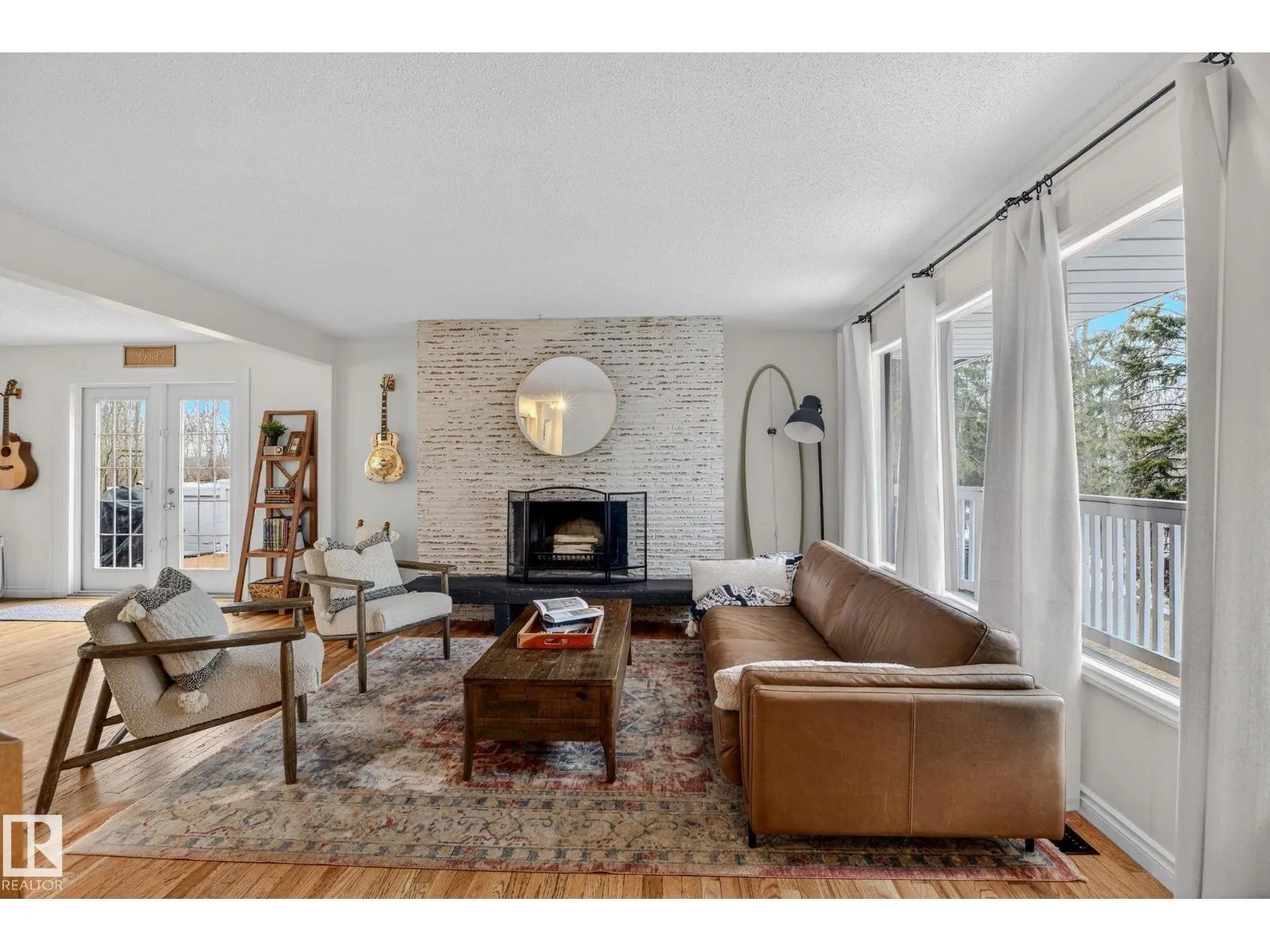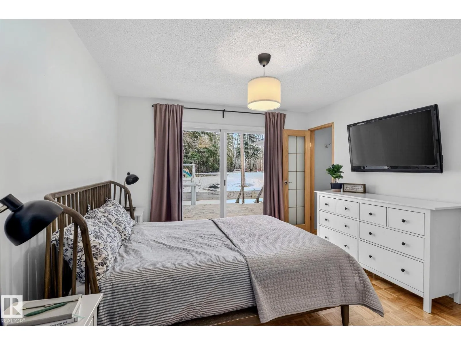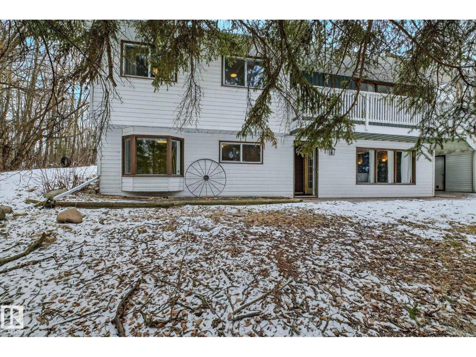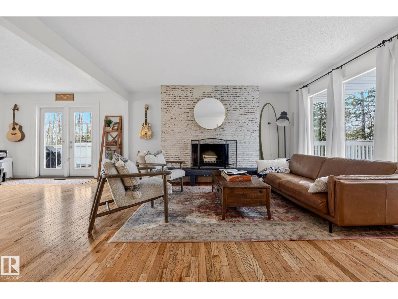 Escape the city to this beautiful 3 acre property, located just minutes from Sherwood Park. This beautiful walkout bungalow offers serene country living with quick access to the city and major highways. Inside, the home features a warm and inviting kitchen with classic oak cabinetry, stainless steel appliances, and a bright dining area highlighted by floor to ceiling windows. The main floor includes a spacious primary bedroom with an ensuite and direct access to a private patio- your quiet retreat. Two additional bedrooms and well appointed 3 piece bathroom complete the main level. The wrap-around deck is complete with natural gas hookup--perfect for outdoor entertaining. The fully finished walkout basement provides even more living space, featuring a cozy brick faced wood burning fireplace, an additional bedroom, bathroom and laundry room. Step out to your oversized heated double garage equipped with 220 volt power. Don't miss this rare opportunity as this property is PRICED TO SELL (id:27476)