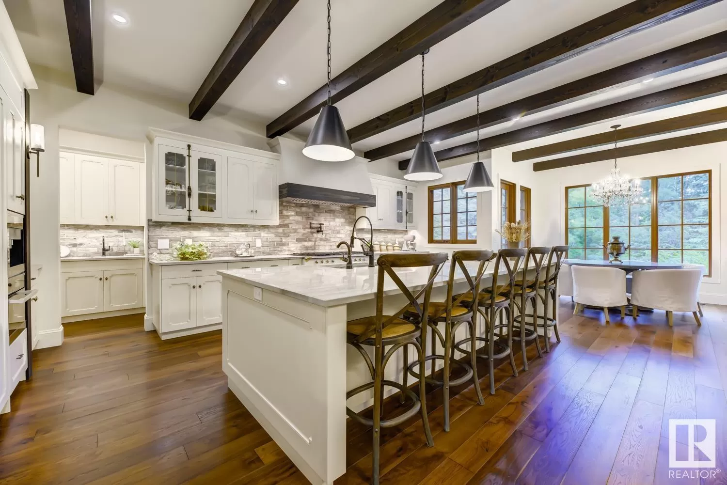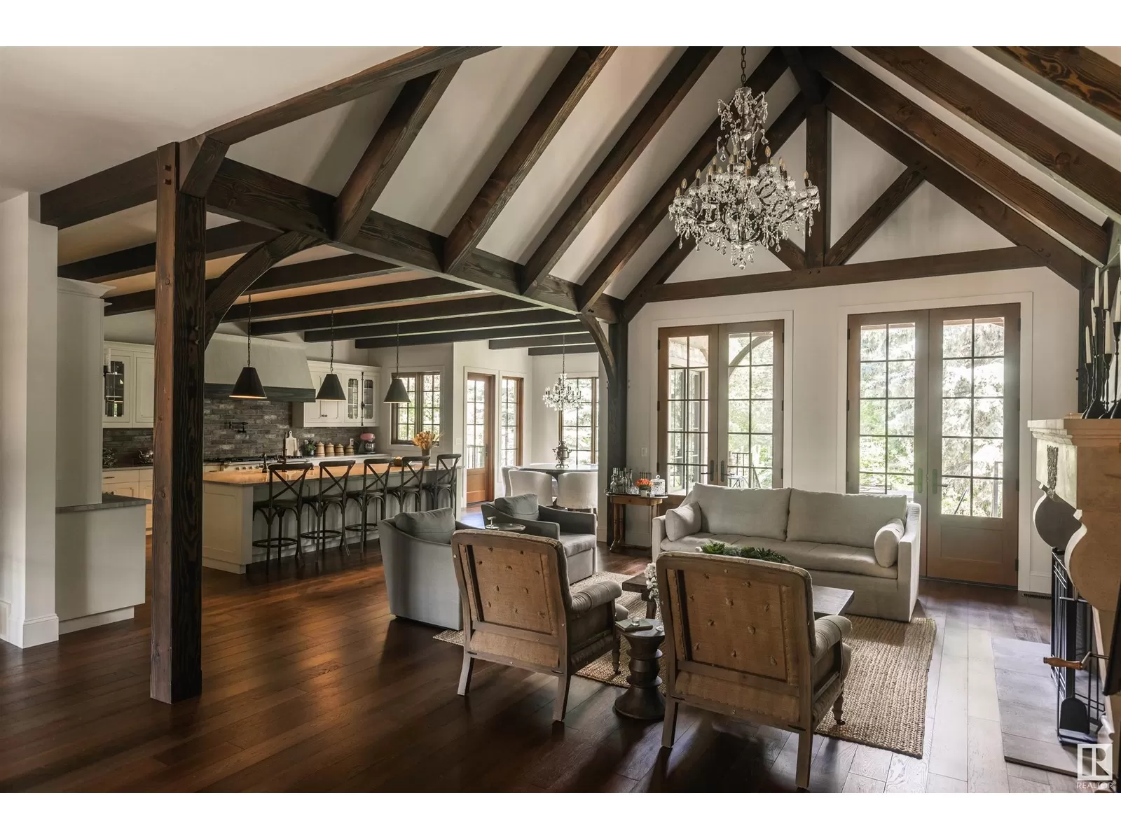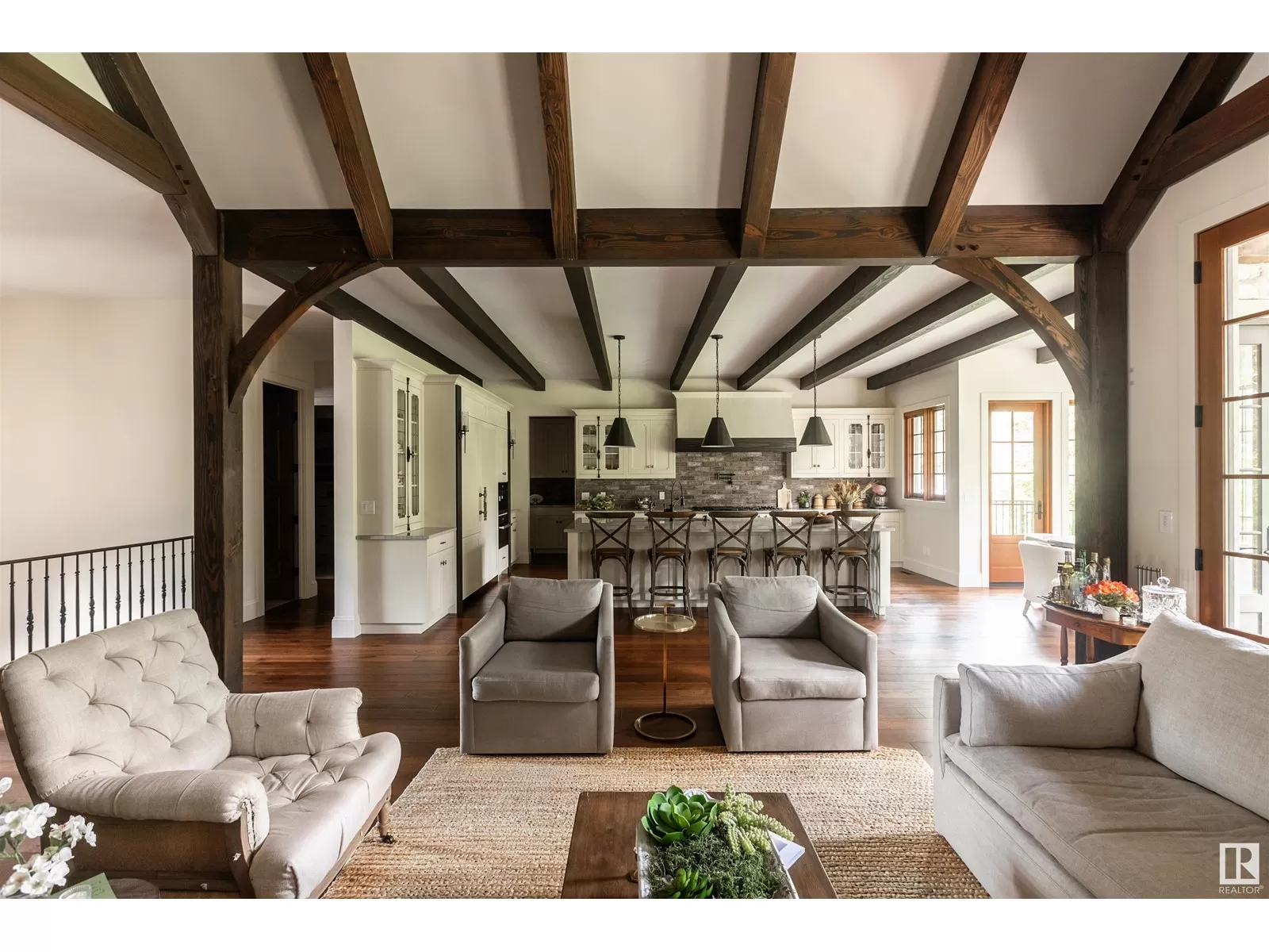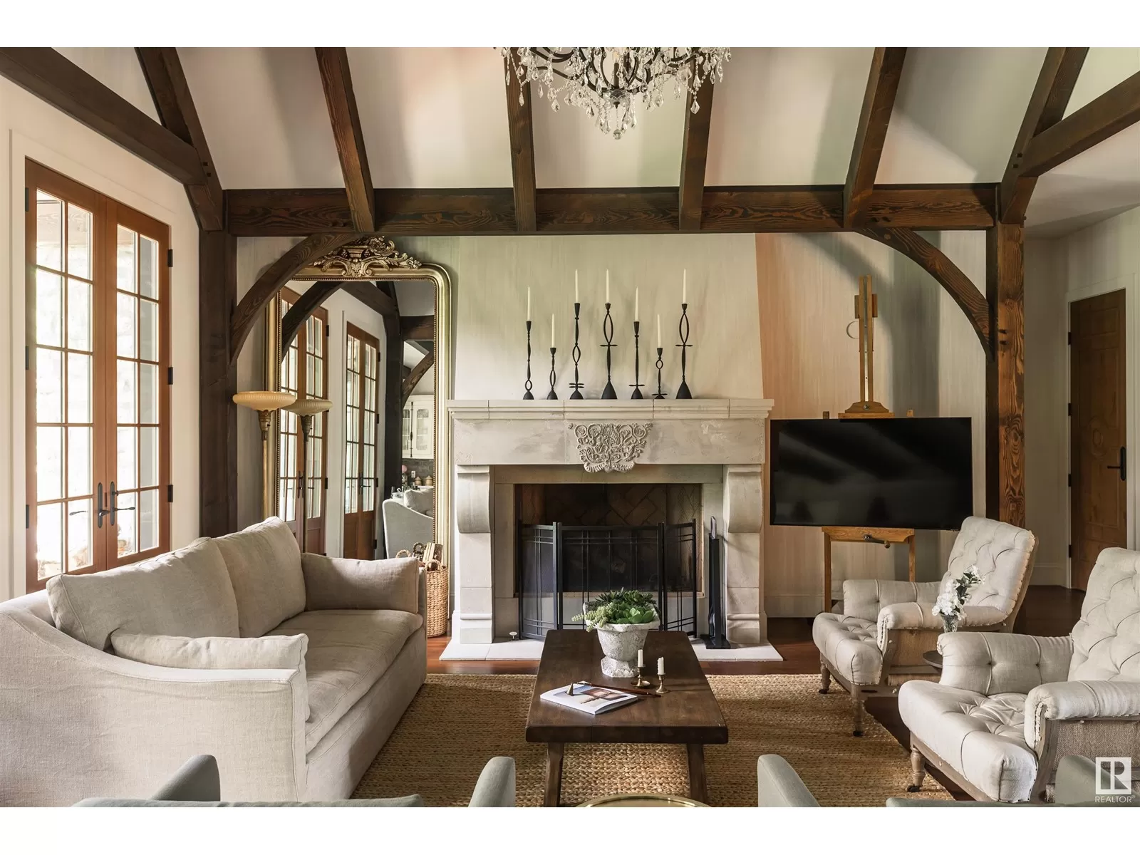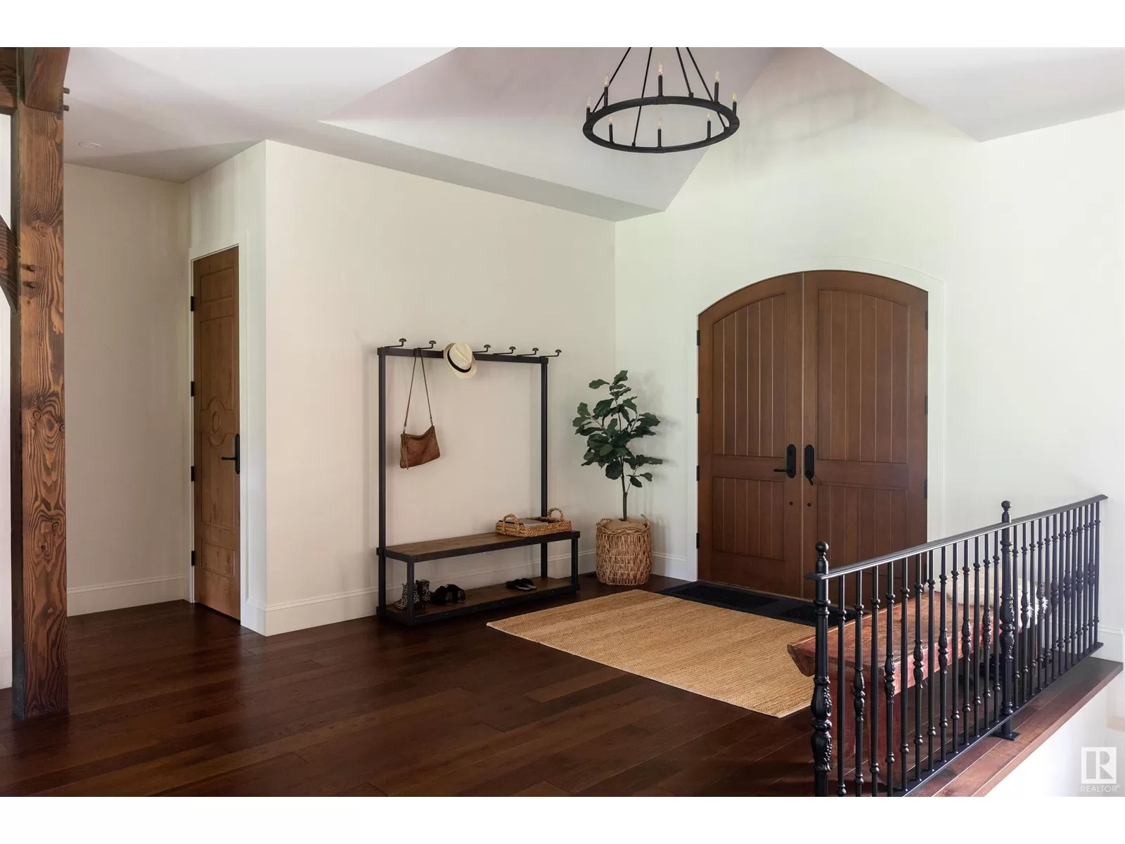 Reminiscent of the stone farmhouses of Burgundy France, experience elegant modern living paired w/ historical charm & exquisite European influence in a private, picturesque setting w/ this one-of-a-kind, executive estate bungalow, nestled on two meticulously landscaped acres in Sturgeon County, mere minutes from both Edmonton & St. Albert. Crafted by Heredity Homes & designed by Nadia Li of Go For Décor, this home blends historical charm w/ modern comfort. Exterior features include natural stone walls & Douglas Fir beams, while inside, smoked white oak floors, wrought iron details, & Belgian linen window treatments create a luxurious ambiance. A centerpiece wood-burning fireplace & vaulted ceilings add grandeur, complemented by a gourmet kitchen w/ Lacanche oven & Miele appliances. The primary suite offers a private deck & spa-like en-suite, while the finished basement feat. 2 bedrooms, sauna, media room, gym, & wet bar. Outside, a carriage house w/ living space & expansive views completes this property. (id:27476)