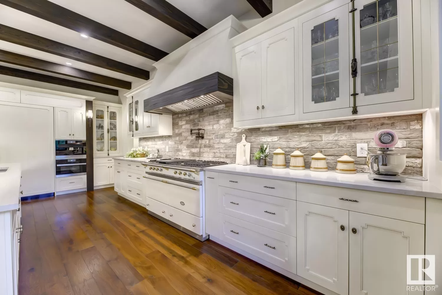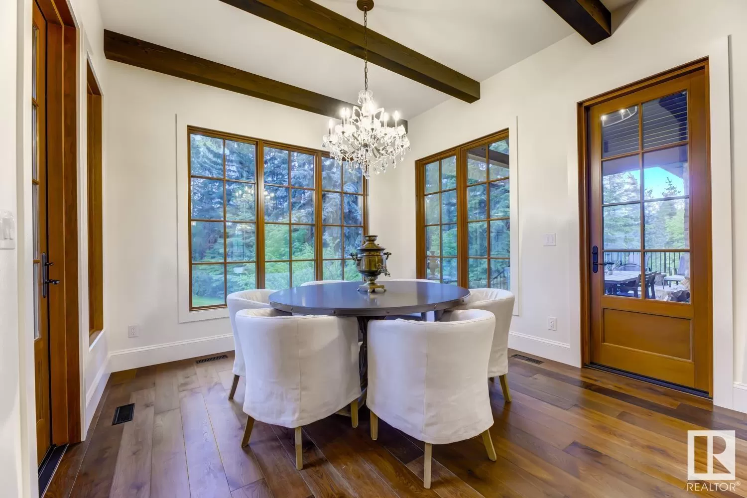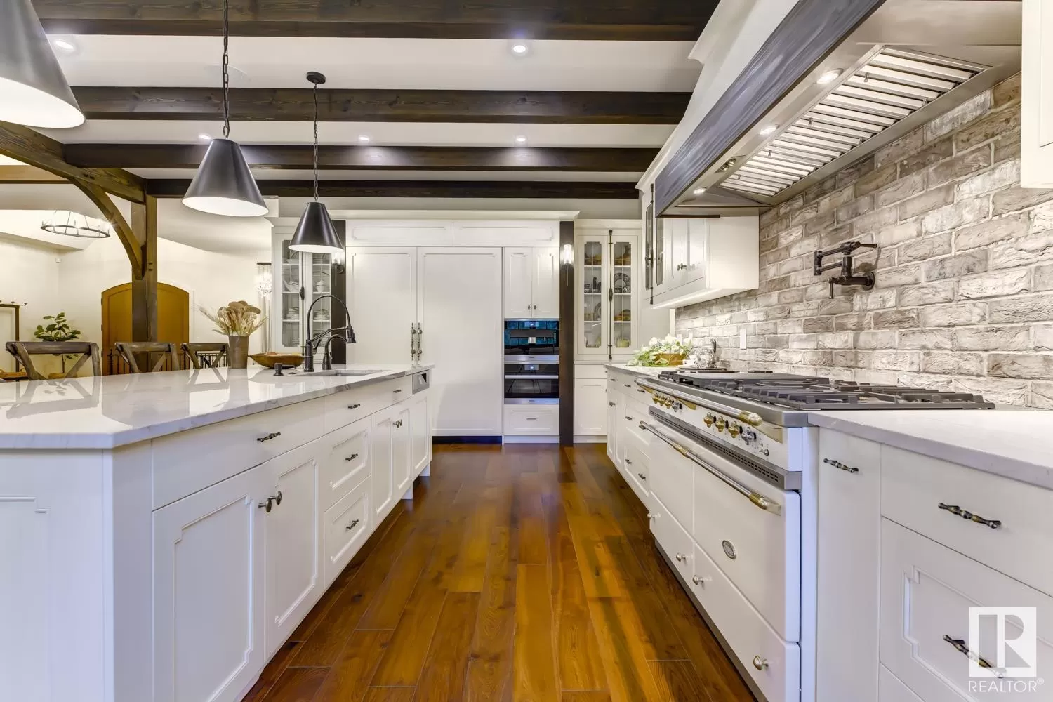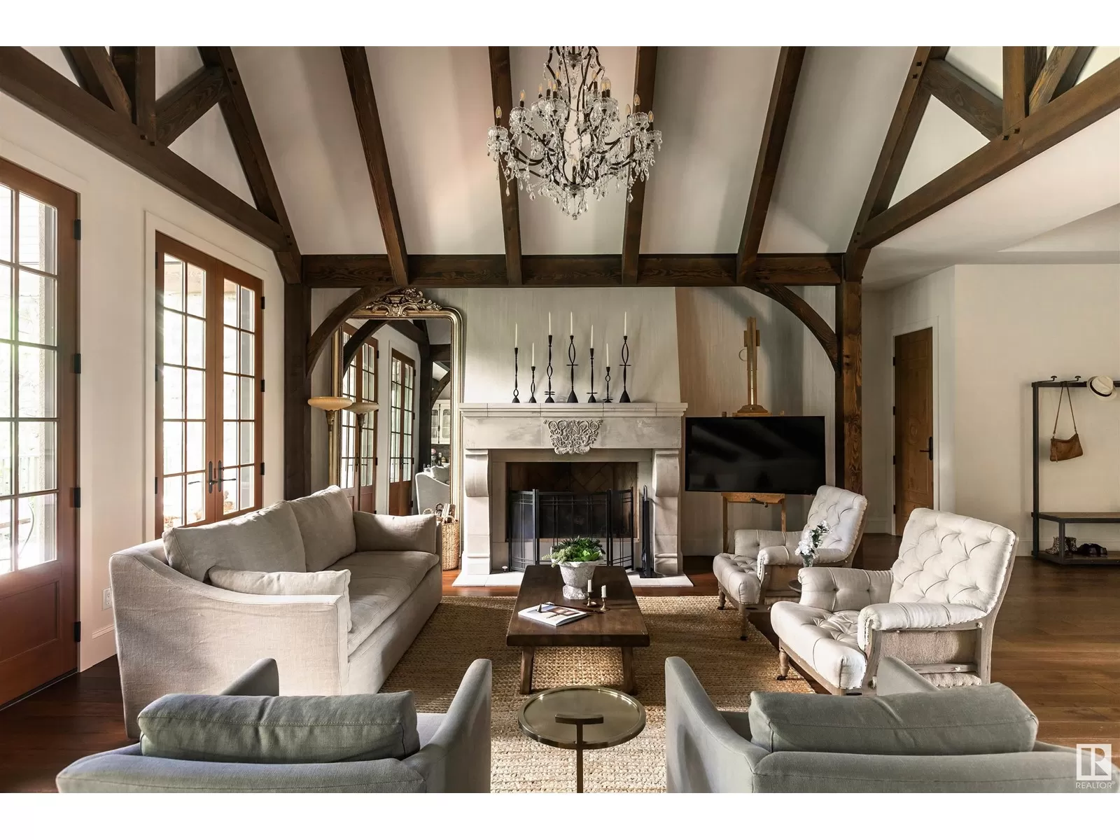 Reminiscent of the stone farmhouses of Burgundy France, experience elegant modern living paired w/ historical charm & exquisite European influence in a private, picturesque setting w/ this one-of-a-kind, executive estate bungalow, nestled on two meticulously landscaped acres in Sturgeon County, mere minutes from both Edmonton & St. Albert. Crafted by Heredity Homes & designed by Nadia Li of Go For Décor, this home blends historical charm w/ modern comfort. Exterior features include natural stone walls & Douglas Fir beams, while inside, smoked white oak floors, wrought iron details, & Belgian linen window treatments create a luxurious ambiance. A centerpiece wood-burning fireplace & vaulted ceilings add grandeur, complemented by a gourmet kitchen w/ Lacanche oven & Miele appliances. The primary suite offers a private deck & spa-like en-suite, while the finished basement feat. 2 bedrooms, sauna, media room, gym, & wet bar. Outside, a carriage house w/ living space & expansive views completes this property. (id:27476)
