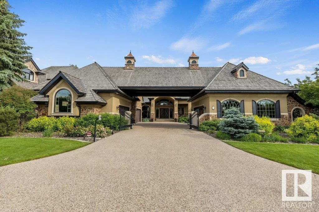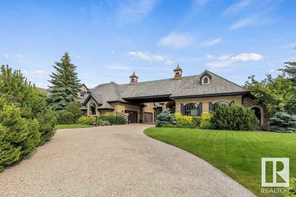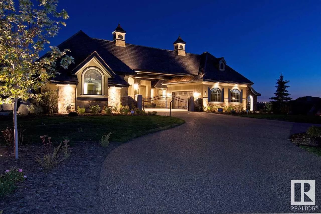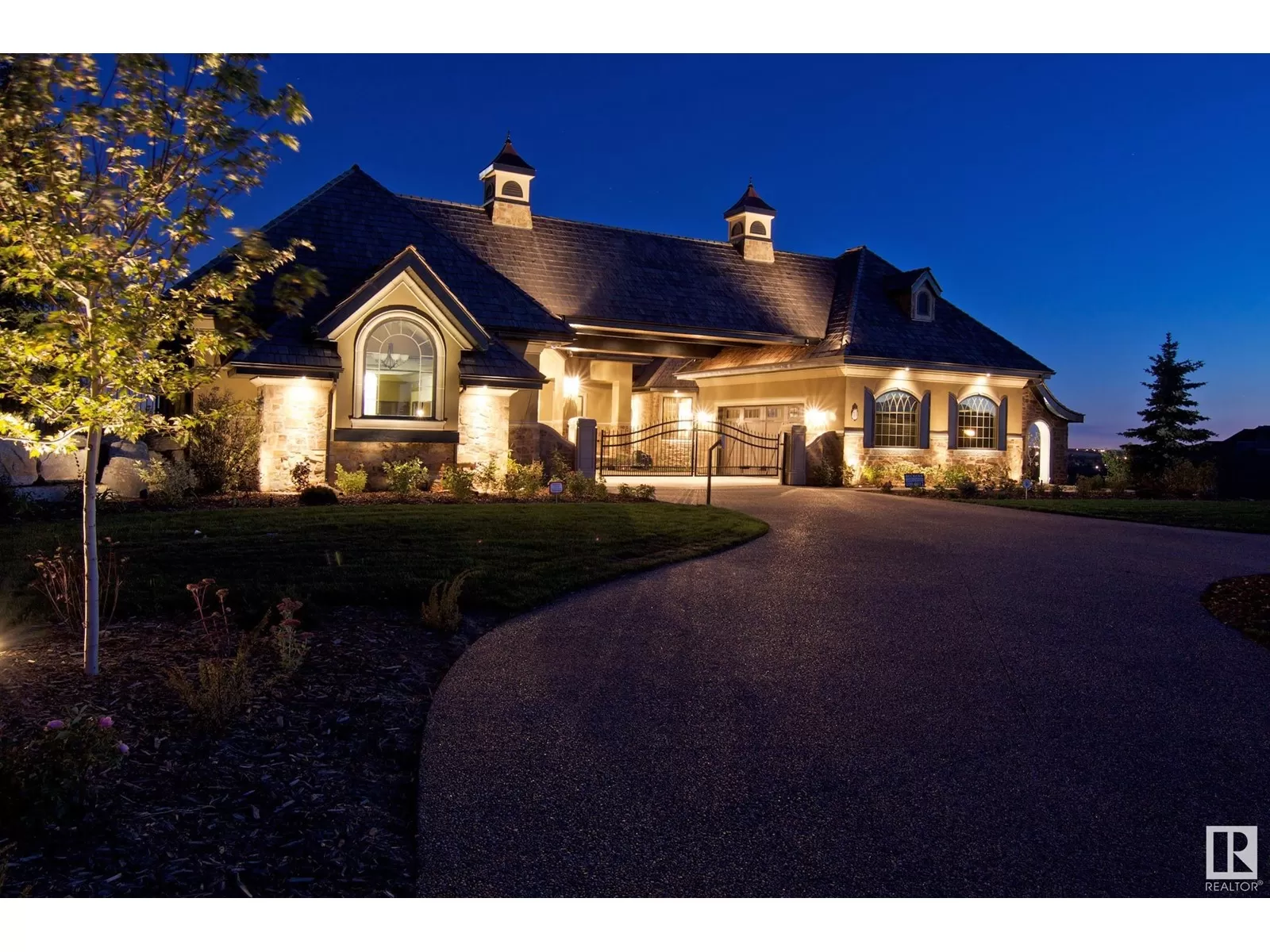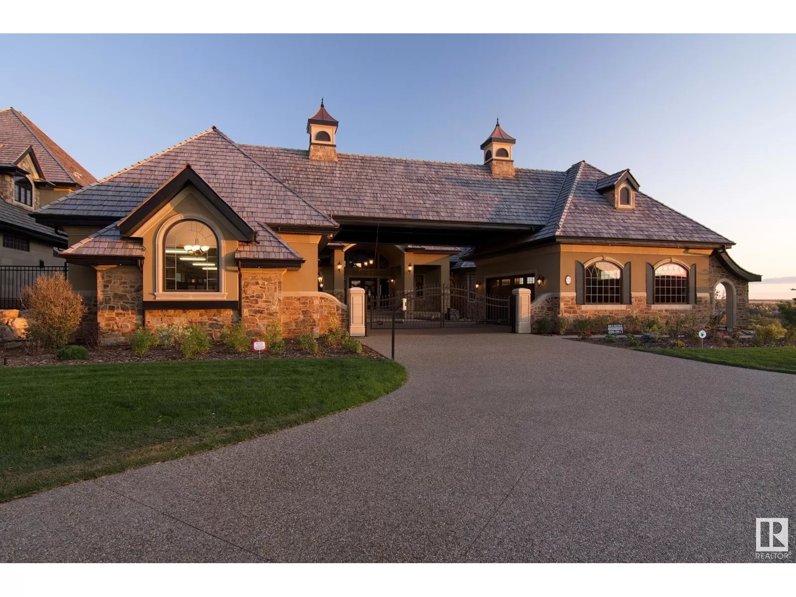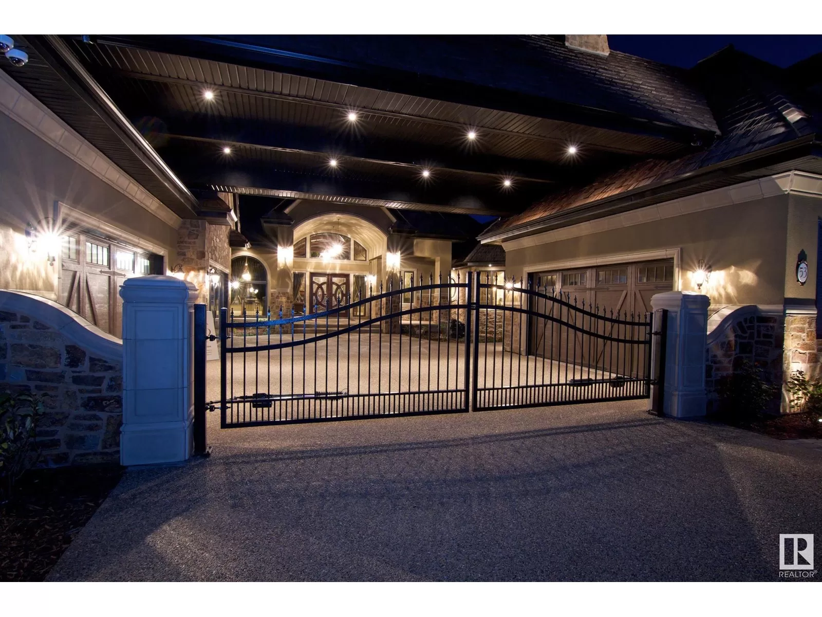 This STUNNING, Audie Benson Estate Homes show home is the grandest of the grand! 7100 sq ft of luxury living on 0.72 acres of gorgeous river valley views in prestigious Riverstone Pointe, minutes out of St. Albert & to the Anthony Henday. The curb appeal is unsurpassed with drive through portico, natural iron stone, copper chimneys & capolas & iron security gate. Step across the threshold into an elegant foyer w/views of the Great Room, boasting 20' open vaulted cherry ceilings, an exquisite formal dining room & music room, wall-to-wall & floor to ceiling library complete with sliding ladder. The den is perfectly situated off the luxurious master suite & library. This magnificent walkout bungalow boasts awards for best kitchen & best ensuite in North America. Main floor access to the south backing upper patio, with views of double waterfalls, bridges & rose gardens. The lower level includes a gathering room, games room, theatre, old world wine cellar, fitness room w/massage area, and SO MUCH MORE! (id:27476)