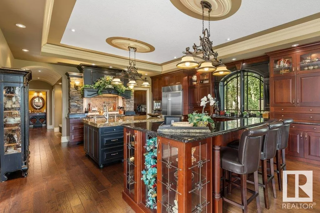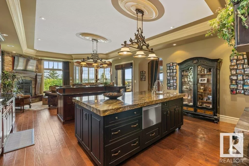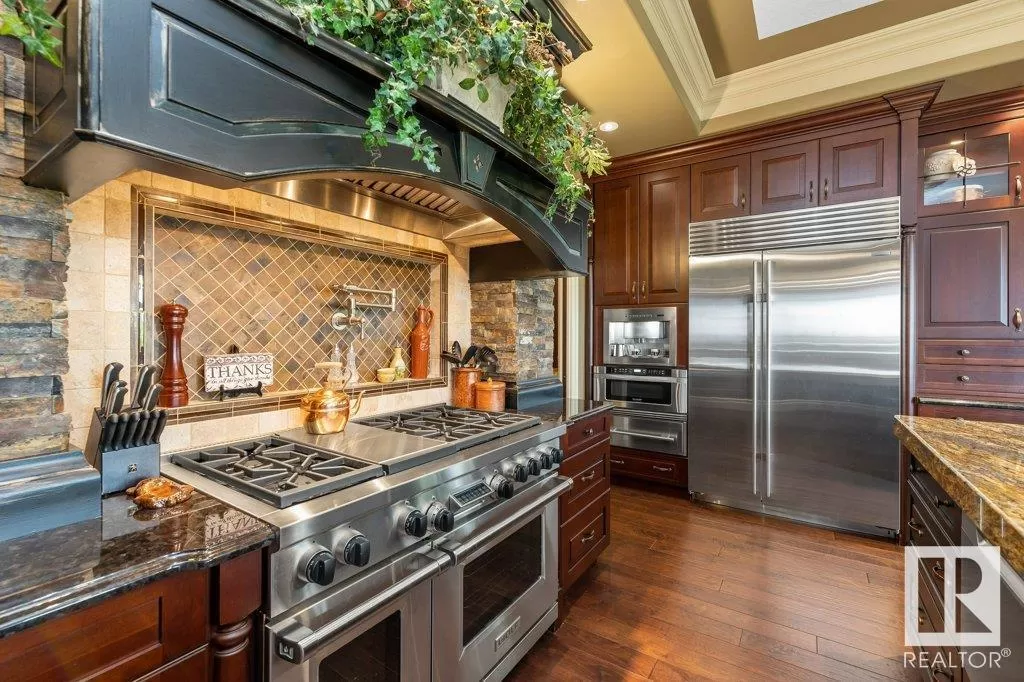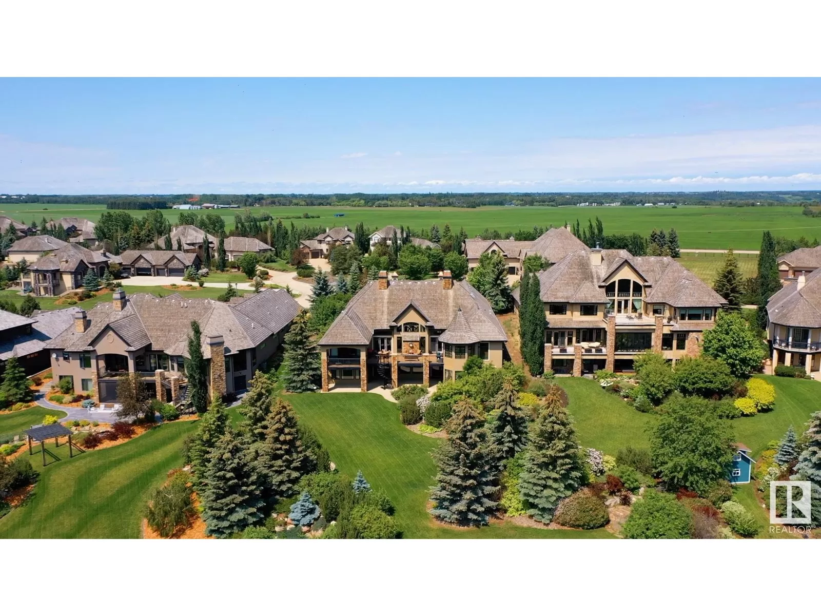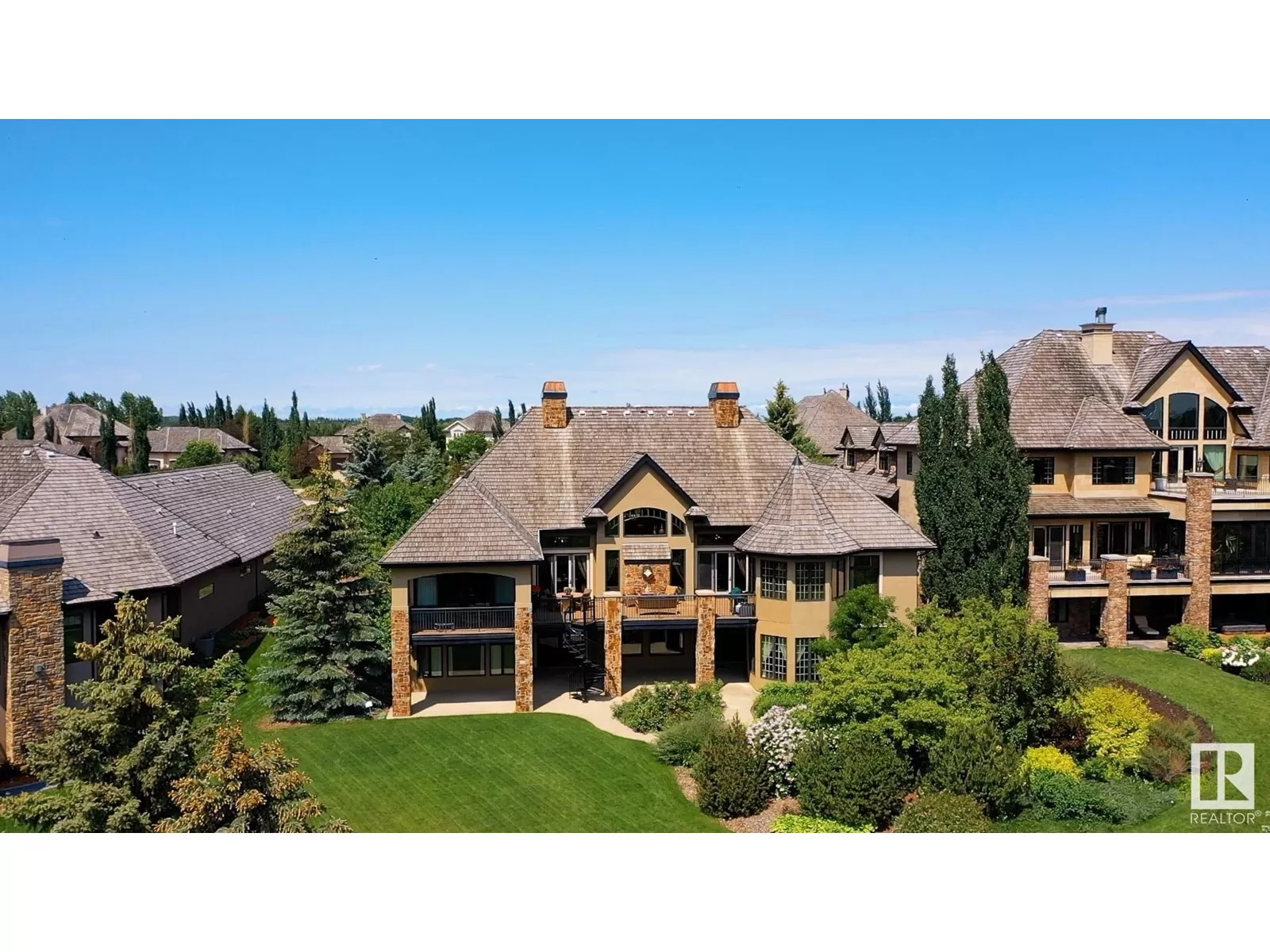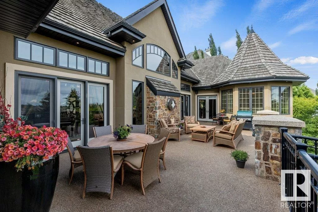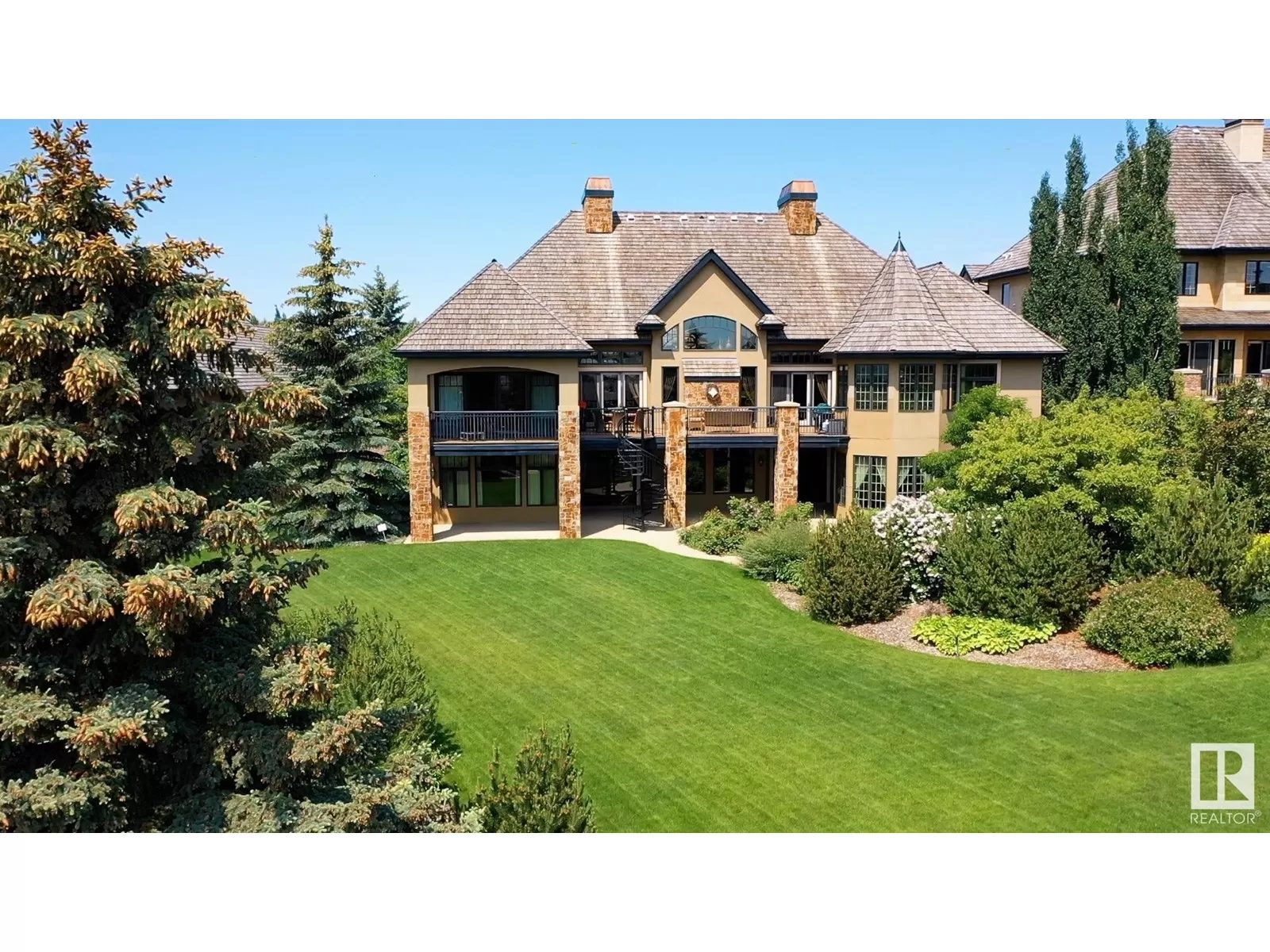 This STUNNING, Audie Benson Estate Homes show home is the grandest of the grand! 7100 sq ft of luxury living on 0.72 acres of gorgeous river valley views in prestigious Riverstone Pointe, minutes out of St. Albert & to the Anthony Henday. The curb appeal is unsurpassed with drive through portico, natural iron stone, copper chimneys & capolas & iron security gate. Step across the threshold into an elegant foyer w/views of the Great Room, boasting 20' open vaulted cherry ceilings, an exquisite formal dining room & music room, wall-to-wall & floor to ceiling library complete with sliding ladder. The den is perfectly situated off the luxurious master suite & library. This magnificent walkout bungalow boasts awards for best kitchen & best ensuite in North America. Main floor access to the south backing upper patio, with views of double waterfalls, bridges & rose gardens. The lower level includes a gathering room, games room, theatre, old world wine cellar, fitness room w/massage area, and SO MUCH MORE! (id:27476)