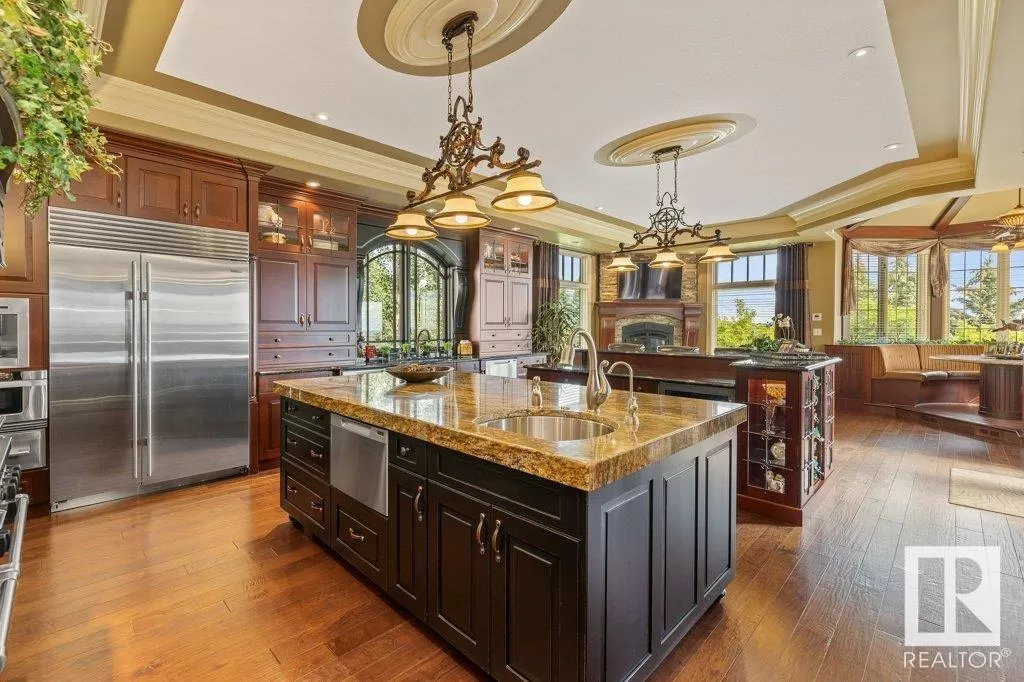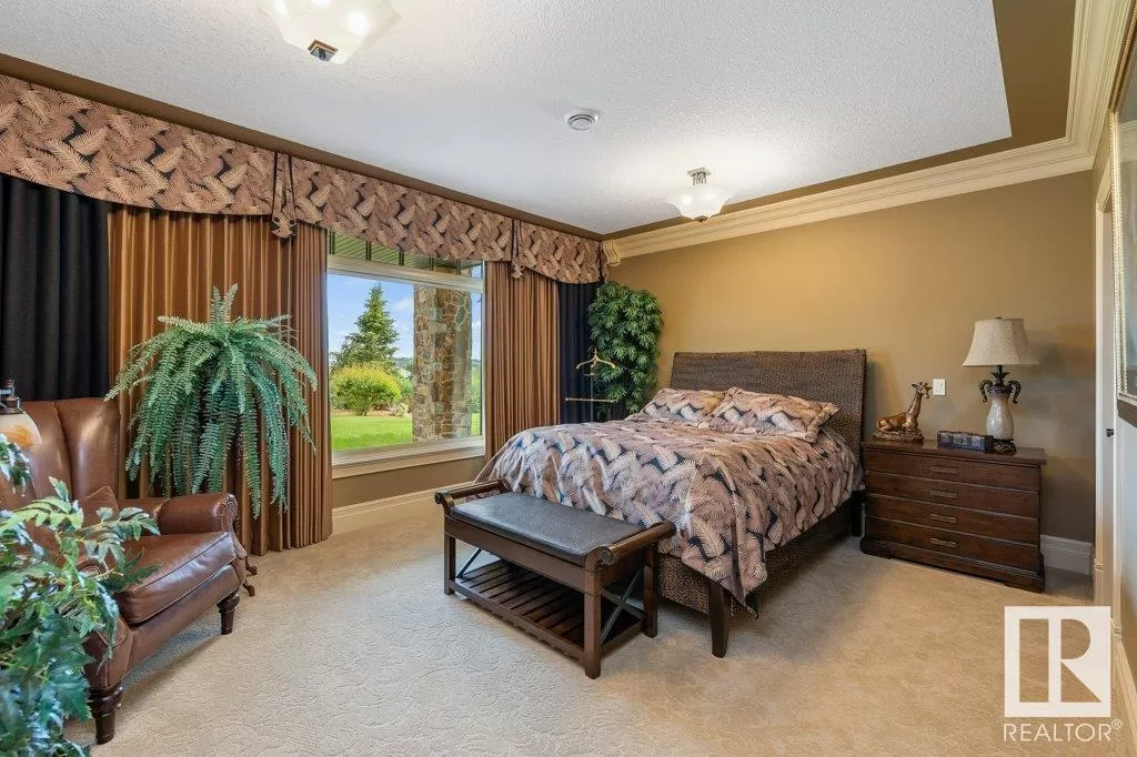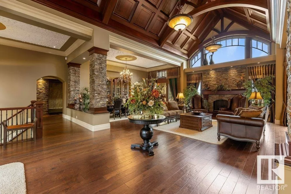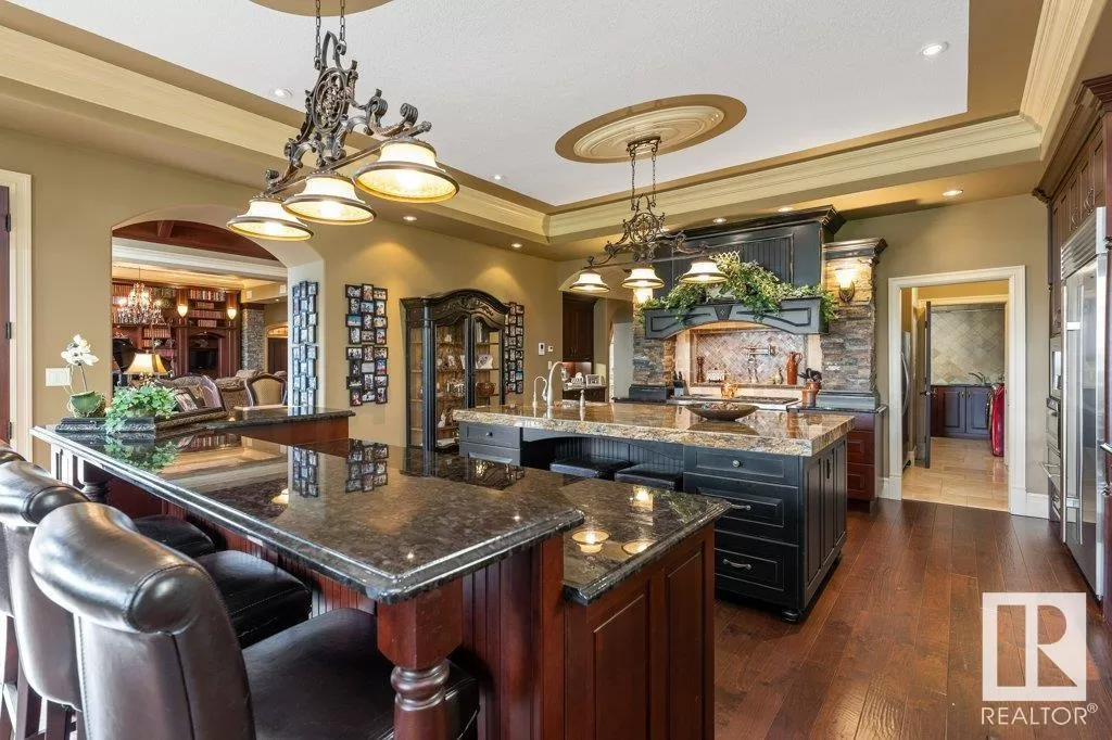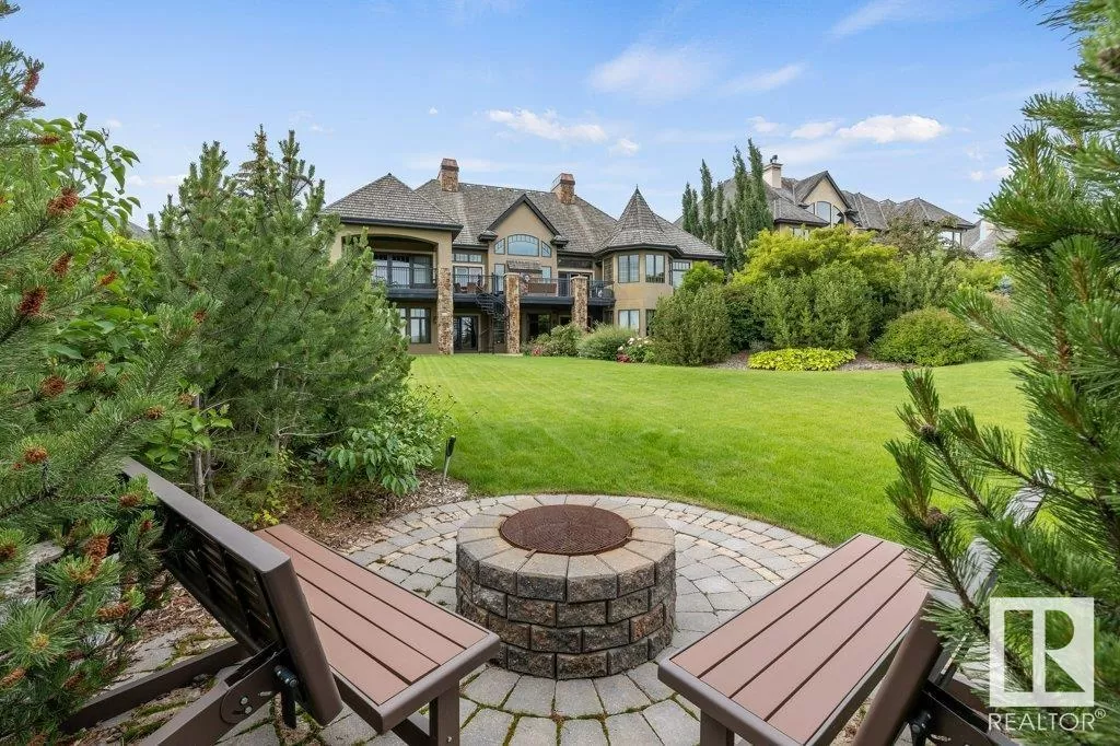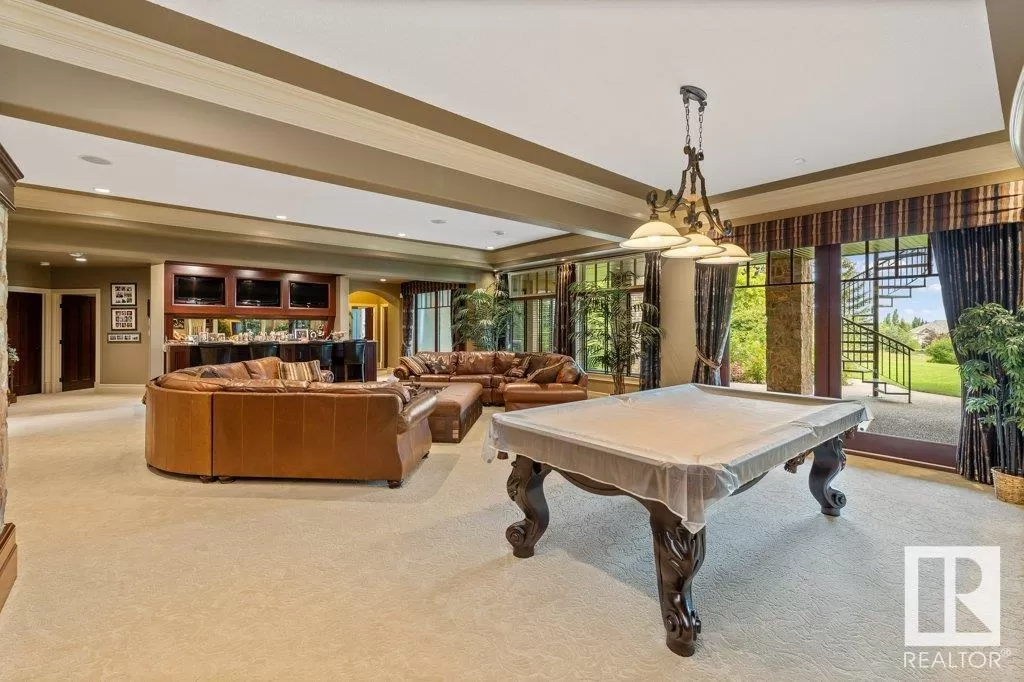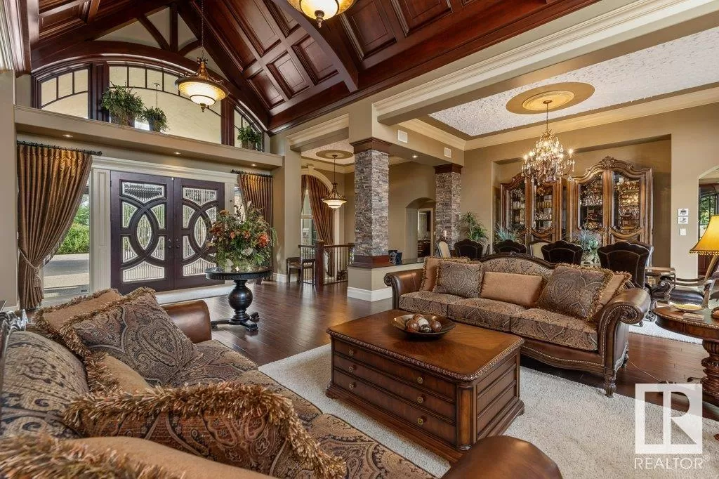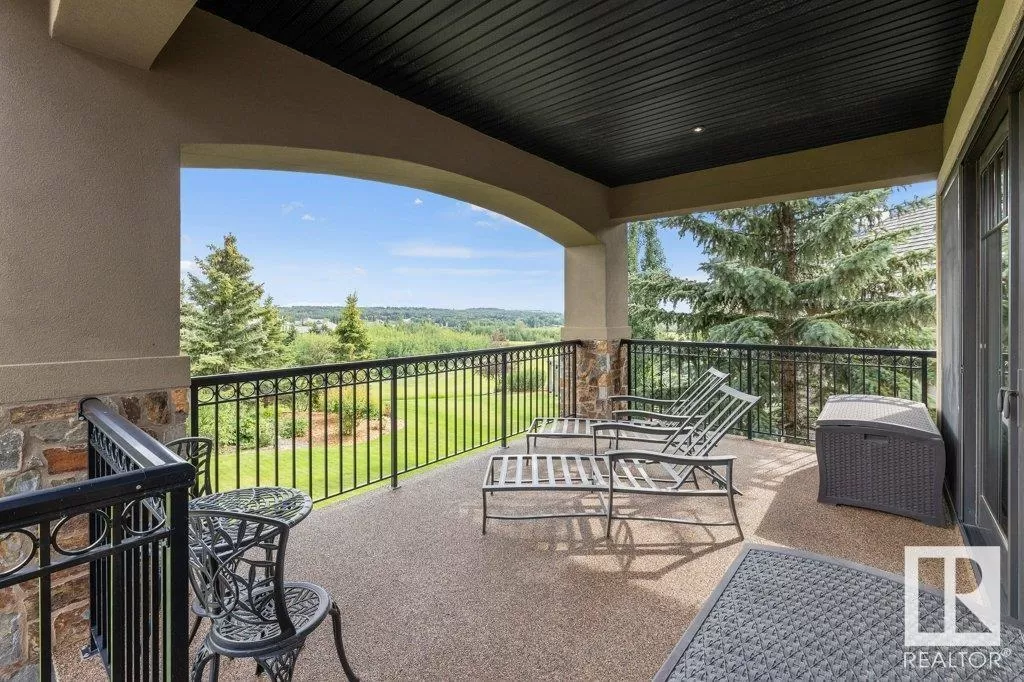 This STUNNING, Audie Benson Estate Homes show home is the grandest of the grand! 7100 sq ft of luxury living on 0.72 acres of gorgeous river valley views in prestigious Riverstone Pointe, minutes out of St. Albert & to the Anthony Henday. The curb appeal is unsurpassed with drive through portico, natural iron stone, copper chimneys & capolas & iron security gate. Step across the threshold into an elegant foyer w/views of the Great Room, boasting 20' open vaulted cherry ceilings, an exquisite formal dining room & music room, wall-to-wall & floor to ceiling library complete with sliding ladder. The den is perfectly situated off the luxurious master suite & library. This magnificent walkout bungalow boasts awards for best kitchen & best ensuite in North America. Main floor access to the south backing upper patio, with views of double waterfalls, bridges & rose gardens. The lower level includes a gathering room, games room, theatre, old world wine cellar, fitness room w/massage area, and SO MUCH MORE! (id:27476)