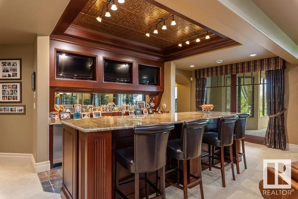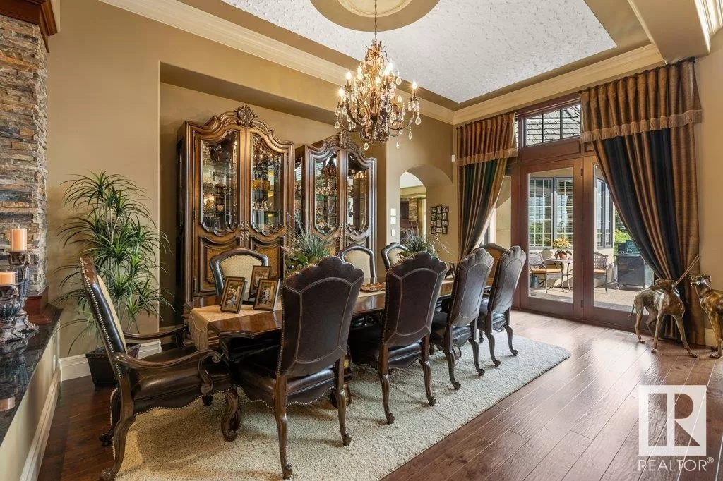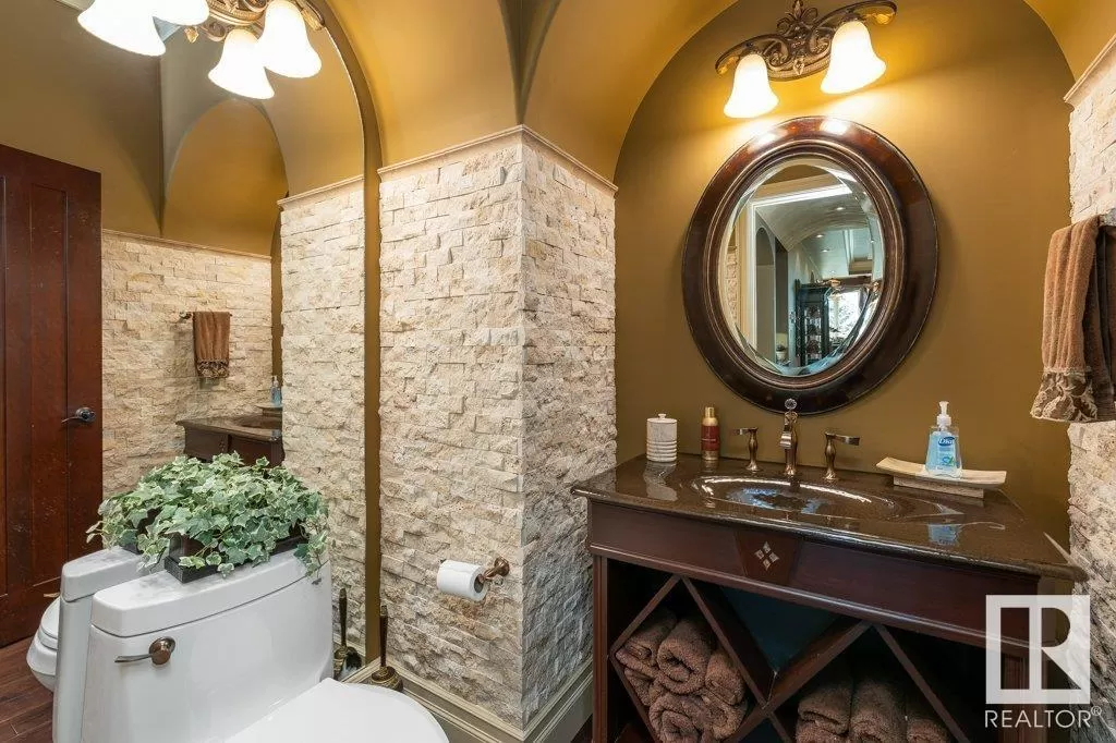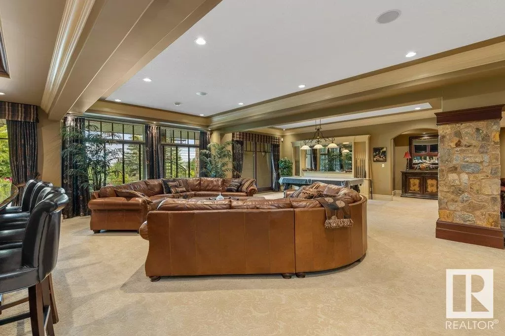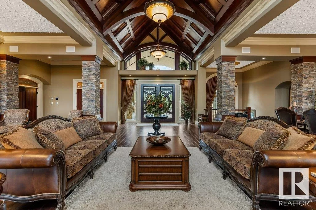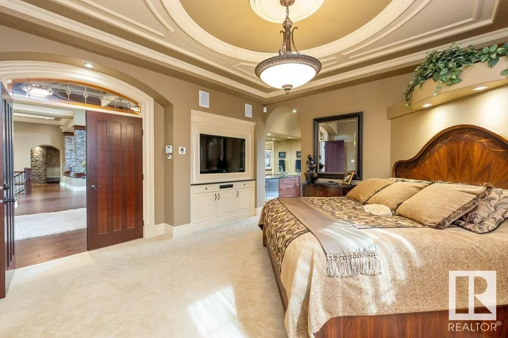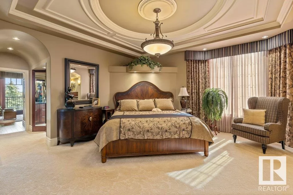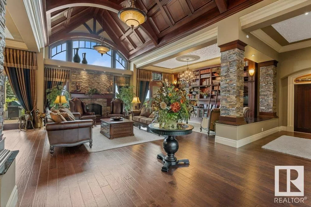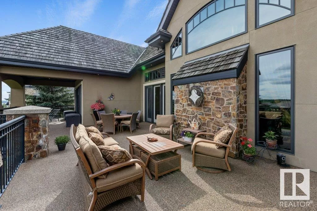This STUNNING, Audie Benson Estate Homes show home is the grandest of the grand! 7100 sq ft of luxury living on 0.72 acres of gorgeous river valley views in prestigious Riverstone Pointe, minutes out of St. Albert & to the Anthony Henday. The curb appeal is unsurpassed with drive through portico, natural iron stone, copper chimneys & capolas & iron security gate. Step across the threshold into an elegant foyer w/views of the Great Room, boasting 20' open vaulted cherry ceilings, an exquisite formal dining room & music room, wall-to-wall & floor to ceiling library complete with sliding ladder. The den is perfectly situated off the luxurious master suite & library. This magnificent walkout bungalow boasts awards for best kitchen & best ensuite in North America. Main floor access to the south backing upper patio, with views of double waterfalls, bridges & rose gardens. The lower level includes a gathering room, games room, theatre, old world wine cellar, fitness room w/massage area, and SO MUCH MORE! (id:27476)