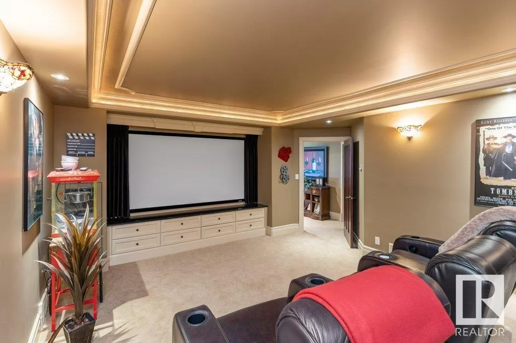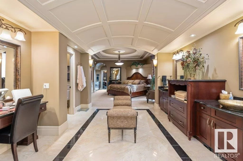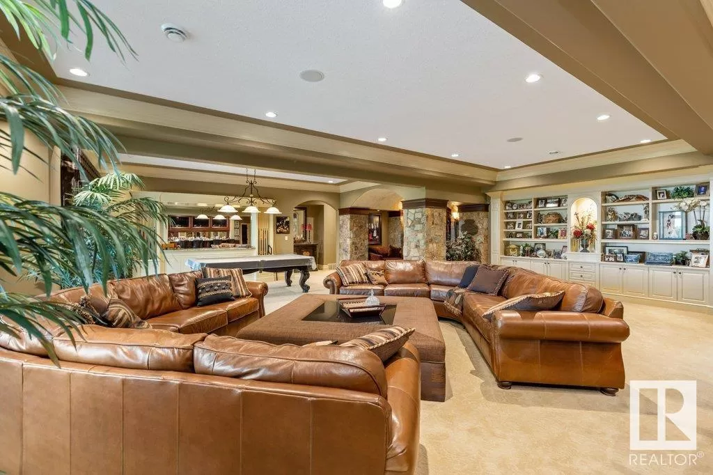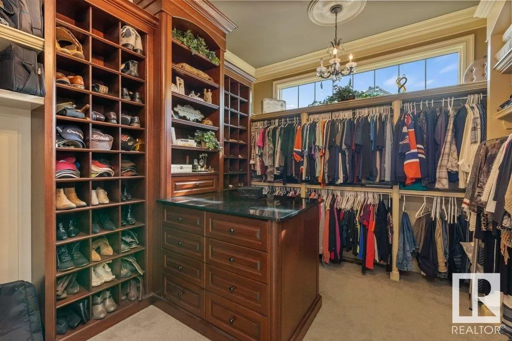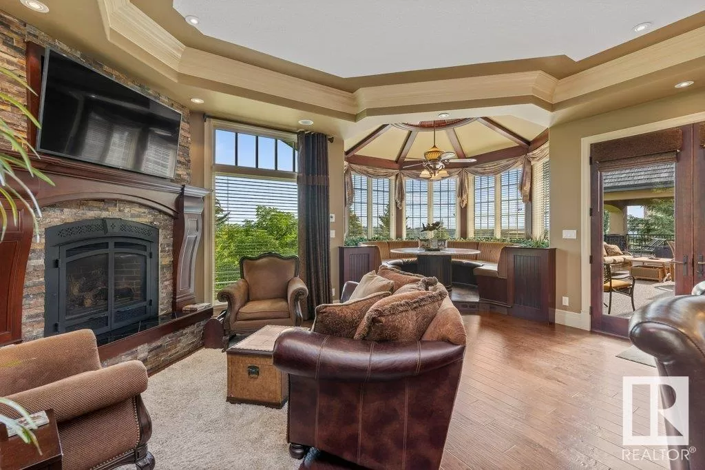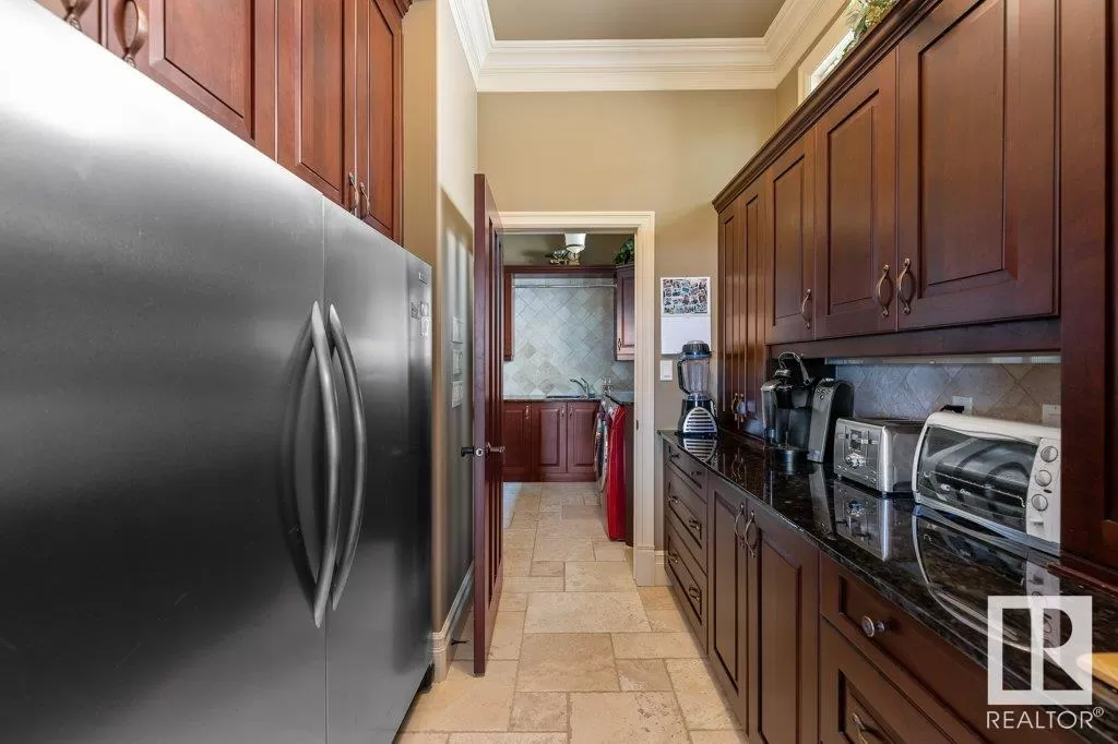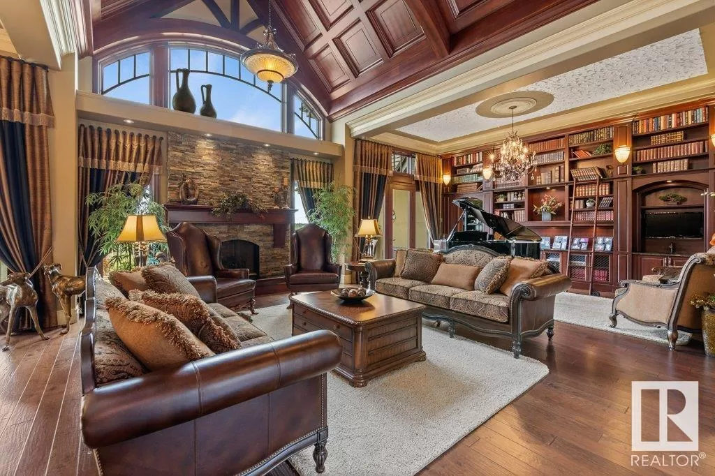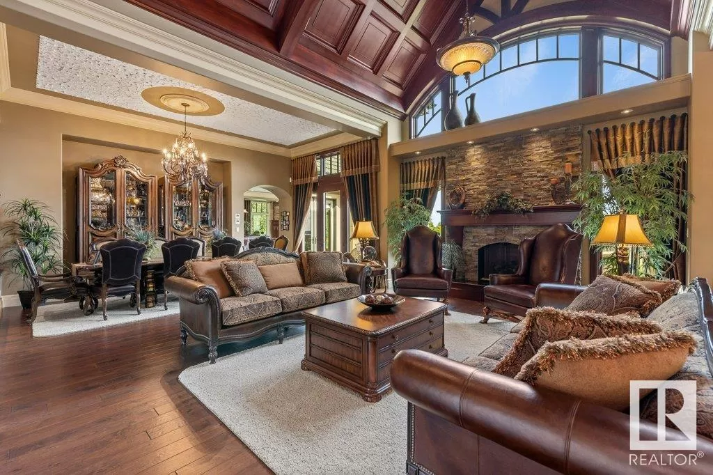 This STUNNING, Audie Benson Estate Homes show home is the grandest of the grand! 7100 sq ft of luxury living on 0.72 acres of gorgeous river valley views in prestigious Riverstone Pointe, minutes out of St. Albert & to the Anthony Henday. The curb appeal is unsurpassed with drive through portico, natural iron stone, copper chimneys & capolas & iron security gate. Step across the threshold into an elegant foyer w/views of the Great Room, boasting 20' open vaulted cherry ceilings, an exquisite formal dining room & music room, wall-to-wall & floor to ceiling library complete with sliding ladder. The den is perfectly situated off the luxurious master suite & library. This magnificent walkout bungalow boasts awards for best kitchen & best ensuite in North America. Main floor access to the south backing upper patio, with views of double waterfalls, bridges & rose gardens. The lower level includes a gathering room, games room, theatre, old world wine cellar, fitness room w/massage area, and SO MUCH MORE! (id:27476)