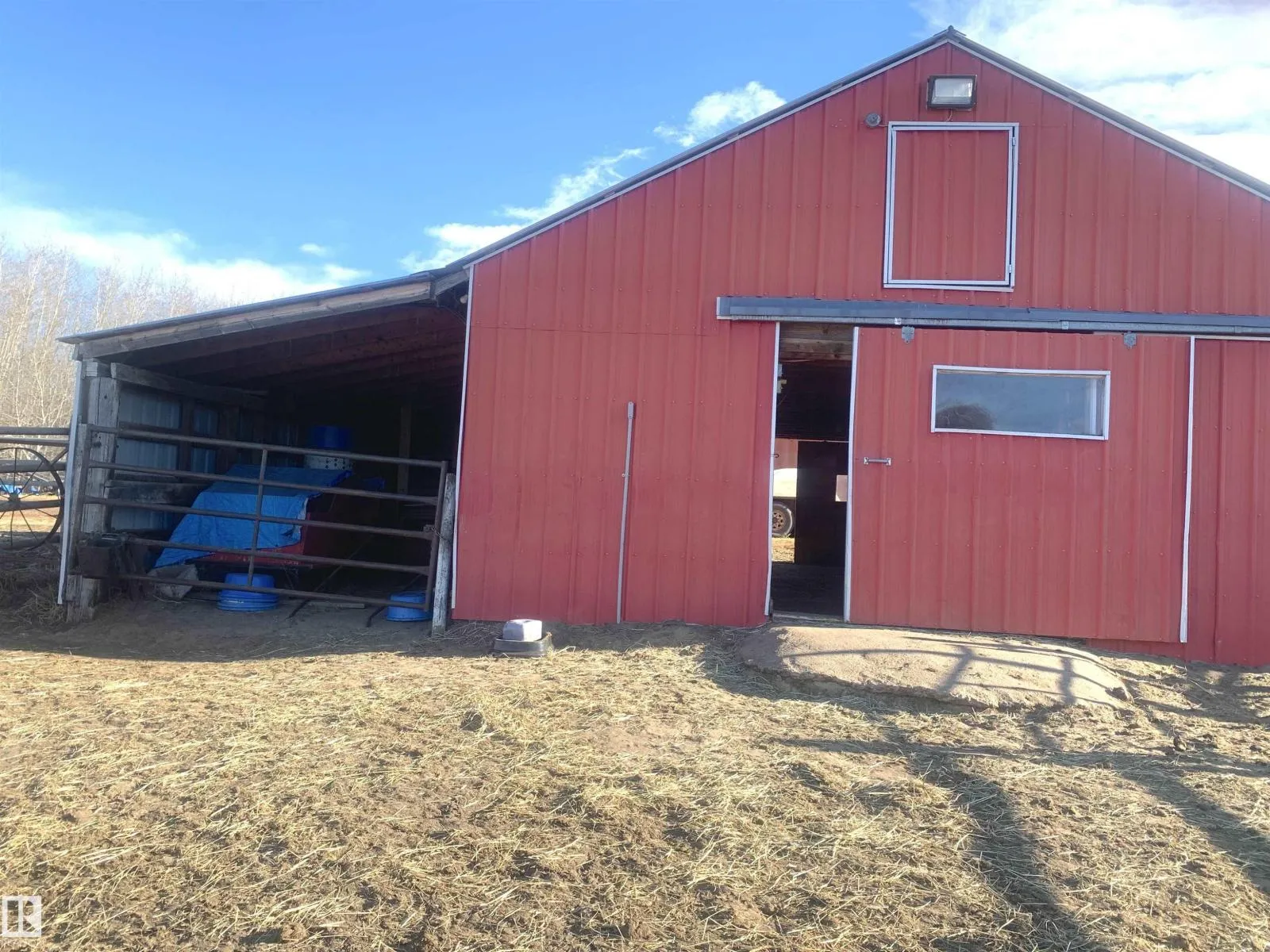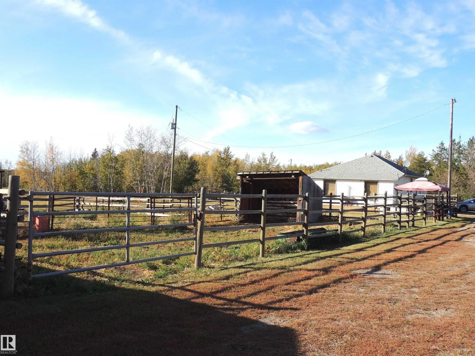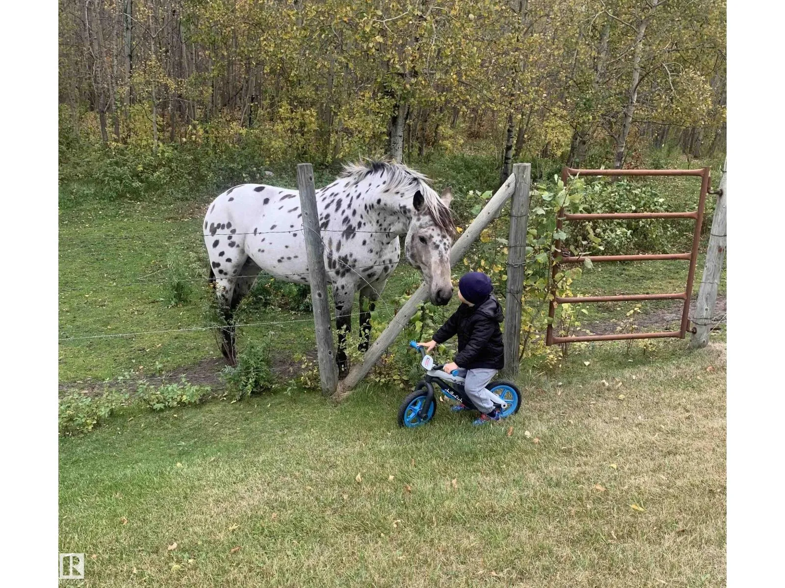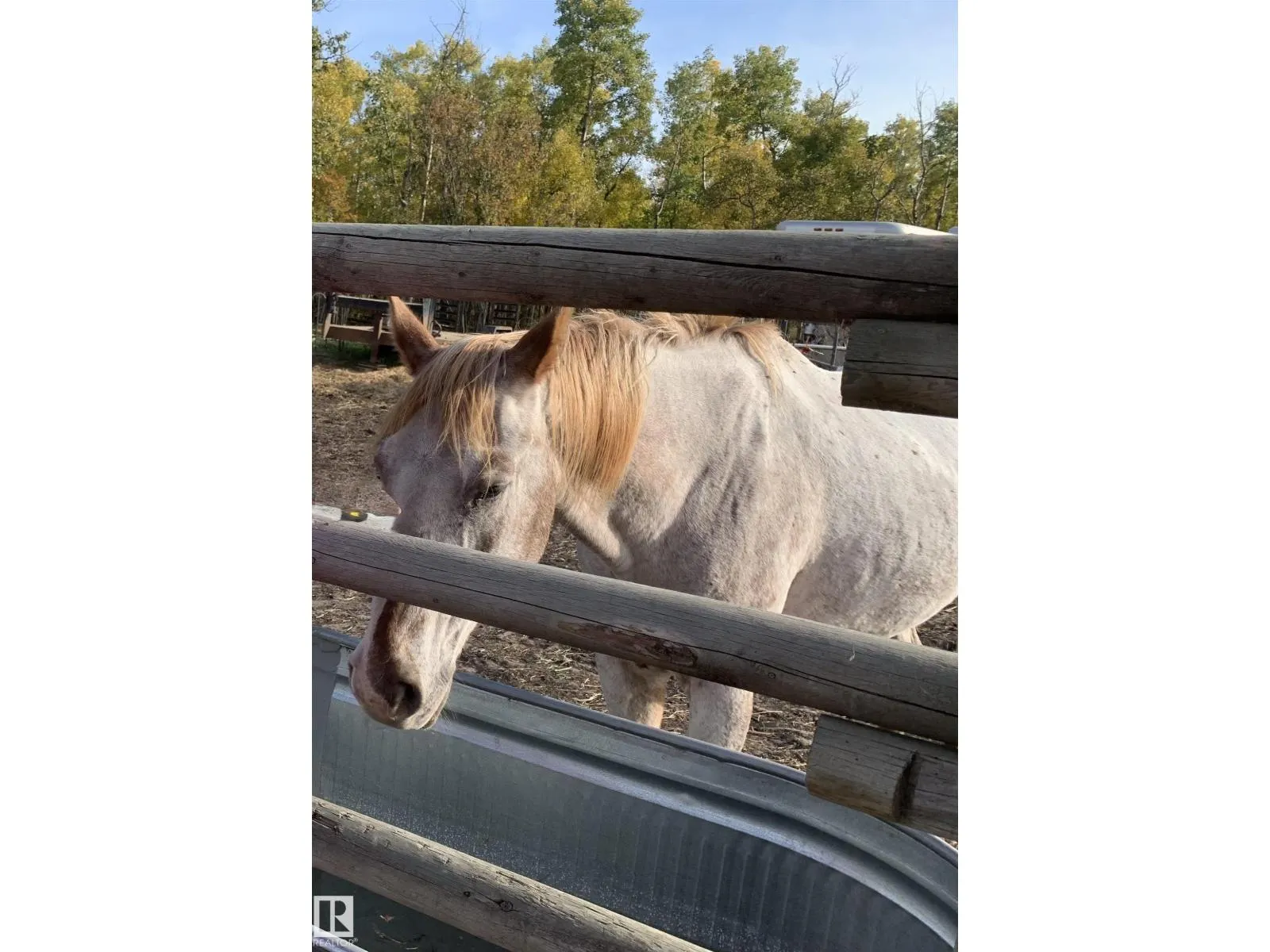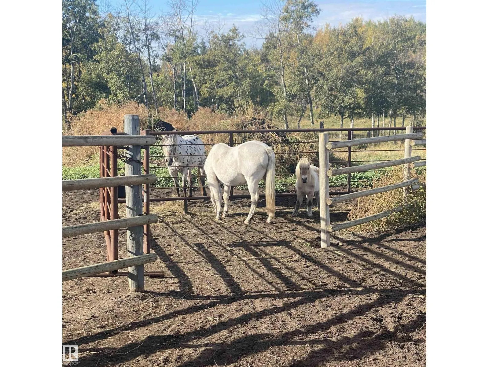 Get your horses ready for their new home on 10.2 acres in Austin Acres. Located just 12 km north of Gibbons, this property is set up with cross fencing, outdoor riding arena, red barn with metal roof/siding, 4 stalls, tack room and loft for hay, new water hydrant and watering bowl. Enter this 1200+sq ft country home and find a freshly painted mud room. A couple steps up is the kitchen with white cabinets, stainless appliances, corian counters and a cozy eating area. A french door leads into the living room, accented with original hardwood floors and electric fireplace. Primary bedroom holds a king size suite with electric fireplace. Enjoy the updated 4 piece bath and two more bedrooms on this level. Downstairs has a newly finished 3 piece bath, 2 more bedrooms, large laundry room and a cozy family entertainment area. Also included - chicken coop, metal workshop with wood heater and tool shed. (id:27476)