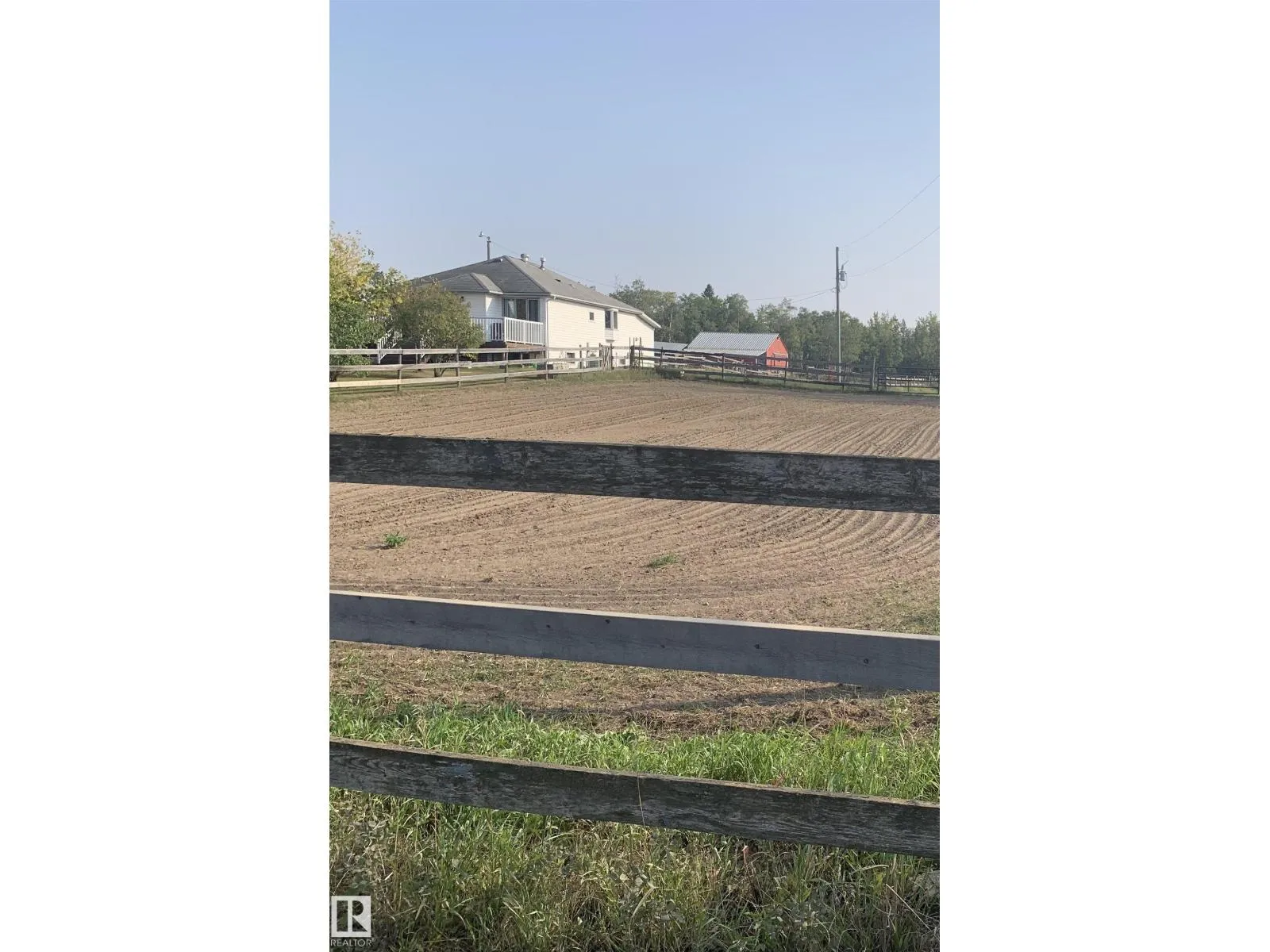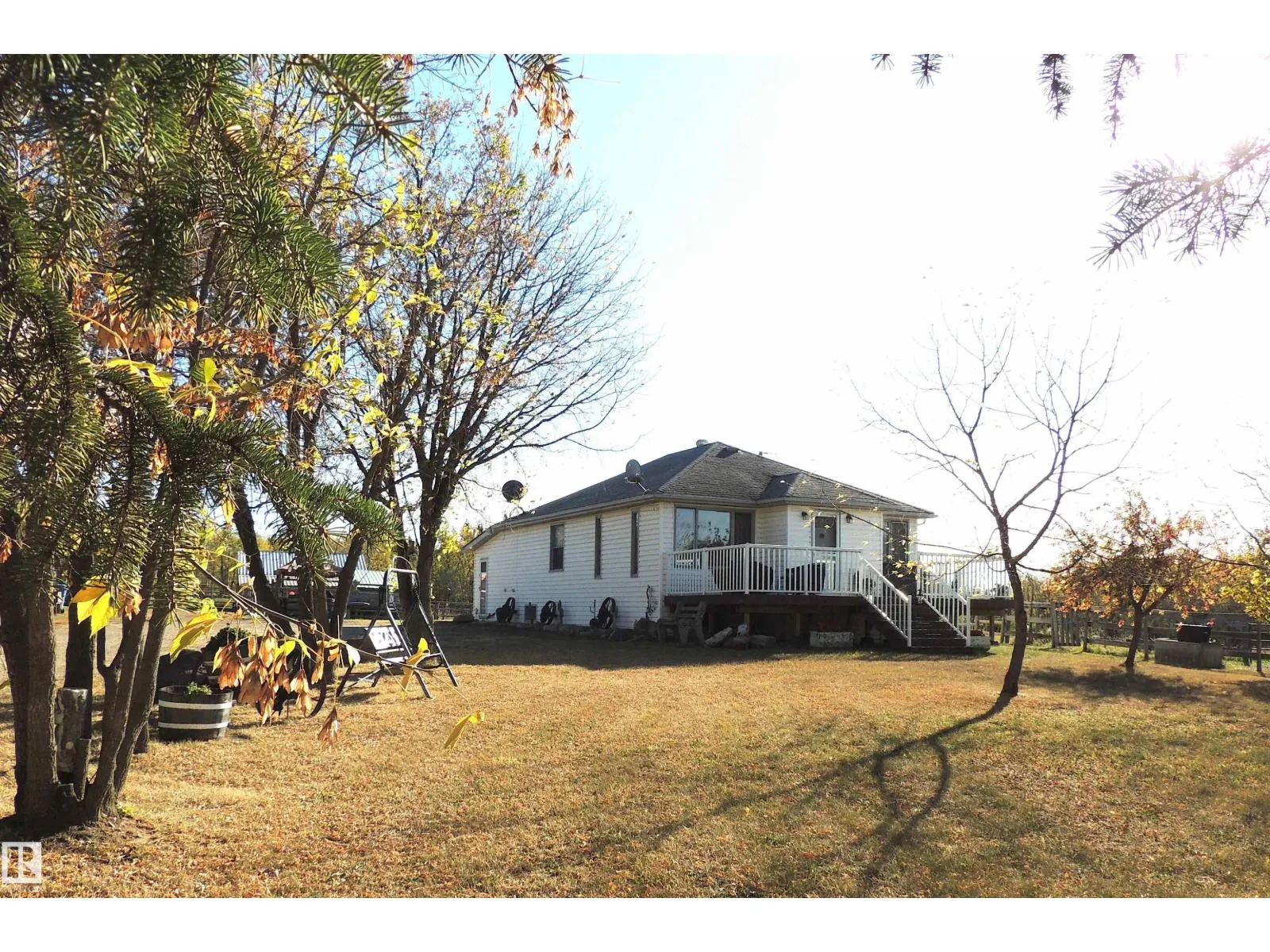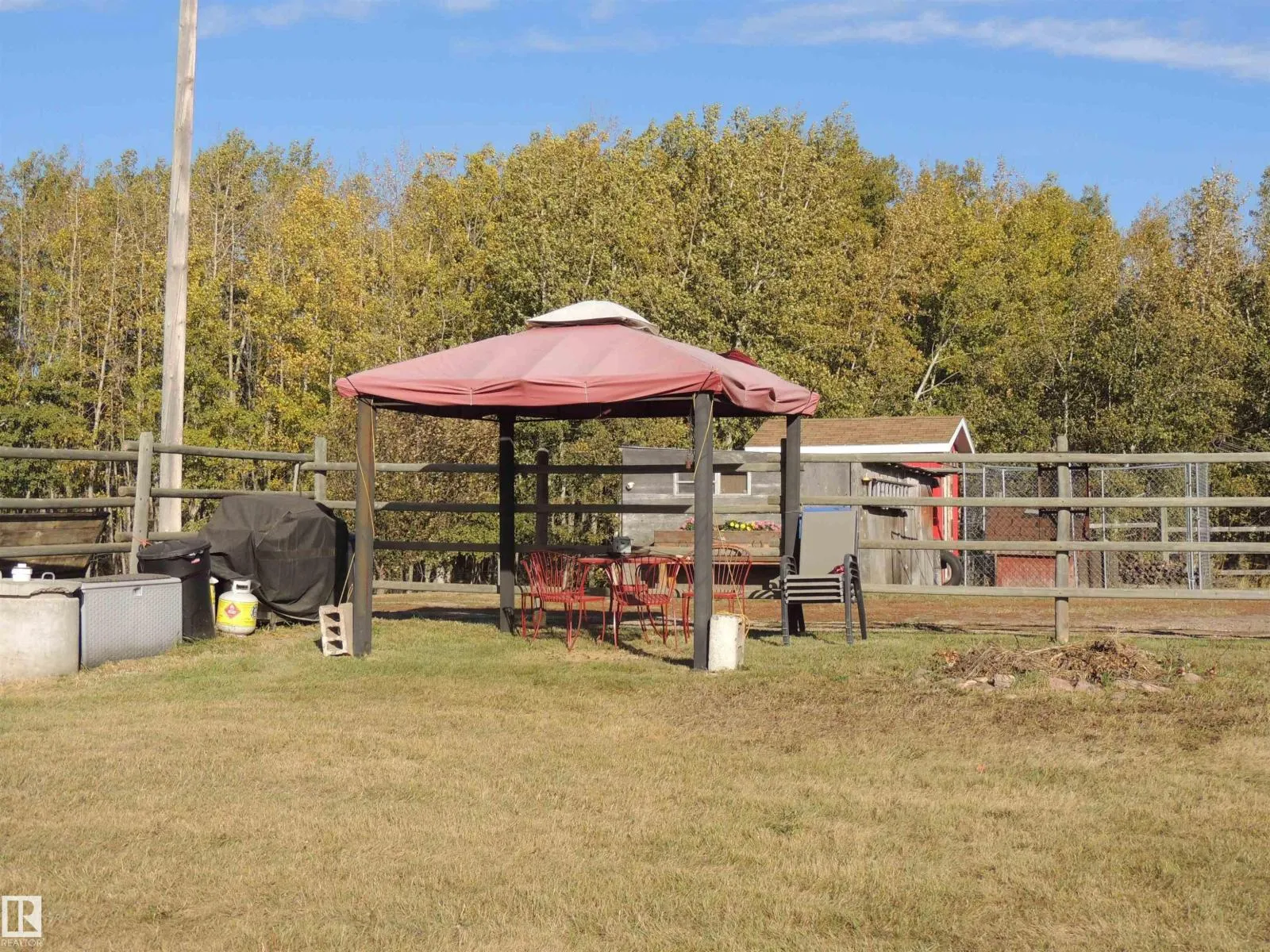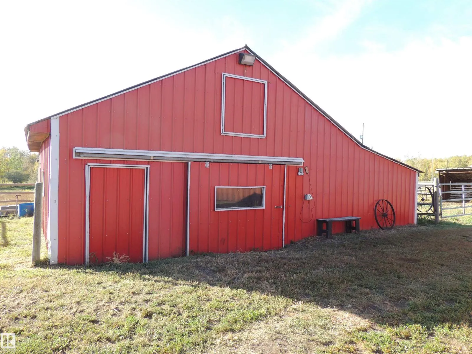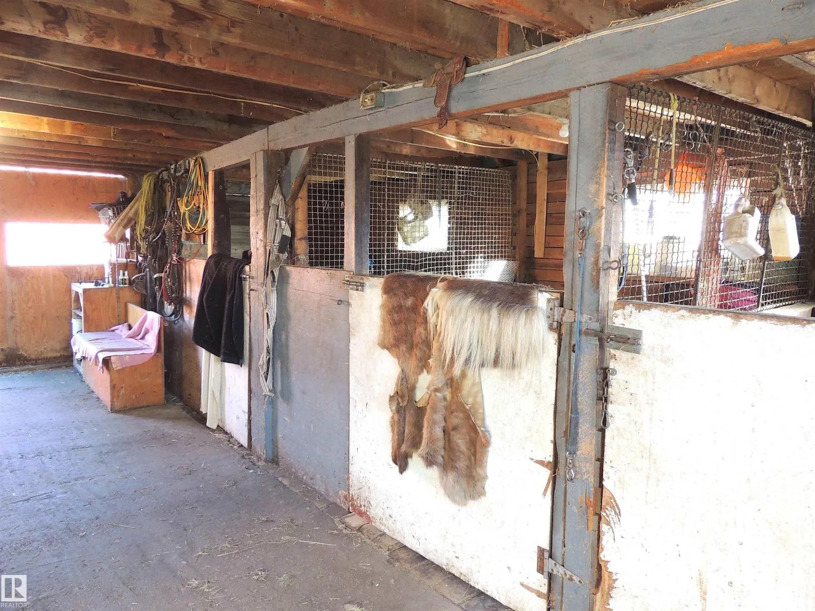Get your horses ready for their new home on 10.2 acres in Austin Acres. Located just 12 km north of Gibbons, this property is set up with cross fencing, outdoor riding arena, red barn with metal roof/siding, 4 stalls, tack room and loft for hay, new water hydrant and watering bowl. Enter this 1200+sq ft country home and find a freshly painted mud room. A couple steps up is the kitchen with white cabinets, stainless appliances, corian counters and a cozy eating area. A french door leads into the living room, accented with original hardwood floors and electric fireplace. Primary bedroom holds a king size suite with electric fireplace. Enjoy the updated 4 piece bath and two more bedrooms on this level. Downstairs has a newly finished 3 piece bath, 2 more bedrooms, large laundry room and a cozy family entertainment area. Also included - chicken coop, metal workshop with wood heater and tool shed. (id:27476)
