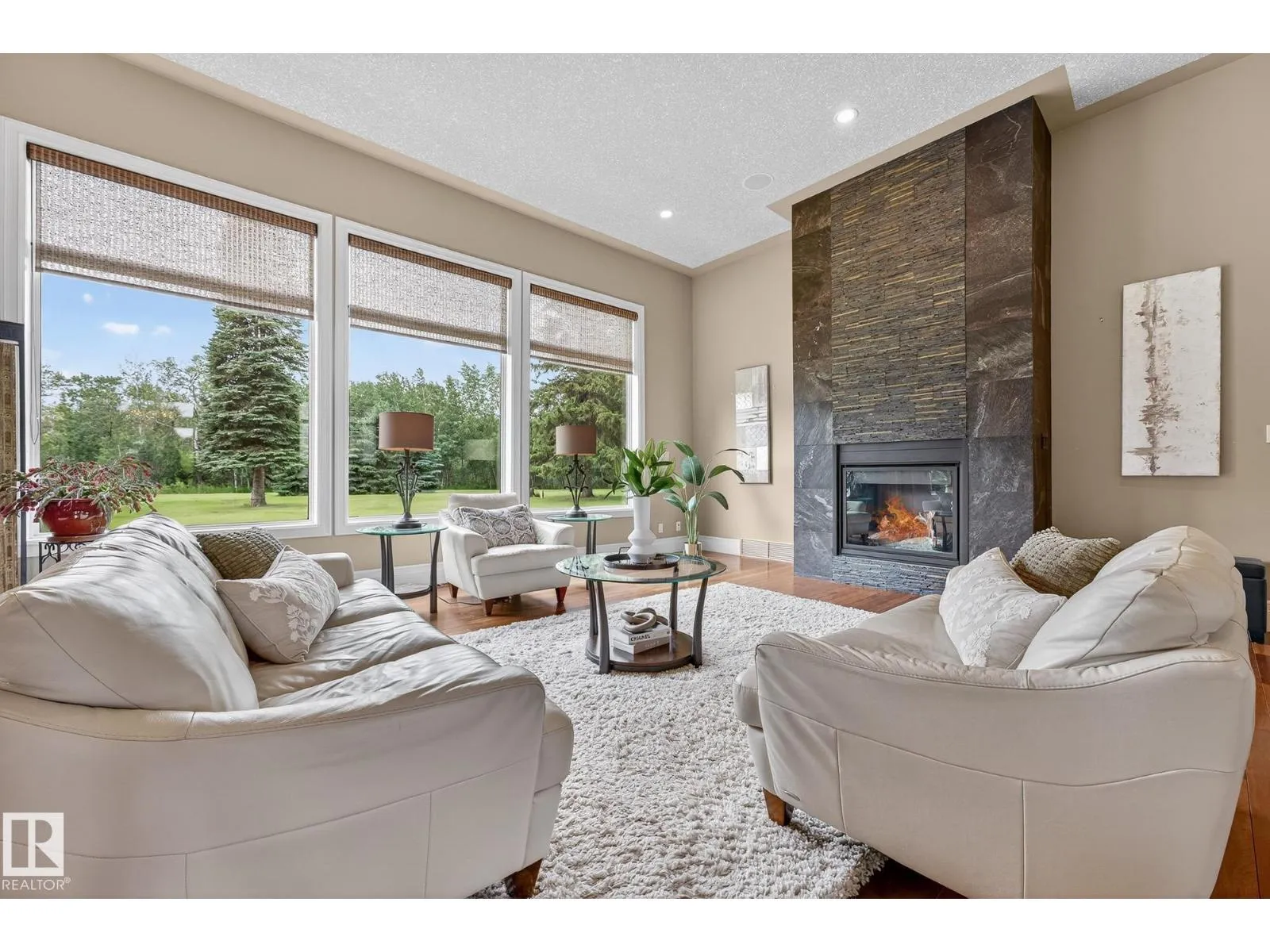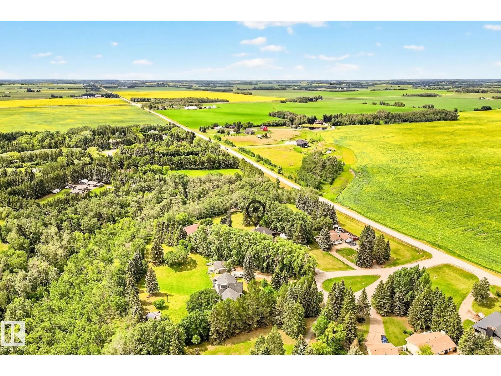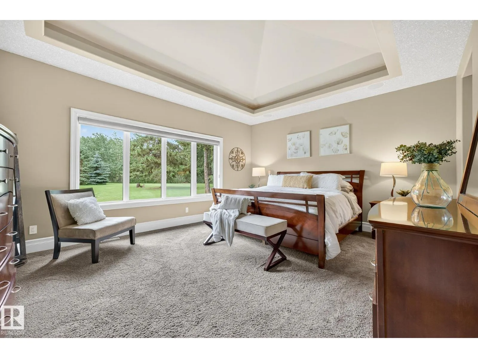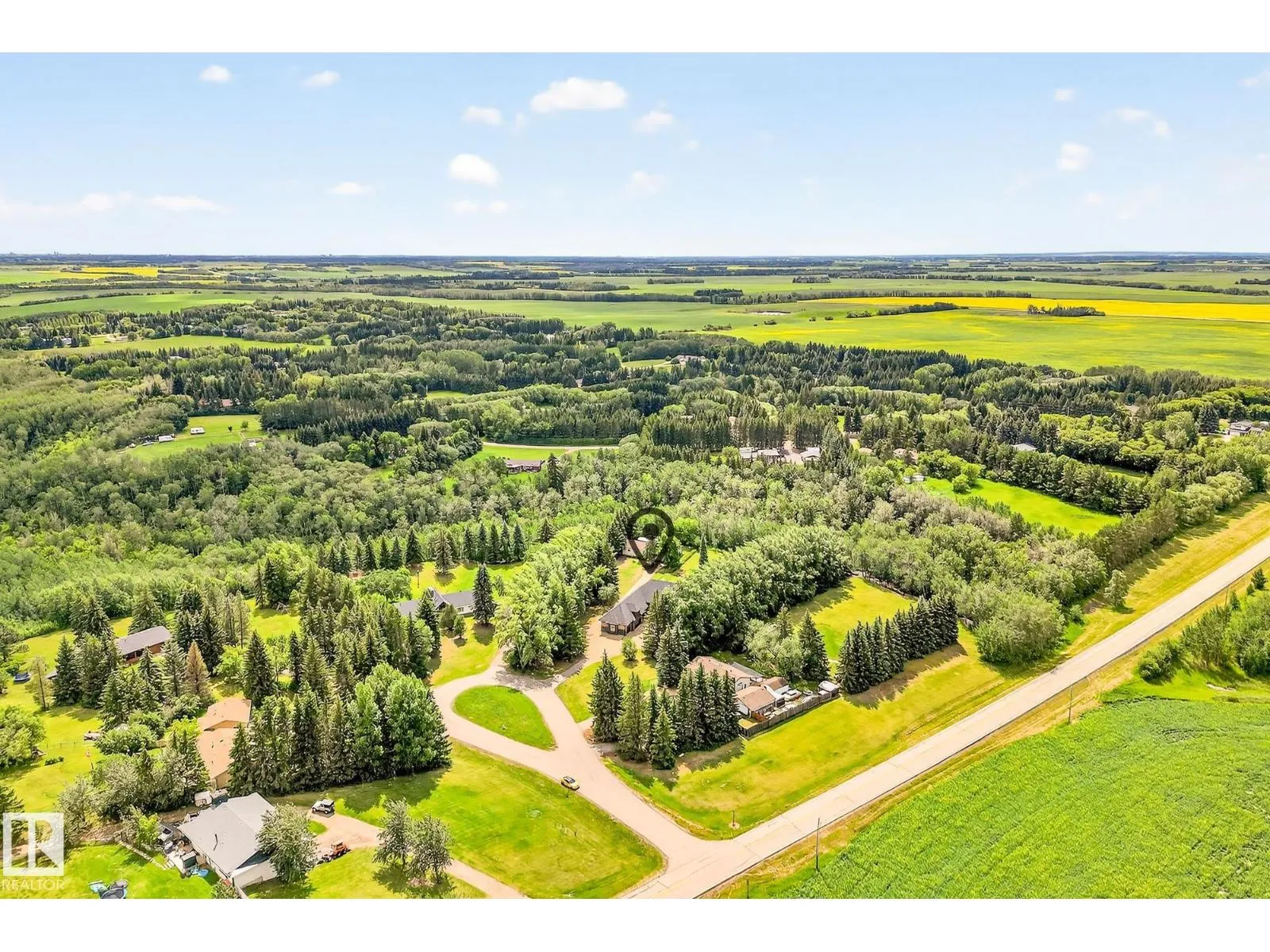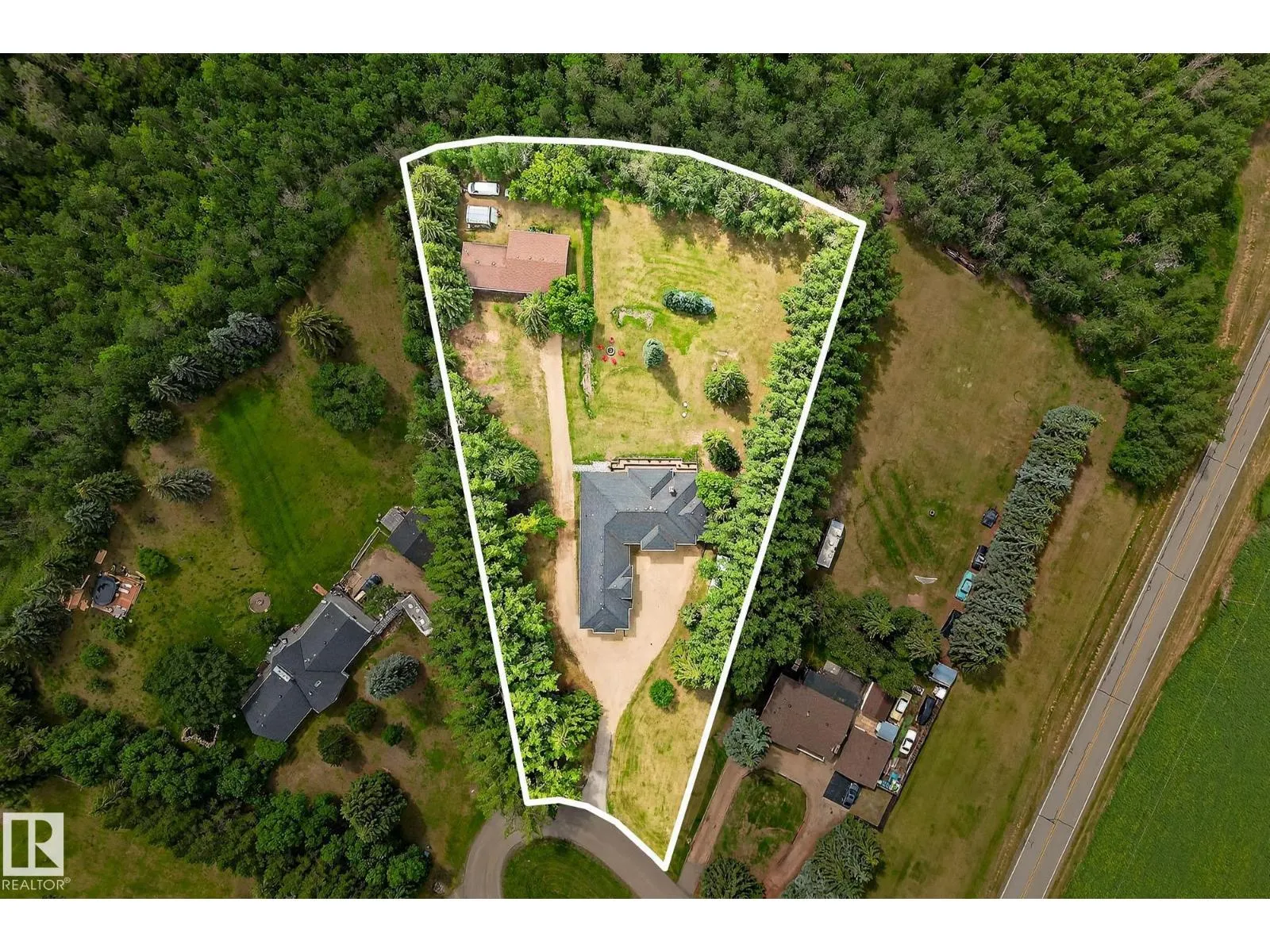 Welcome to Namao Ridge! This custom-built bungalow, situated on 1.67 acres, offers upscale living with unparalleled privacy. A dramatic curved staircase set against a stone feature wall, tray ceilings, and wall-to-wall windows elevate the open-concept main level. Enjoy a chef-inspired kitchen with rich cabinetry, granite countertops, and premium appliances, open to the living and dining areas, featuring a striking stone fireplace. The main floor includes the spacious primary suite, a second bedroom, and a formal dining room with architectural detailing. Downstairs features 3 bedrooms, a full bath, a half bath, a home gym, and a spacious rec room with room for a pool table. The show-stopping bar includes custom cabinetry, tile backsplash, and seating. A dedicated theatre room above the 4-car garage is perfect for movie nights. The 1,824sqft heated shop is finished with power, making it ideal for trades, storage, or your dream workspace. A covered patio and mature trees round out this exceptional property. (id:27476)