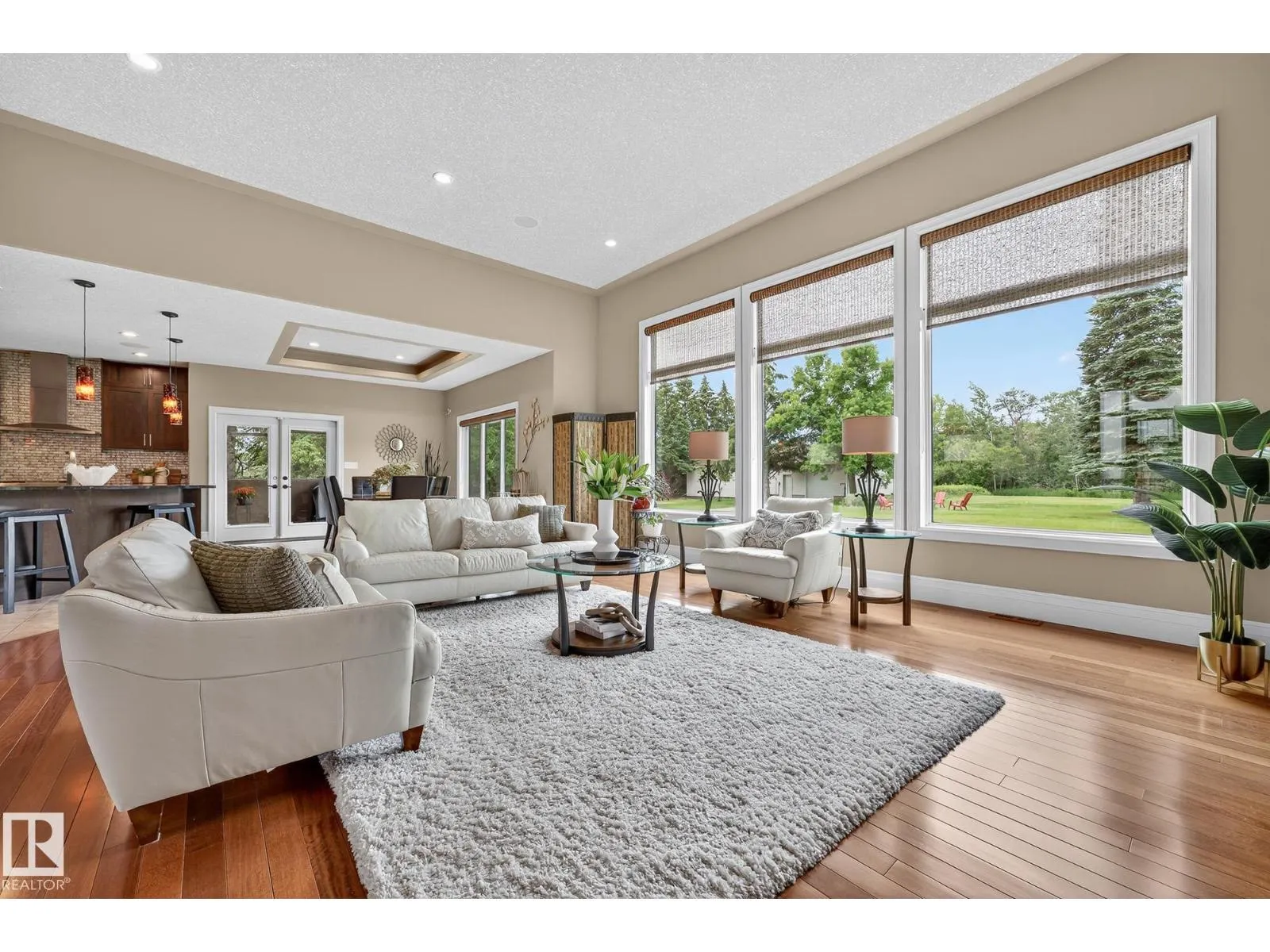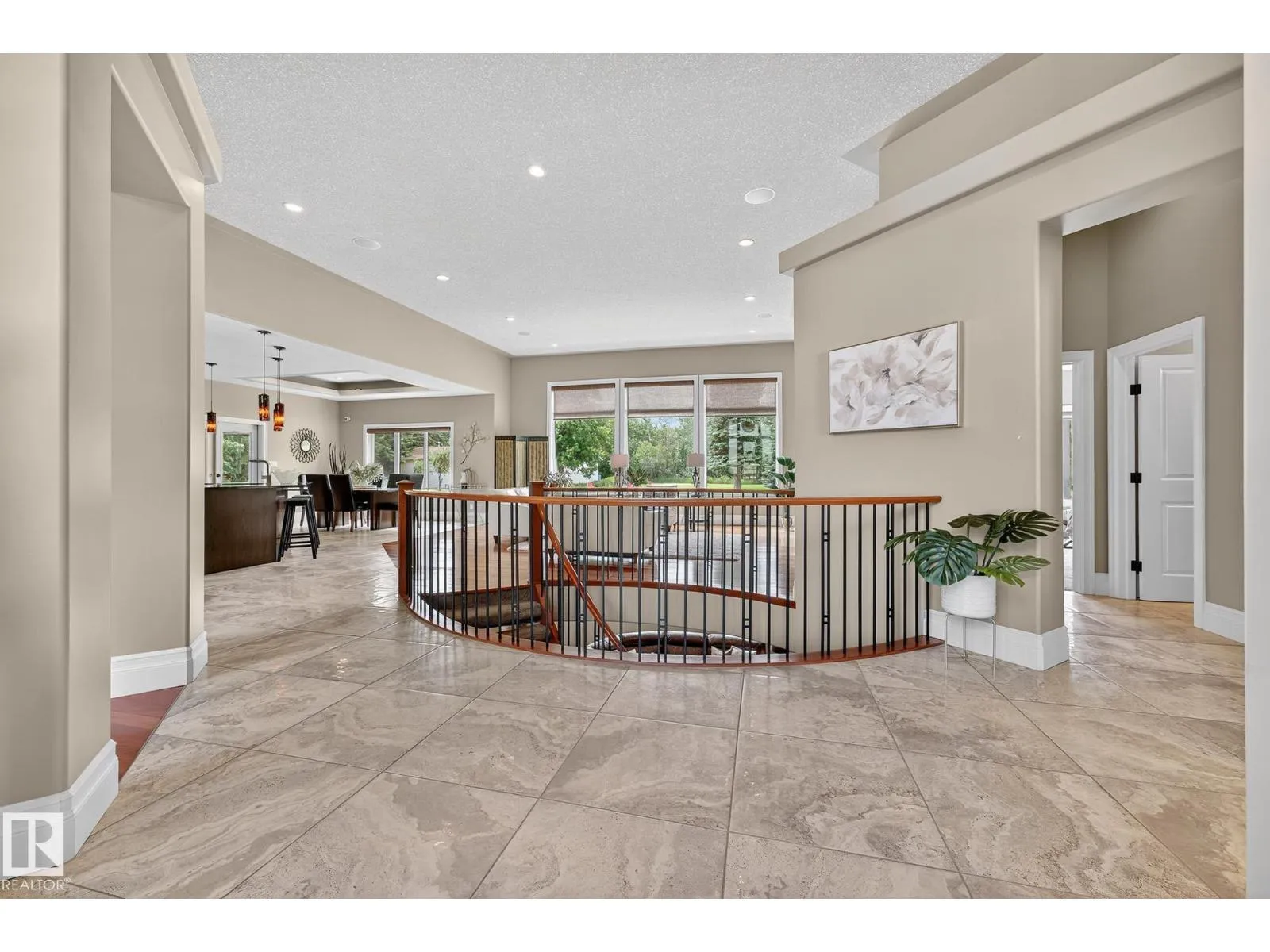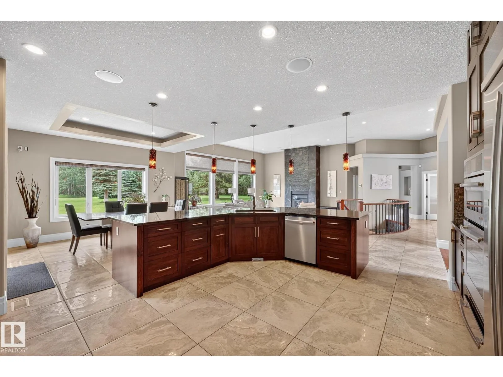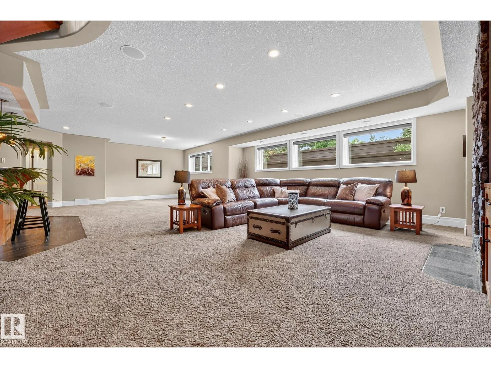 Welcome to Namao Ridge! This custom-built bungalow, situated on 1.67 acres, offers upscale living with unparalleled privacy. A dramatic curved staircase set against a stone feature wall, tray ceilings, and wall-to-wall windows elevate the open-concept main level. Enjoy a chef-inspired kitchen with rich cabinetry, granite countertops, and premium appliances, open to the living and dining areas, featuring a striking stone fireplace. The main floor includes the spacious primary suite, a second bedroom, and a formal dining room with architectural detailing. Downstairs features 3 bedrooms, a full bath, a half bath, a home gym, and a spacious rec room with room for a pool table. The show-stopping bar includes custom cabinetry, tile backsplash, and seating. A dedicated theatre room above the 4-car garage is perfect for movie nights. The 1,824sqft heated shop is finished with power, making it ideal for trades, storage, or your dream workspace. A covered patio and mature trees round out this exceptional property. (id:27476)