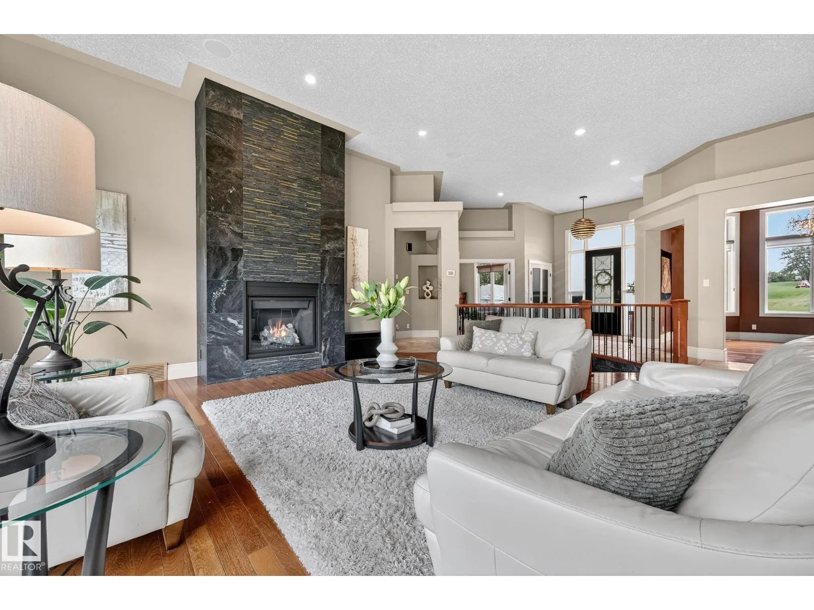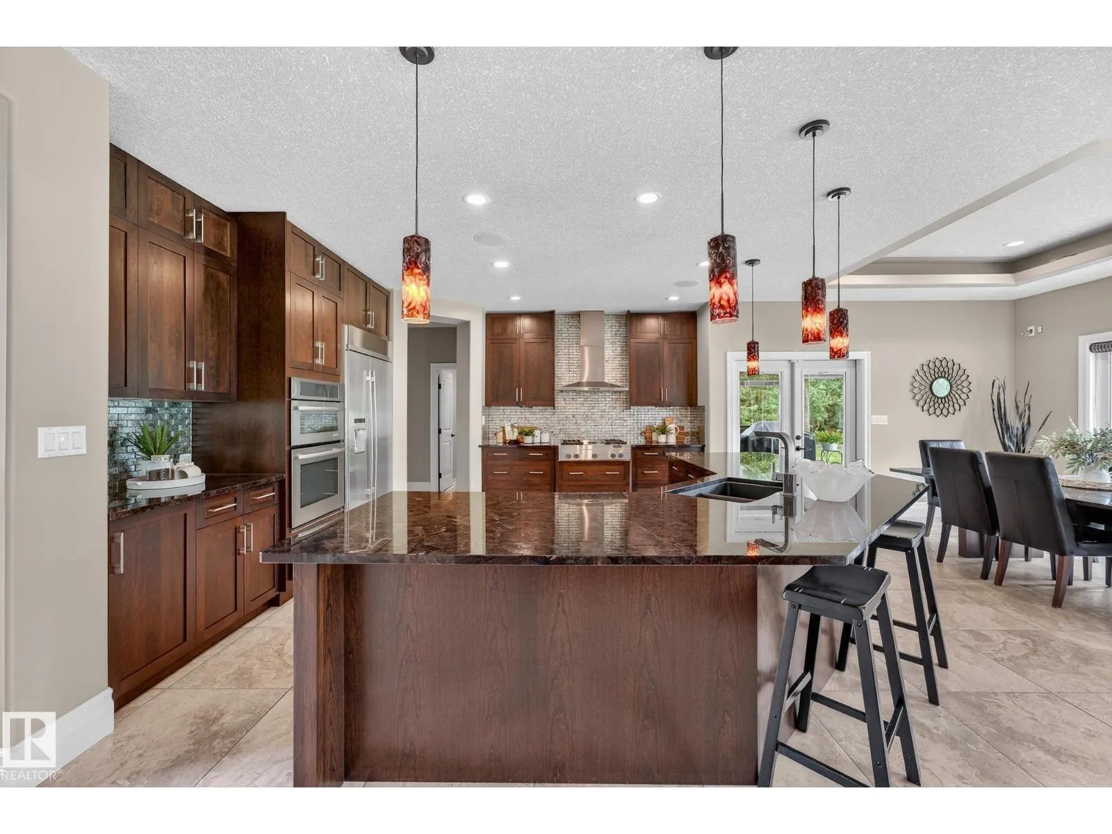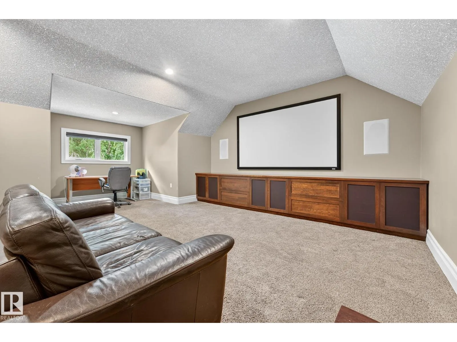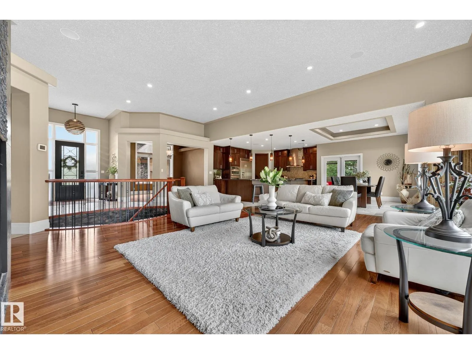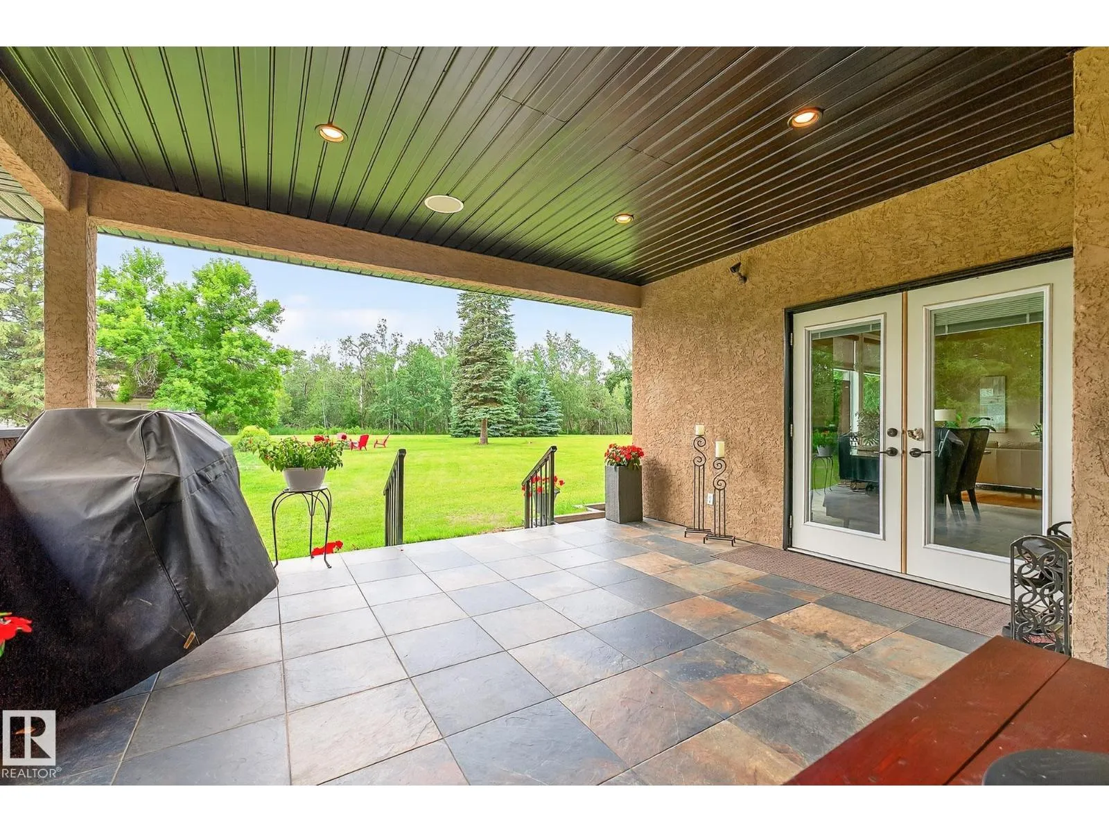 Welcome to Namao Ridge! This custom-built bungalow, situated on 1.67 acres, offers upscale living with unparalleled privacy. A dramatic curved staircase set against a stone feature wall, tray ceilings, and wall-to-wall windows elevate the open-concept main level. Enjoy a chef-inspired kitchen with rich cabinetry, granite countertops, and premium appliances, open to the living and dining areas, featuring a striking stone fireplace. The main floor includes the spacious primary suite, a second bedroom, and a formal dining room with architectural detailing. Downstairs features 3 bedrooms, a full bath, a half bath, a home gym, and a spacious rec room with room for a pool table. The show-stopping bar includes custom cabinetry, tile backsplash, and seating. A dedicated theatre room above the 4-car garage is perfect for movie nights. The 1,824sqft heated shop is finished with power, making it ideal for trades, storage, or your dream workspace. A covered patio and mature trees round out this exceptional property. (id:27476)