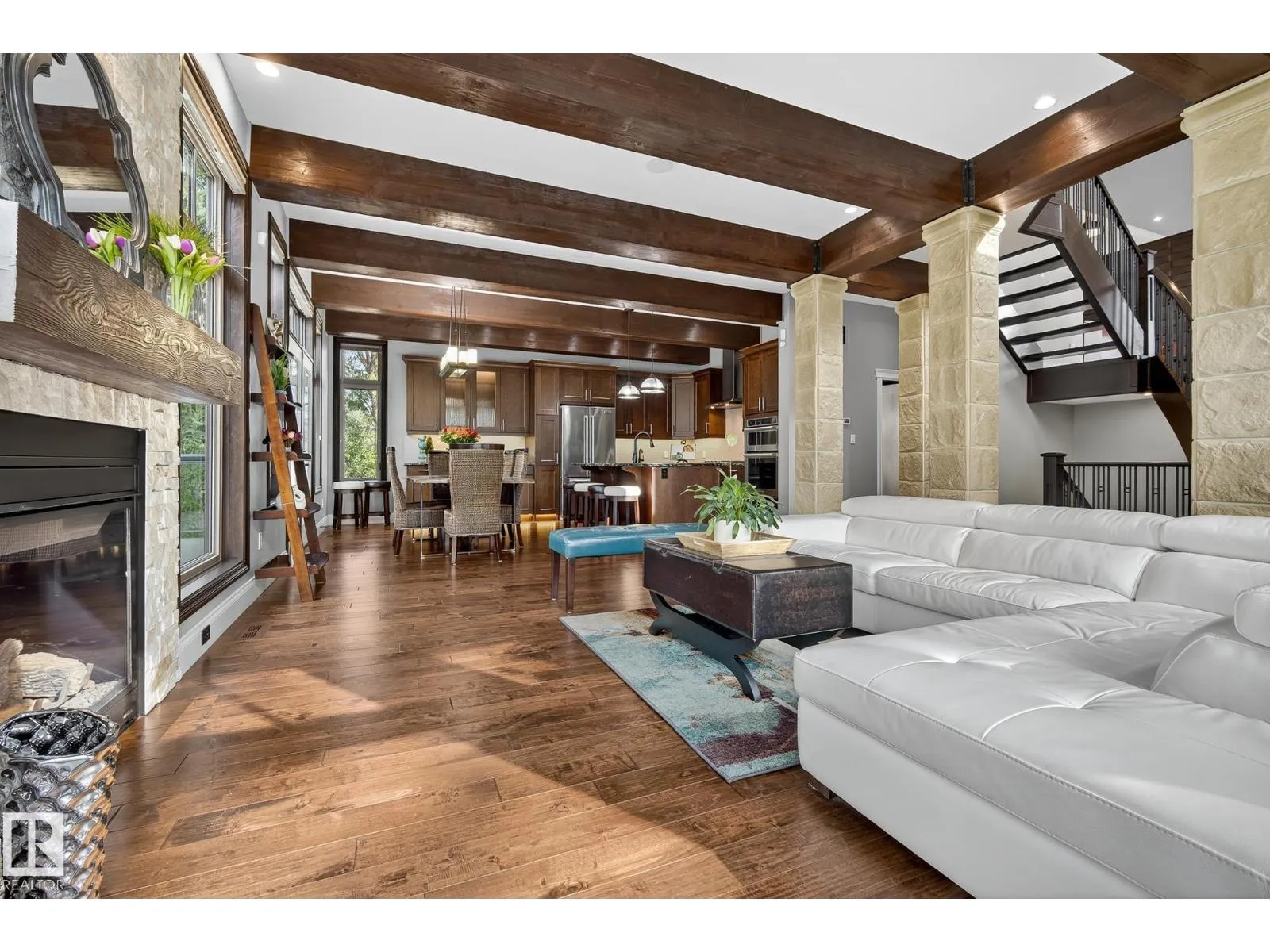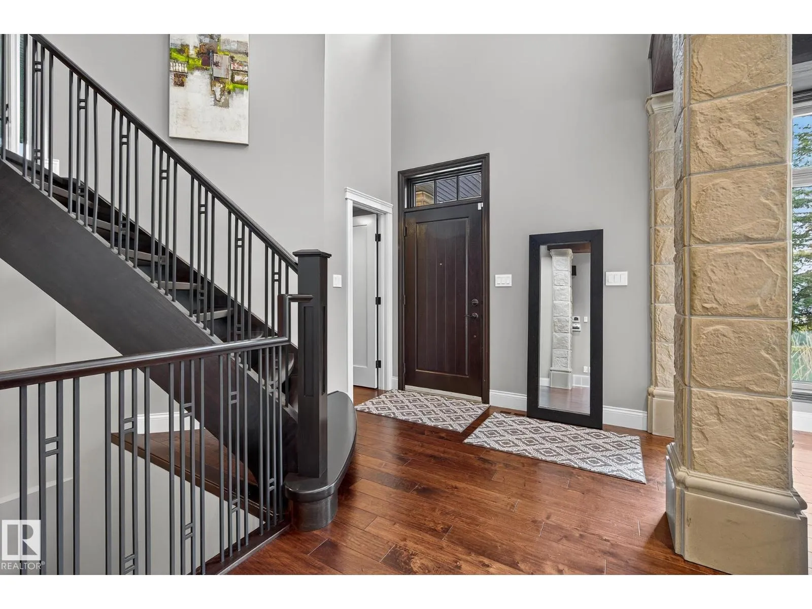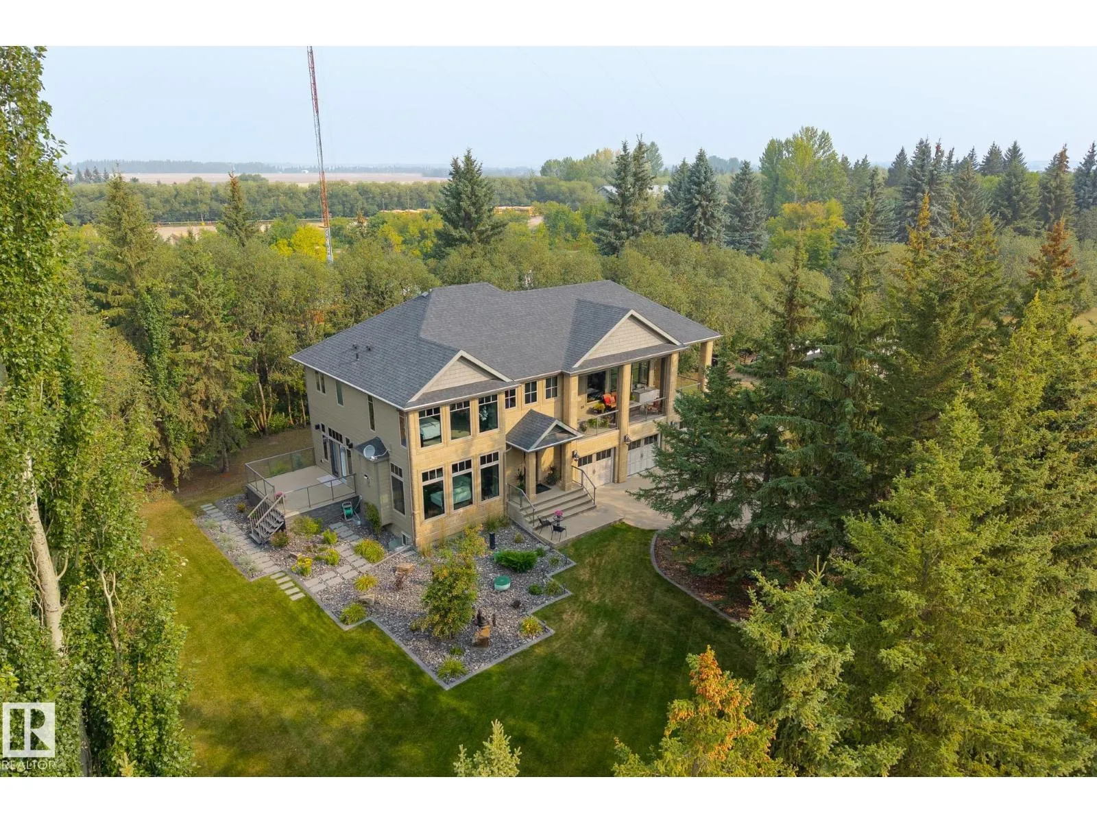 FORMER BROOKHAVEN SHOWHOME on 1.55 acres located ACROSS FROM SANDPIPER GOLF COURSE & under 5 MINUTES WEST OF ST. ALBERT! Unique 4-level split dream home featuring a full custom kitchen by Gem Cabinets, dark wood beams & stone pillars on the main level, floor-to-ceiling windows to enjoy your tree-line views, curved wood open tread stair case leading to your huge den + bonus room and screened-in upper patio by Suncoast Enclosures. Upstairs youâll find 3 bedrooms & 2 full bathrooms including a spacious primary retreat looking out onto the trees. The basement is fully-finished w/ a 4th bedroom, projector TV area & large storage room. Your vehicles will stay cozy all winter long in your fully finished & heated triple attached garage. Outside, you can bring your acreage dreams to life with lots of space to build a secondary shop. And yes, you have FIBRE INTERNET! Enjoy the amenities of city living paired with the serenity + green space of rural life. Welcome home! (id:27476)
